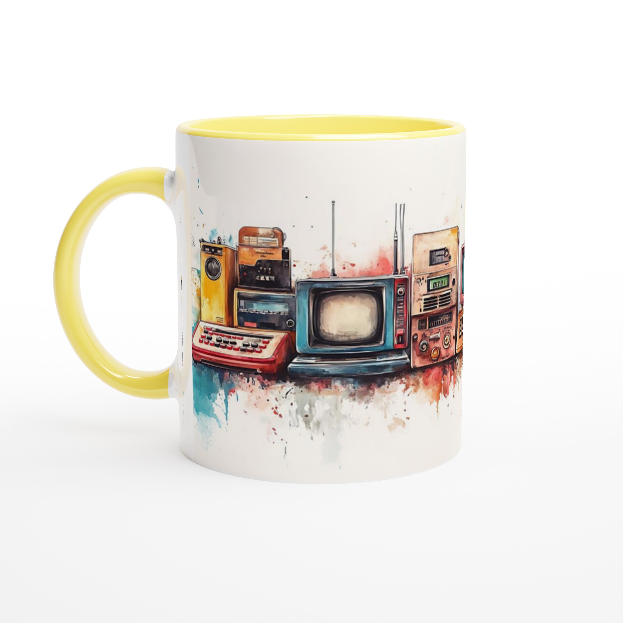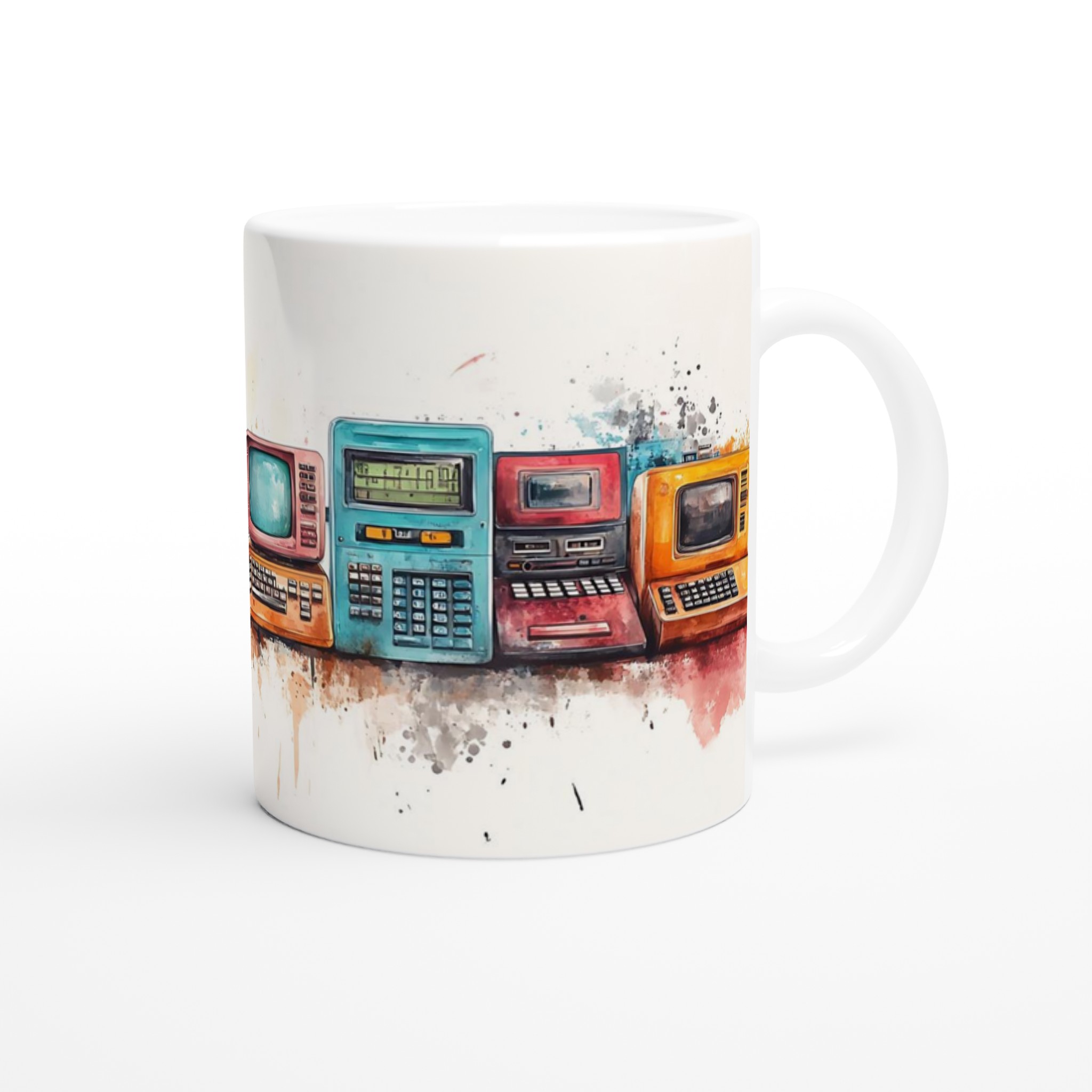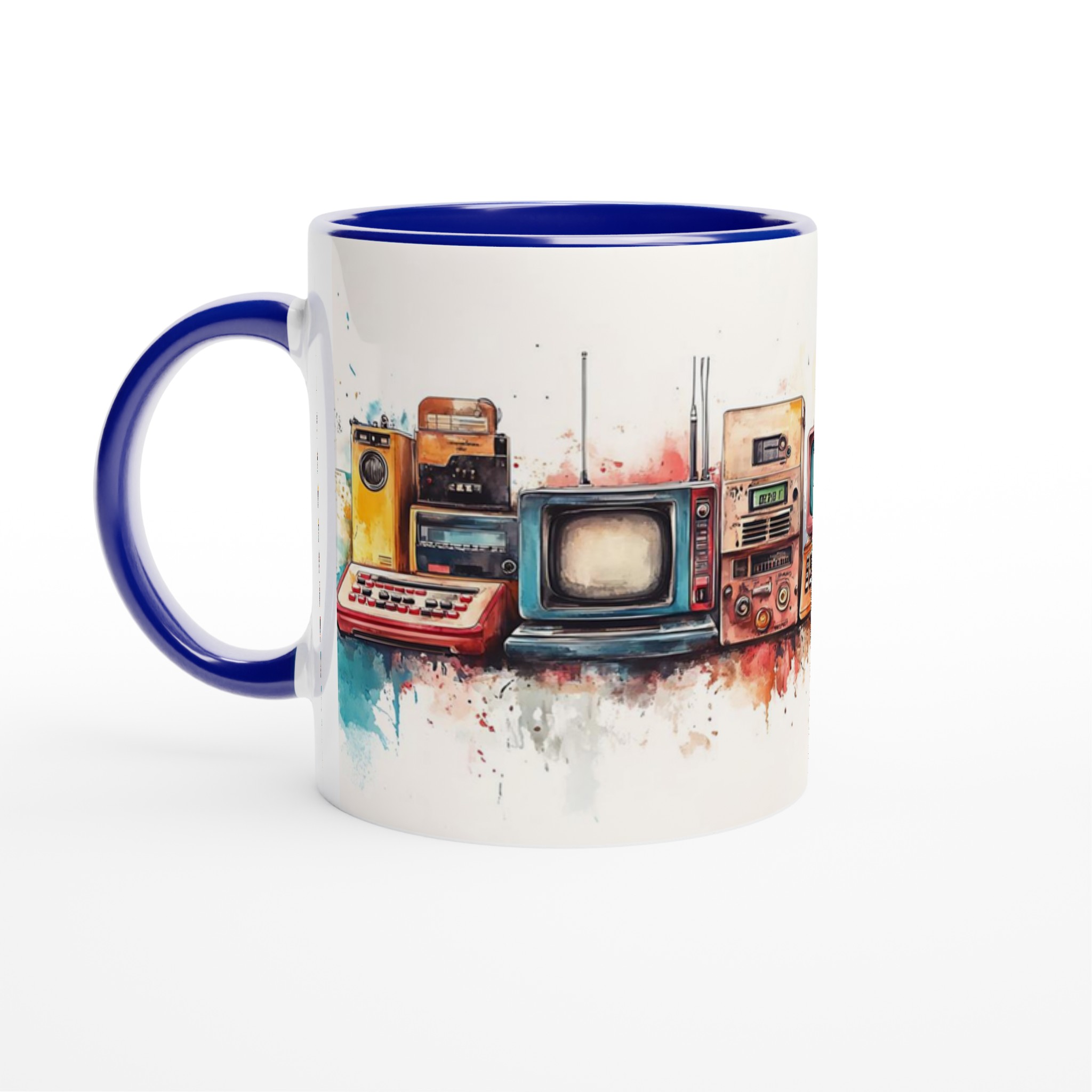 Ta en resa tillbaka i tiden med vår ”Retro Tech Chic” keramiska mugg! Denna mugg fångar den lekfulla charmen från vintage elektronik med en modern, konstnärlig twist. Tänk dig att starta dagen med en kopp kaffe i denna unika mugg, där trycket av klassiska apparater i varma, akvarellinspirerade toner möter den blanka, rena ytan. Det är en perfekt konversationsstartare och en hyllning till design från förr.