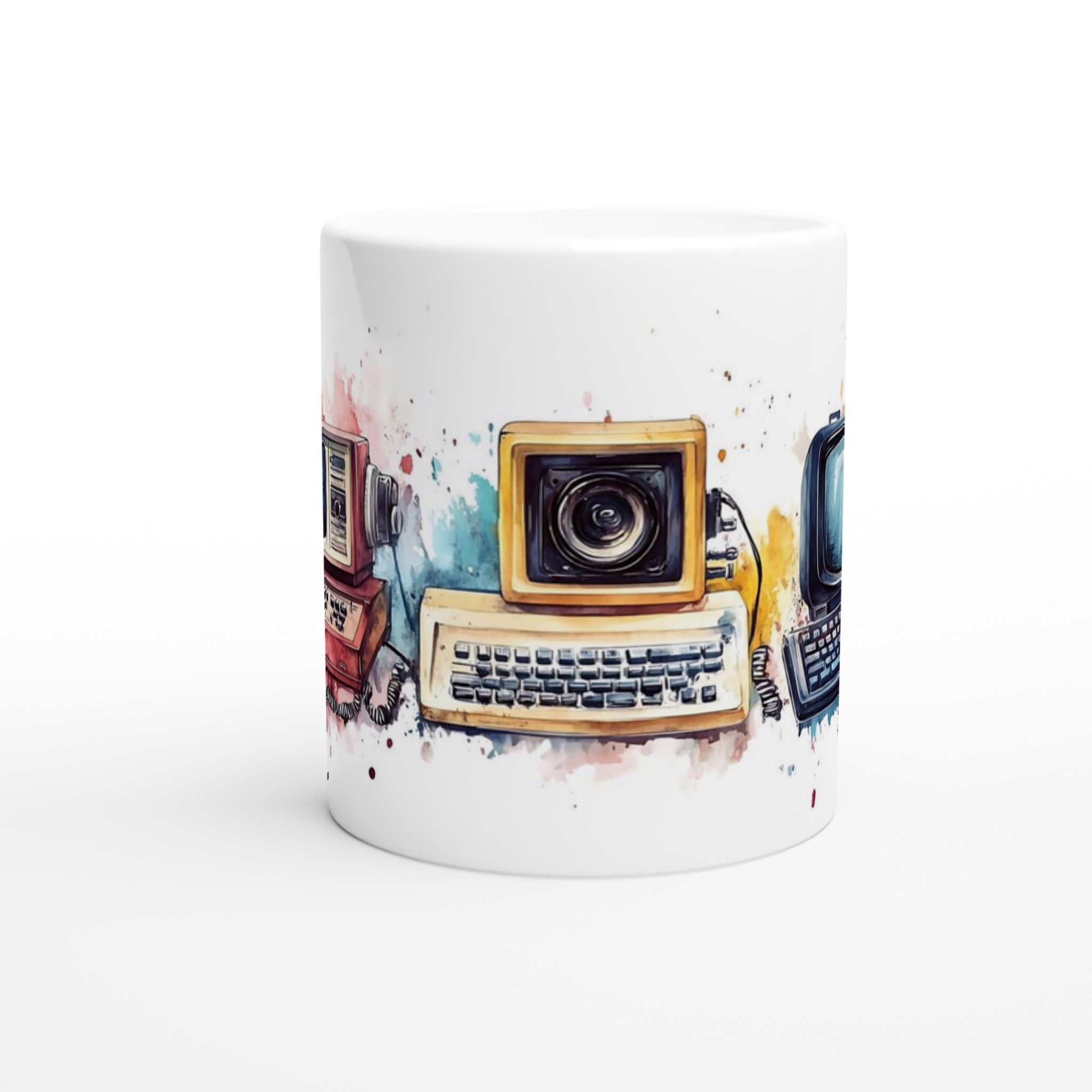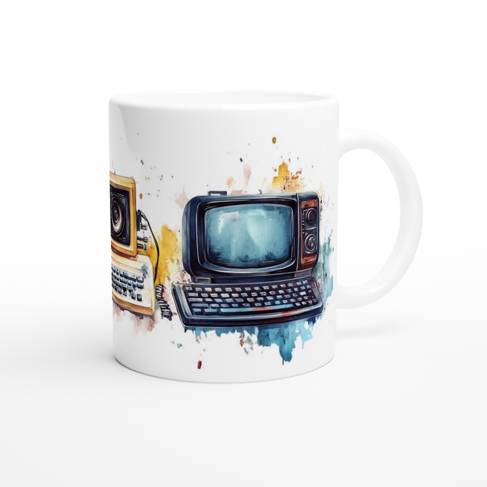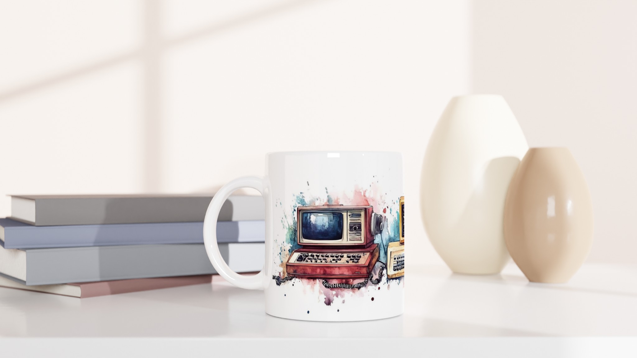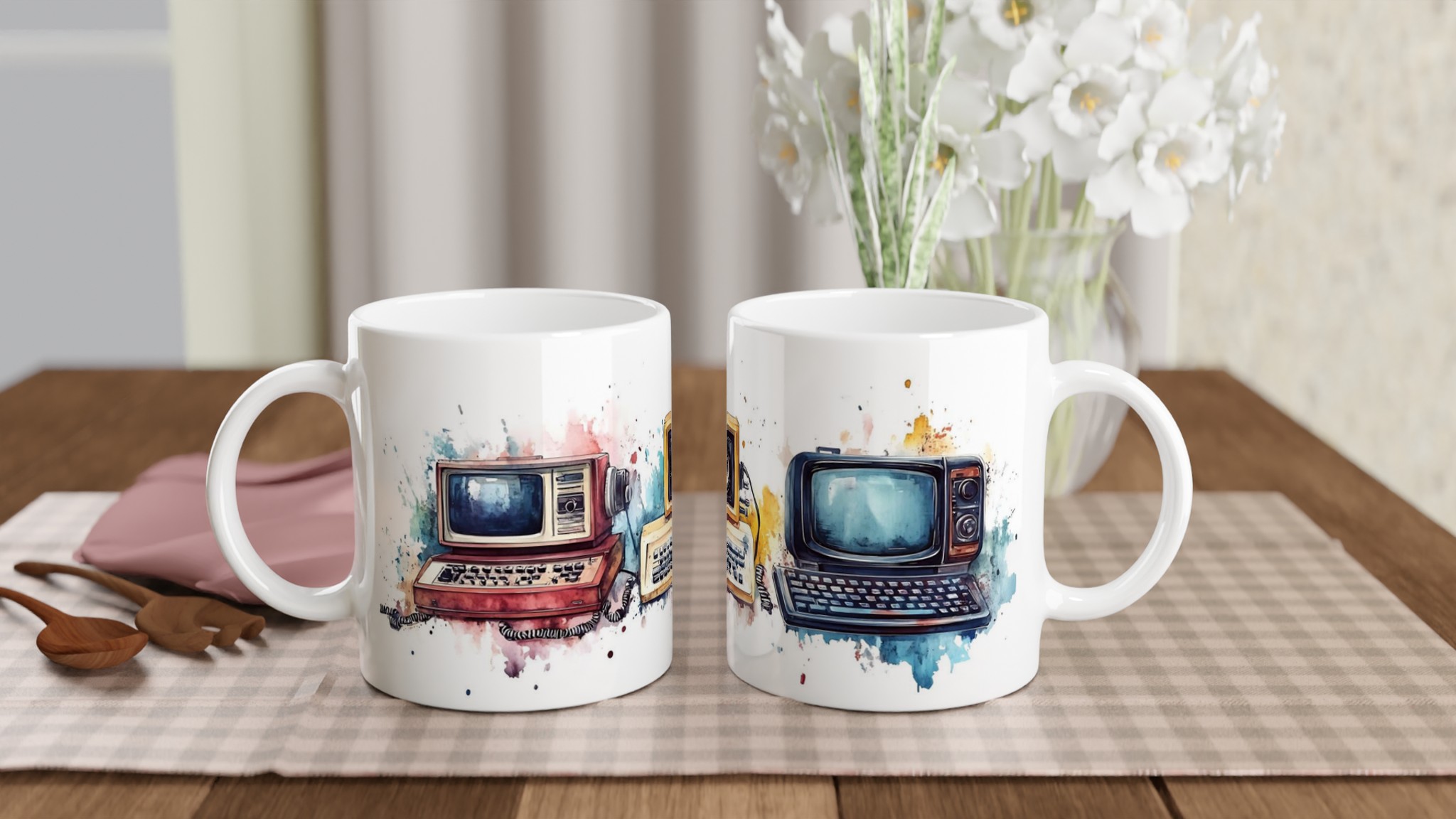 Fånga den charmiga nostalgin från svunna tiders teknologi med vår unika retro tech keramiska mugg. Varje klunk blir en resa tillbaka i tiden, med motiv av klassiska datorer och monitorer i en livfull akvarellstil. Denna mugg är inte bara en vardagsfavorit för morgonkaffet, kvällens varma choklad eller när du bara vill njuta av en kopp te – den är också en hyllning till den digitala historien, perfekt för teknikentusiasten eller den som älskar en touch av retro i sin vardag.