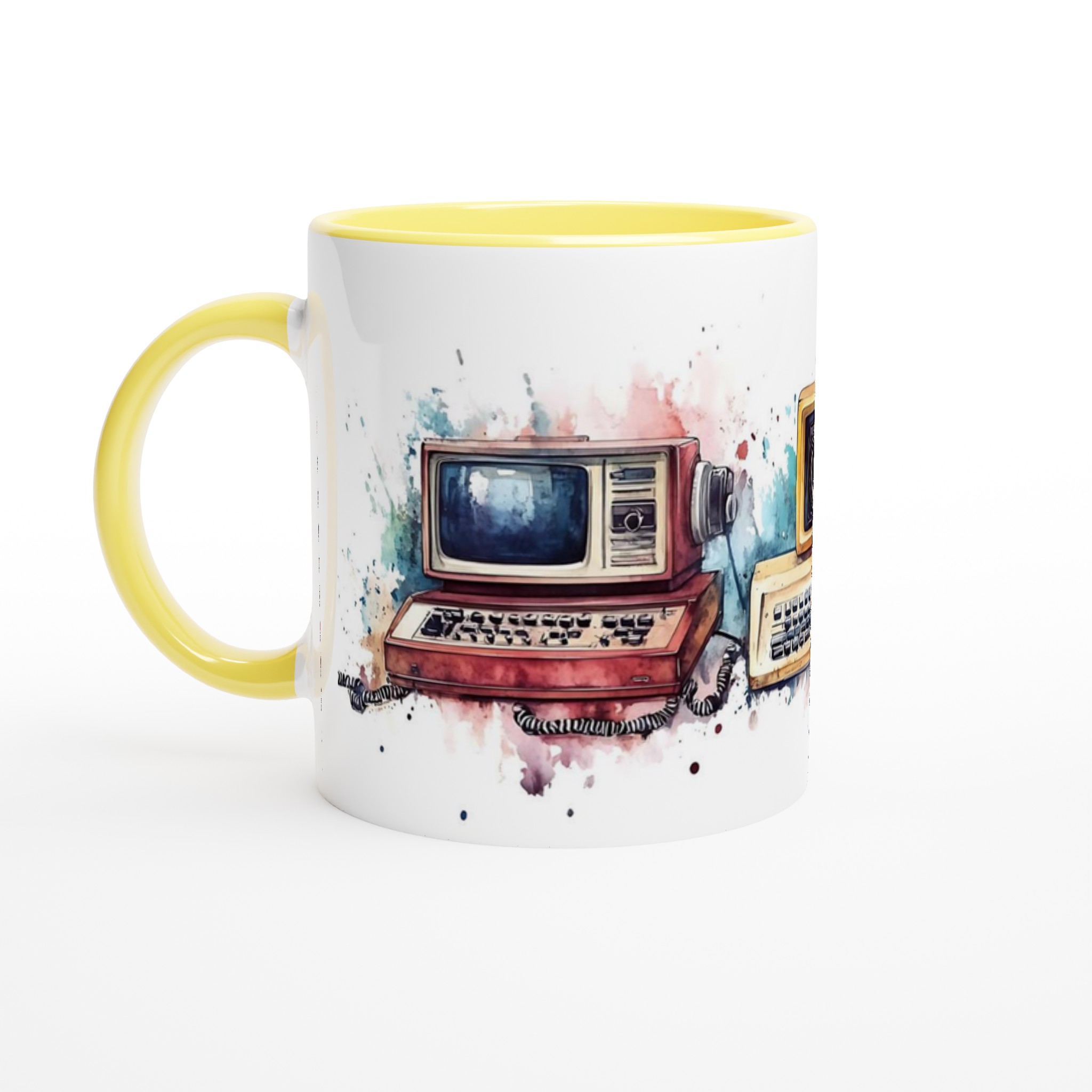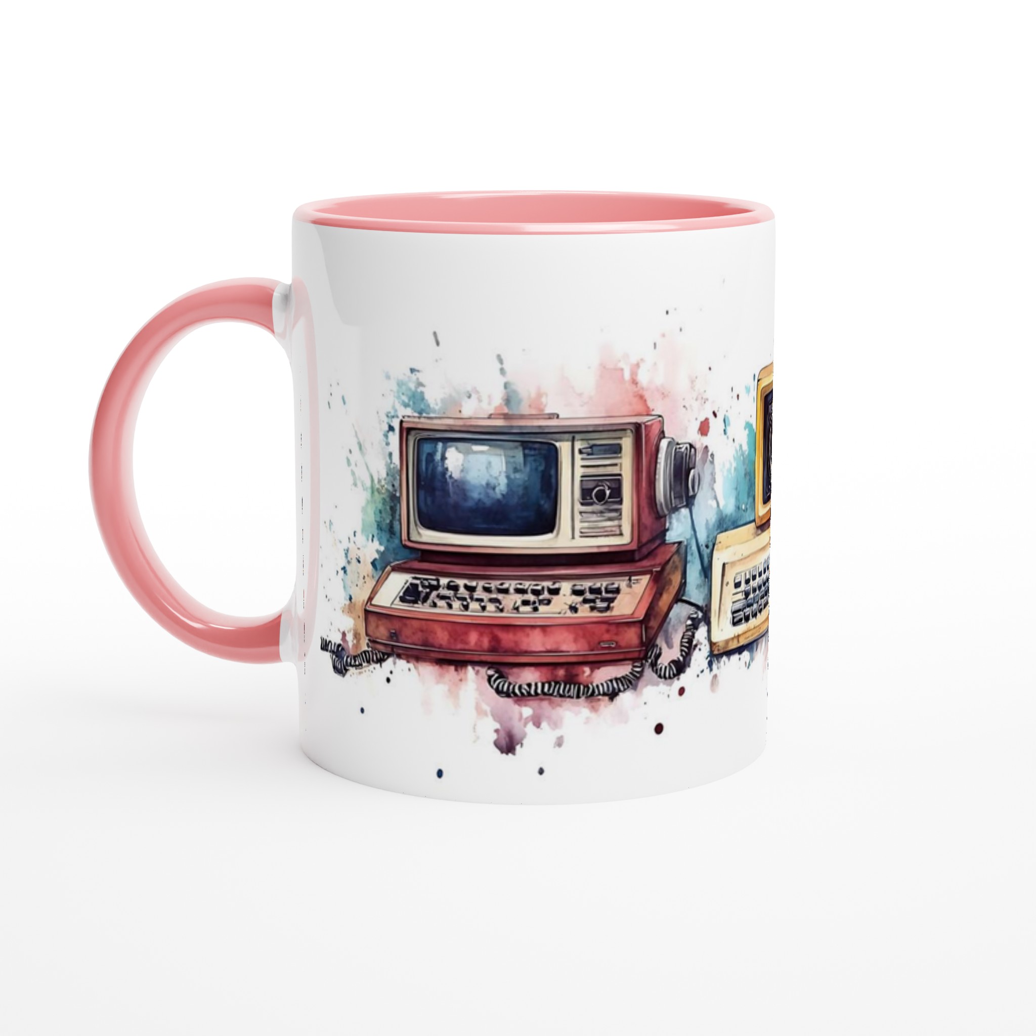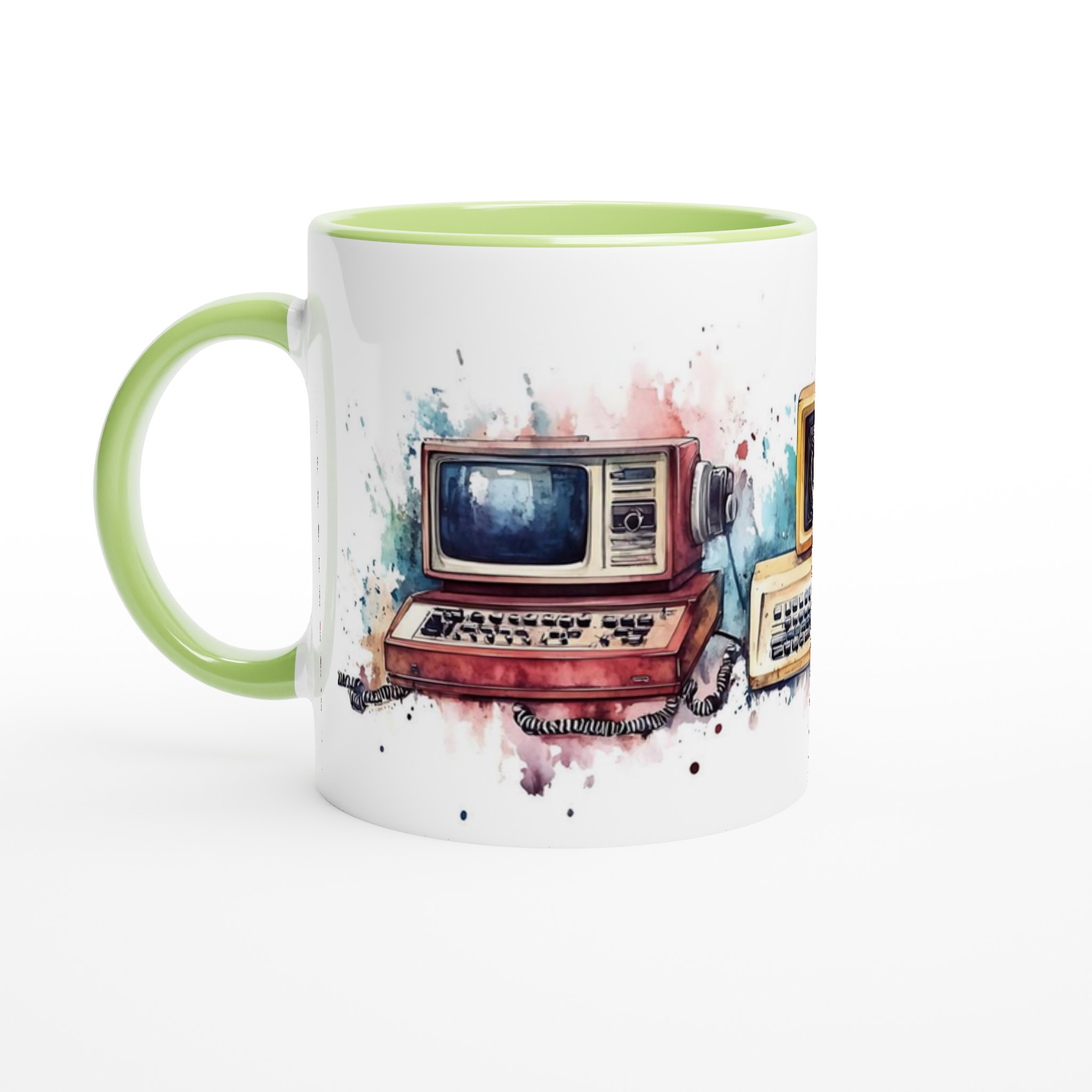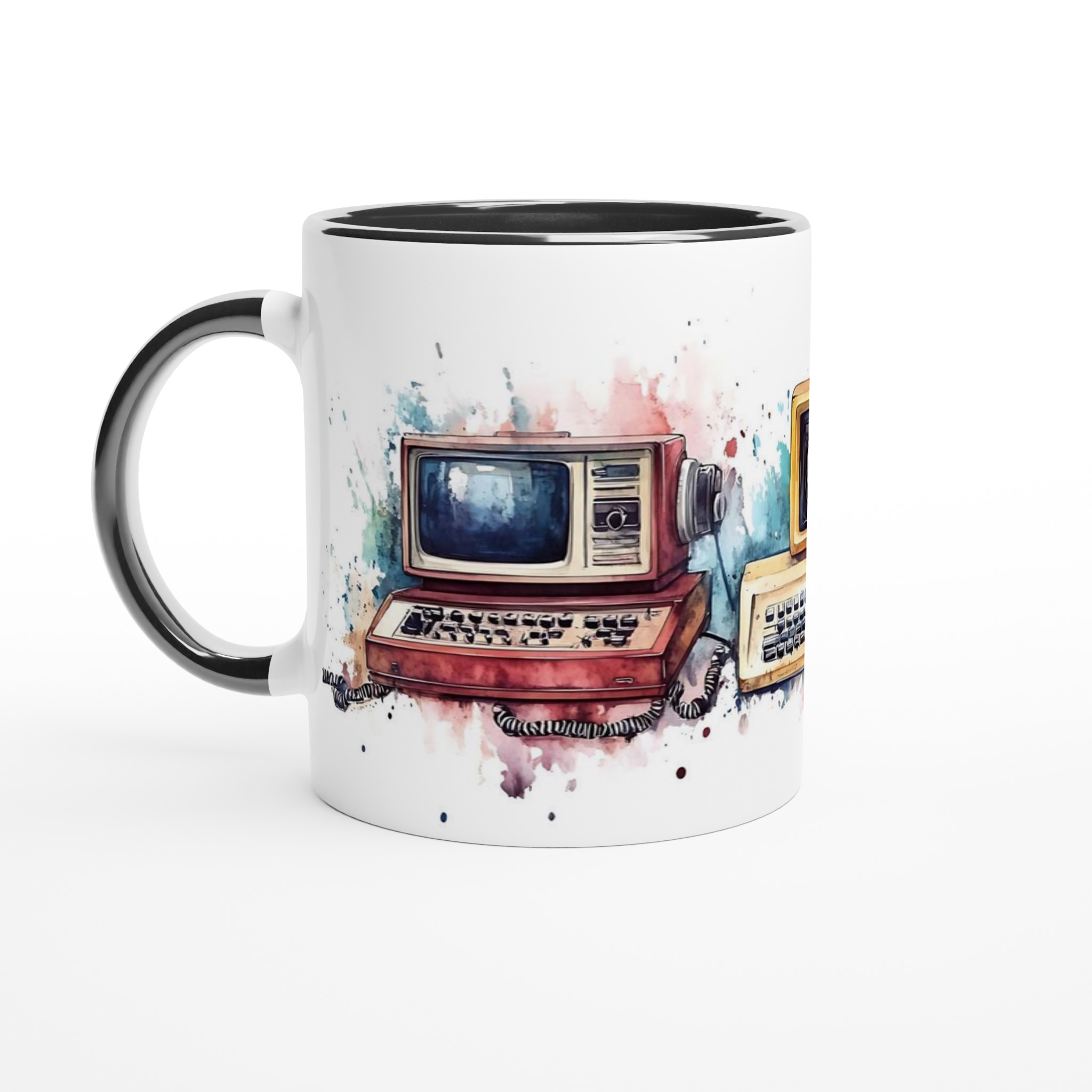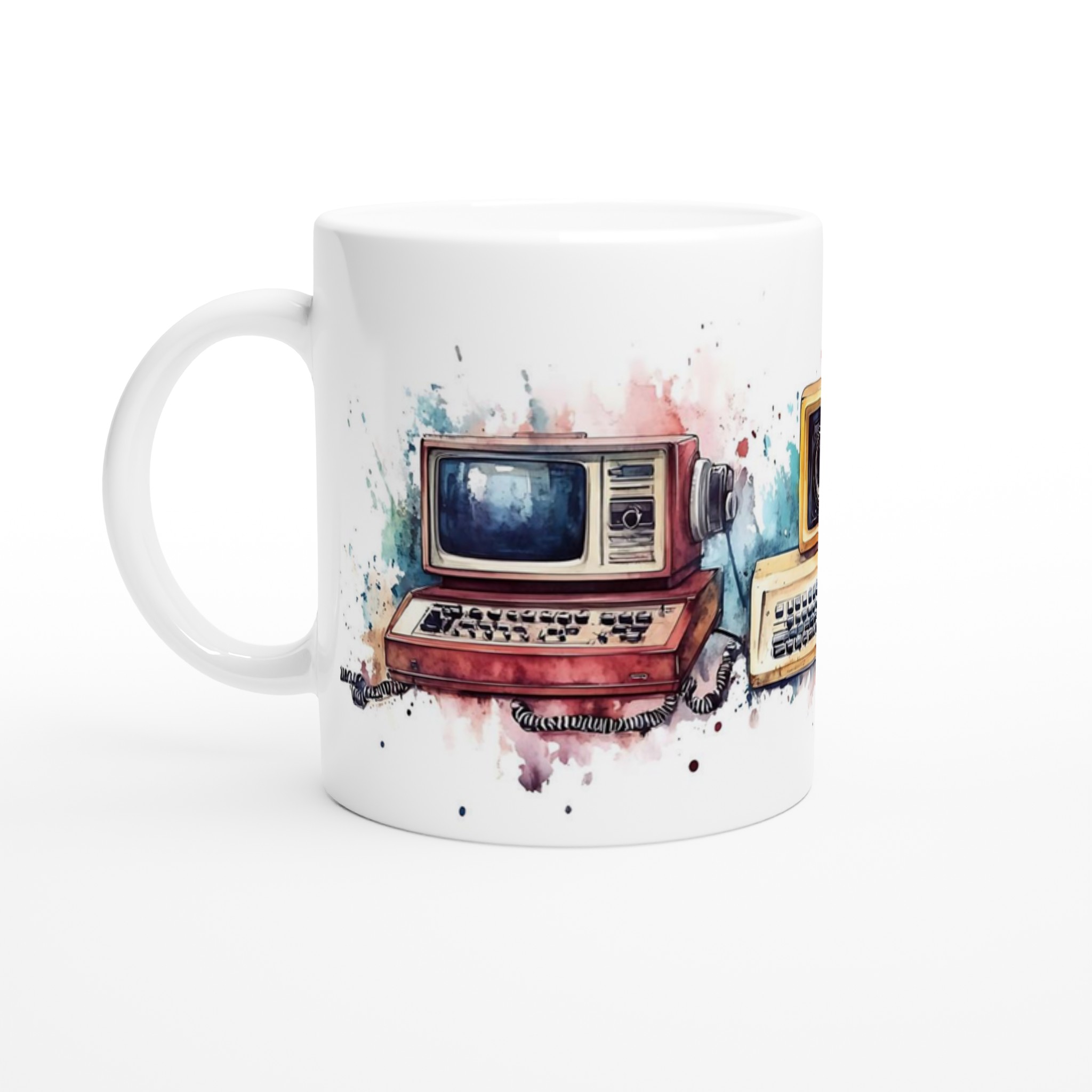 Fånga den charmiga nostalgin från svunna tiders teknologi med vår unika retro tech keramiska mugg. Varje klunk blir en resa tillbaka i tiden, med motiv av klassiska datorer och monitorer i en livfull akvarellstil. Denna mugg är inte bara en vardagsfavorit för morgonkaffet, kvällens varma choklad eller när du bara vill njuta av en kopp te – den är också en hyllning till den digitala historien, perfekt för teknikentusiasten eller den som älskar en touch av retro i sin vardag.