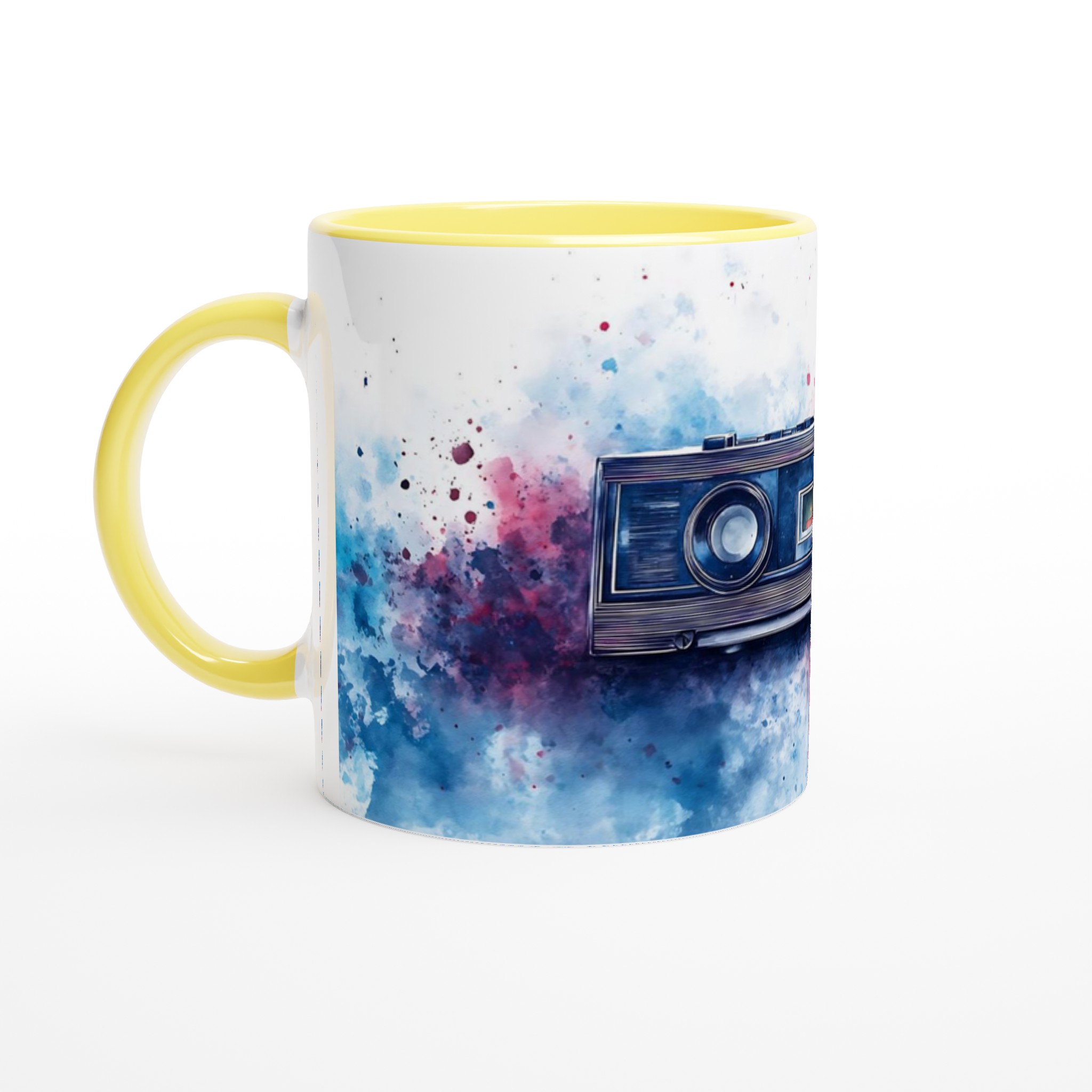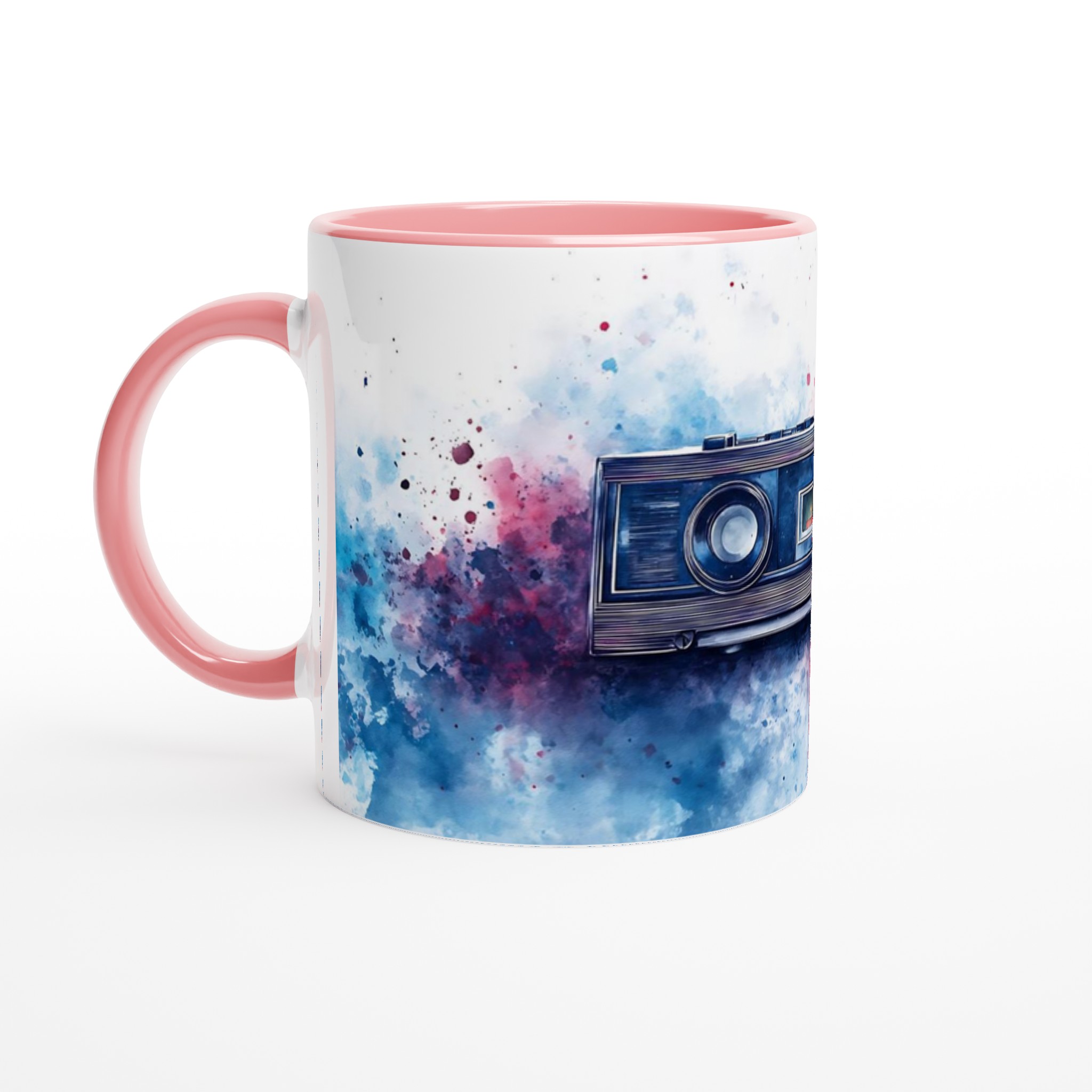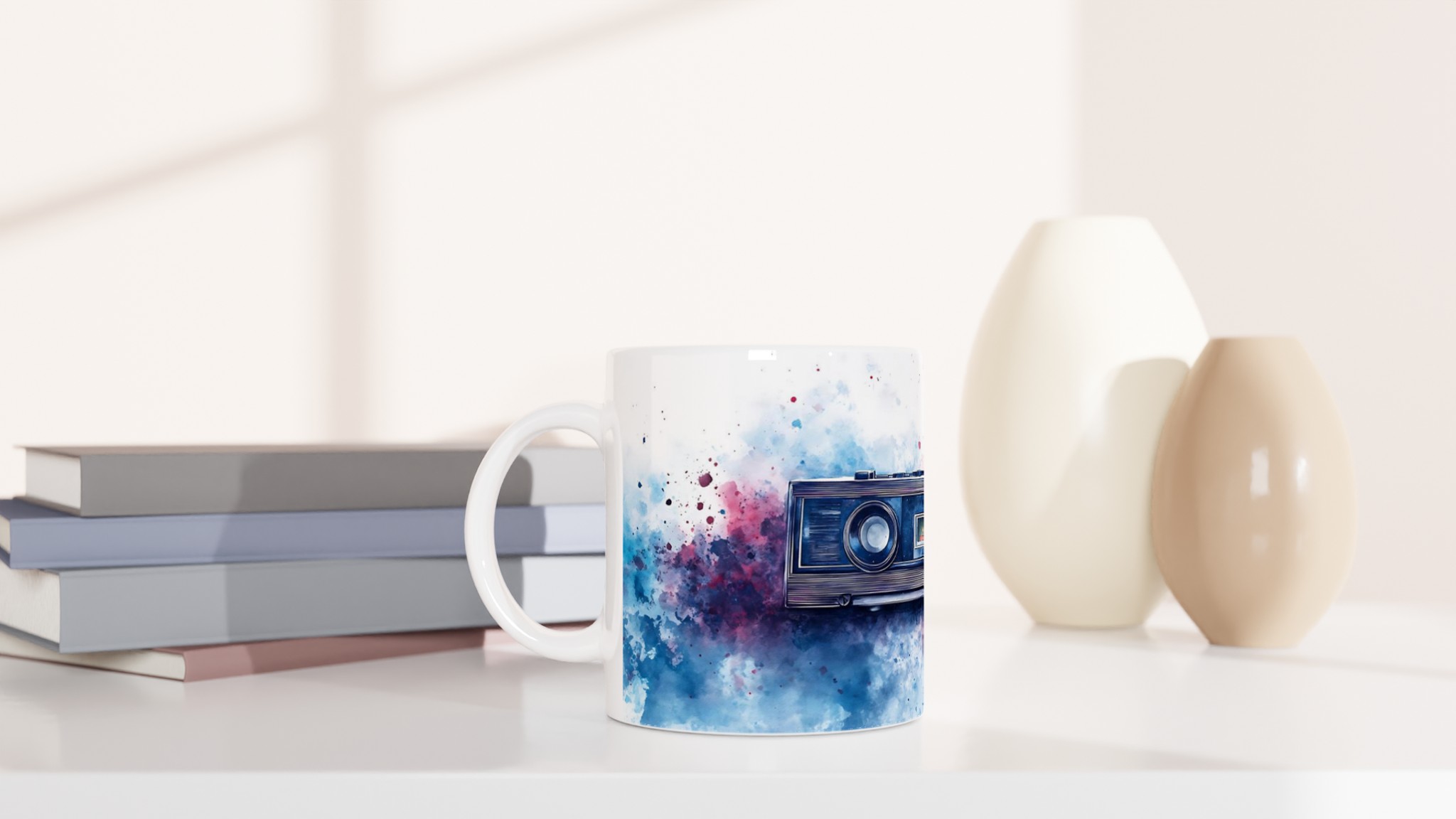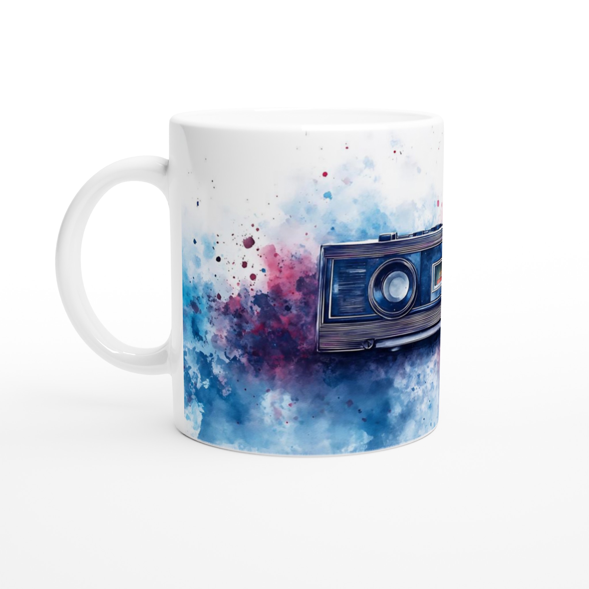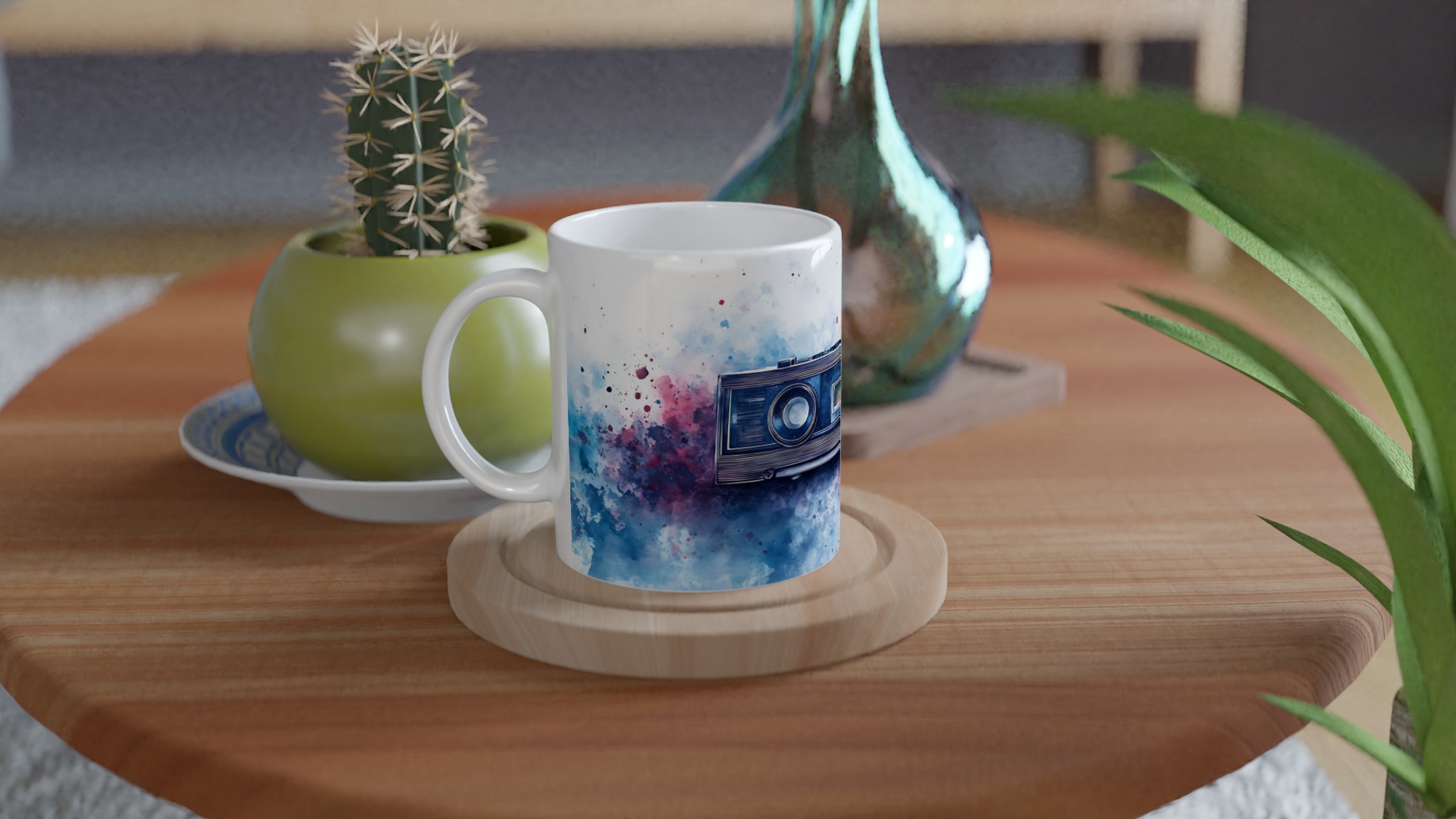 Den här stilrena keramiska muggen blir snabbt en vardagsfavorit. Perfekt för morgonkaffet, kvällens varma choklad eller när du bara vill njuta av en kopp te. Med sitt unika tryck av en klassisk kassettbandspelare i livliga akvarellfärger, omgiven av konstnärliga stänk i blått och rött, är den en hyllning till musikens gyllene era. Den blanka vita ytan gör att trycken framhävs med klara och levande färger, som håller sig fina även efter många turer i mikron och diskmaskinen.
