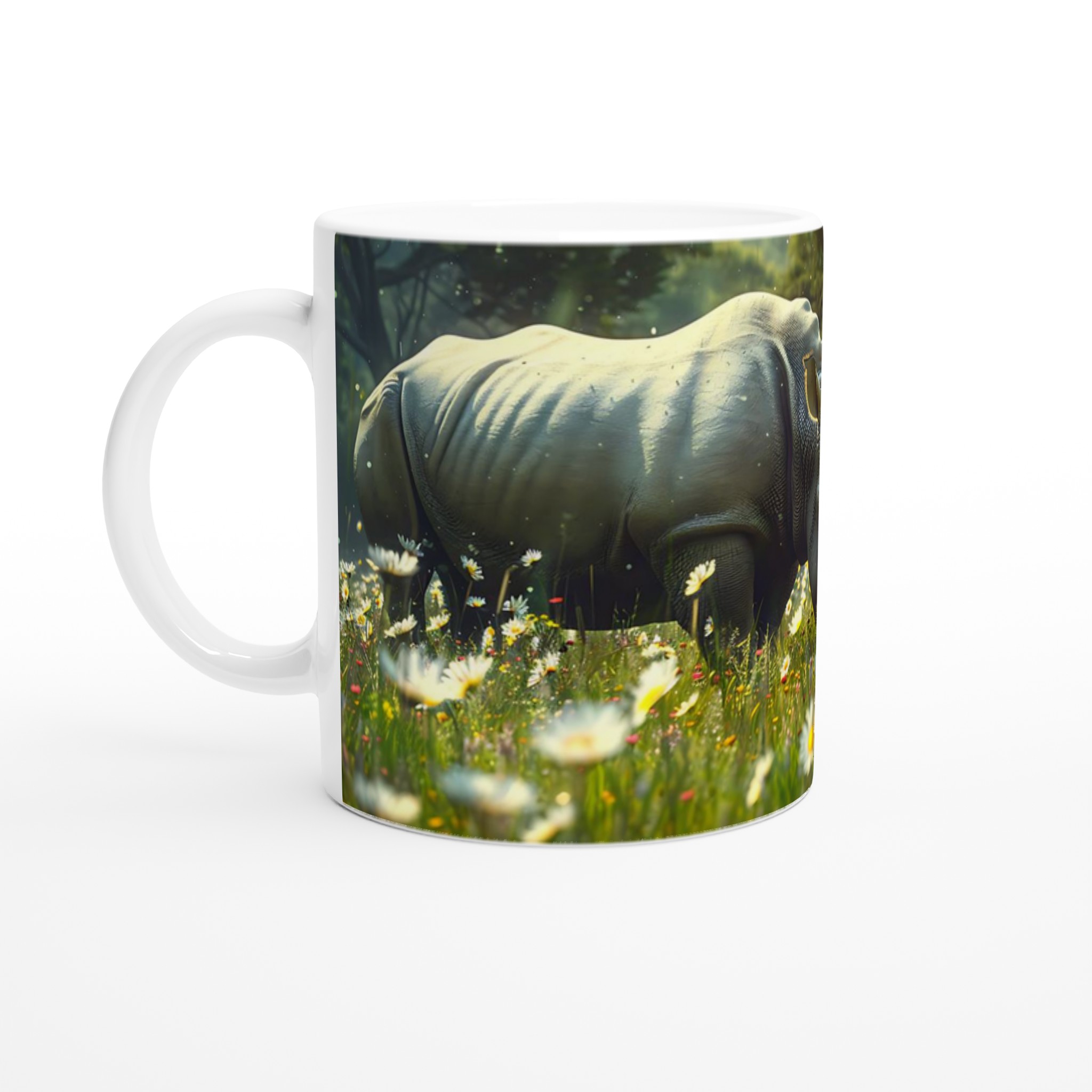 Förvandla din dagliga kaffestund till en fridfull flykt med vår unika keramikmugg, prydd med ett majestätiskt noshörningsmotiv mitt i en blomstrande äng.