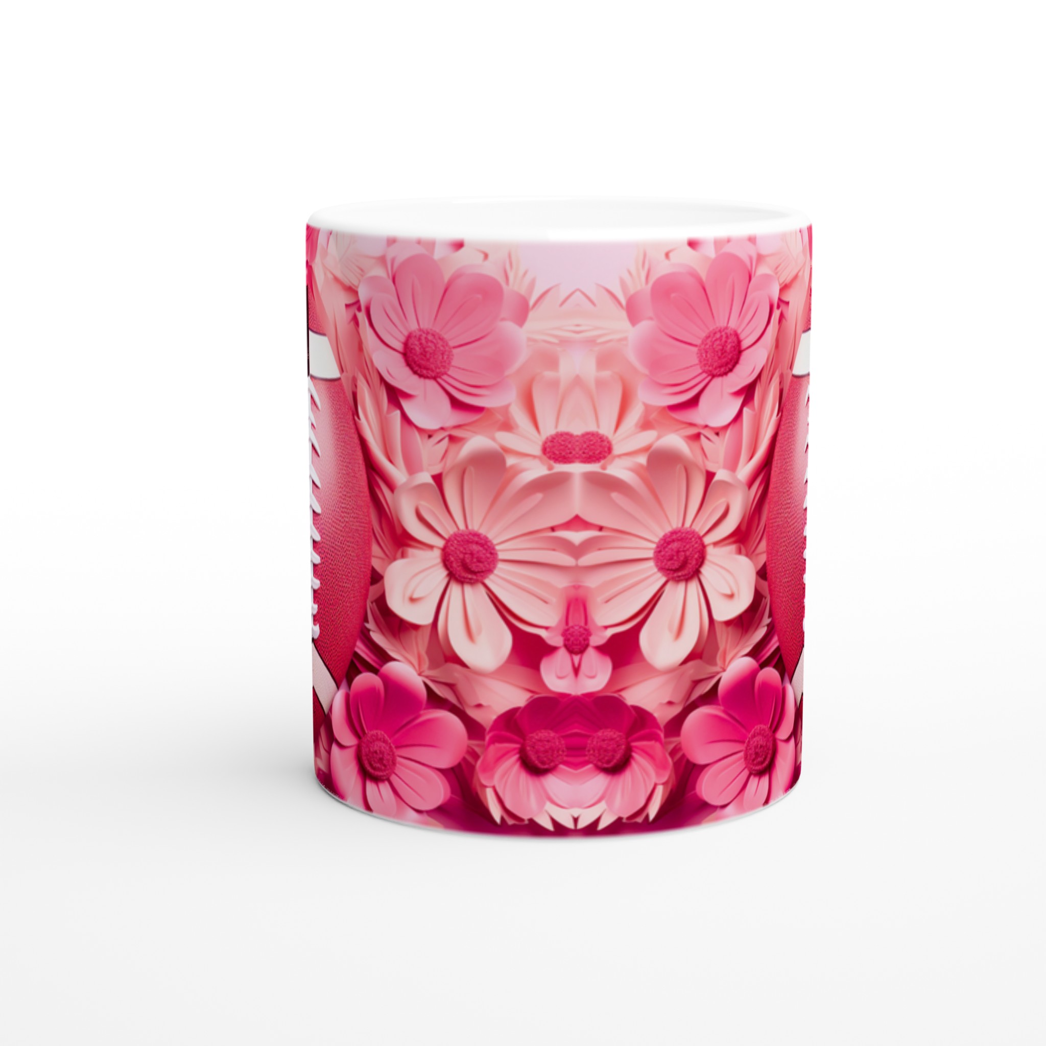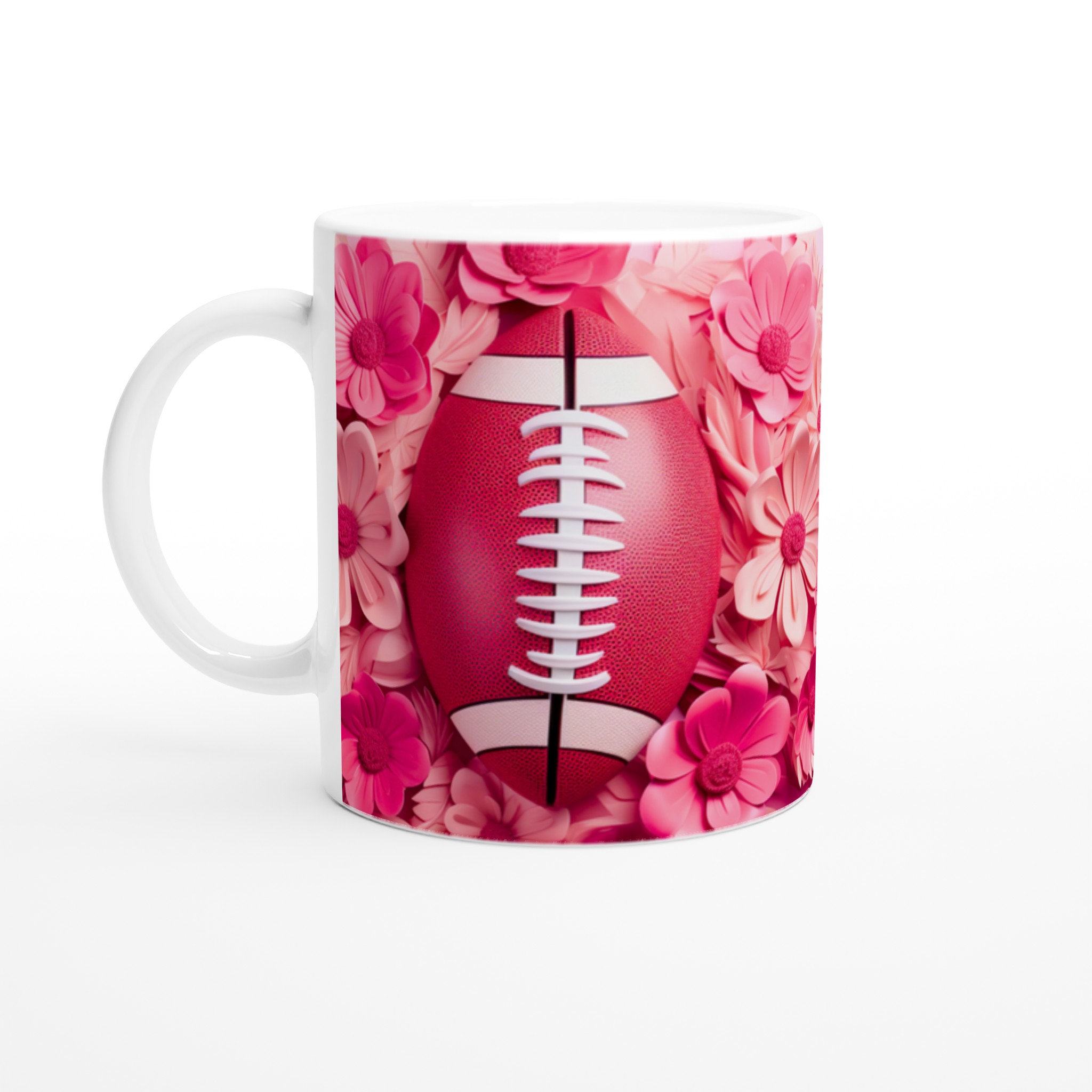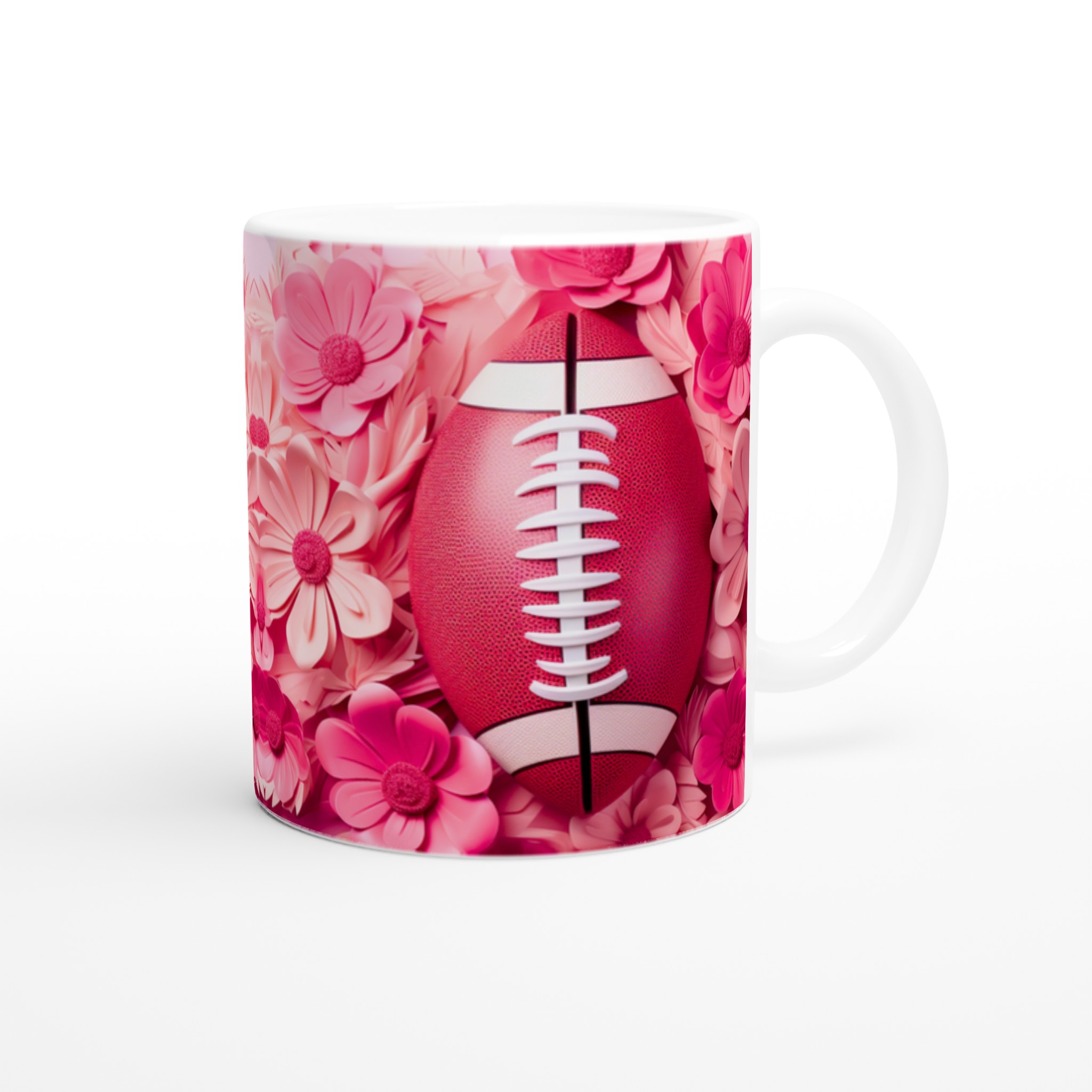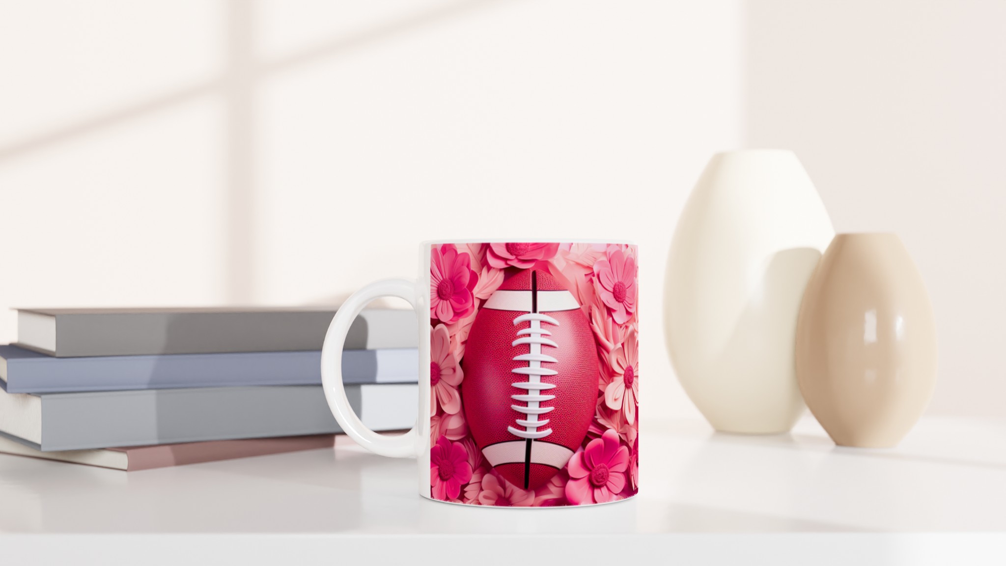 Fånga den perfekta mixen av sportentusiasm och romantisk charm med vår unika keramiska mugg. Denna stilrena mugg, prydd med ett förtrollande mönster av rosa blommor och en matchande fotboll, blir snabbt en vardagsfavorit. Perfekt för morgonkaffet, kvällens varma choklad eller när du bara vill njuta av en kopp te. Den blanka vita ytan framhäver trycken med klara och levande färger, som håller sig fina även efter många turer i mikron och diskmaskinen.
