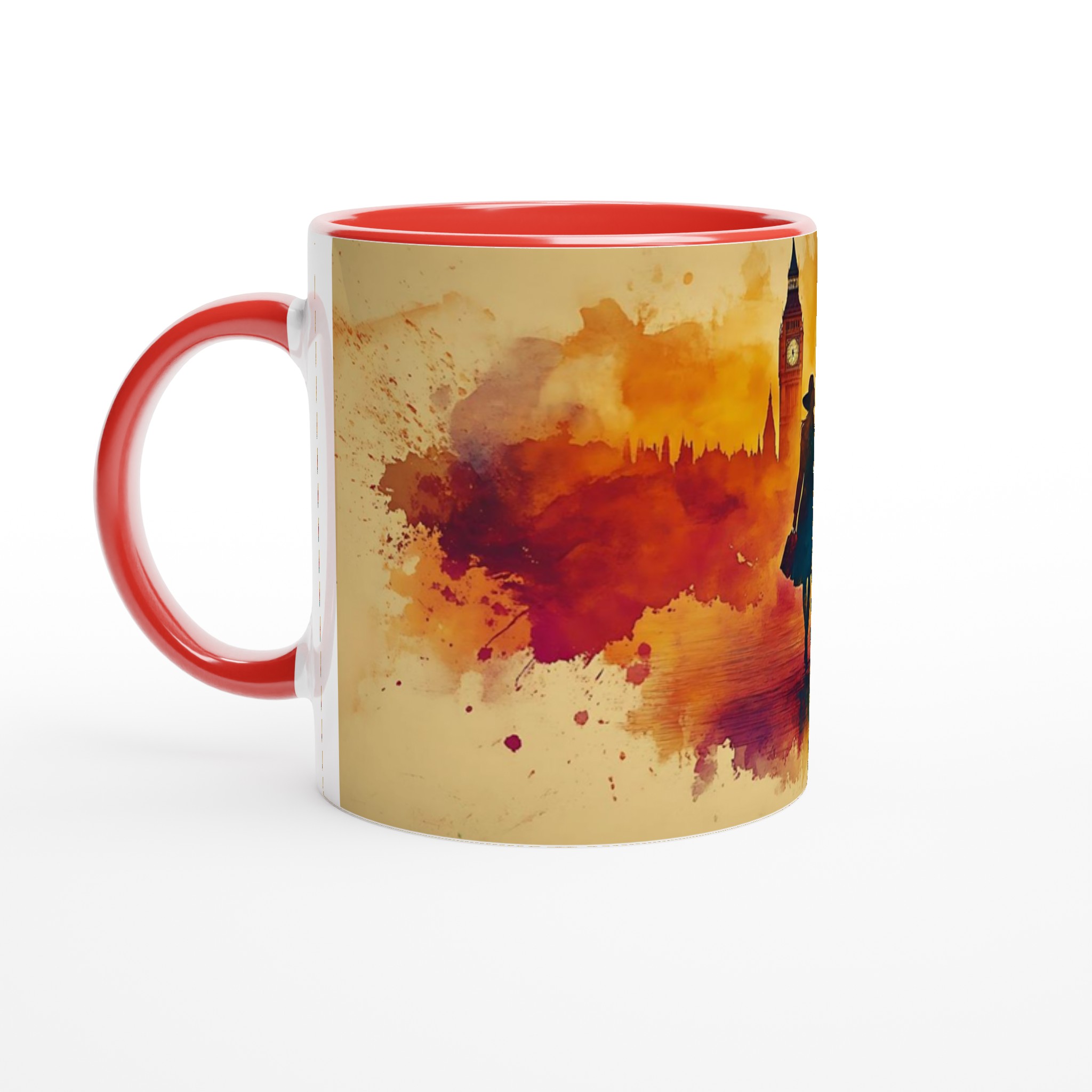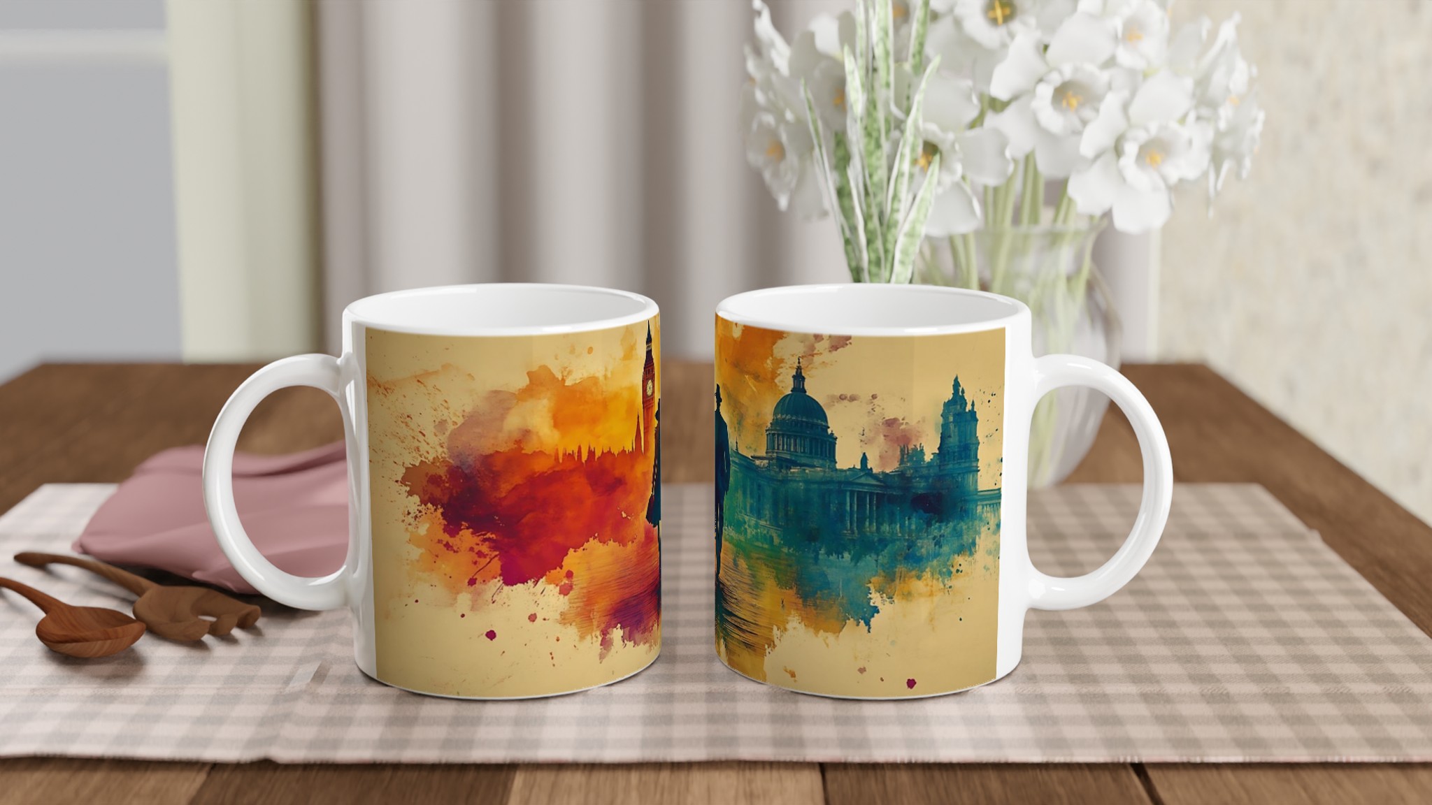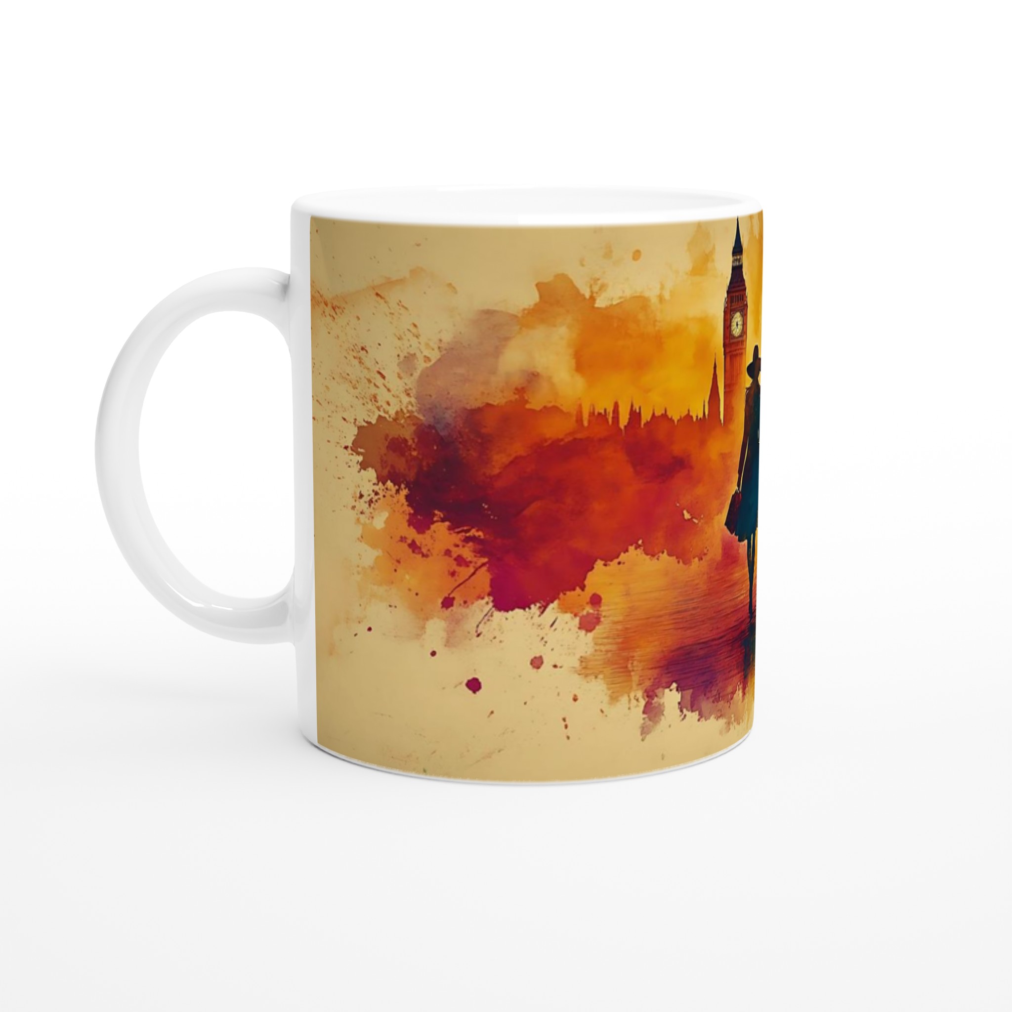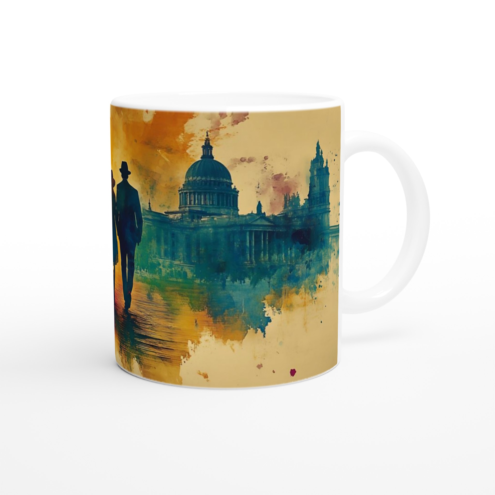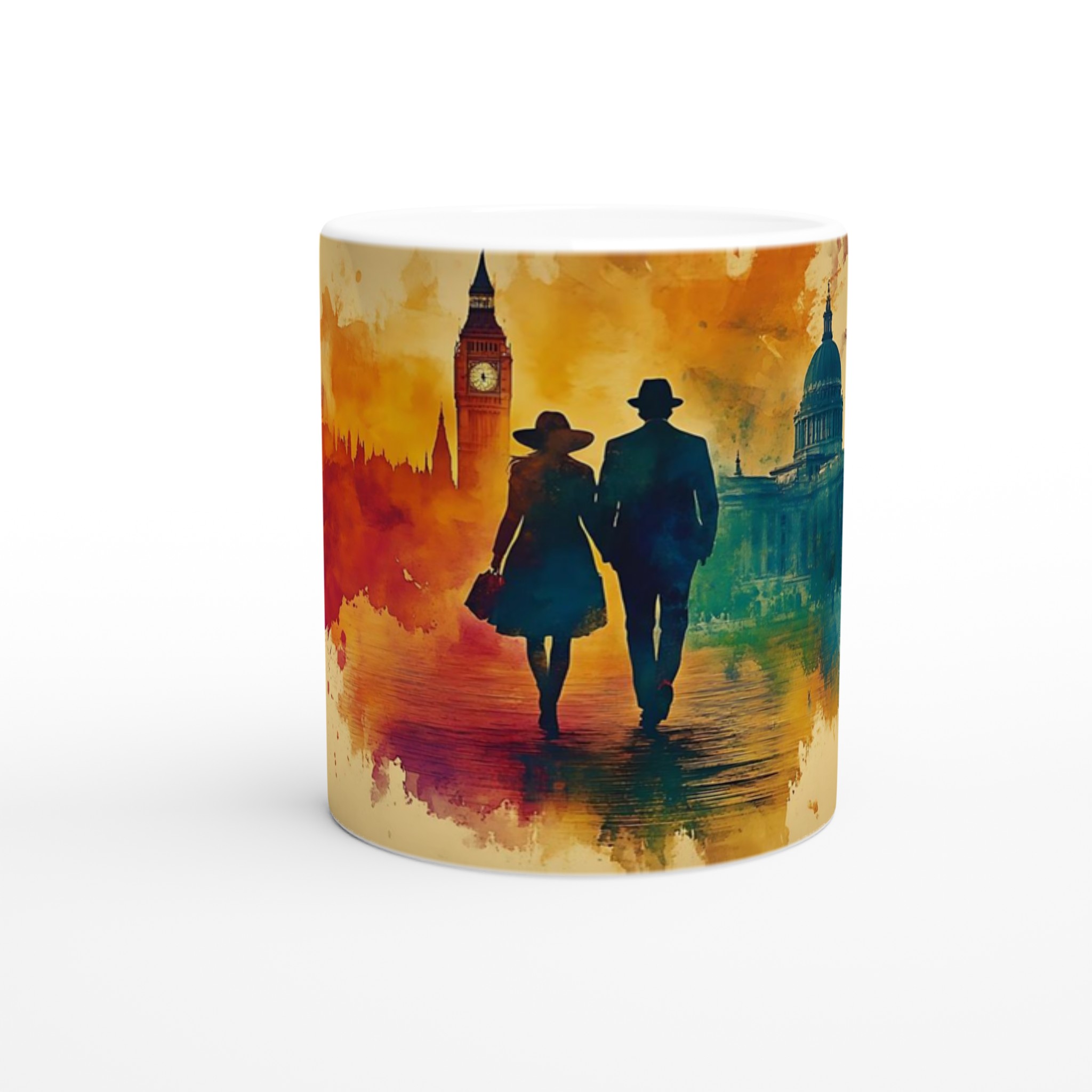 Fånga den romantiska stämningen från en promenad genom London med denna unika keramiska mugg. Motivet, som föreställer två figurer som vandrar bland ikoniska landmärken i en drömsk akvarellstil, skapar en känsla av äventyr och tidlös elegans. De varma orange och röda tonerna möter djupa blå nyanser, vilket ger en fängslande kontrast som väcker liv i varje kopp.