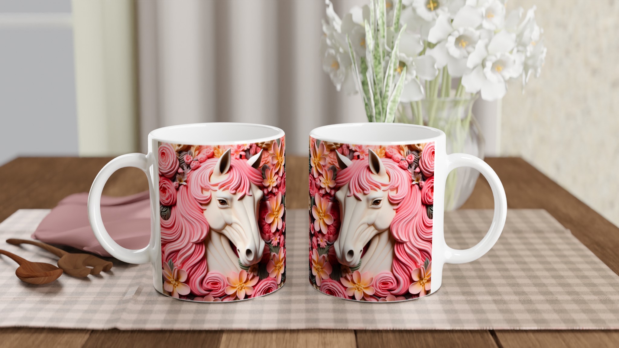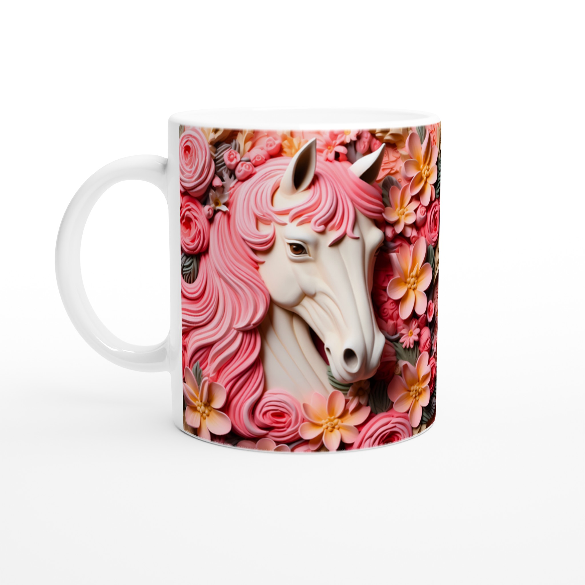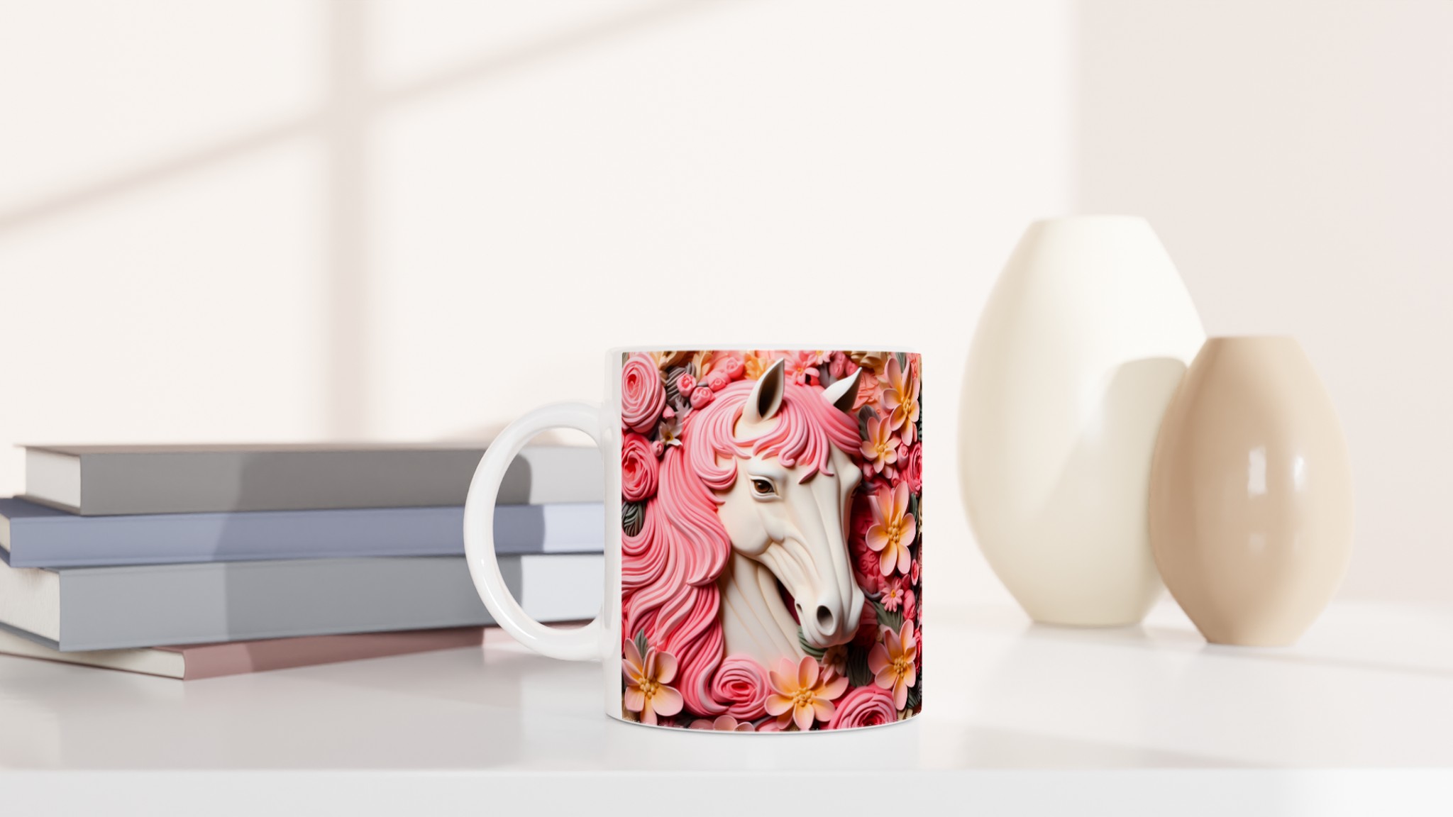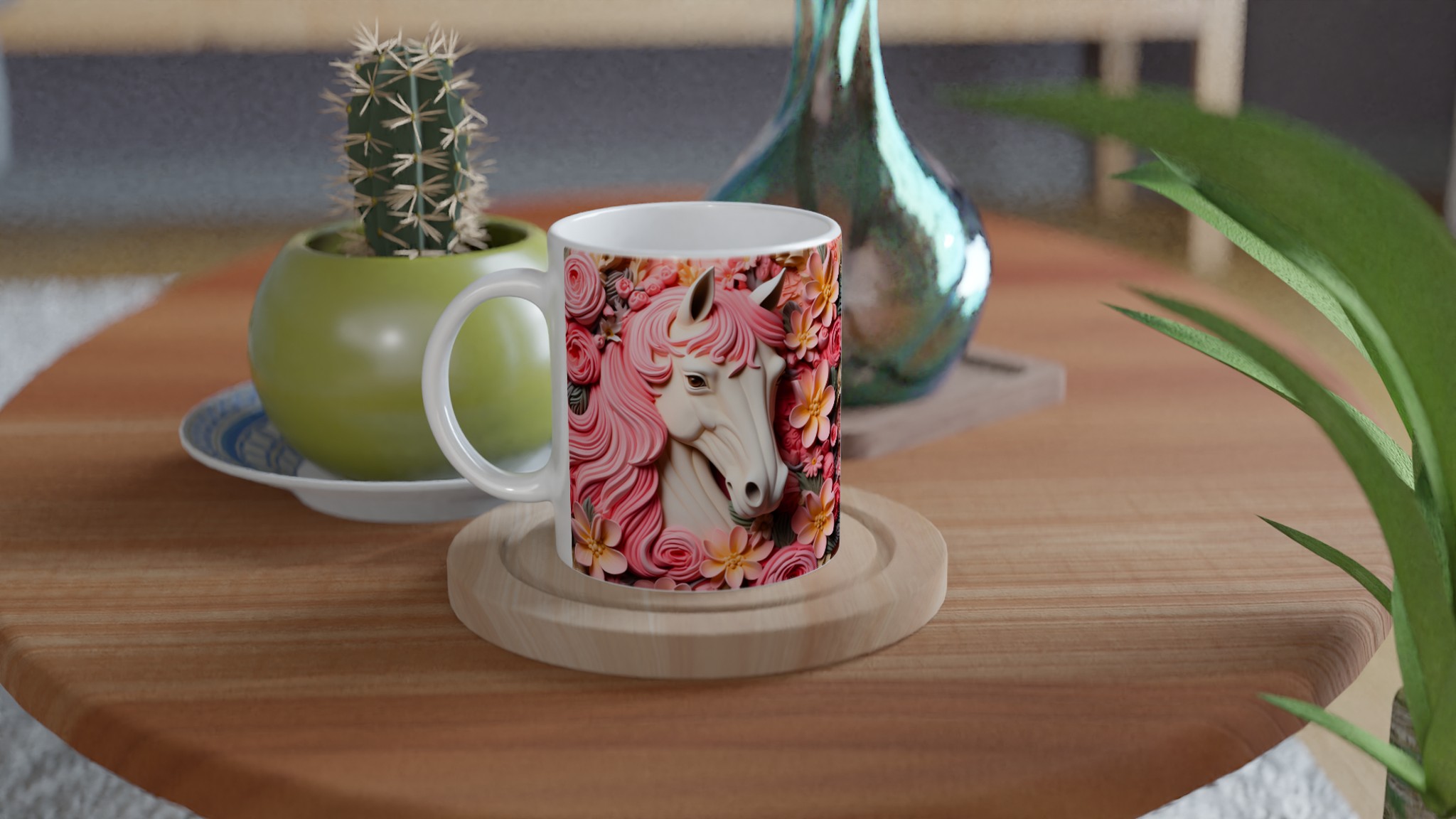 Föreställ dig att börja dagen med en kopp kaffe i denna förtrollande keramiska mugg, prydd med en drömlik häst omgiven av ljuvliga rosa och aprikosfärgade blommor. Denna mugg är inte bara en dryckesbehållare, utan ett konstverk som förvandlar varje sipp till en stund av lugn och skönhet. Med sin blanka vita yta framhävs det fantasifulla trycket med otrolig klarhet, och de levande färgerna består, kopp efter kopp, även efter många turer i mikron och diskmaskinen.