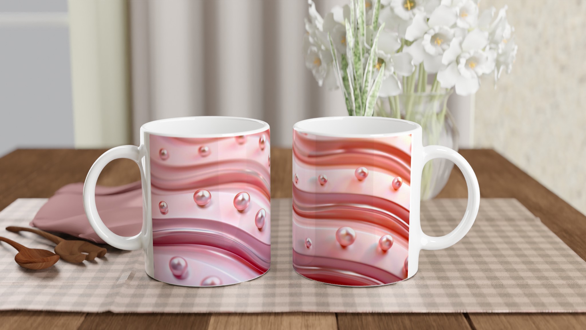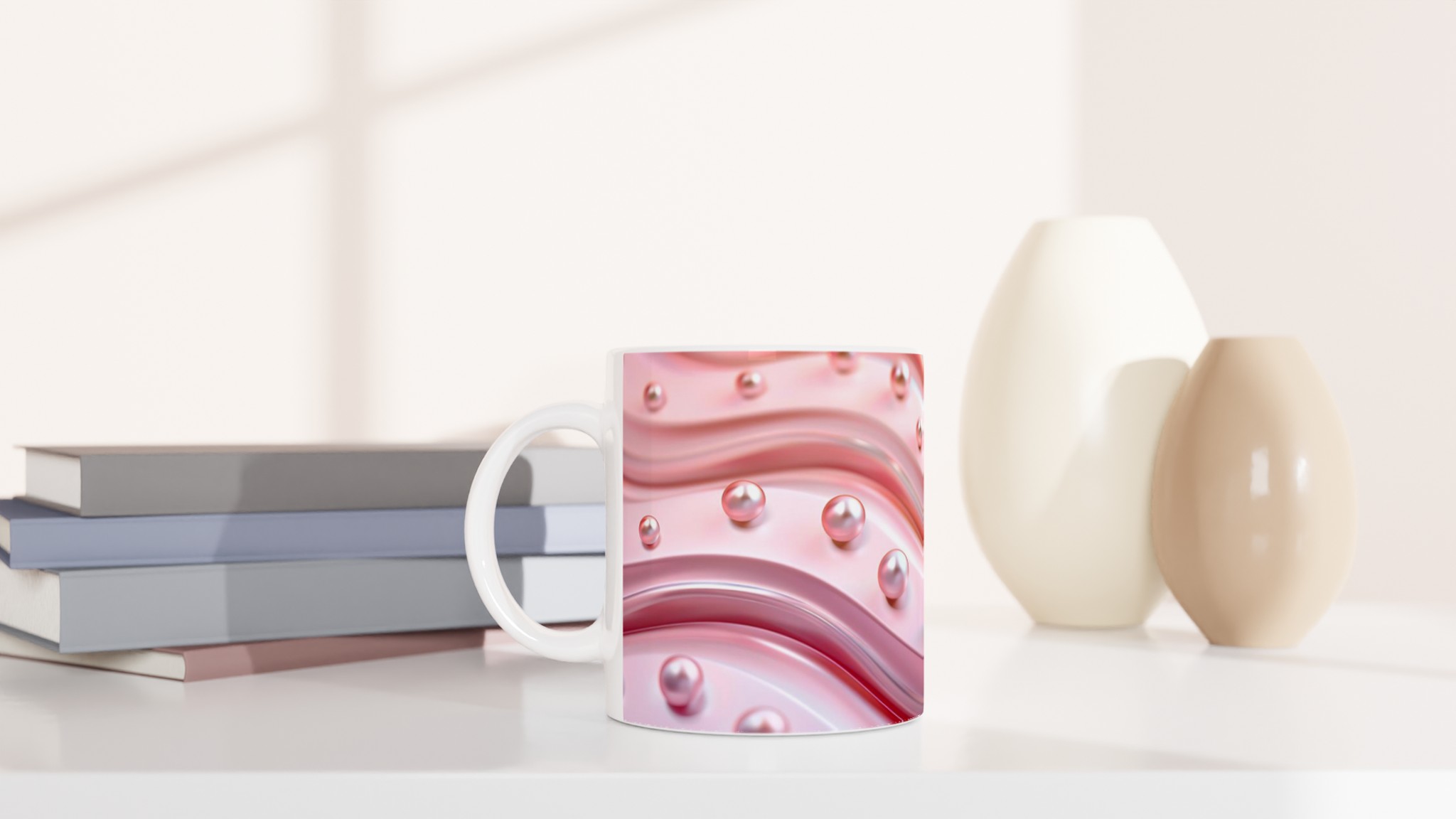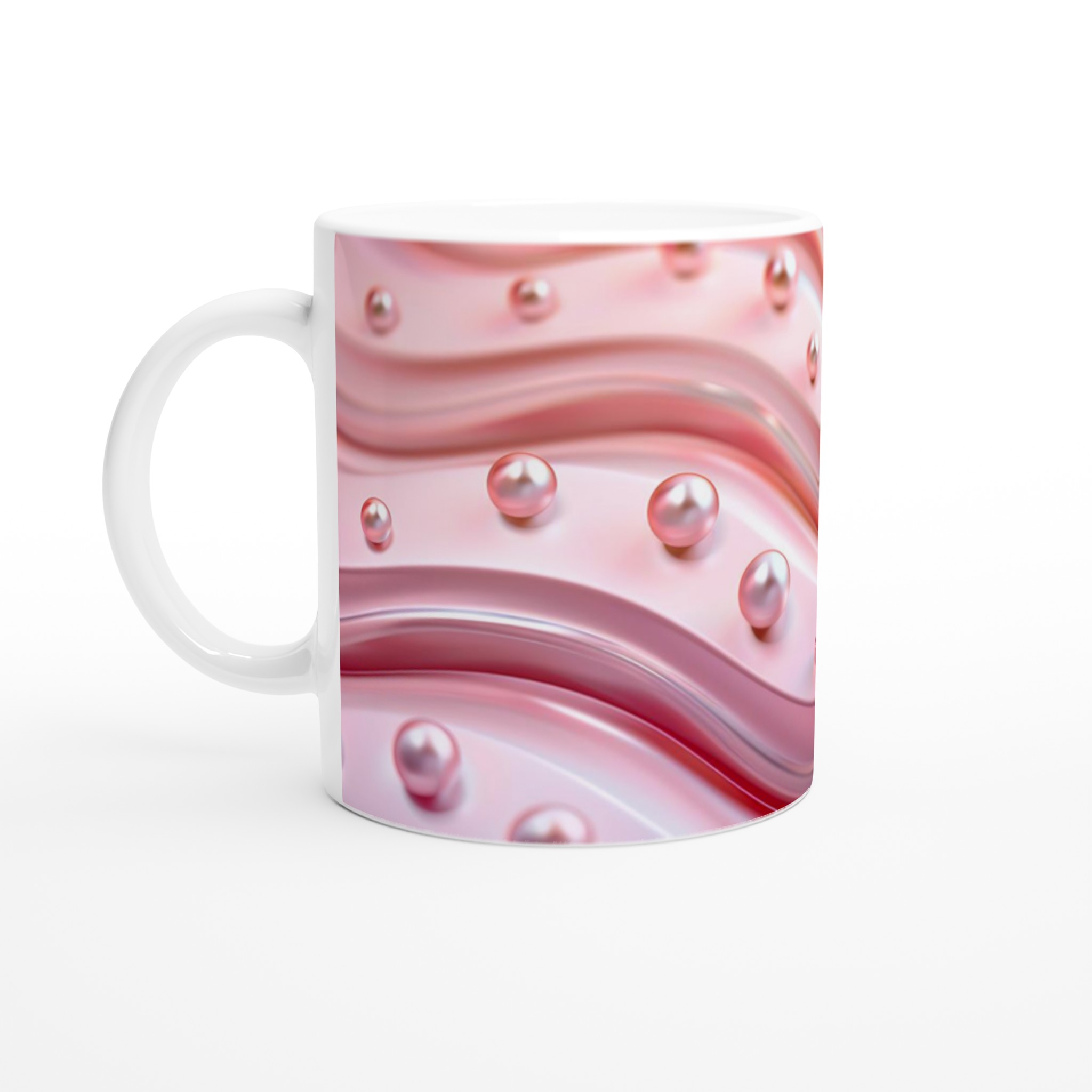 Låt dig svepas med av en våg av rosa elegans med vår förtrollande keramikmugg, inspirerad av bildens lugna flöde och skimrande pärlor. Denna stilrena och vackra mugg är perfekt för alla dagens stunder – morgonkaffet, en värmande kopp te eller en härlig varm choklad. Den blanka ytan gör att trycken framträder klart och färgstarkt, vilket gör muggen till en riktig favorit i vardagen, oavsett om du väljer en klassisk vit eller någon av våra livfulla nyanser.