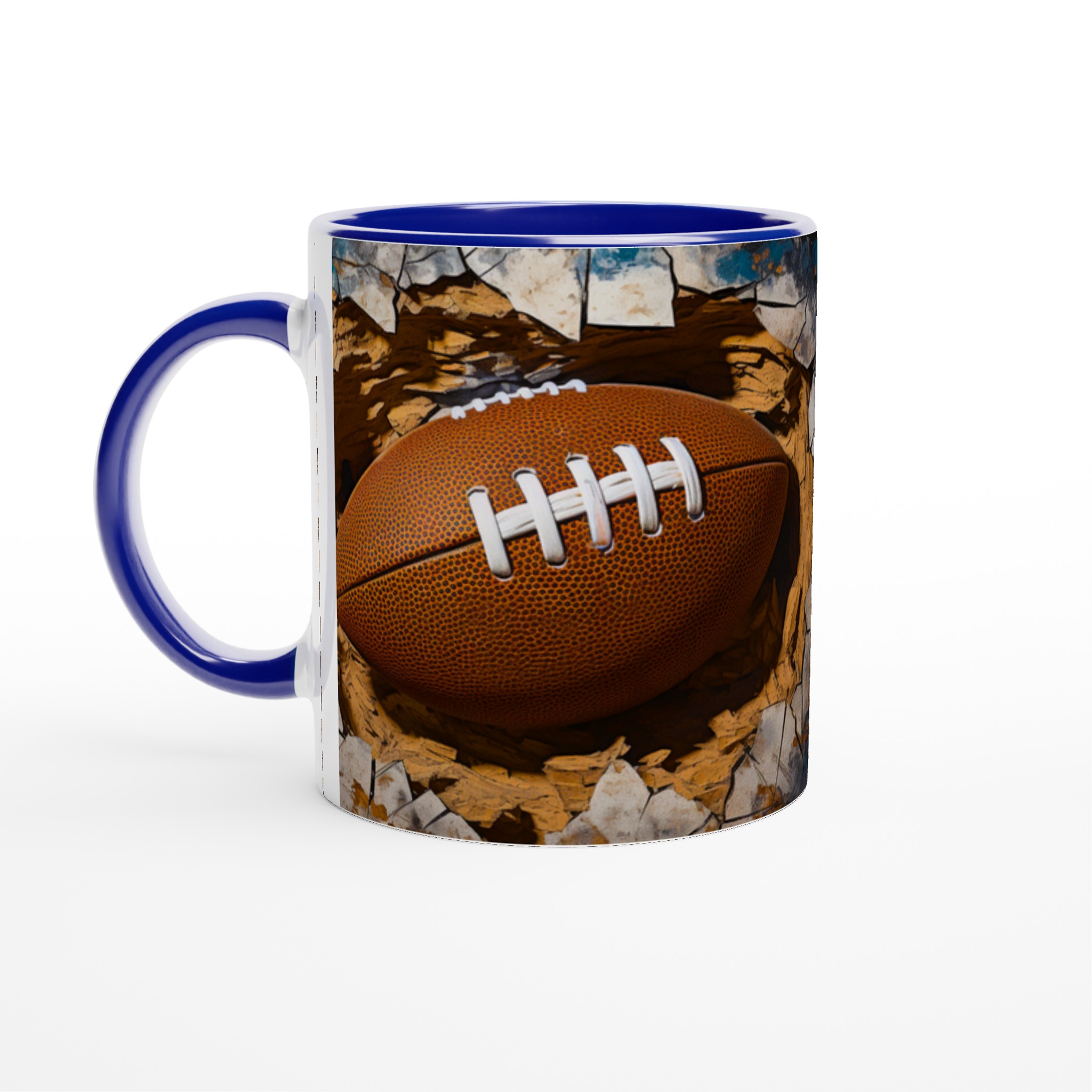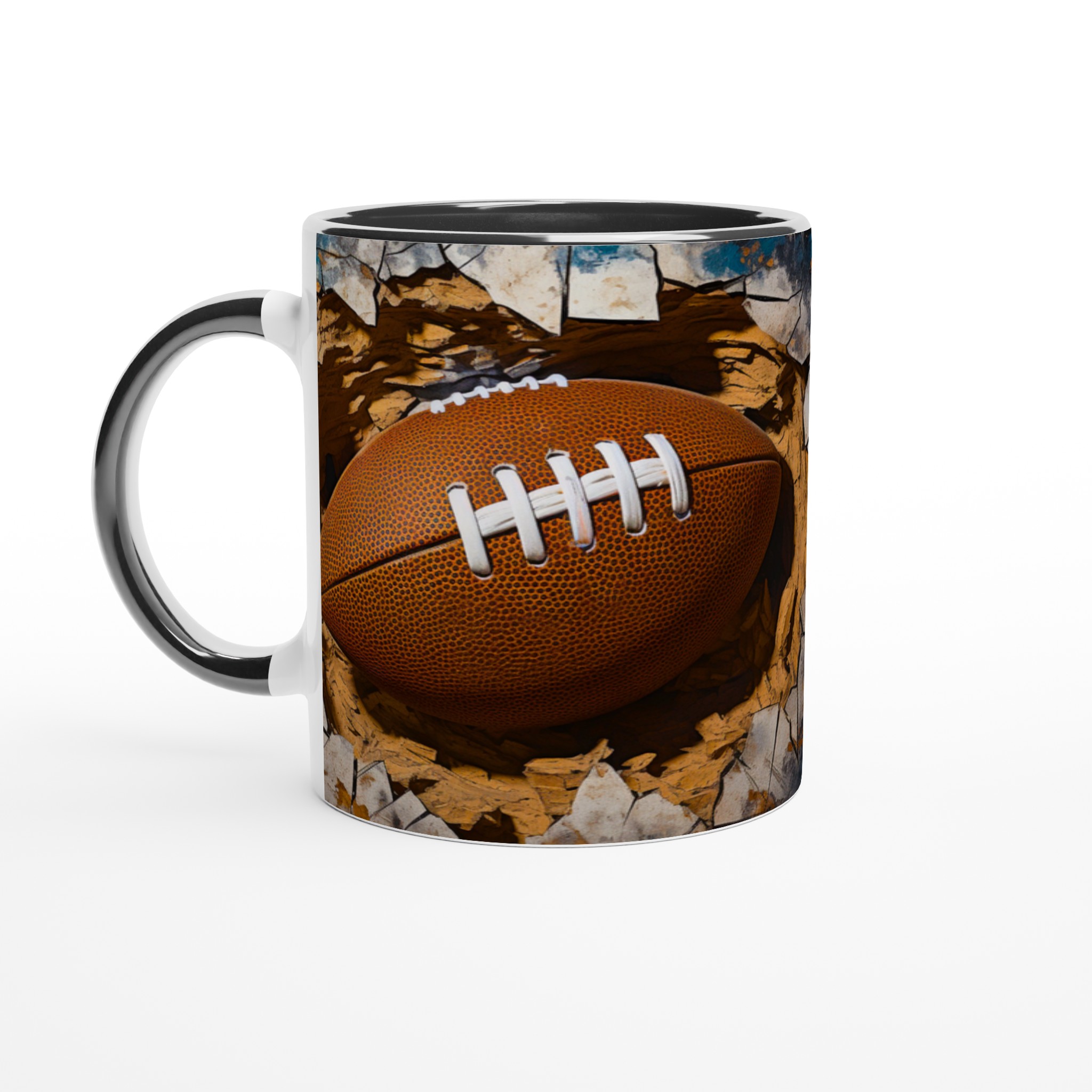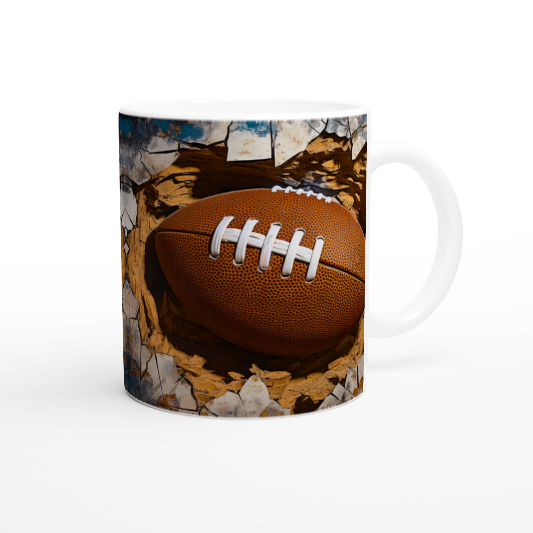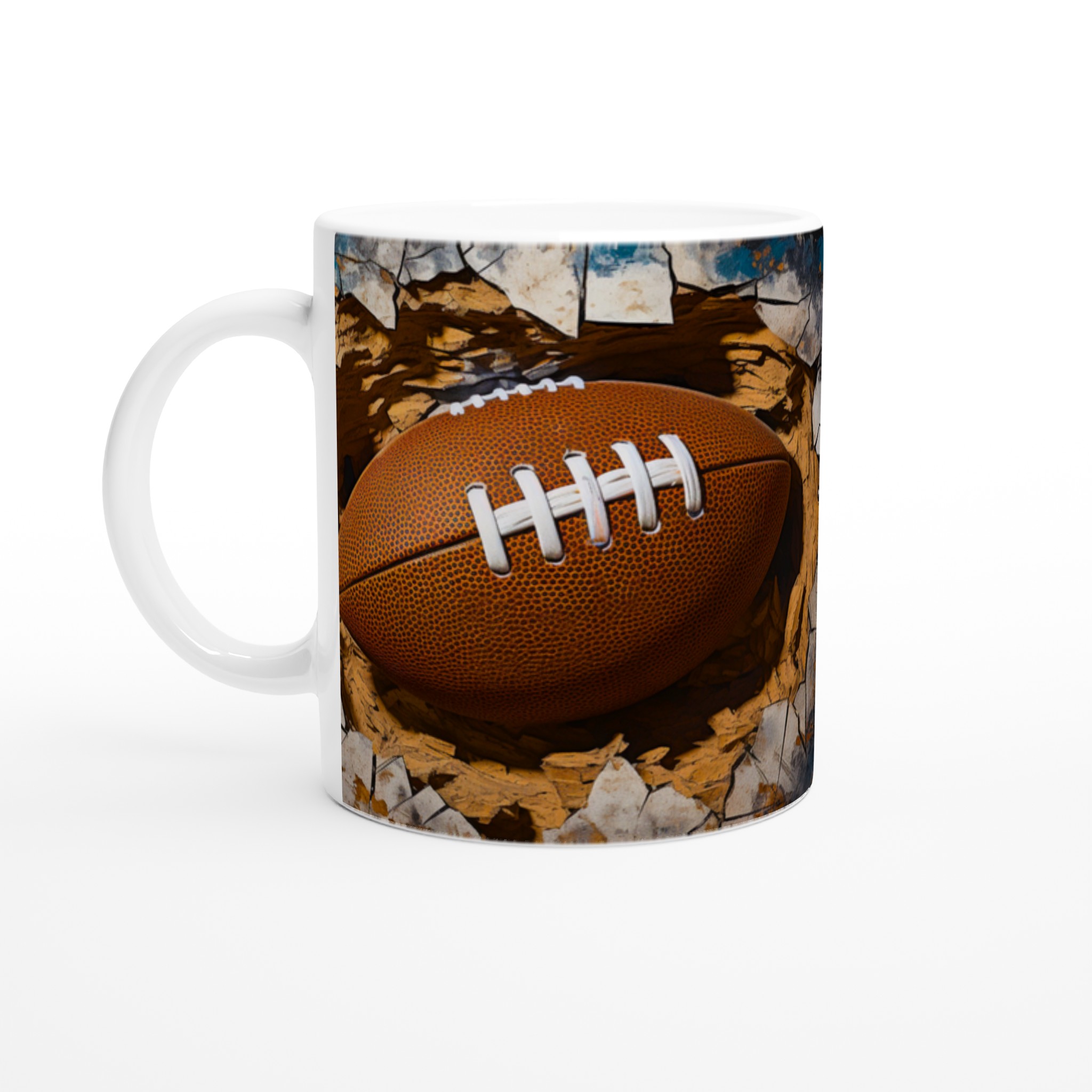 Väck din inre atlet med denna unika keramiska mugg! Föreställ dig energin när du njuter av morgonkaffet, en stärkande kopp te efter träningen eller kvällens varma choklad, omgiven av den dynamiska bilden av en rugbyboll som spränger fram. Den här muggen är mer än bara en dryckesbehållare; den är en hyllning till styrka och passion, perfekt för sportentusiasten eller den som uppskattar en rå, konstnärlig estetik.