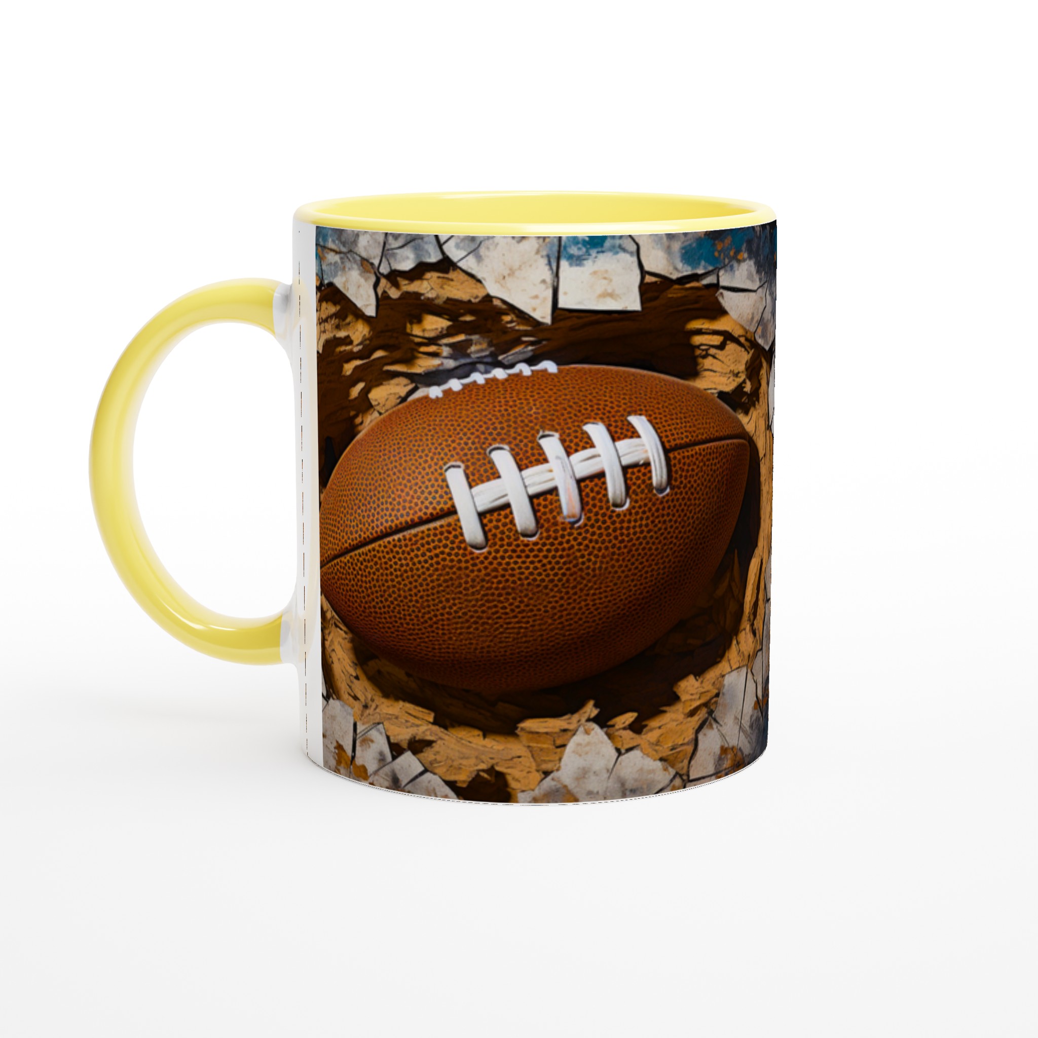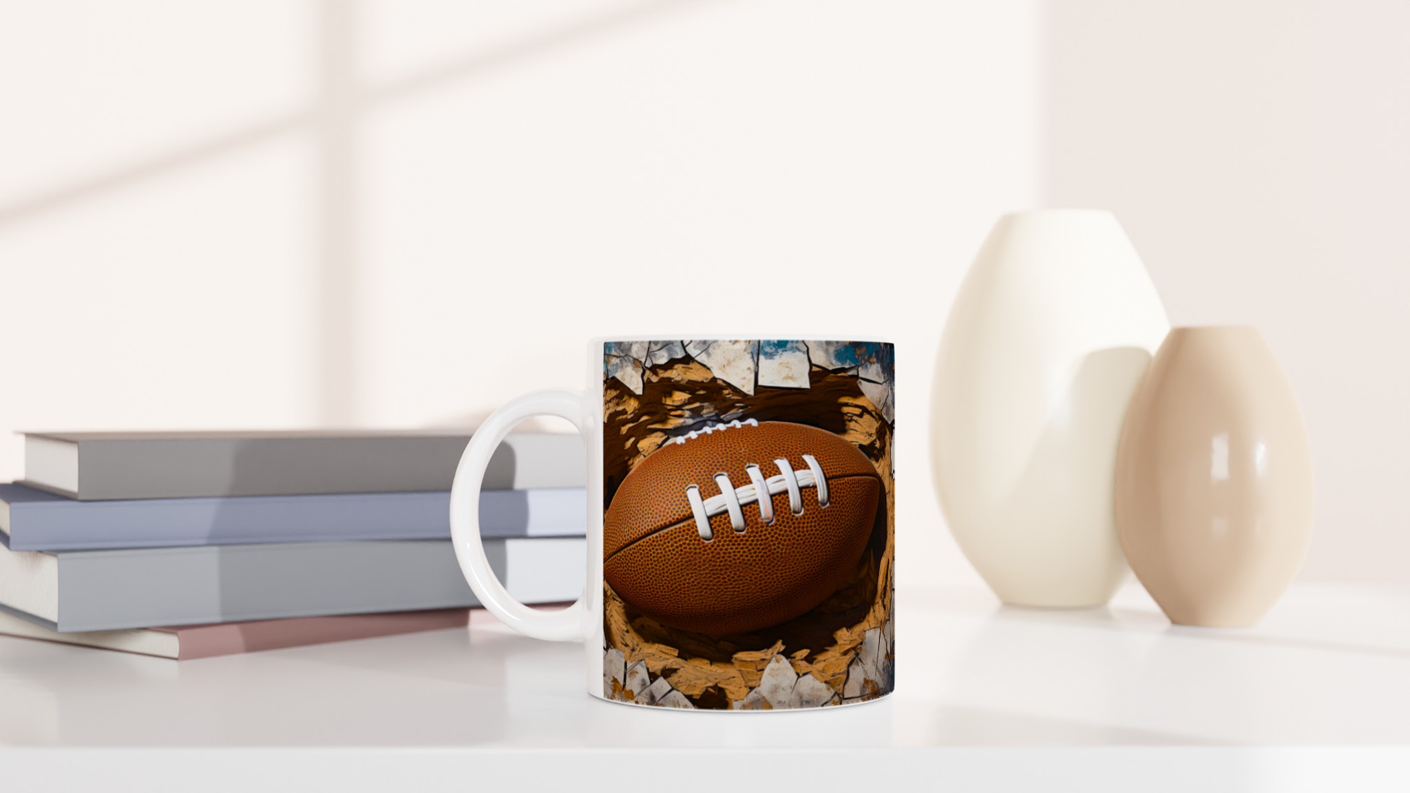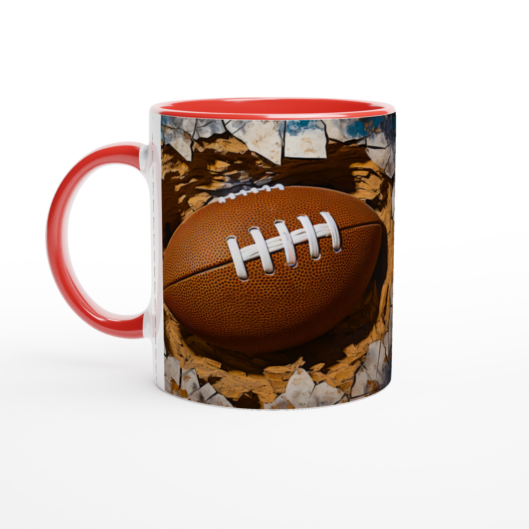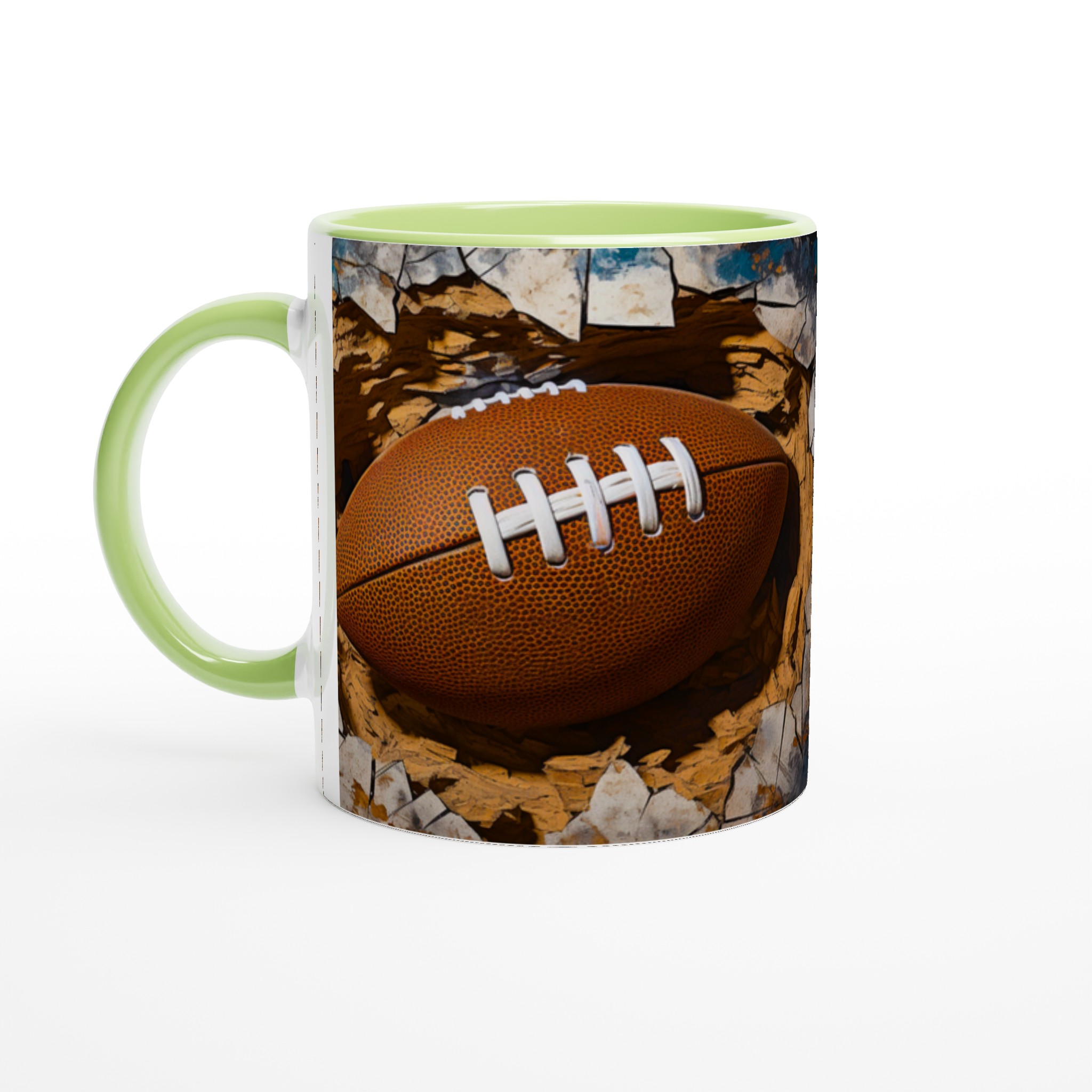 Väck din inre atlet med denna unika keramiska mugg! Föreställ dig energin när du njuter av morgonkaffet, en stärkande kopp te efter träningen eller kvällens varma choklad, omgiven av den dynamiska bilden av en rugbyboll som spränger fram. Den här muggen är mer än bara en dryckesbehållare; den är en hyllning till styrka och passion, perfekt för sportentusiasten eller den som uppskattar en rå, konstnärlig estetik.