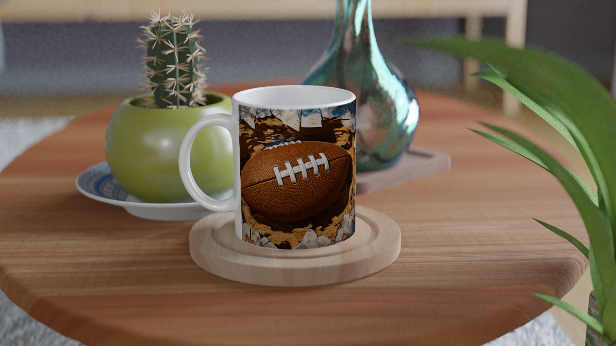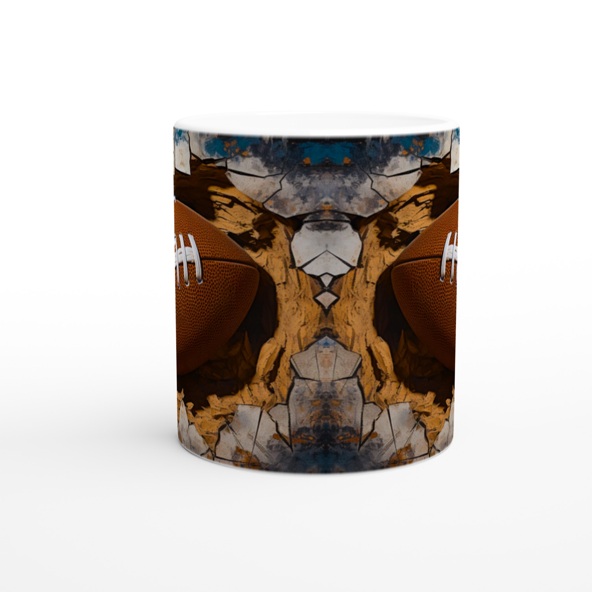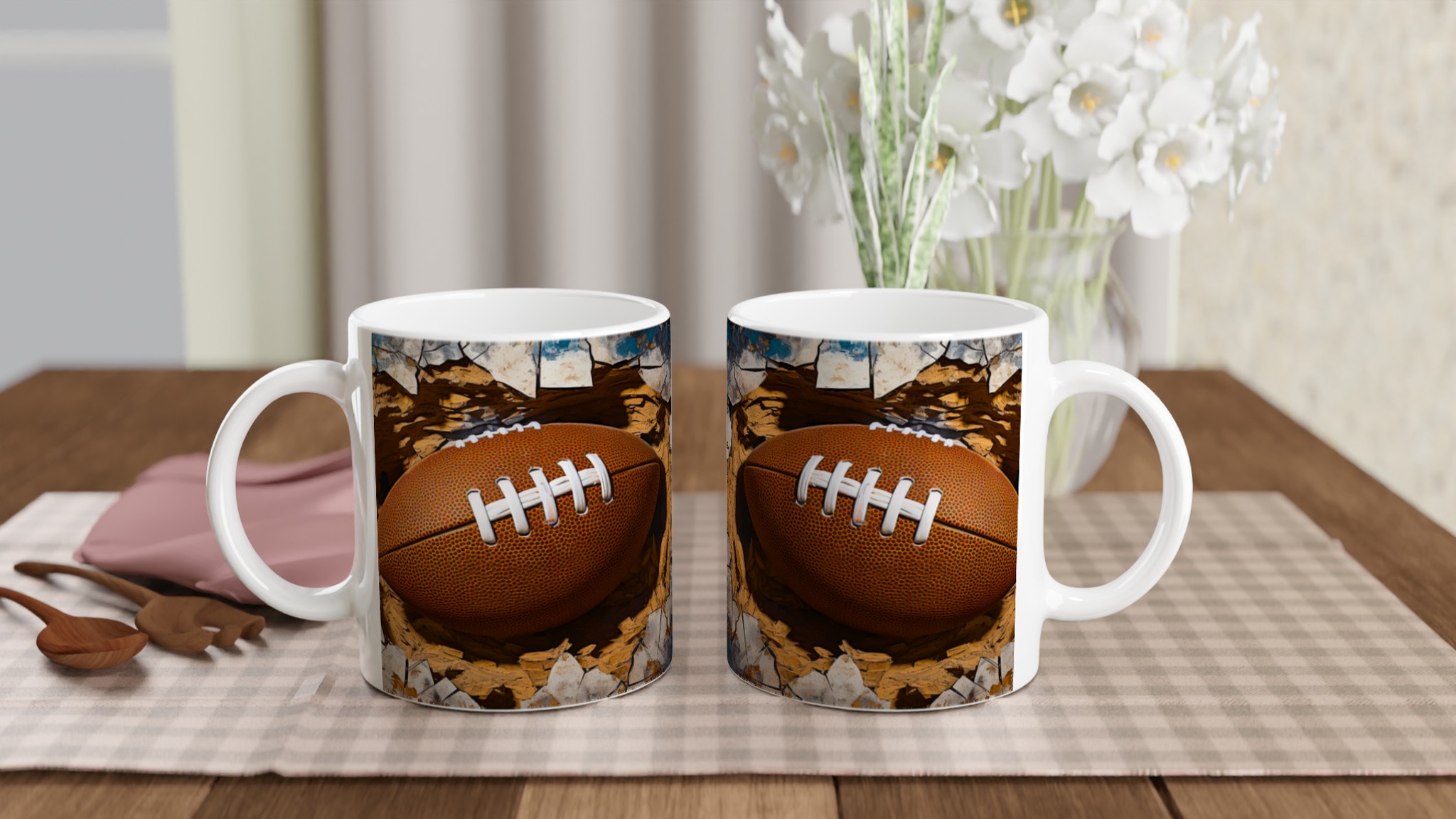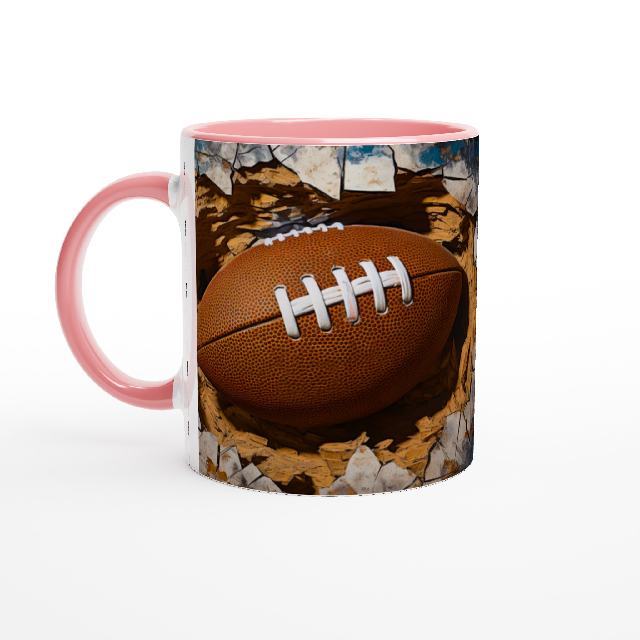 Väck din inre atlet med denna unika keramiska mugg! Föreställ dig energin när du njuter av morgonkaffet, en stärkande kopp te efter träningen eller kvällens varma choklad, omgiven av den dynamiska bilden av en rugbyboll som spränger fram. Den här muggen är mer än bara en dryckesbehållare; den är en hyllning till styrka och passion, perfekt för sportentusiasten eller den som uppskattar en rå, konstnärlig estetik.
