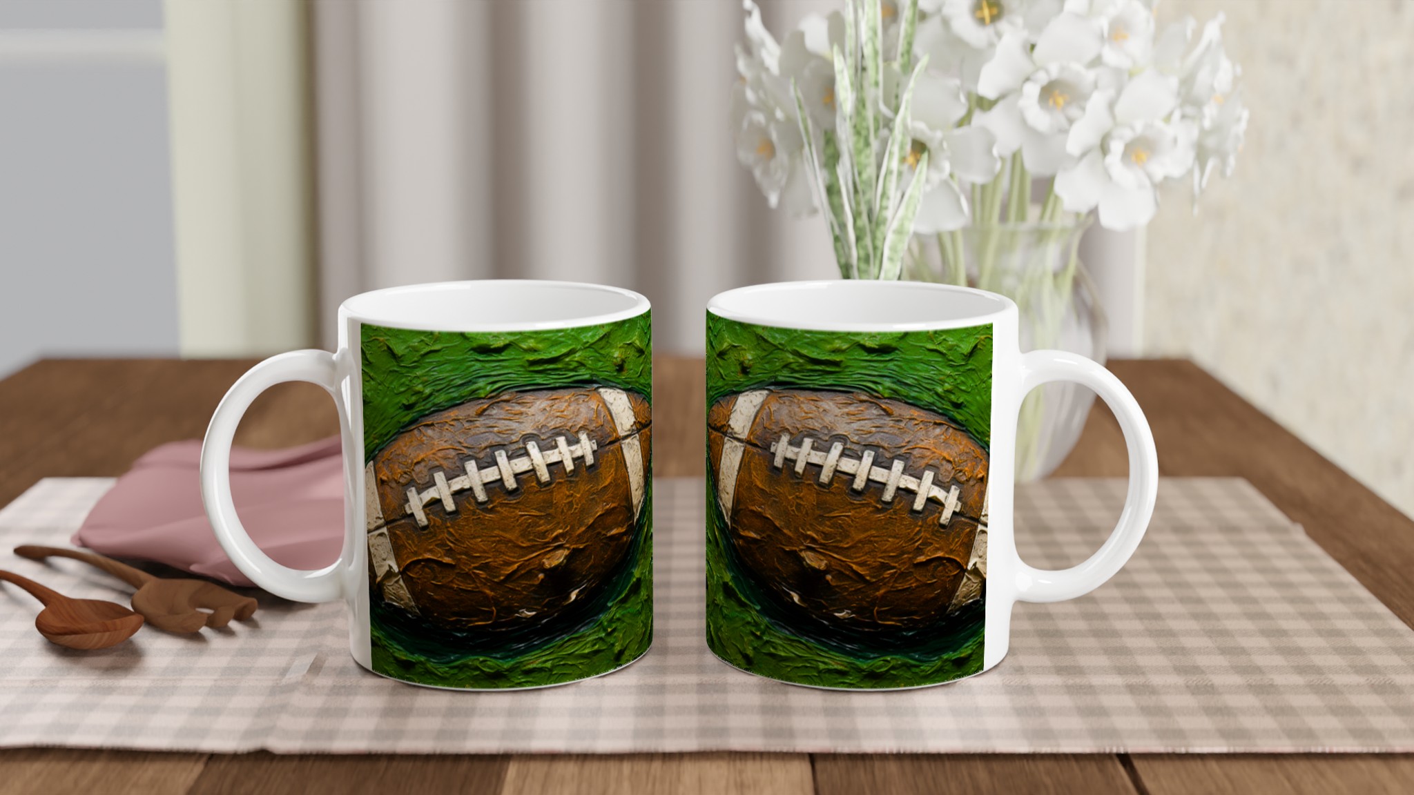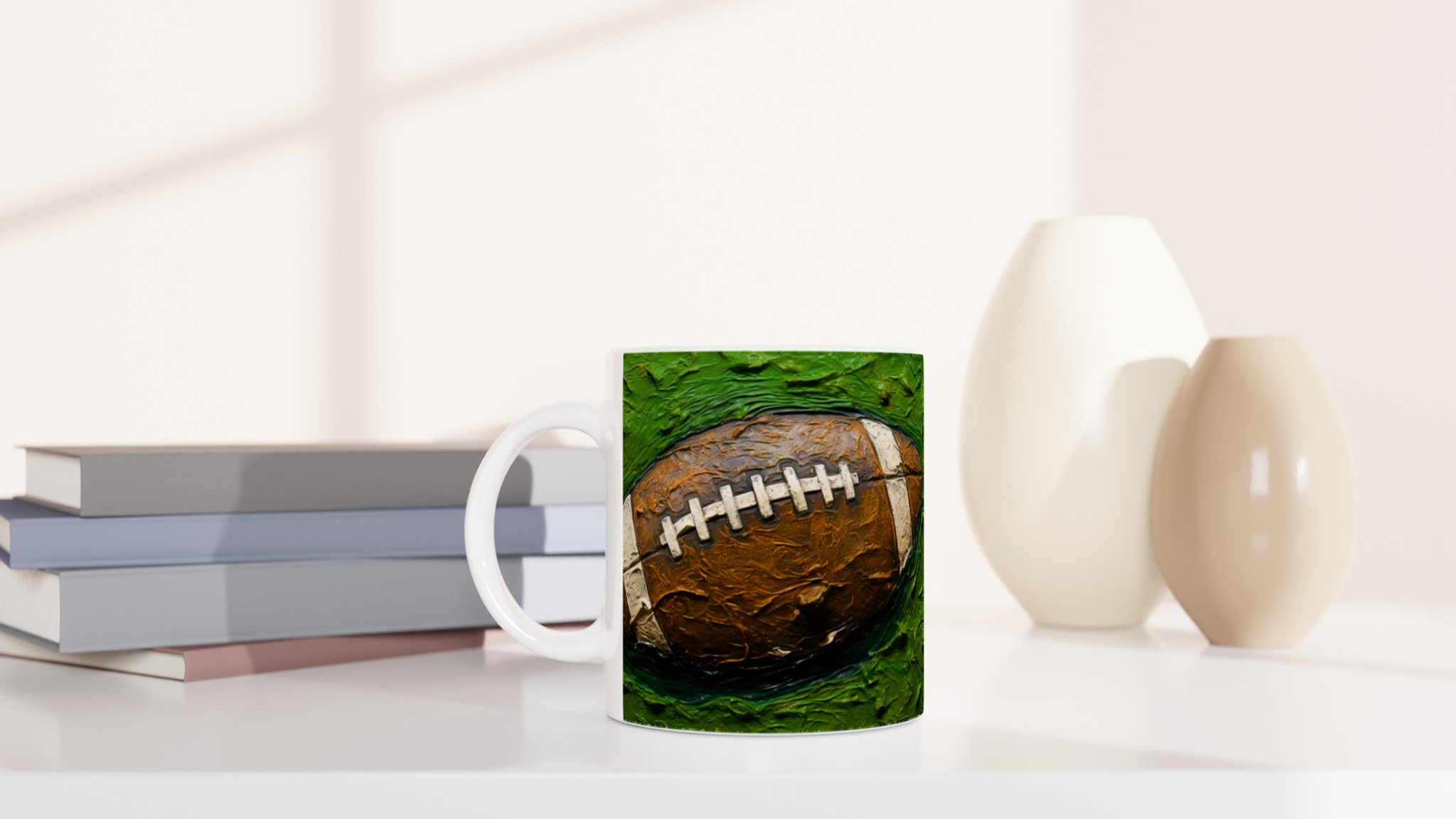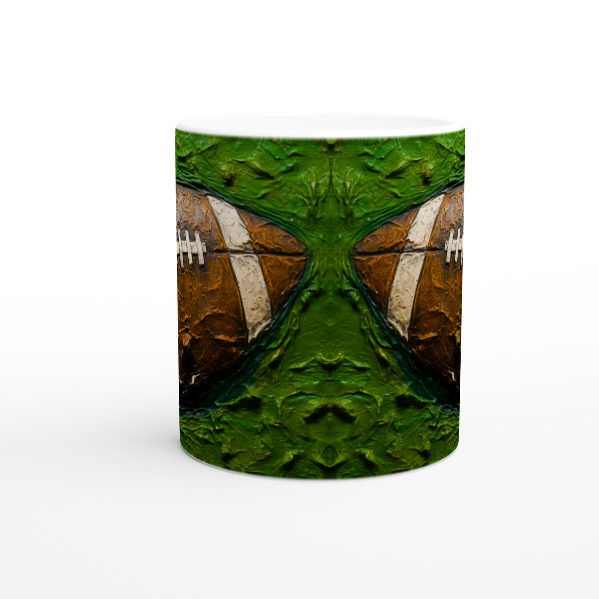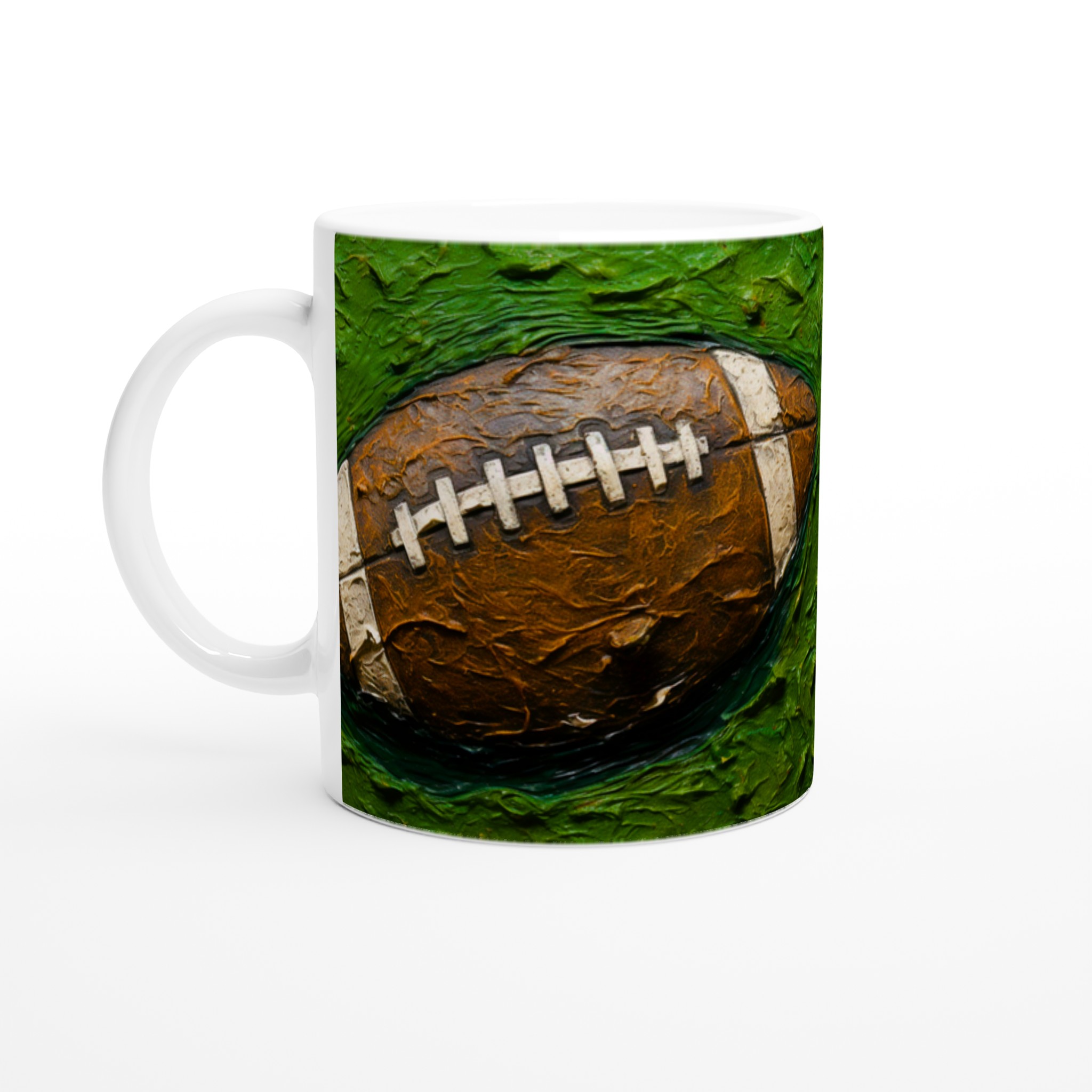 Fånga den råa energin från amerikansk fotboll med denna unika keramiska mugg. Dess design, inspirerad av en strukturerad fotboll och det dynamiska gröna spelplanen, gör varje klunk till en hyllning till sporten. Perfekt för morgonkaffet före matchen, kvällens varma choklad efter träningen eller när du bara vill njuta av en kopp te medan du hejar på ditt favoritlag. Den blanka ytan framhäver den konstnärliga, texturerade bilden med klara och levande färger, som håller sig fina även efter många turer i mikron och diskmaskinen.