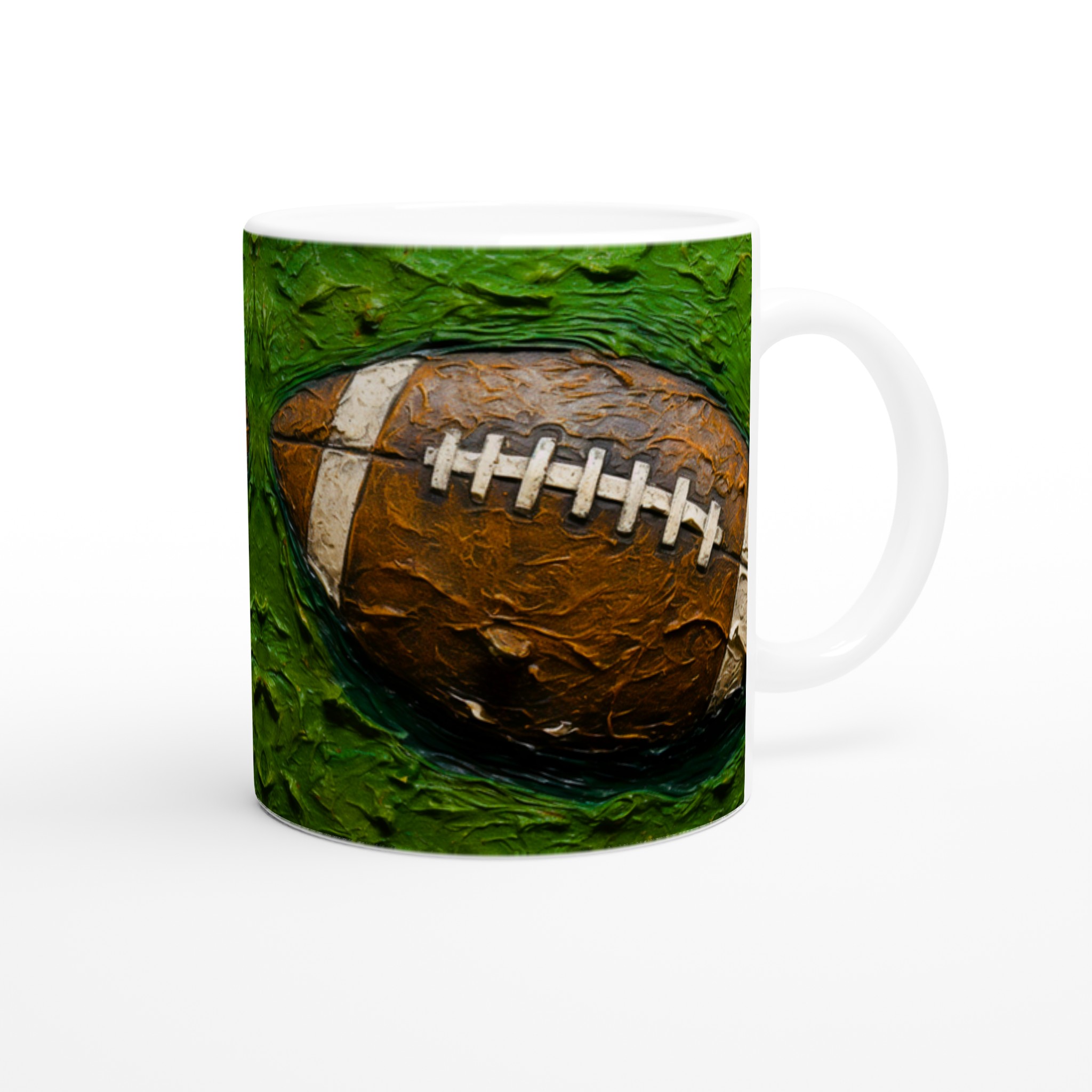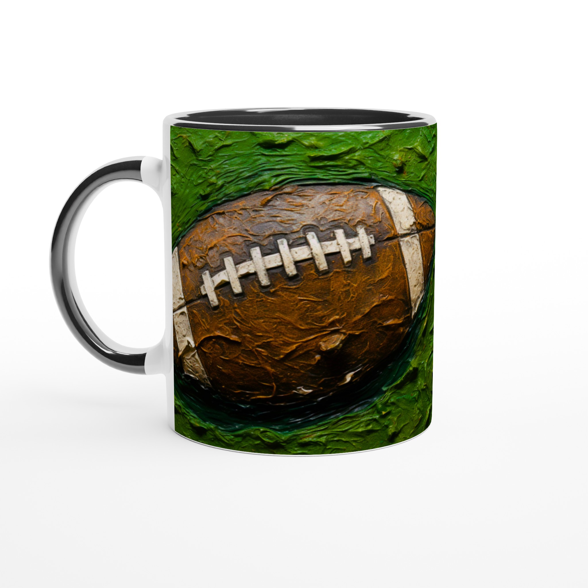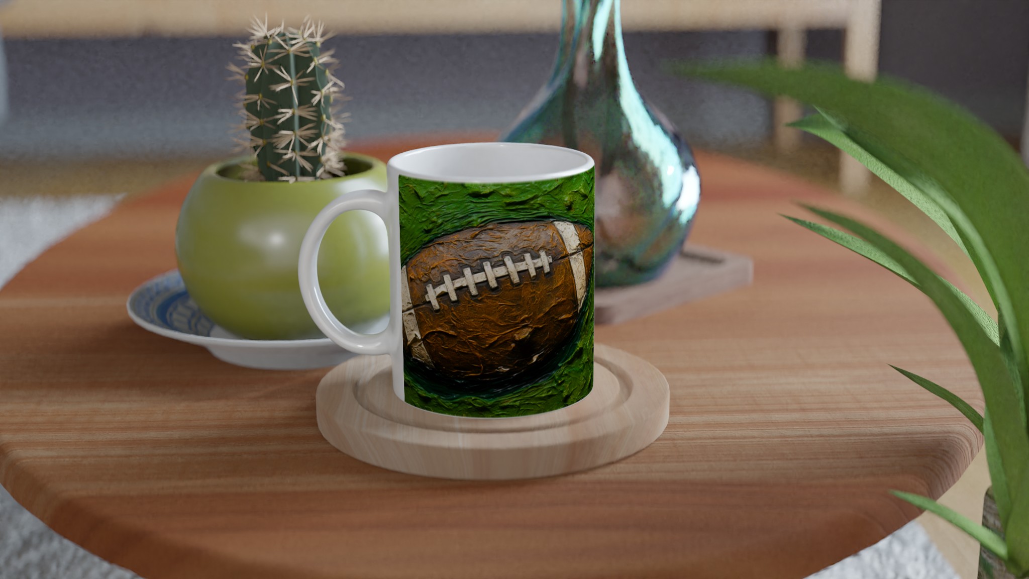 Fånga den råa energin från amerikansk fotboll med denna unika keramiska mugg. Dess design, inspirerad av en strukturerad fotboll och det dynamiska gröna spelplanen, gör varje klunk till en hyllning till sporten. Perfekt för morgonkaffet före matchen, kvällens varma choklad efter träningen eller när du bara vill njuta av en kopp te medan du hejar på ditt favoritlag. Den blanka ytan framhäver den konstnärliga, texturerade bilden med klara och levande färger, som håller sig fina även efter många turer i mikron och diskmaskinen.