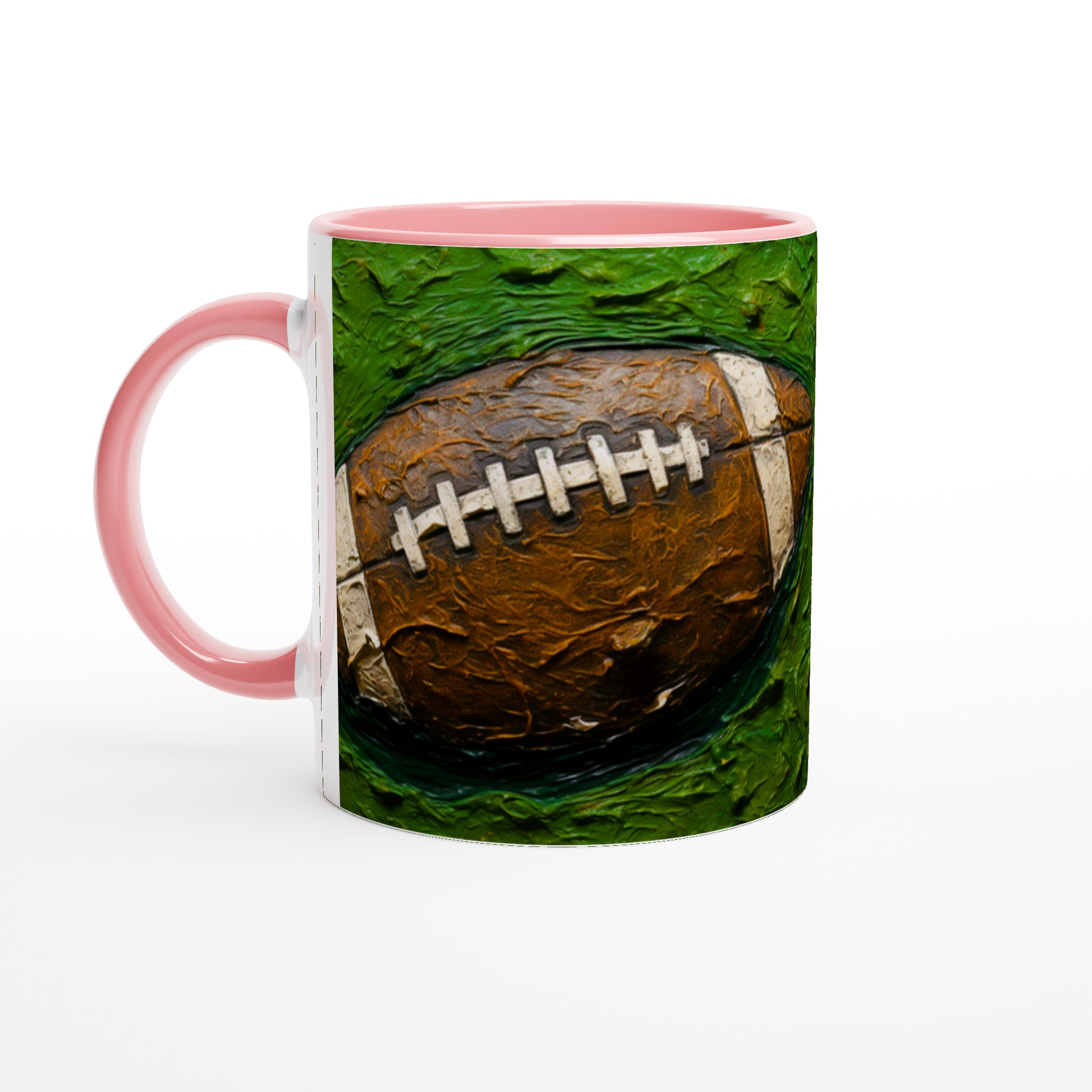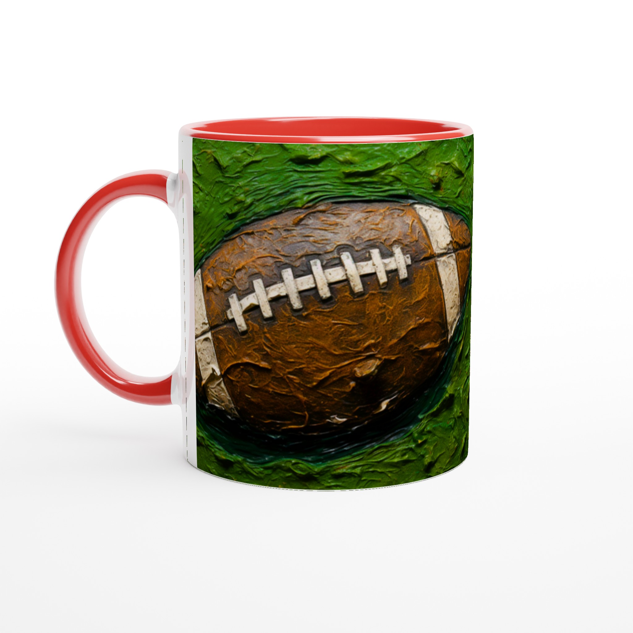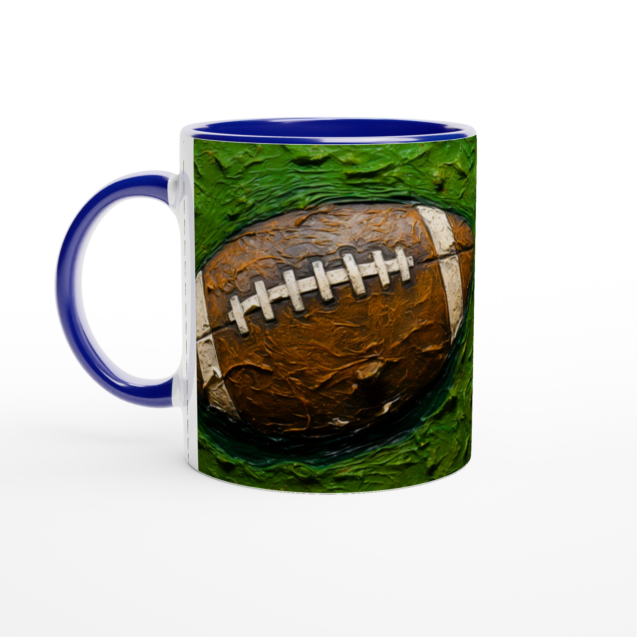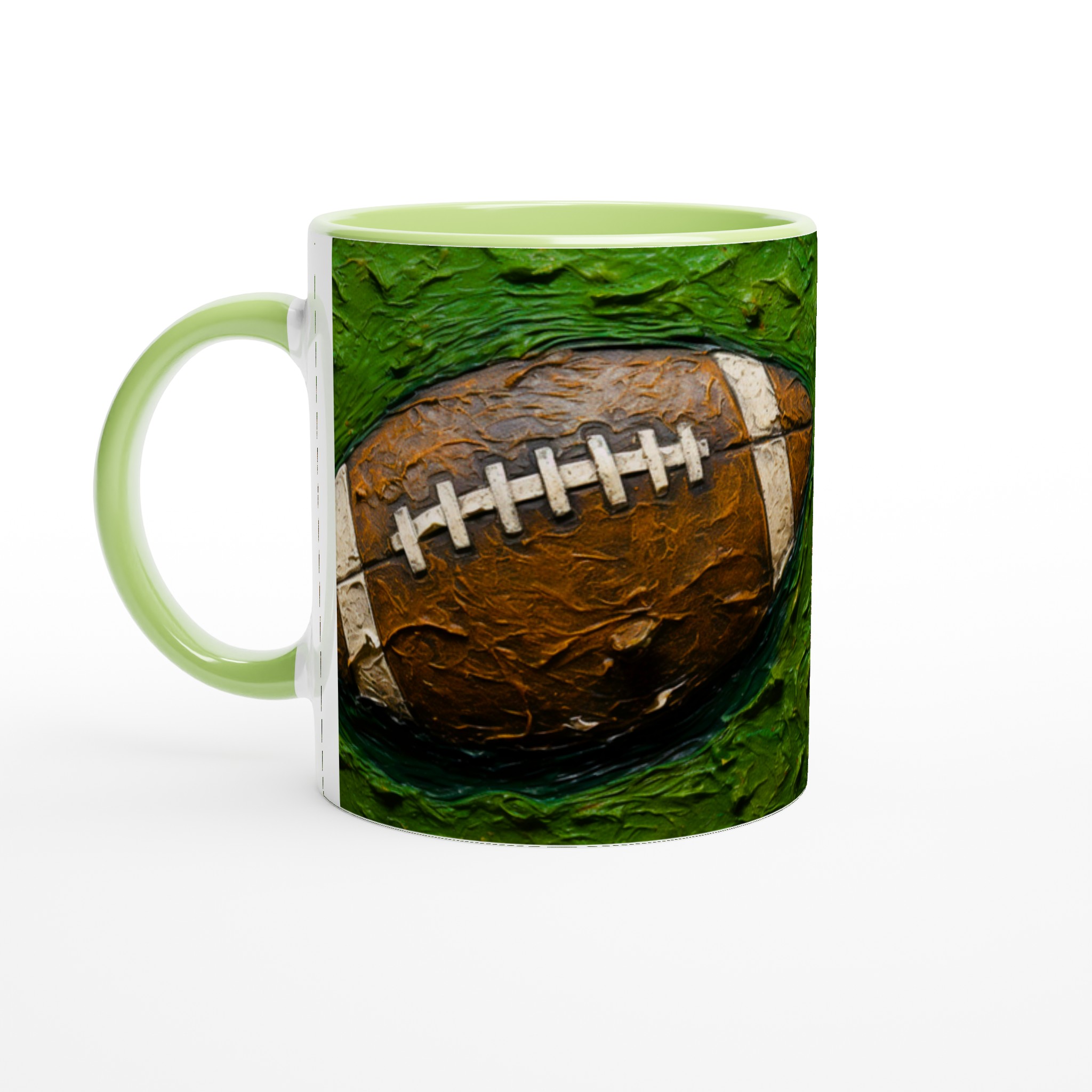 Fånga den råa energin från amerikansk fotboll med denna unika keramiska mugg. Dess design, inspirerad av en strukturerad fotboll och det dynamiska gröna spelplanen, gör varje klunk till en hyllning till sporten. Perfekt för morgonkaffet före matchen, kvällens varma choklad efter träningen eller när du bara vill njuta av en kopp te medan du hejar på ditt favoritlag. Den blanka ytan framhäver den konstnärliga, texturerade bilden med klara och levande färger, som håller sig fina även efter många turer i mikron och diskmaskinen.