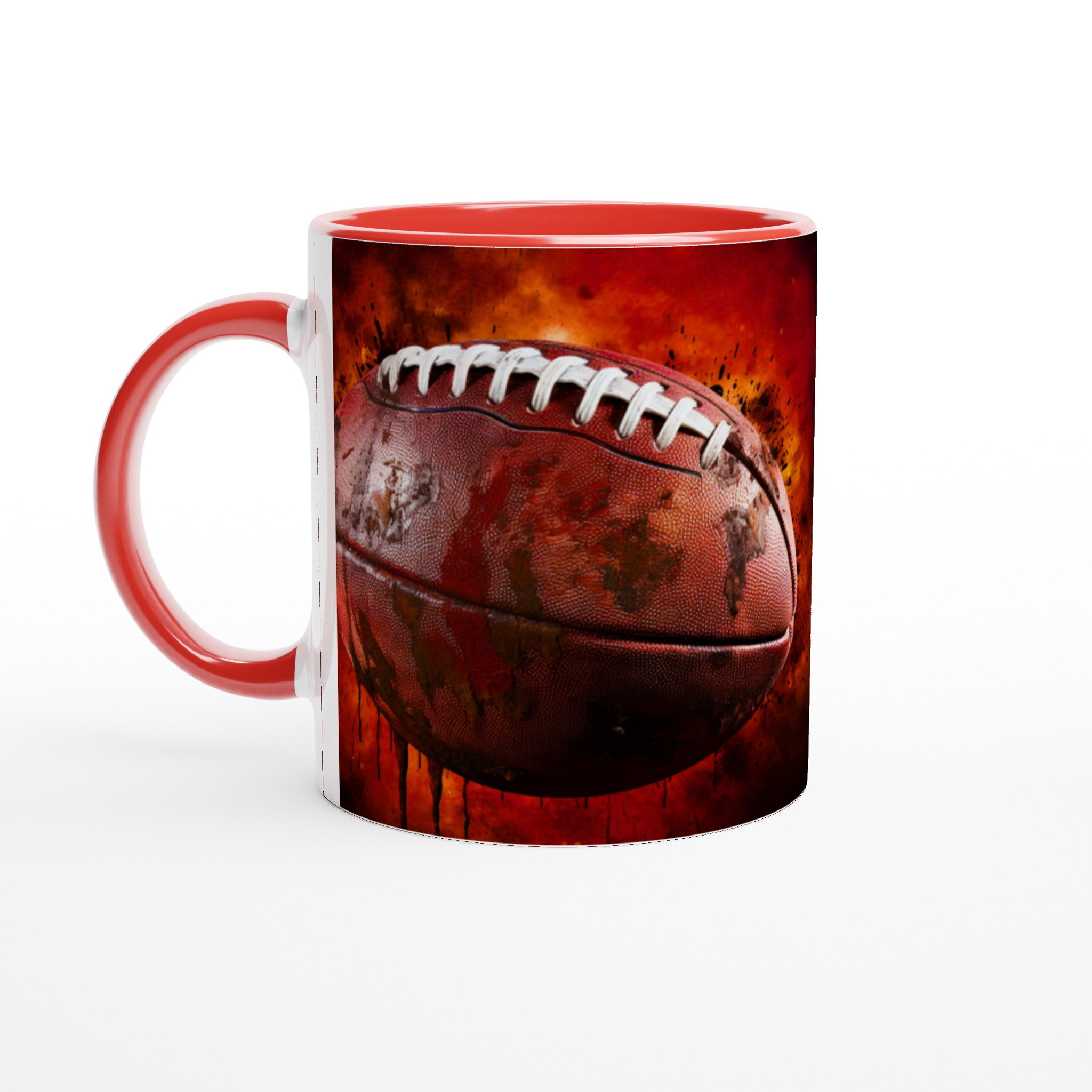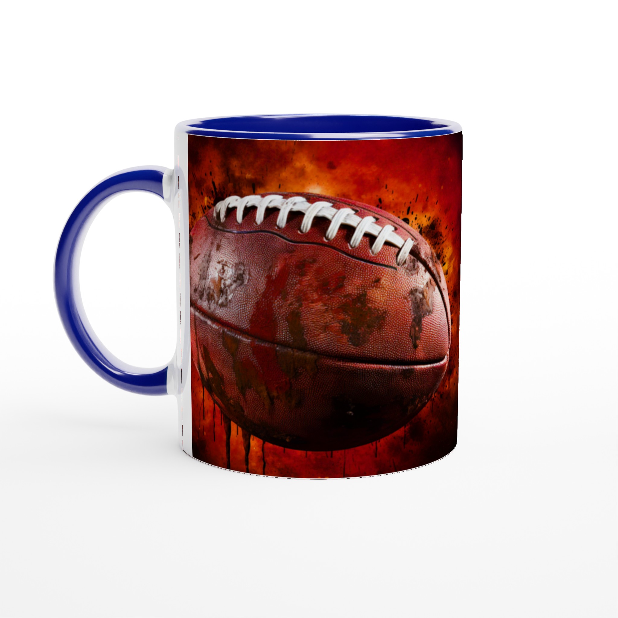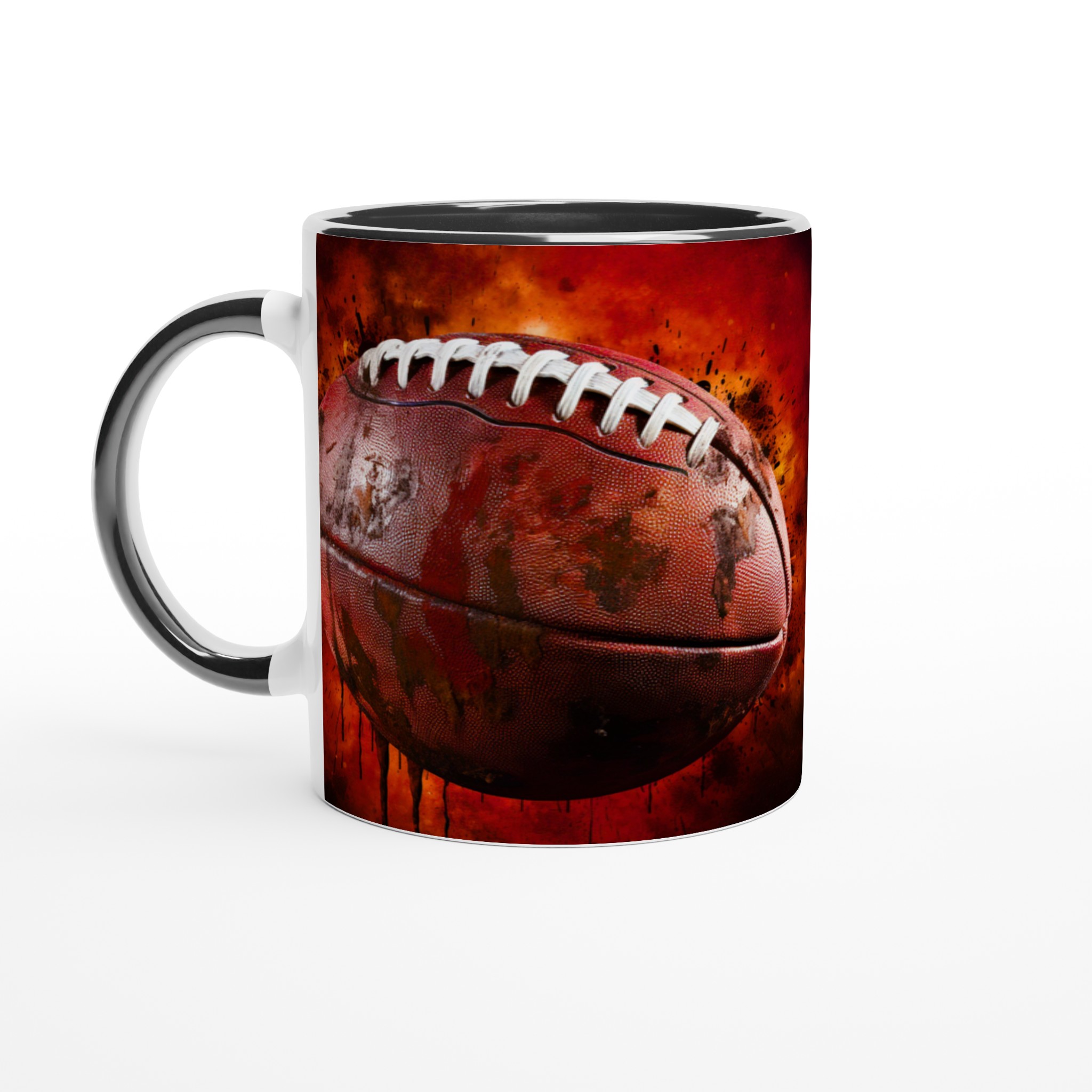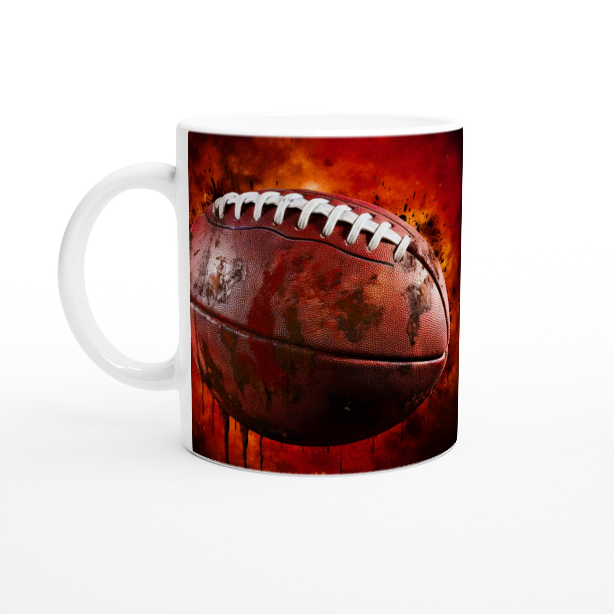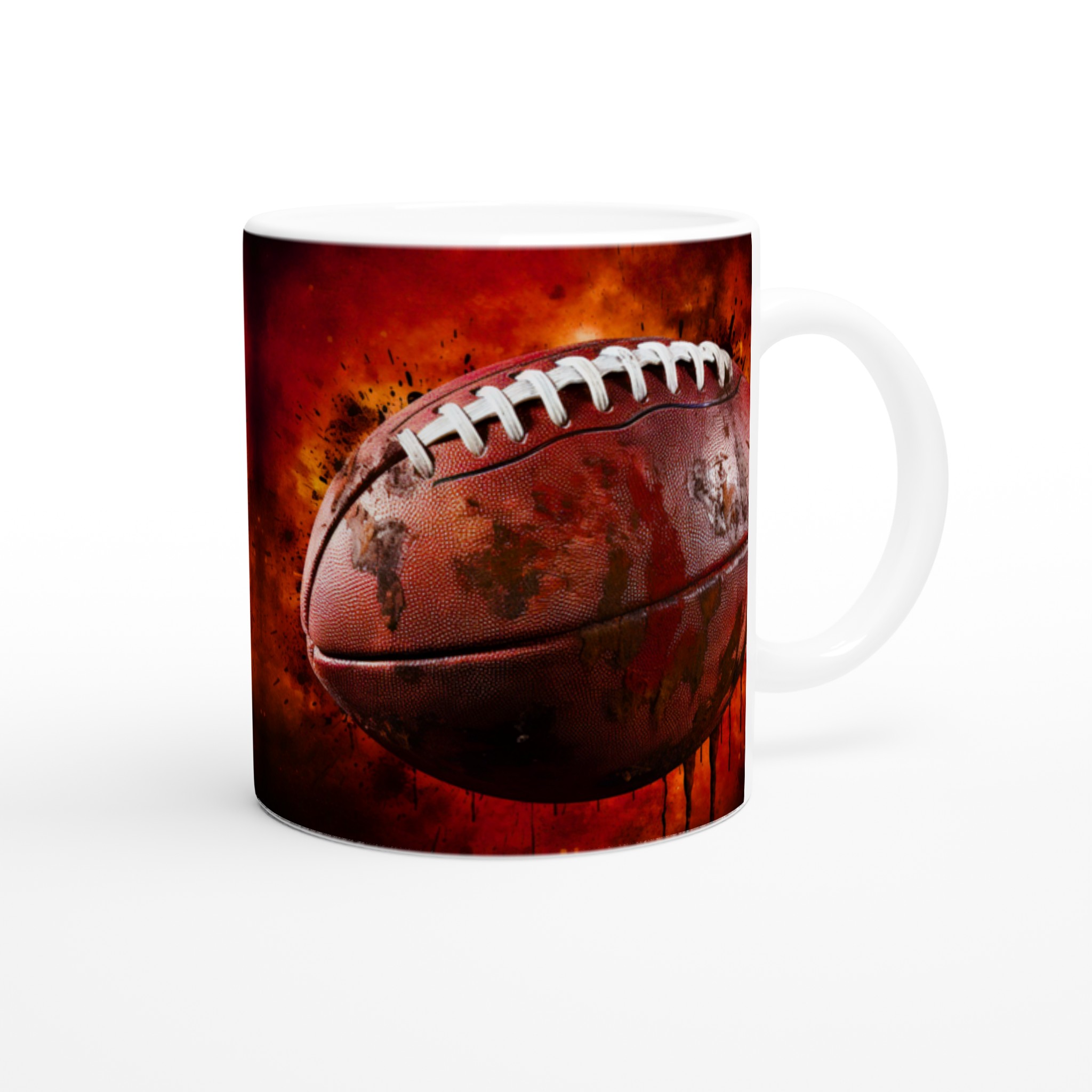 Förvandla varje fikapaus till en touchdown med vår robusta keramiska mugg, designad med ett dynamiskt amerikansk fotbollsmotiv. Den här muggen fångar sportens råa energi och passion med sin intensiva färgpalett och detaljerade design, komplett med stänk av lera och en eldliknande bakgrund som förmedlar den spännande känslan av matchdagen. Den blir snabbt en vardagsfavorit, perfekt för morgonkaffet, kvällens varma choklad eller när du bara vill njuta av en kopp te. Den blanka ytan gör att trycket framhävs med klara och levande färger, som håller sig fina även efter många turer i mikron och diskmaskinen.