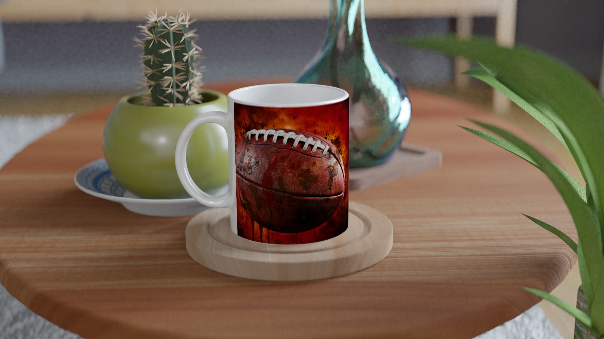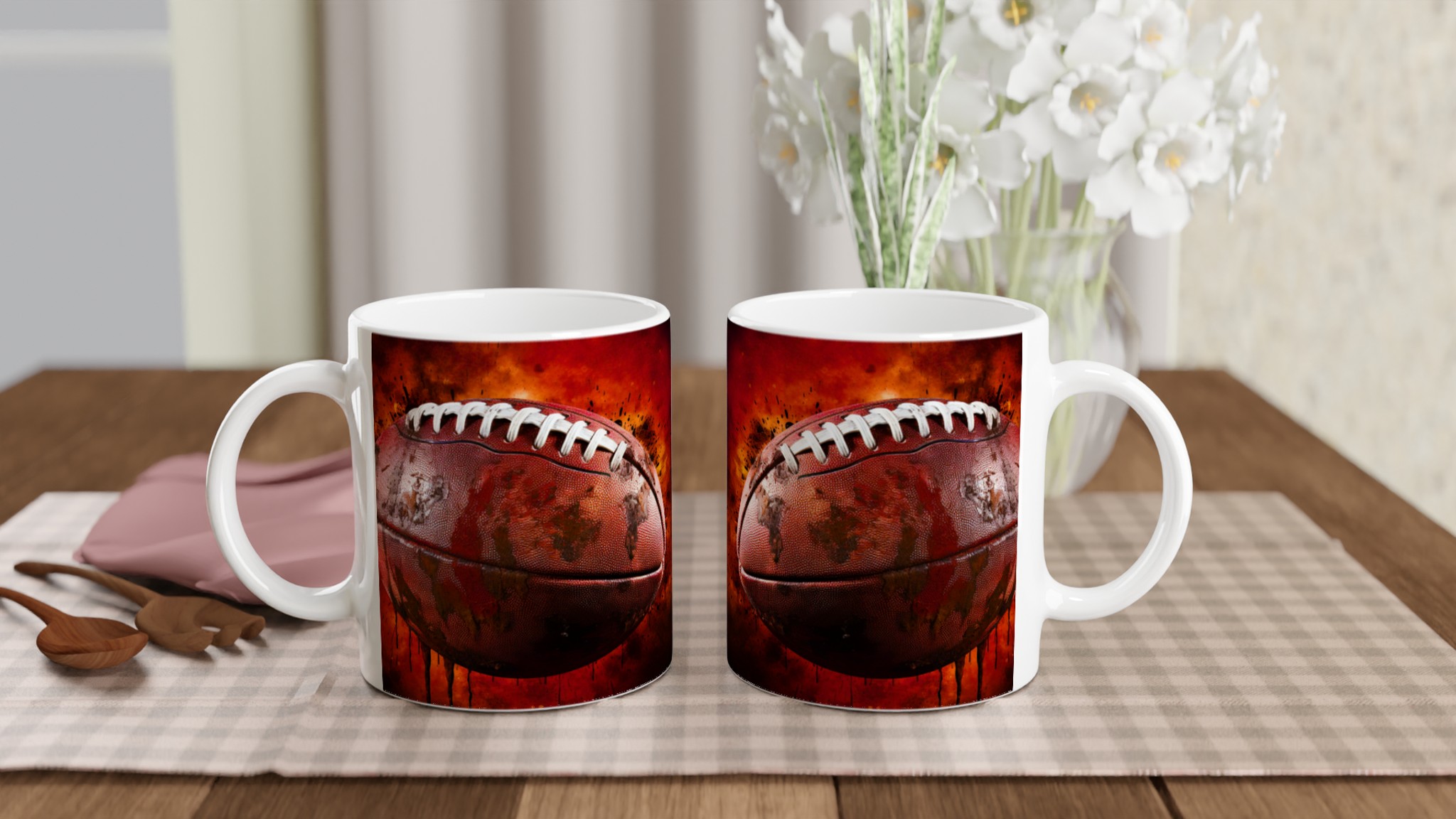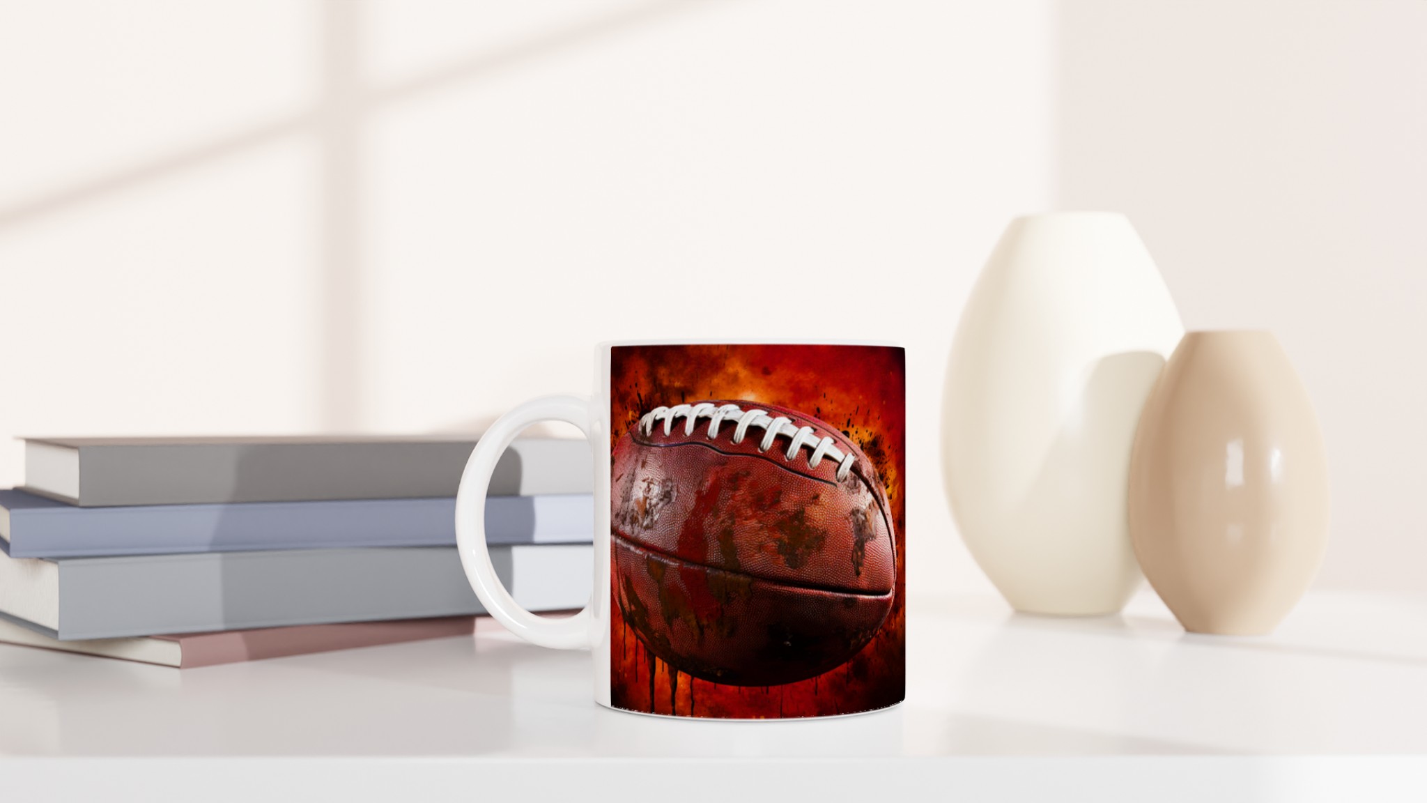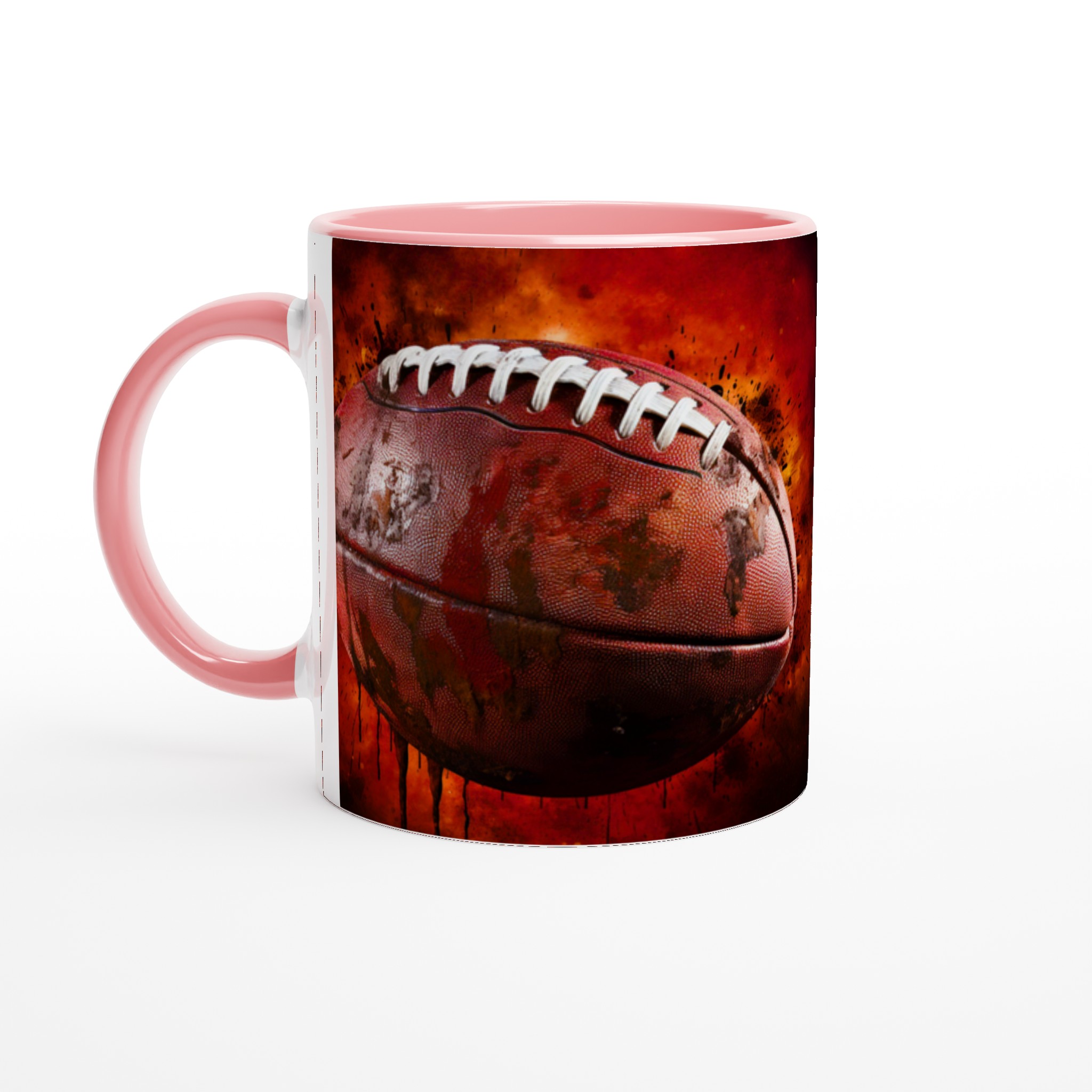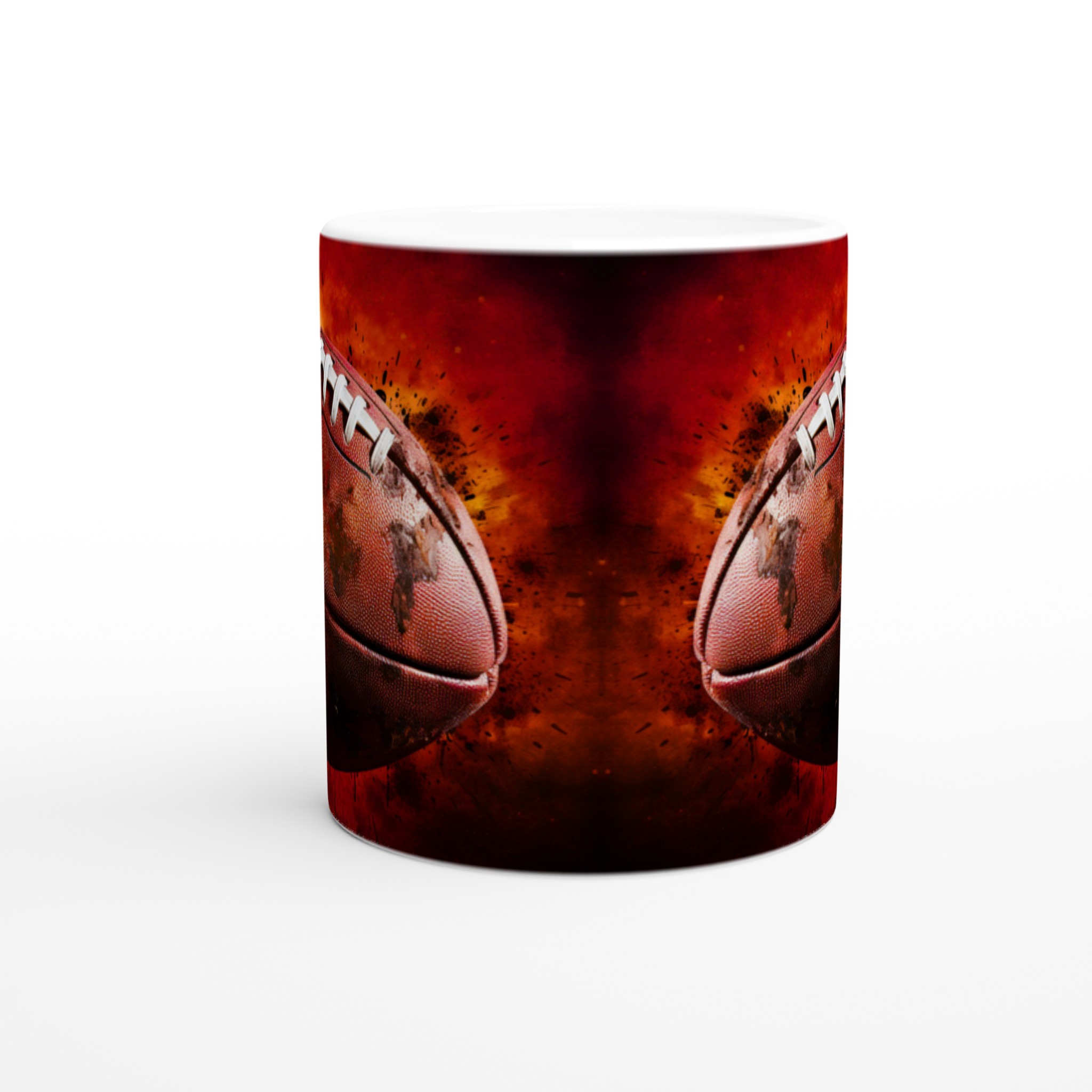 Förvandla varje fikapaus till en touchdown med vår robusta keramiska mugg, designad med ett dynamiskt amerikansk fotbollsmotiv. Den här muggen fångar sportens råa energi och passion med sin intensiva färgpalett och detaljerade design, komplett med stänk av lera och en eldliknande bakgrund som förmedlar den spännande känslan av matchdagen. Den blir snabbt en vardagsfavorit, perfekt för morgonkaffet, kvällens varma choklad eller när du bara vill njuta av en kopp te. Den blanka ytan gör att trycket framhävs med klara och levande färger, som håller sig fina även efter många turer i mikron och diskmaskinen.