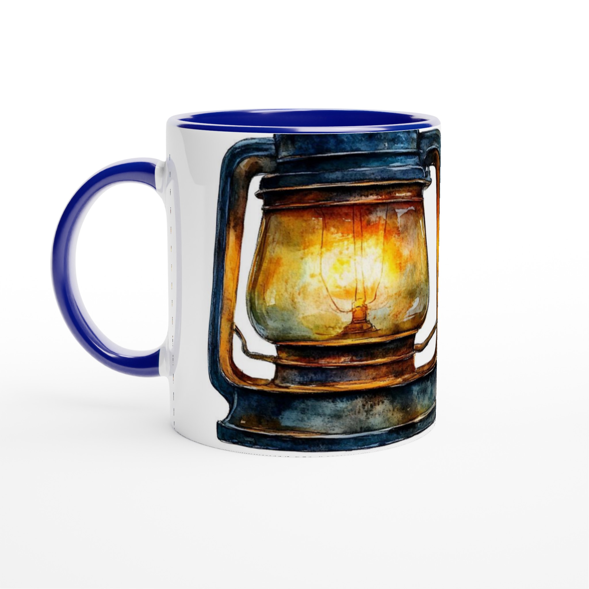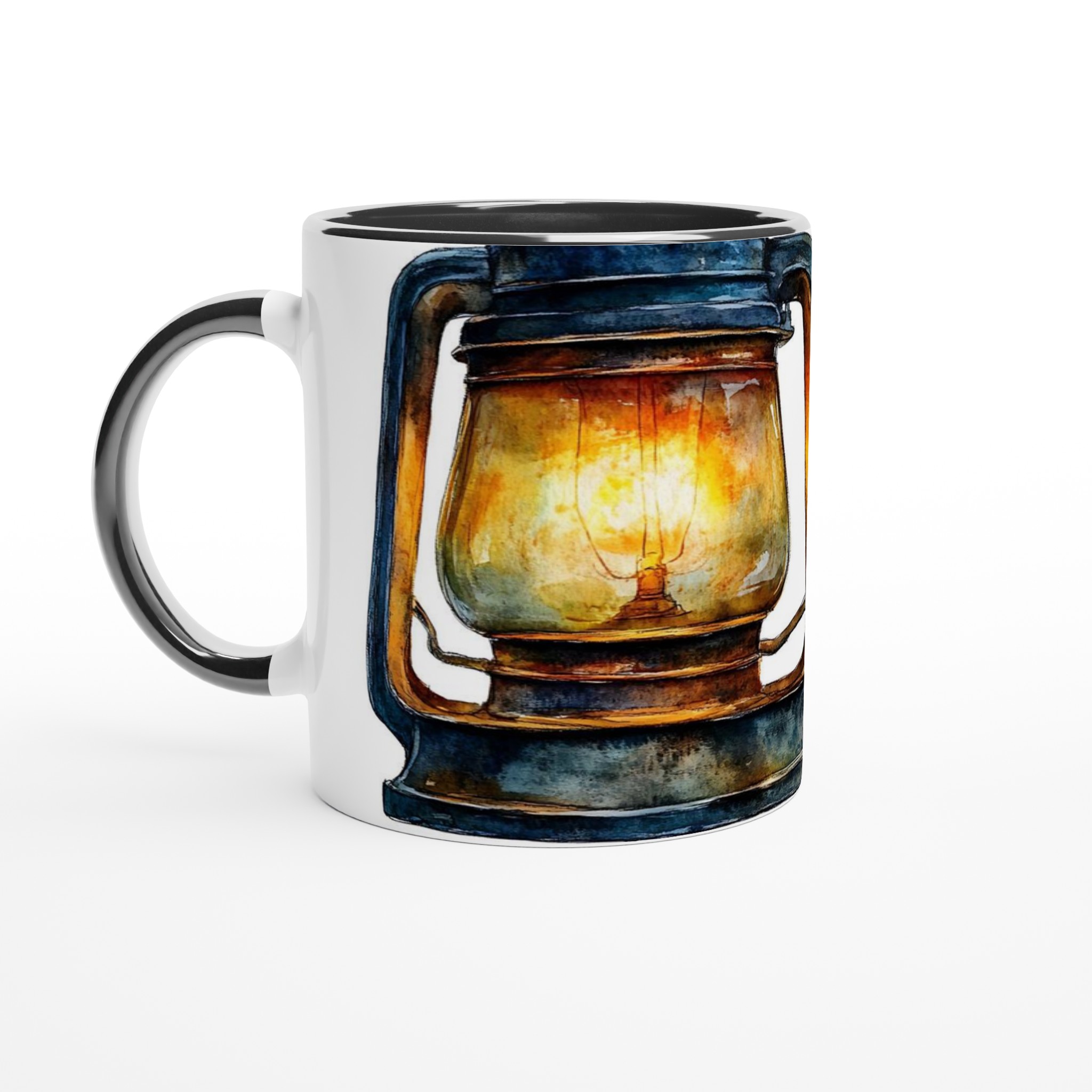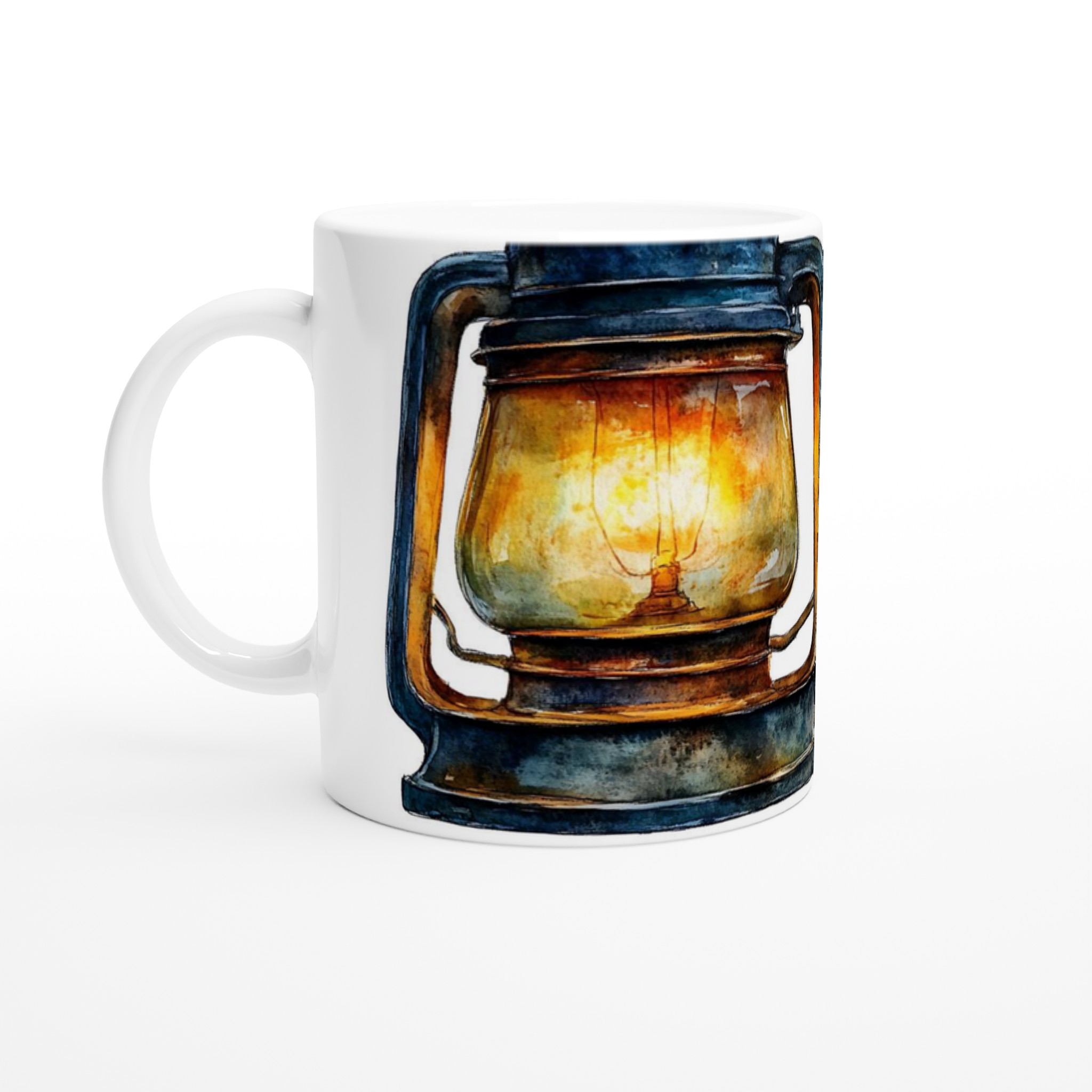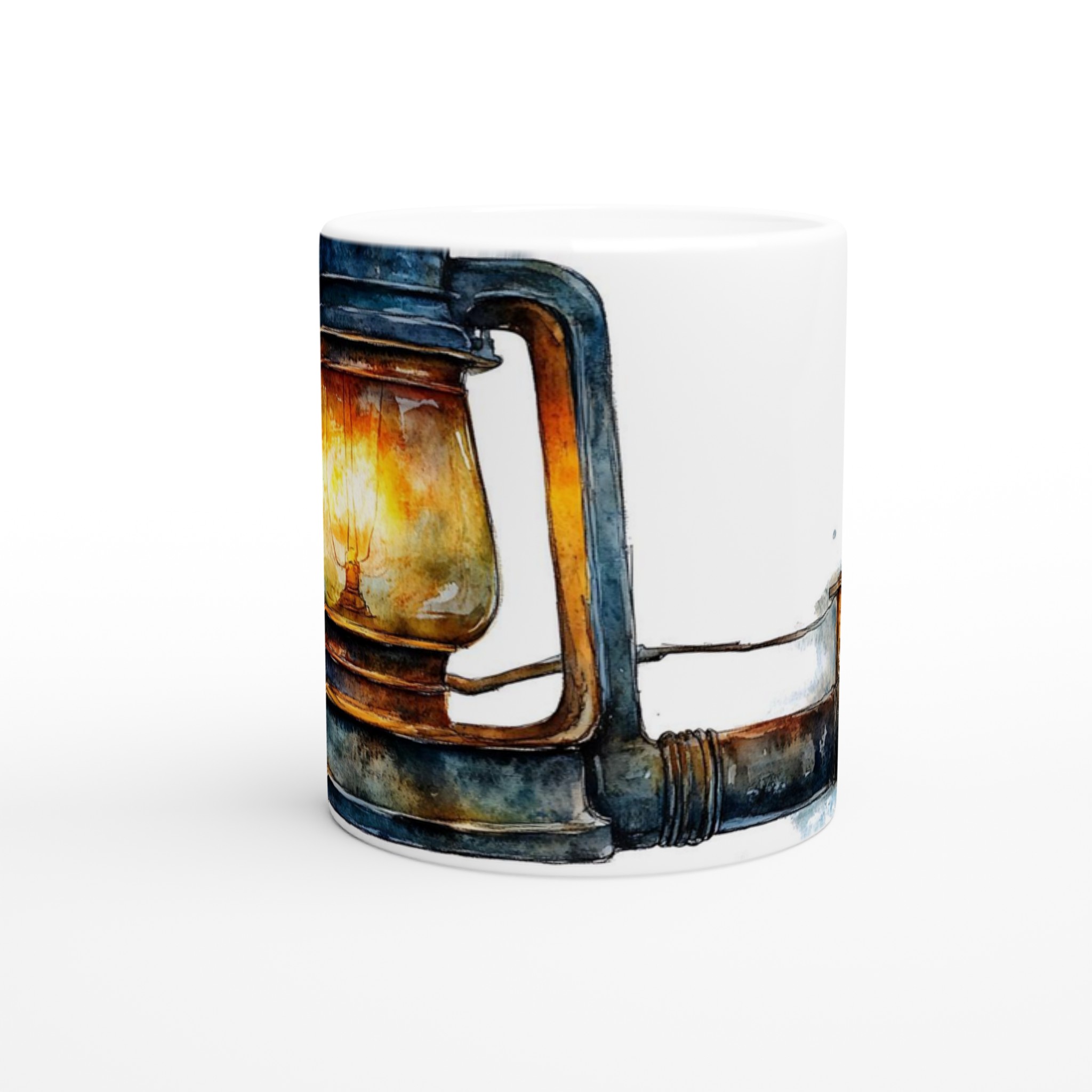 Denna unika mugg fångar den varma, inbjudande glöden från en rustik oljelampa, målad i en förtrollande akvarellstil. Med sina djupa blå och bruna toner och den lysande bärnstensfärgade flamman skapar den en känsla av lugn och äventyr. Den blanka vita ytan ger ett skarpt och levande tryck som verkligen sticker ut, oavsett om det är en personlig design, ett roligt citat eller en present till någon du tycker om.
