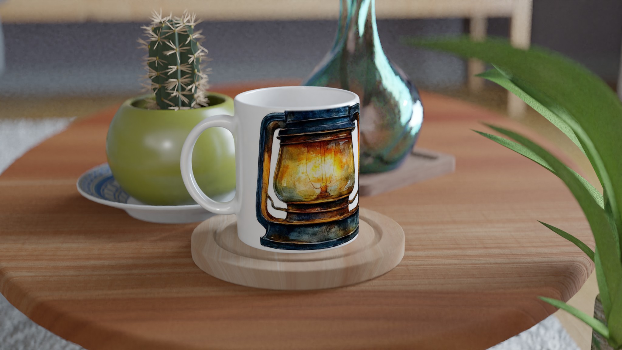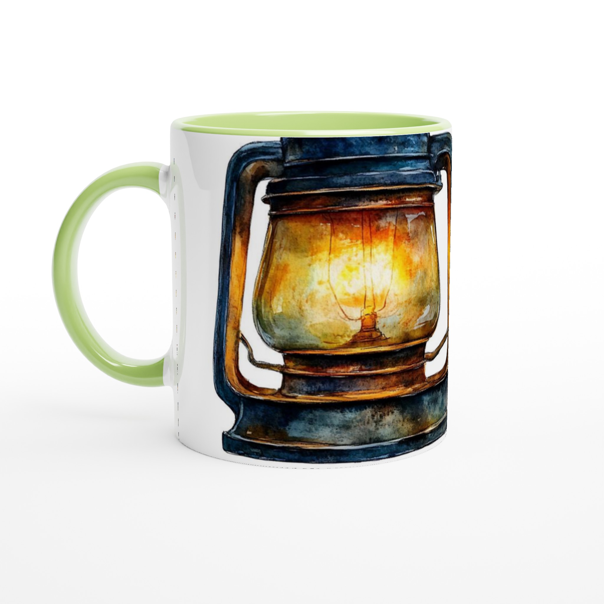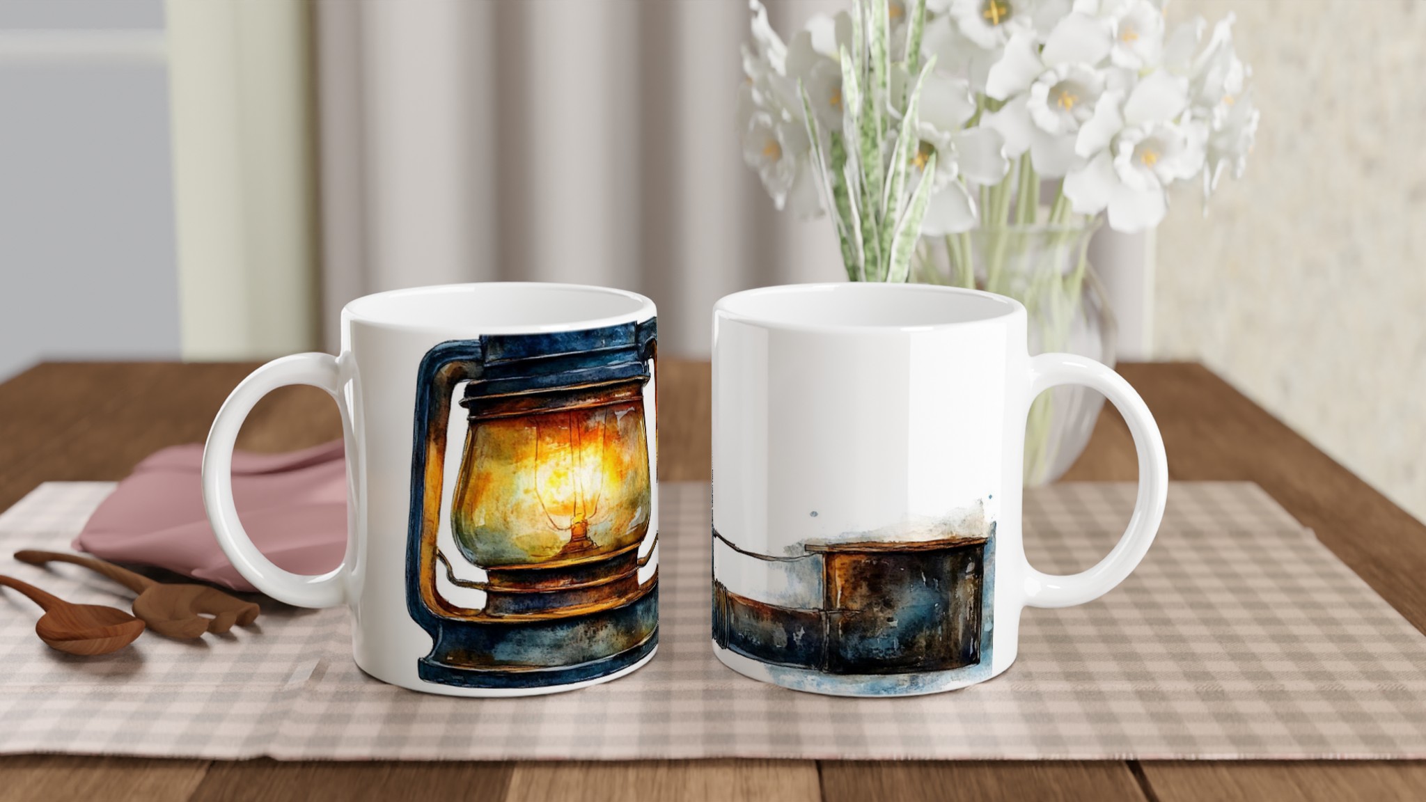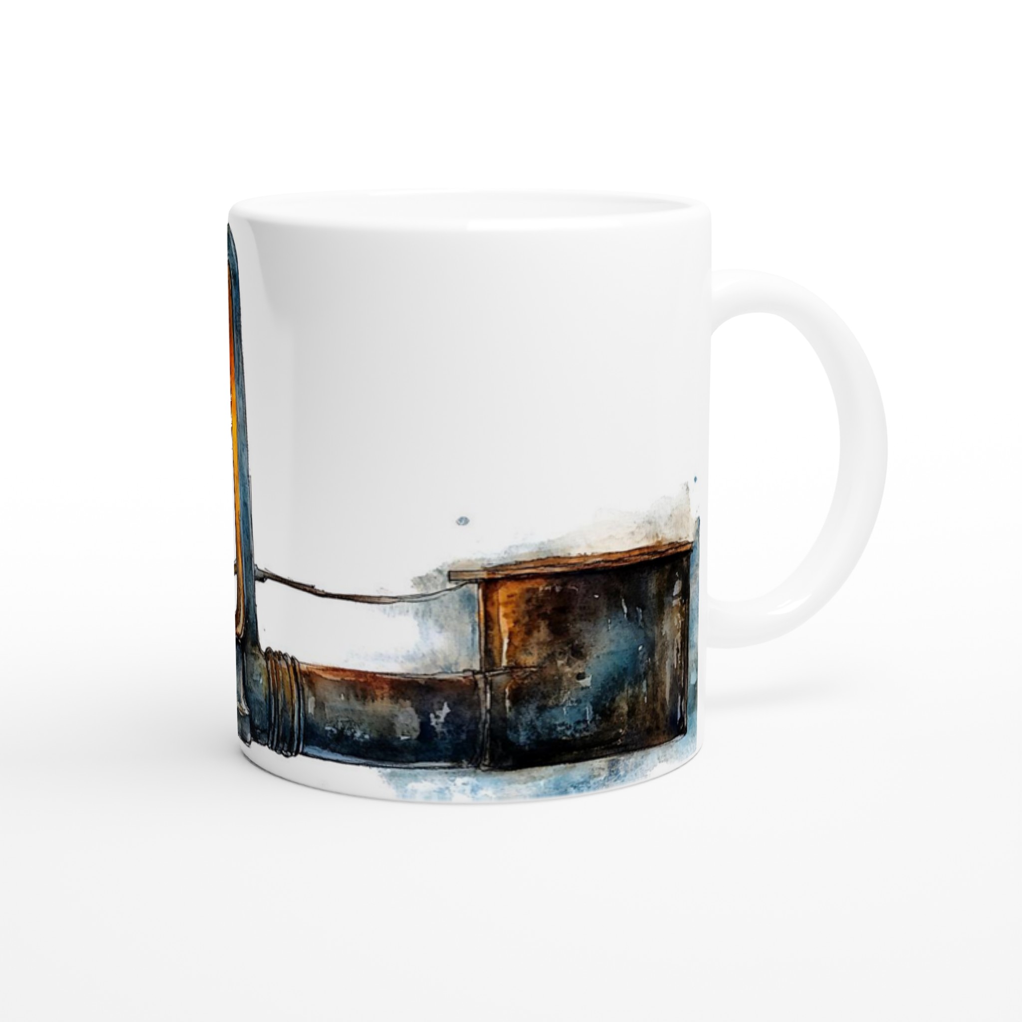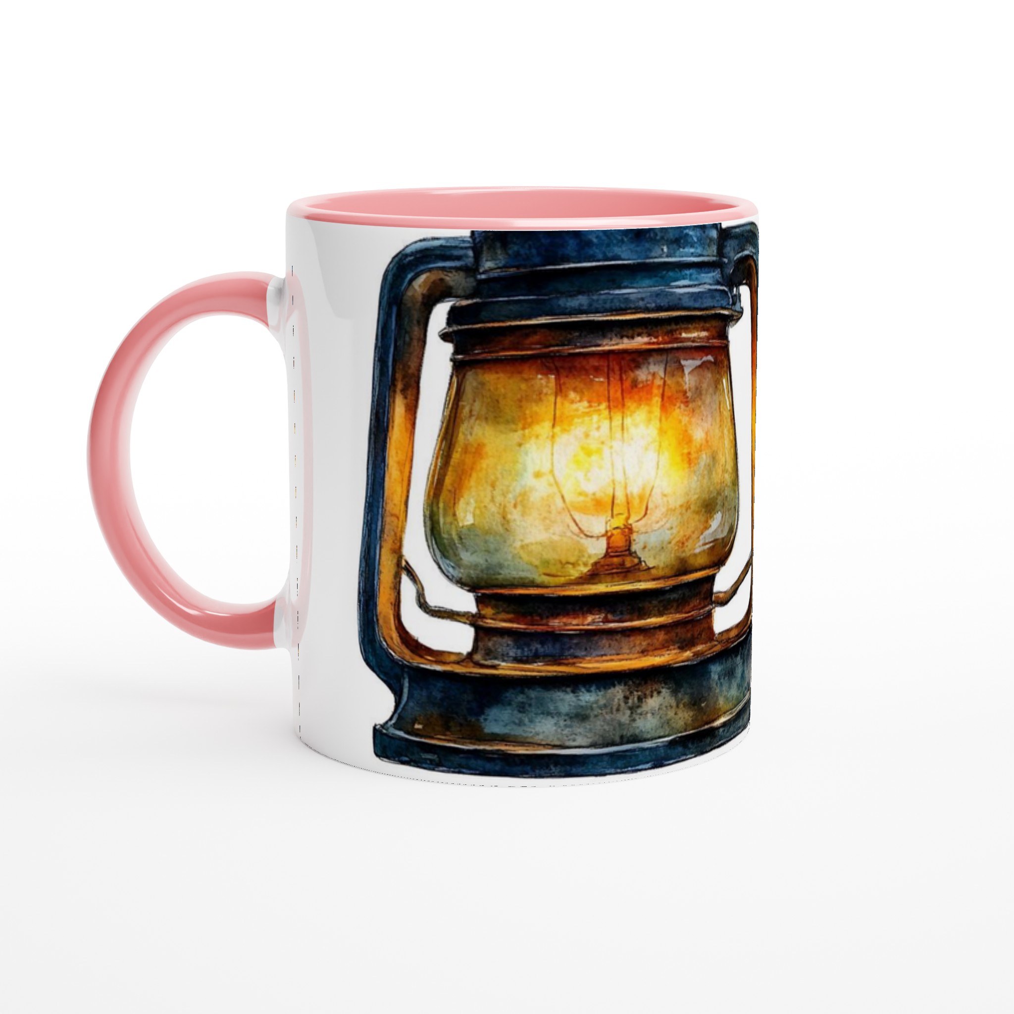 Denna unika mugg fångar den varma, inbjudande glöden från en rustik oljelampa, målad i en förtrollande akvarellstil. Med sina djupa blå och bruna toner och den lysande bärnstensfärgade flamman skapar den en känsla av lugn och äventyr. Den blanka vita ytan ger ett skarpt och levande tryck som verkligen sticker ut, oavsett om det är en personlig design, ett roligt citat eller en present till någon du tycker om.