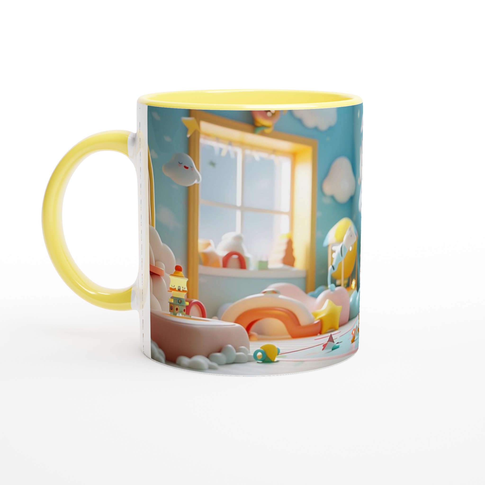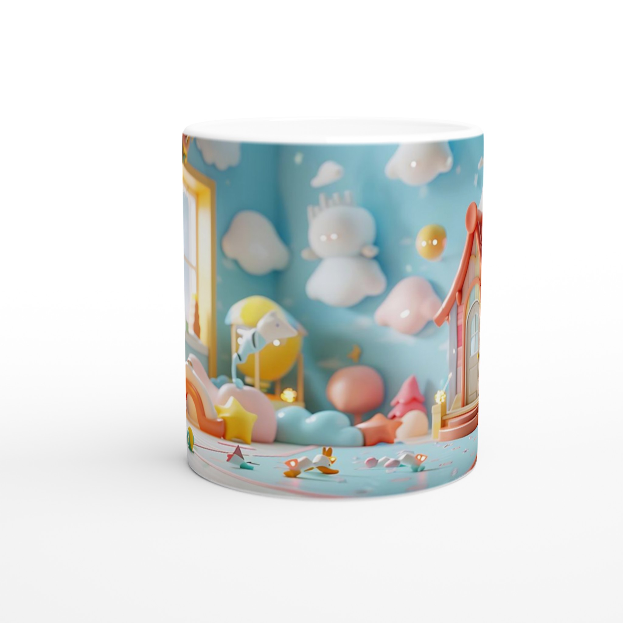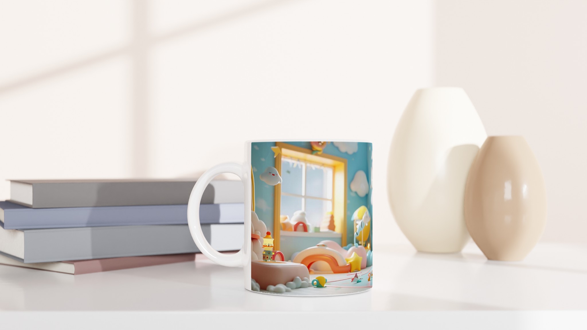 Kliv in i en värld av fantasi med denna underbara keramiska mugg, inspirerad av en lekfull och sagolik barnkammare fylld med moln, regnbågar och mjuka pasteller. Den här muggen blir snabbt en vardagsfavorit och skapar en känsla av lugn och glädje, perfekt för morgonkaffet, kvällens varma choklad eller när du bara vill njuta av en kopp te. Den blanka ytan framhäver trycken med klara och levande färger, som håller sig fina även efter många turer i mikron och diskmaskinen, vilket gör den idealisk för både vuxna och små drömmare.
