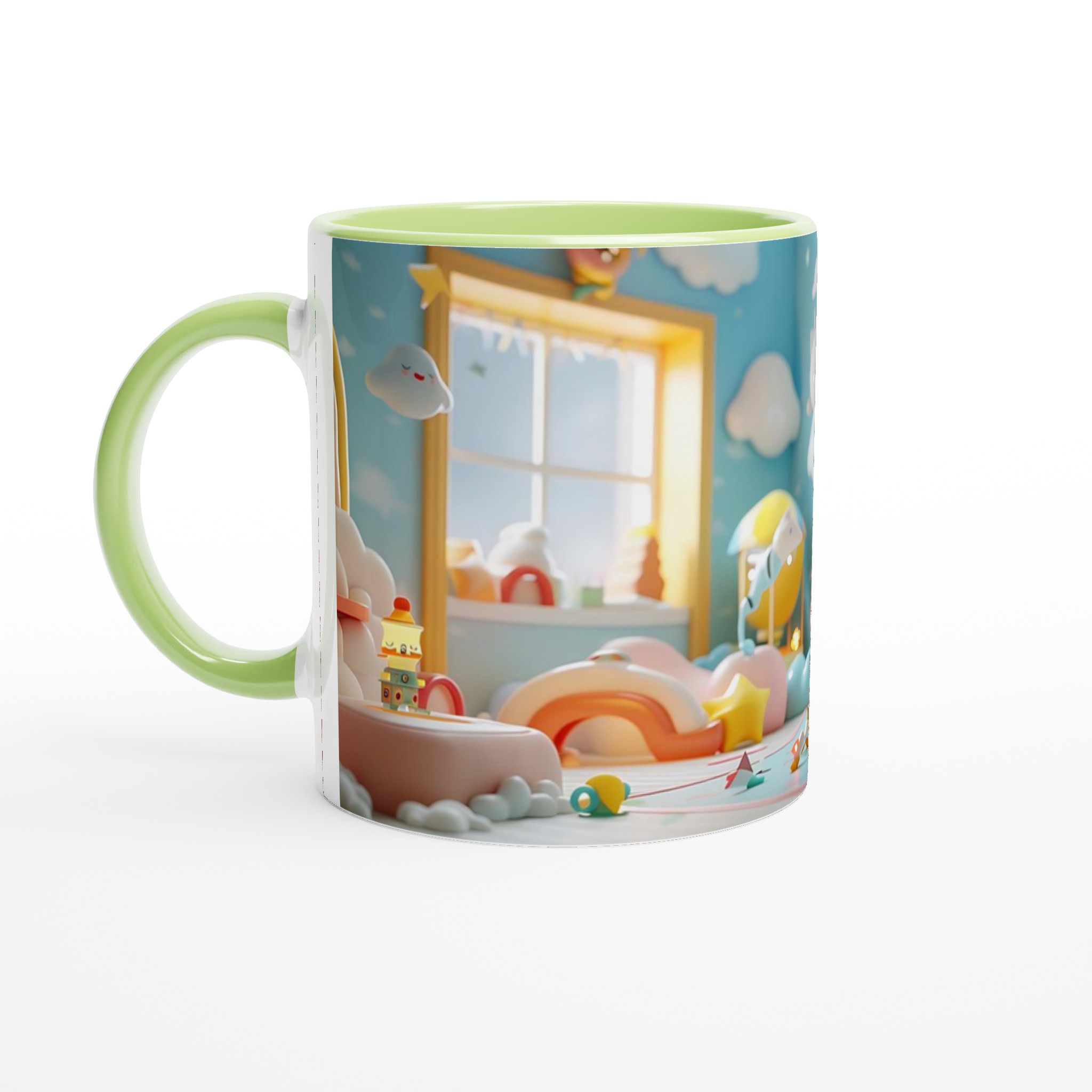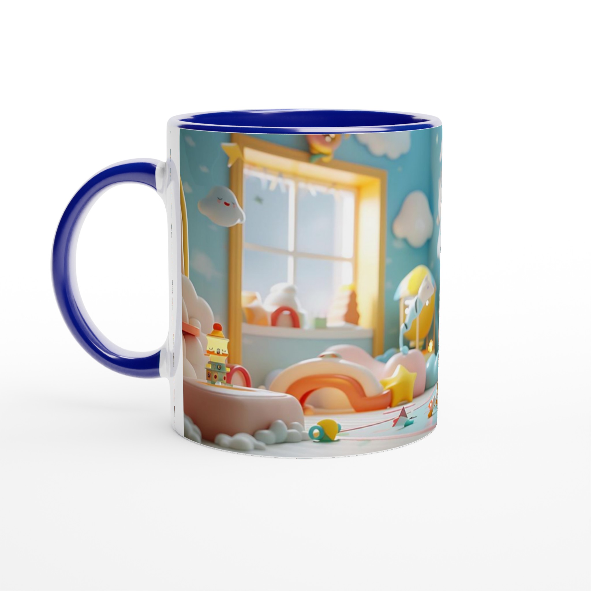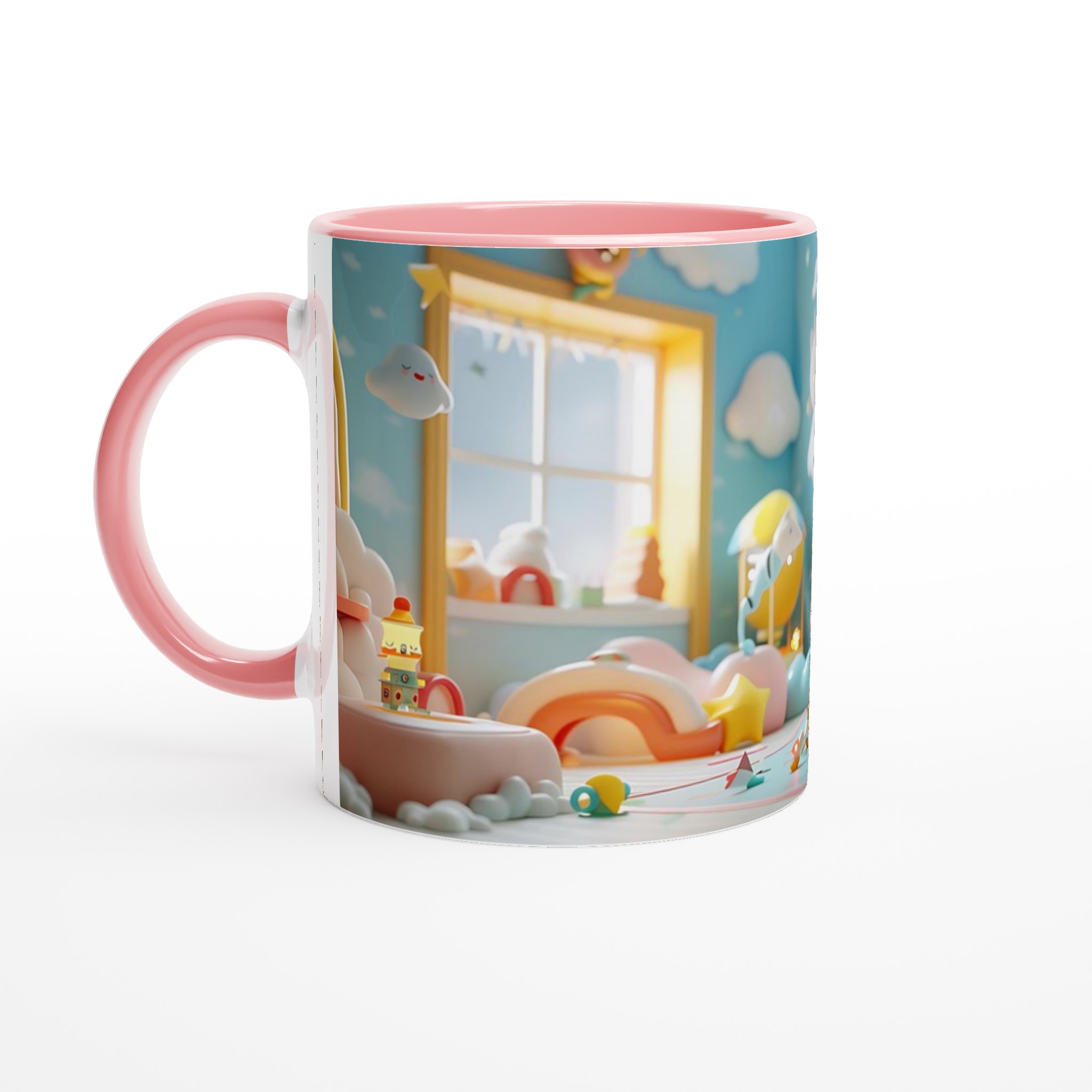 Kliv in i en värld av fantasi med denna underbara keramiska mugg, inspirerad av en lekfull och sagolik barnkammare fylld med moln, regnbågar och mjuka pasteller. Den här muggen blir snabbt en vardagsfavorit och skapar en känsla av lugn och glädje, perfekt för morgonkaffet, kvällens varma choklad eller när du bara vill njuta av en kopp te. Den blanka ytan framhäver trycken med klara och levande färger, som håller sig fina även efter många turer i mikron och diskmaskinen, vilket gör den idealisk för både vuxna och små drömmare.