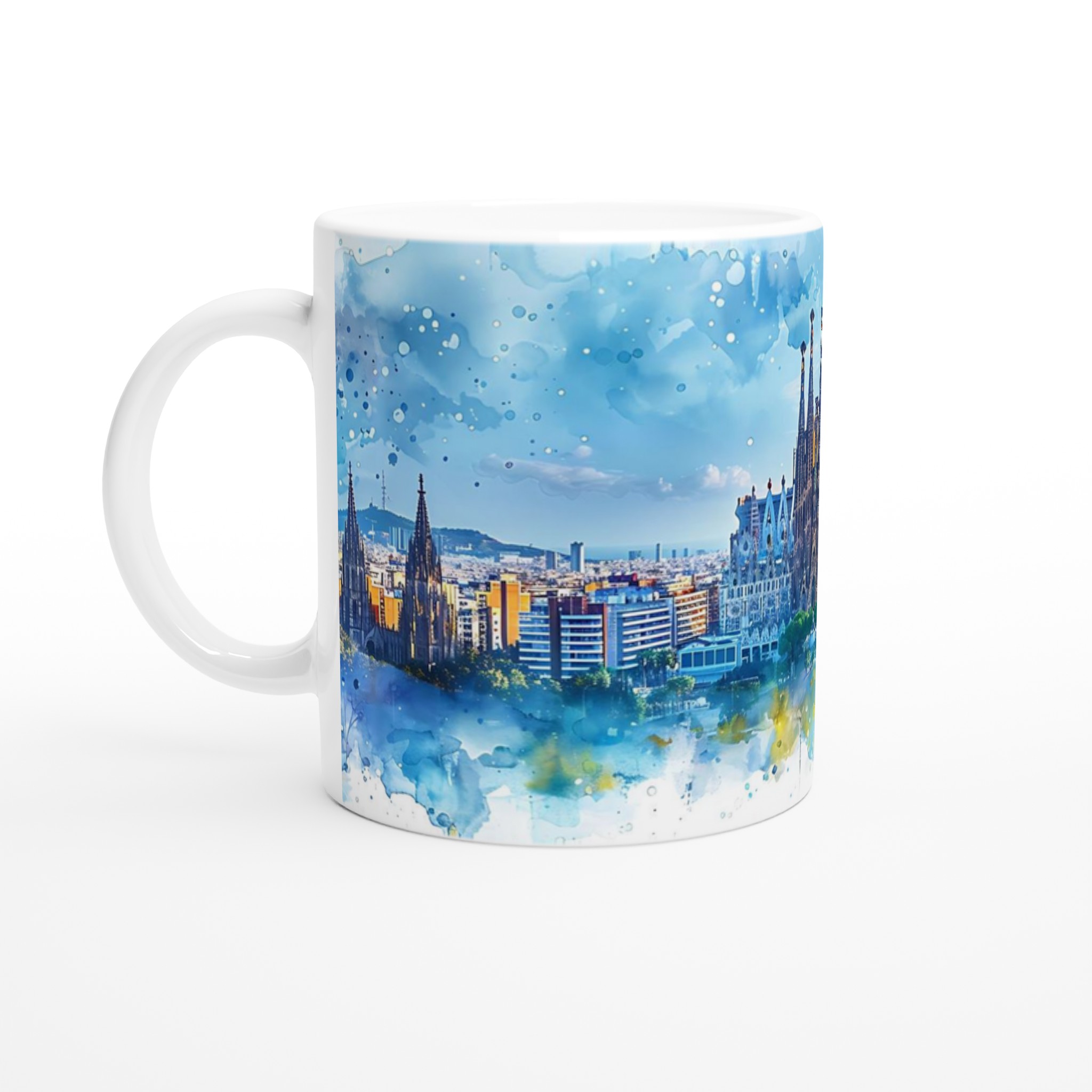 Inspirerad av den majestätiska Sagrada Familia mot en hisnande solnedgångshimmel, fångar denna akvarelldesign den magiska atmosfären av Barcelona i en levande, konstnärlig stil. Varje sipp blir en resa till de färgsprakande taken och den ikoniska arkitekturen, oavsett om det är en personlig design, ett roligt citat eller en present till någon du tycker om.