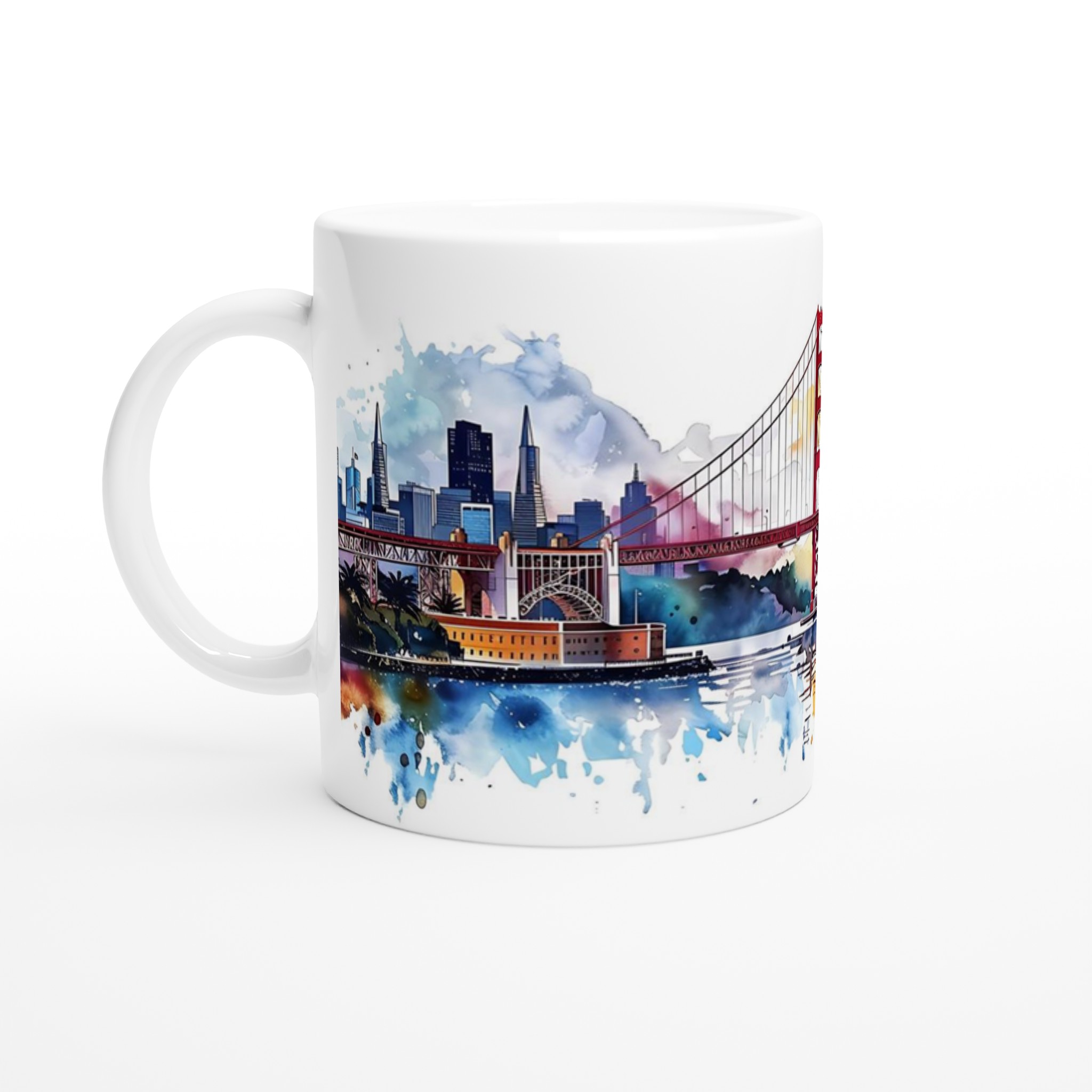 Denna mugg är en hyllning till San Franciscos ikoniska landmärken, med Golden Gate Bridge och stadssiluetten vackert återgivna i en dynamisk akvarellstil. De livfulla färgerna och de konstnärliga stänken skapar en känsla av rörelse och energi, perfekt för dig som älskar stadens unika charm och konstnärliga uttryck.