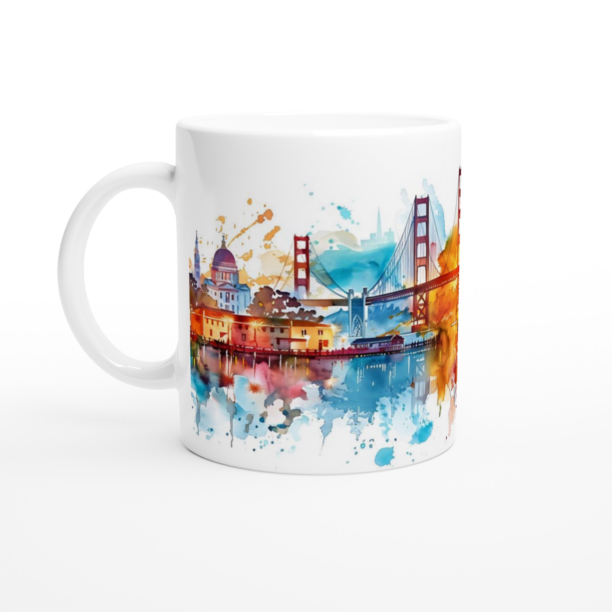 Lyft varje kaffestund med vår premium keramikmugg – stilren, hållbar och skapad för att låta ditt motiv glänsa. Denna mugg fångar San Franciscos ikoniska skyline i en levande akvarellstil, med Golden Gate-bron som badar i varma solnedgångstoner och stadens siluett reflekterad i svala blått. En perfekt start på dagen för alla som älskar den magiska staden vid bukten.