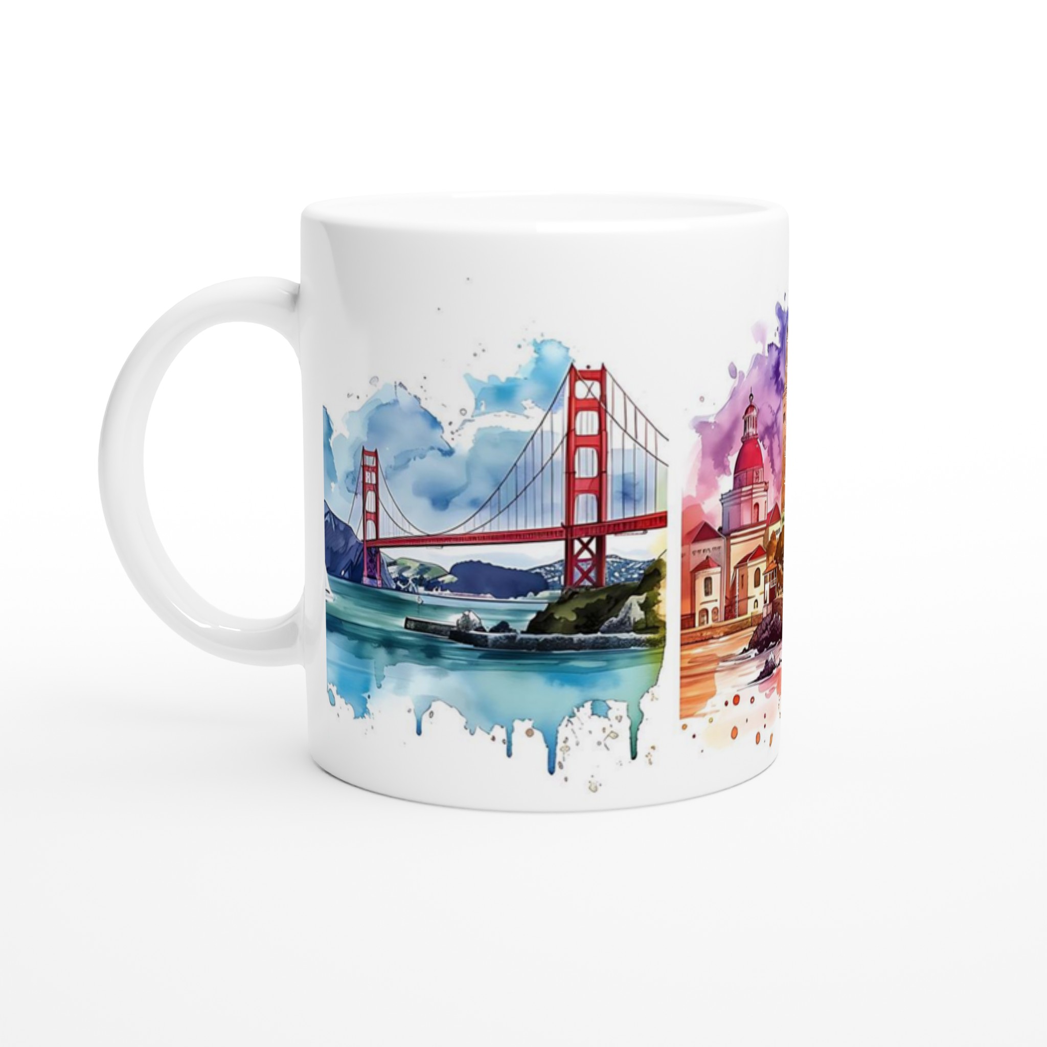 Denna exklusiva keramikmugg förvandlar din dryckesupplevelse till en konstnärlig resa genom San Franciscos ikoniska landmärken. Med ett färgstarkt akvarellmotiv av Golden Gate-bron, charmiga stadsbilder och de berömda ”Painted Ladies” fångas stadens unika atmosfär. Den blanka ytan ger ett skarpt och levande tryck som verkligen sticker ut, oavsett om det är en personlig design, ett roligt citat eller en present till någon du tycker om.