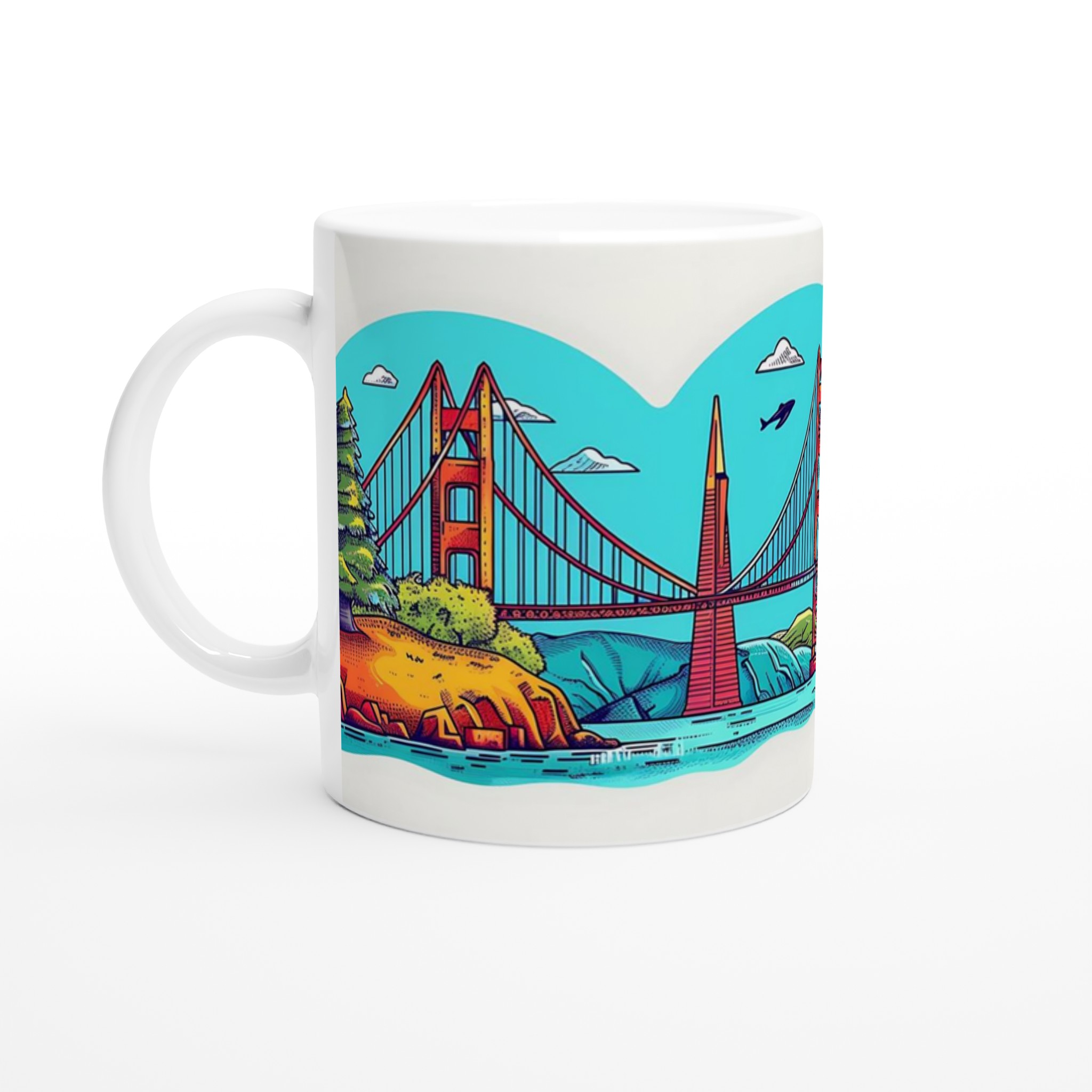 Inspirerad av den ikoniska Golden Gate-bron, fångar denna mugg den livfulla charmen i San Francisco med sin unika, tecknade stil. Den blanka vita ytan ger ett skarpt och levande tryck som verkligen sticker ut, oavsett om det är en personlig design, ett roligt citat eller en present till någon du tycker om.