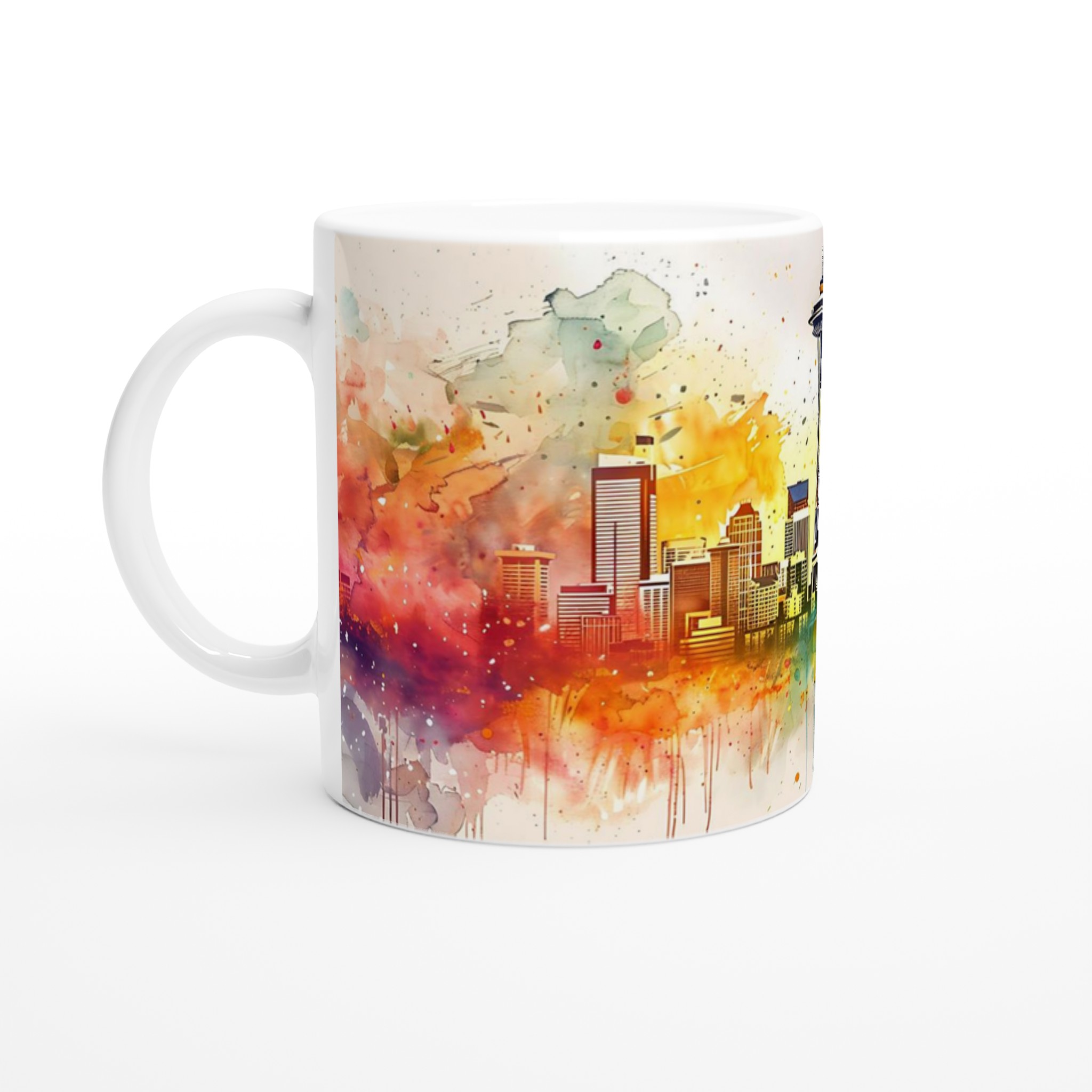 Förvandla din dryckesrutin till en konstupplevelse. Välj din favoritfärg och beställ din unika Seattle Cityscape Watercolor mugg idag!