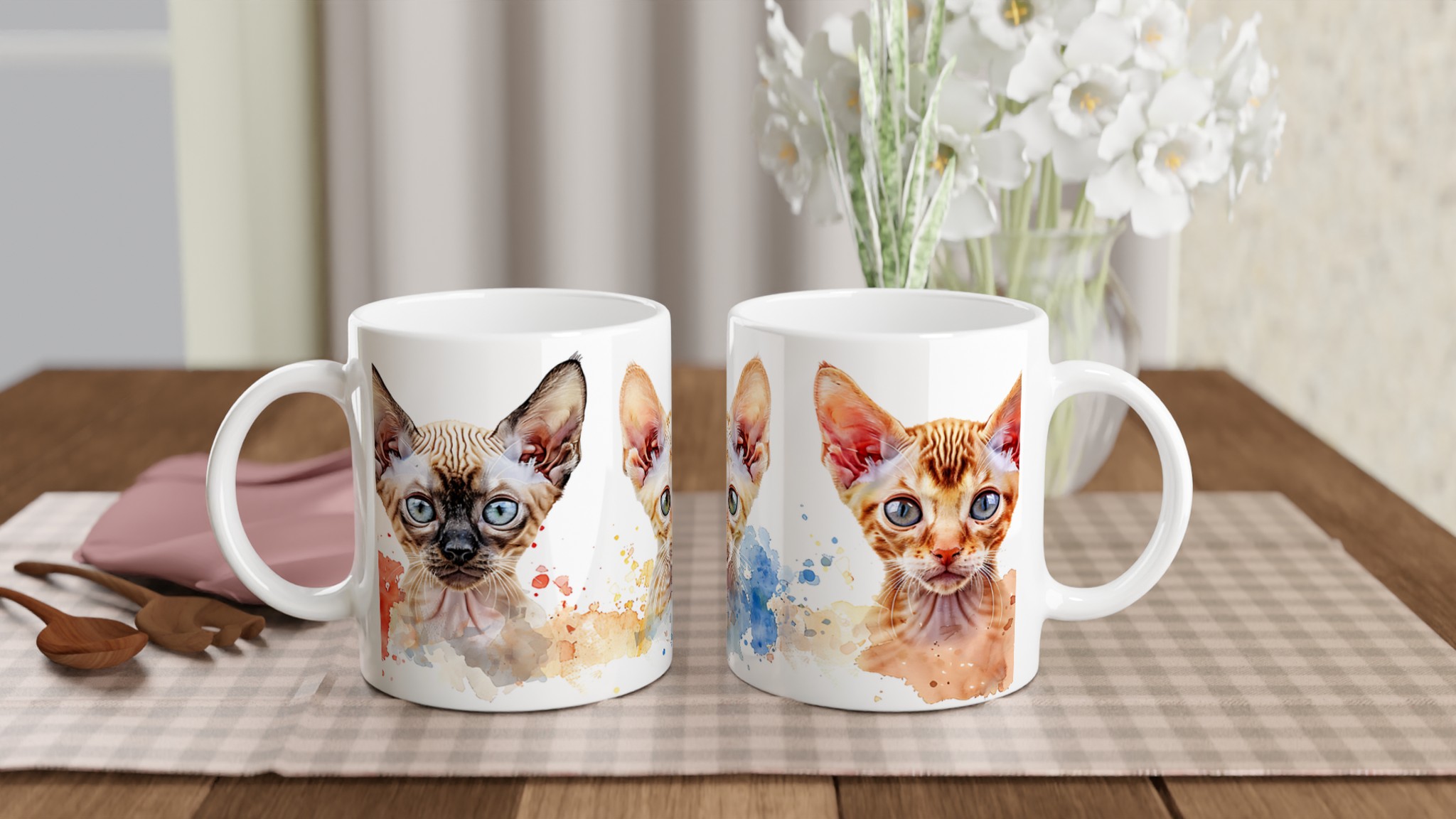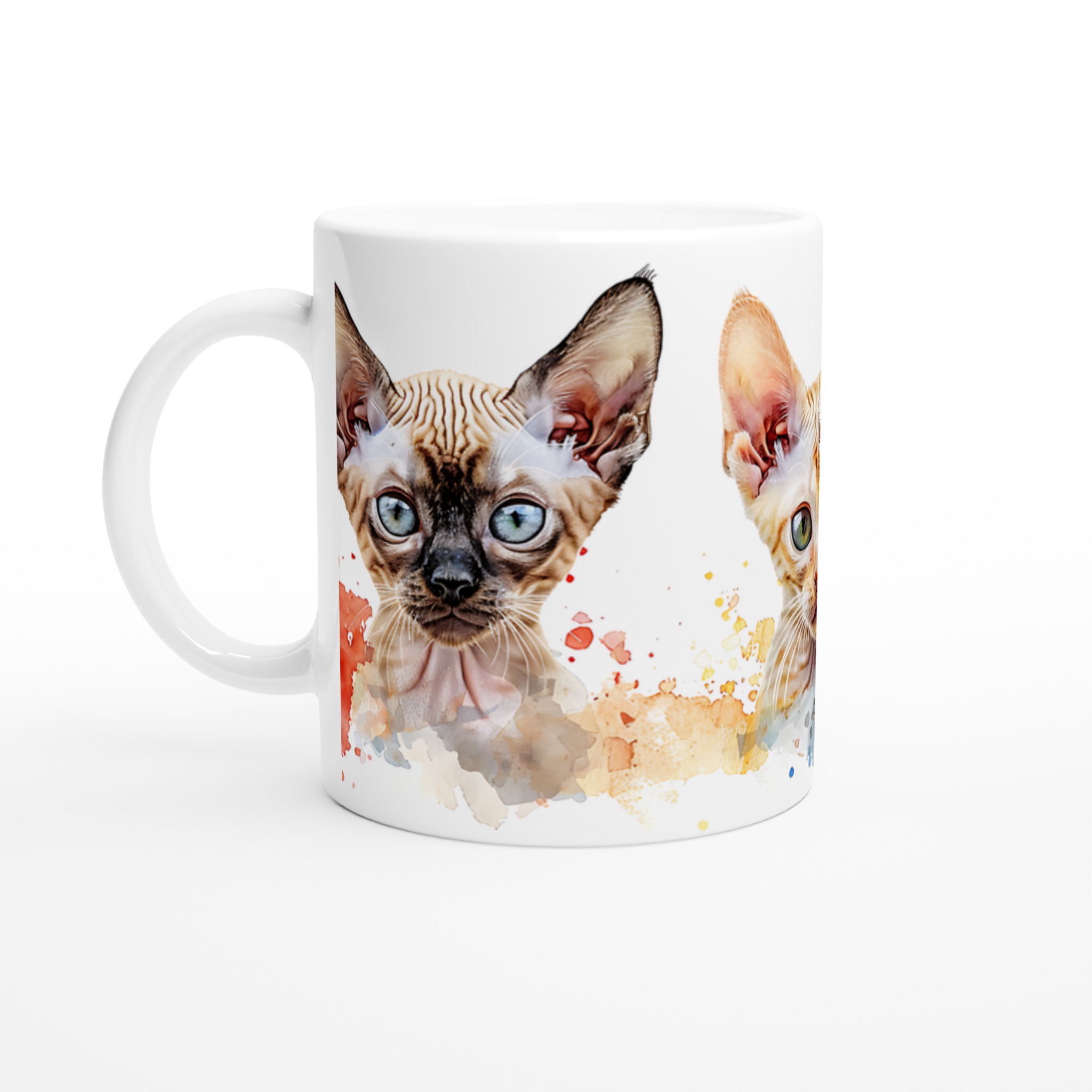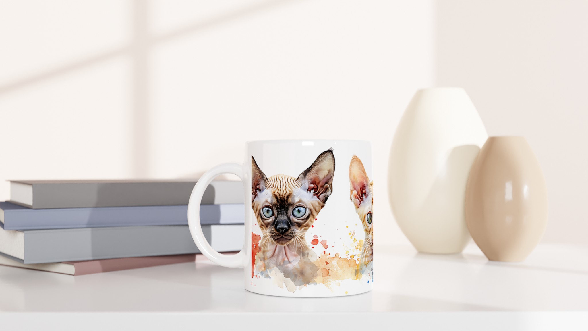 Väck liv i din kaffestund med vår charmiga sfinxkattmugg, en sann vardagsfavorit för alla kattälskare. Varje mugg pryds av bedårande sfinxkattungar i en livlig akvarellstil, perfekt för att förgylla morgonkaffet, kvällens varma choklad eller en lugn stund med te. Den blanka vita ytan låter de konstnärliga trycken framträda med klara och levande färger som bibehåller sin skönhet, även efter otaliga turer i mikron och diskmaskinen.
