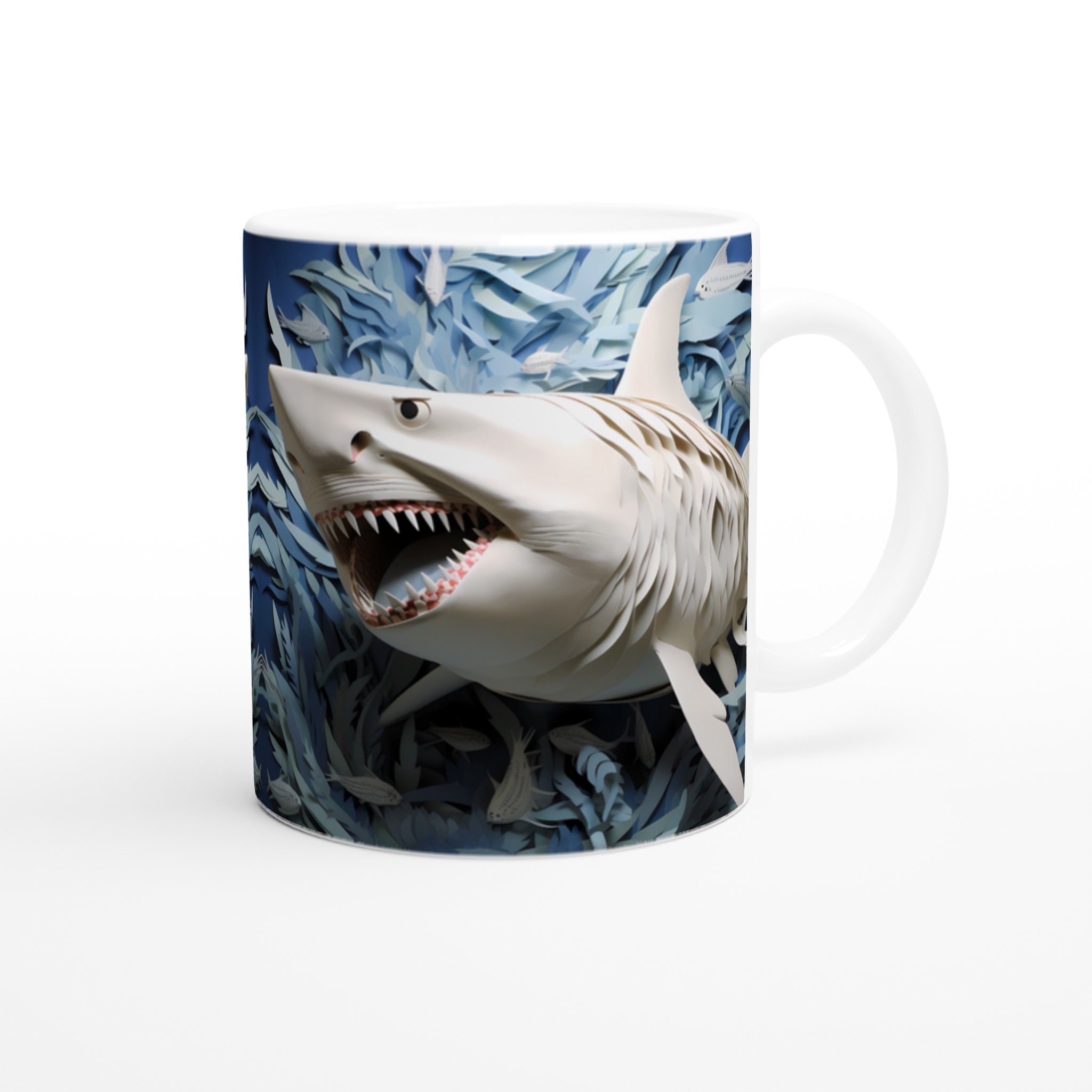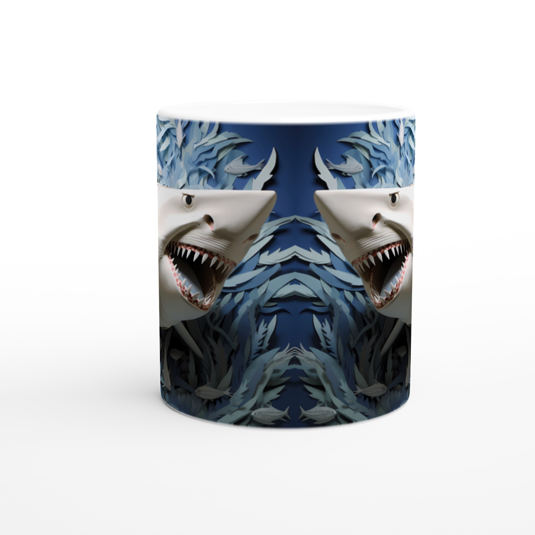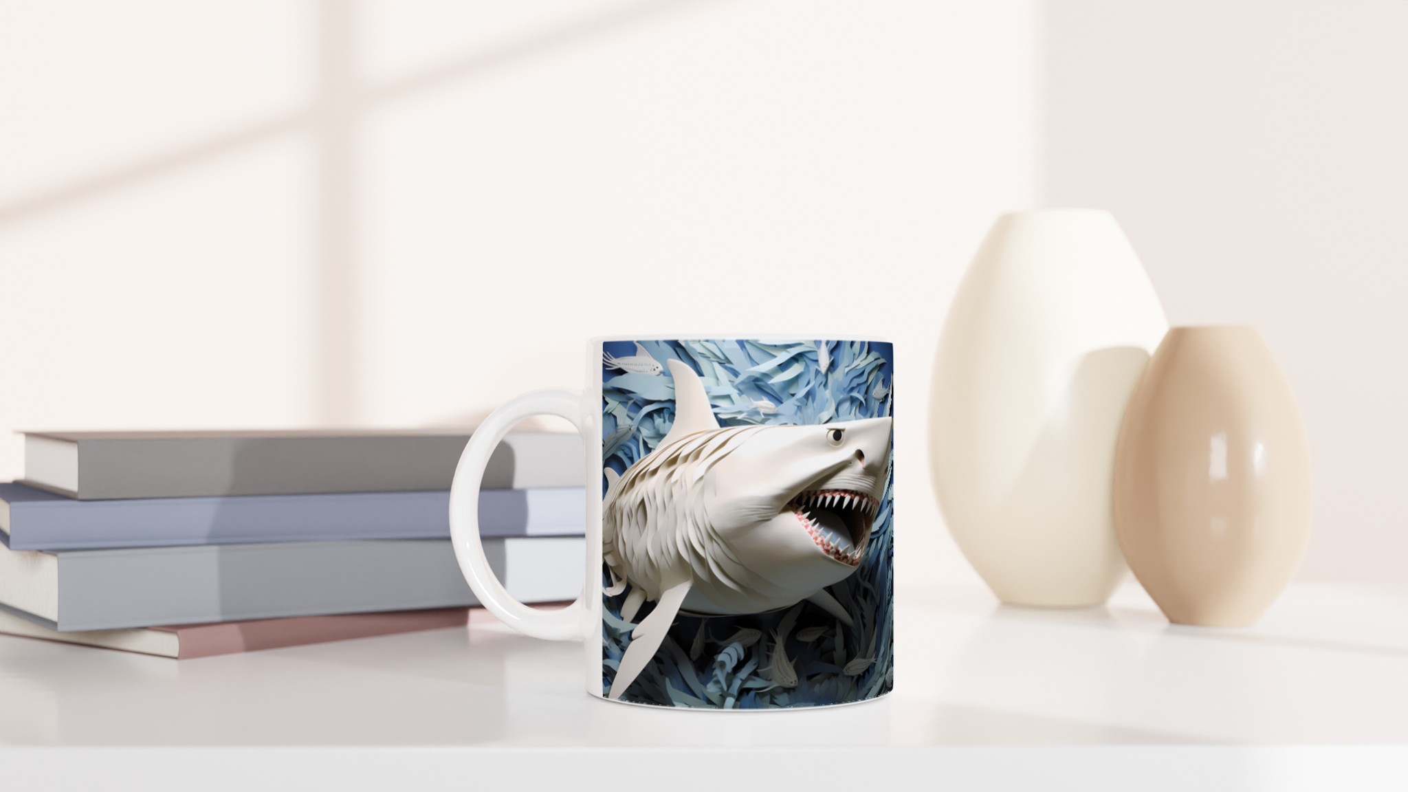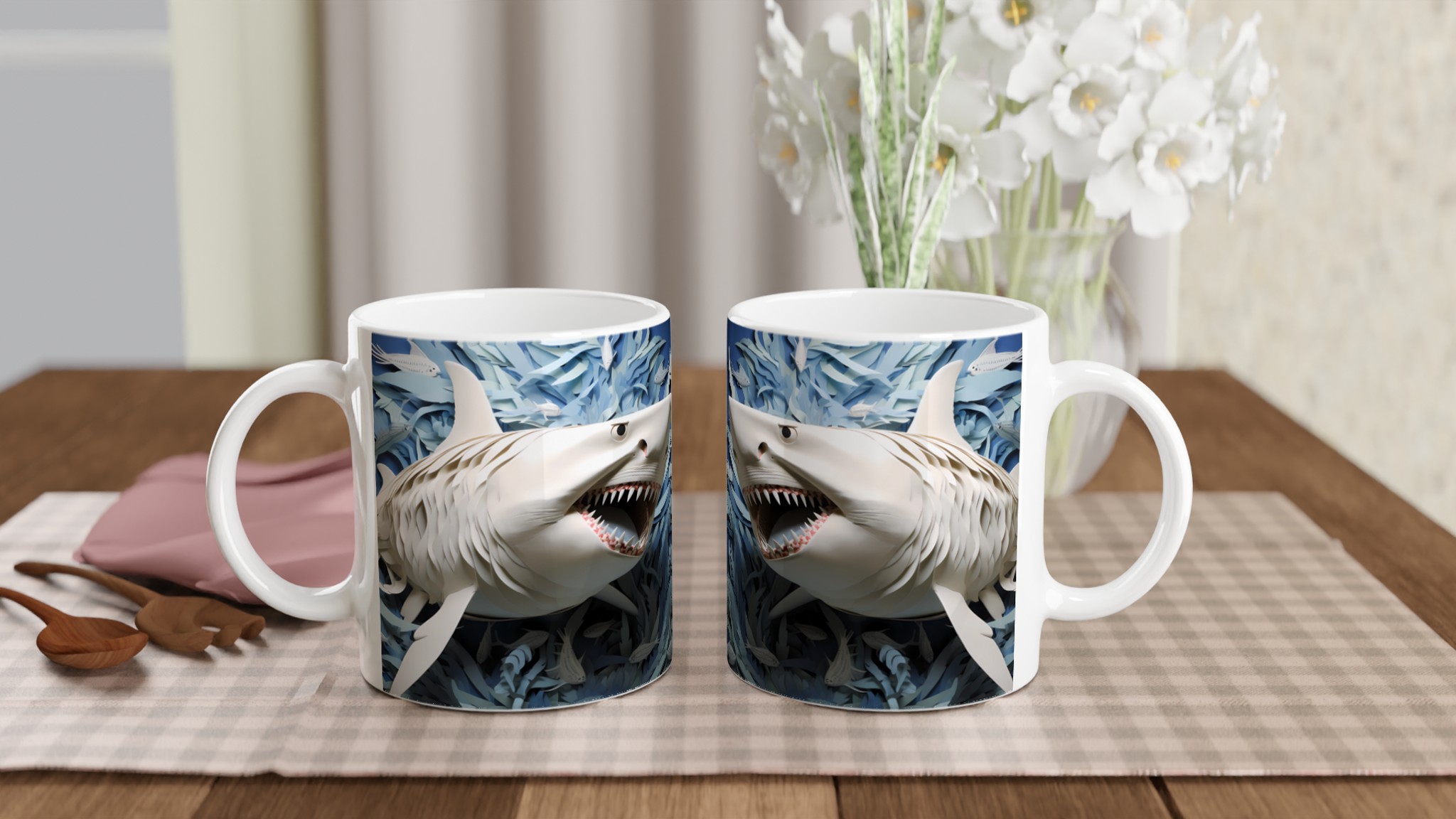 Dyk rakt in i din morgonrutin med vår unika keramiska mugg, prydd med ett dramatiskt men stilrent hajmönster. Den här muggen blir snabbt en vardagsfavorit och en riktig konversationsstartare, perfekt för morgonkaffet, kvällens varma choklad eller när du bara vill njuta av en kopp te. Den blanka vita ytan framhäver tryckets intensiva färger och skarpa detaljer, som håller sig fina även efter många turer i mikron och diskmaskinen.