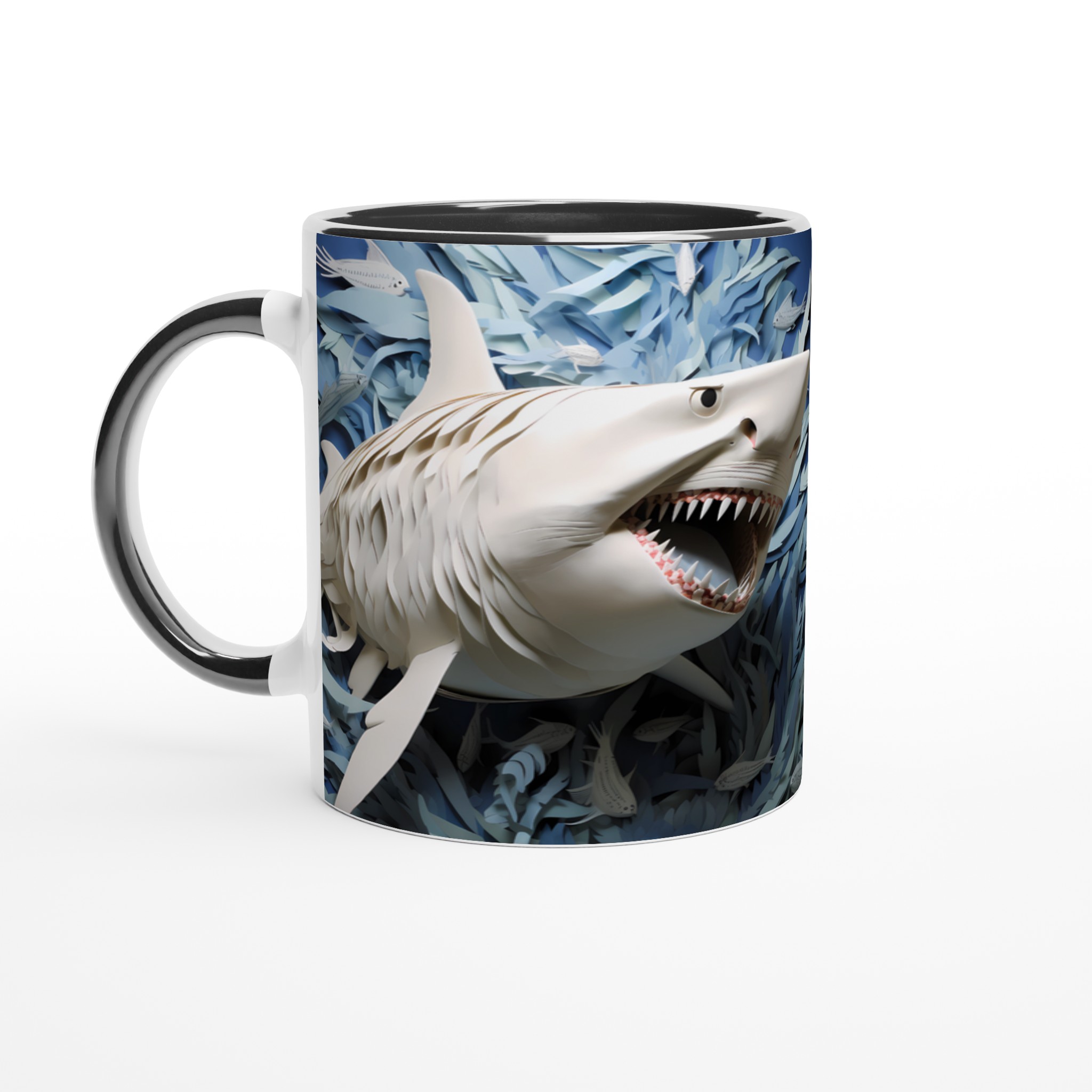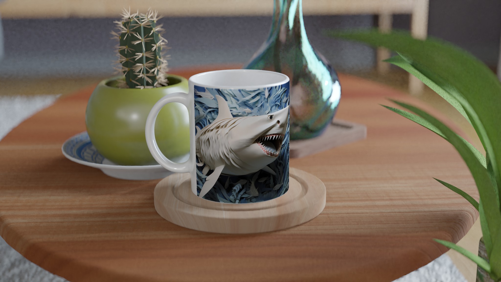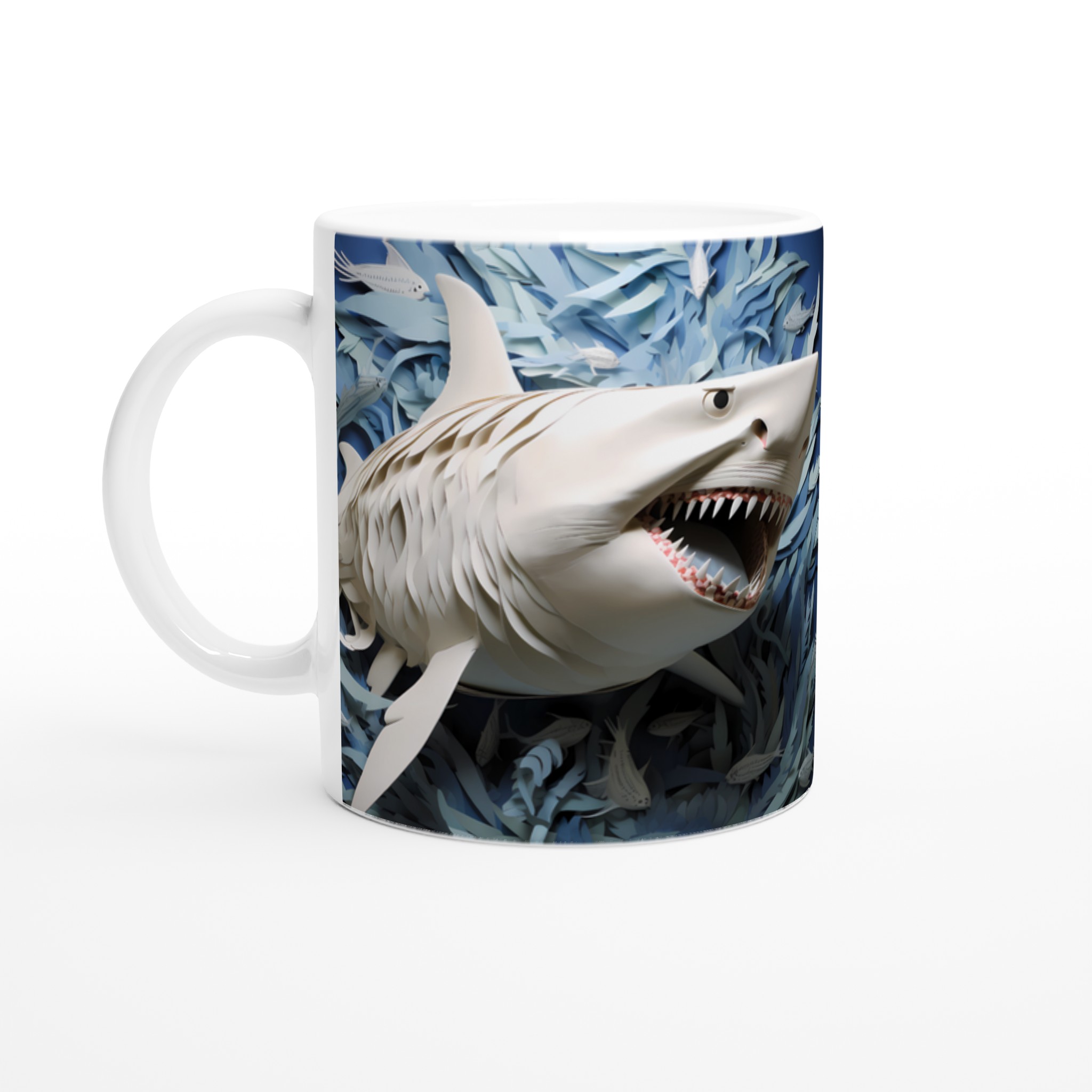 Dyk rakt in i din morgonrutin med vår unika keramiska mugg, prydd med ett dramatiskt men stilrent hajmönster. Den här muggen blir snabbt en vardagsfavorit och en riktig konversationsstartare, perfekt för morgonkaffet, kvällens varma choklad eller när du bara vill njuta av en kopp te. Den blanka vita ytan framhäver tryckets intensiva färger och skarpa detaljer, som håller sig fina även efter många turer i mikron och diskmaskinen.