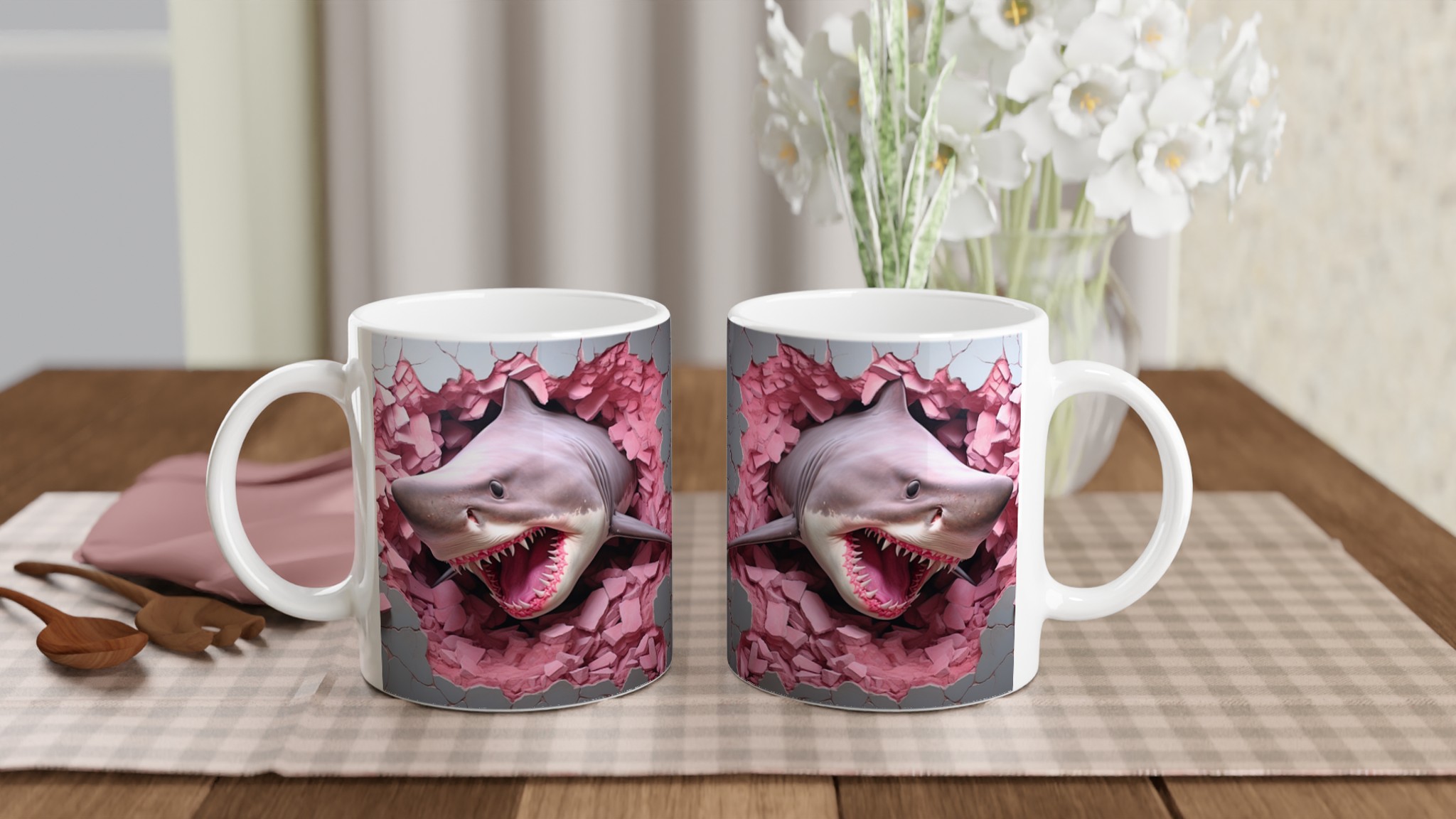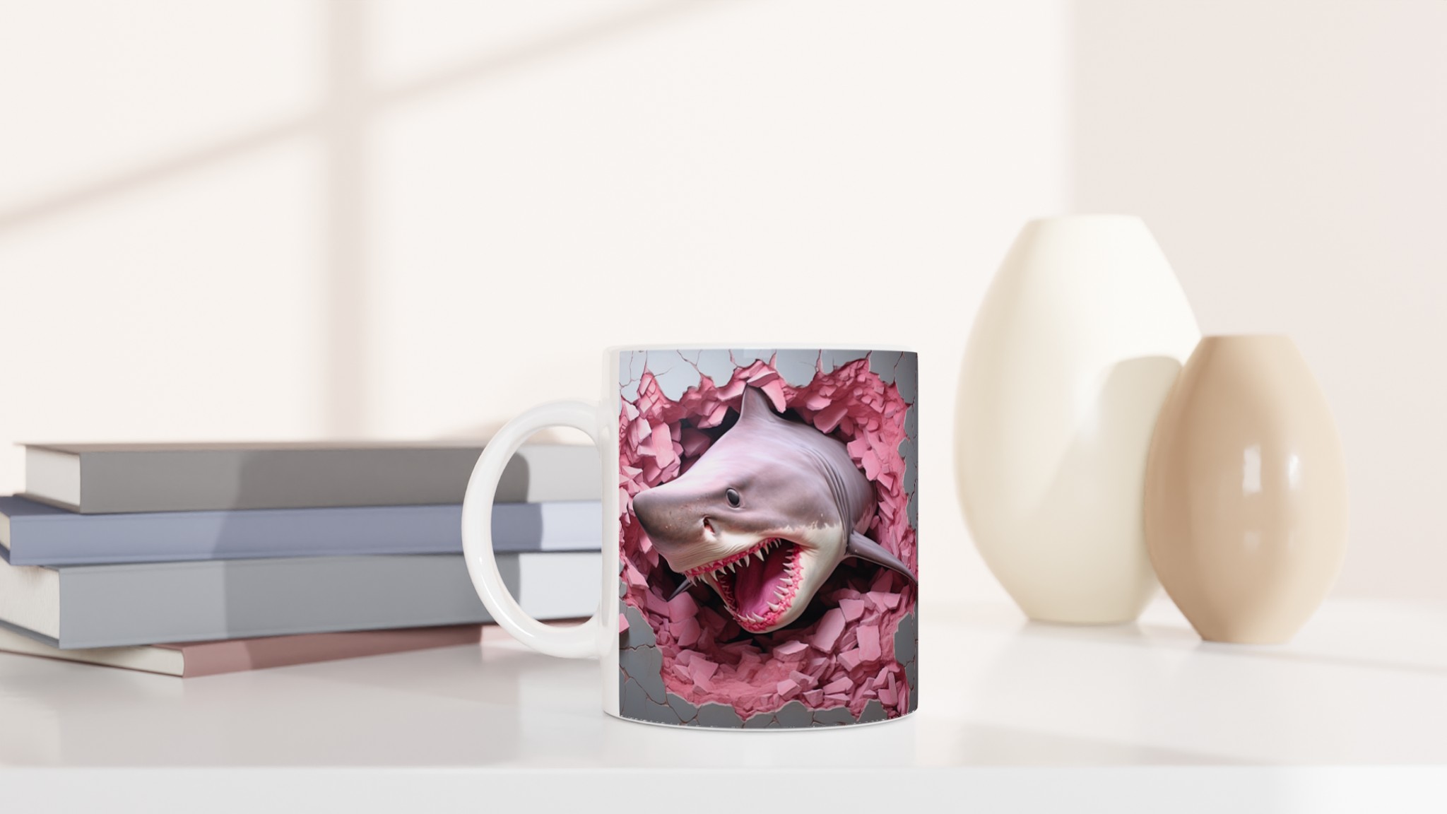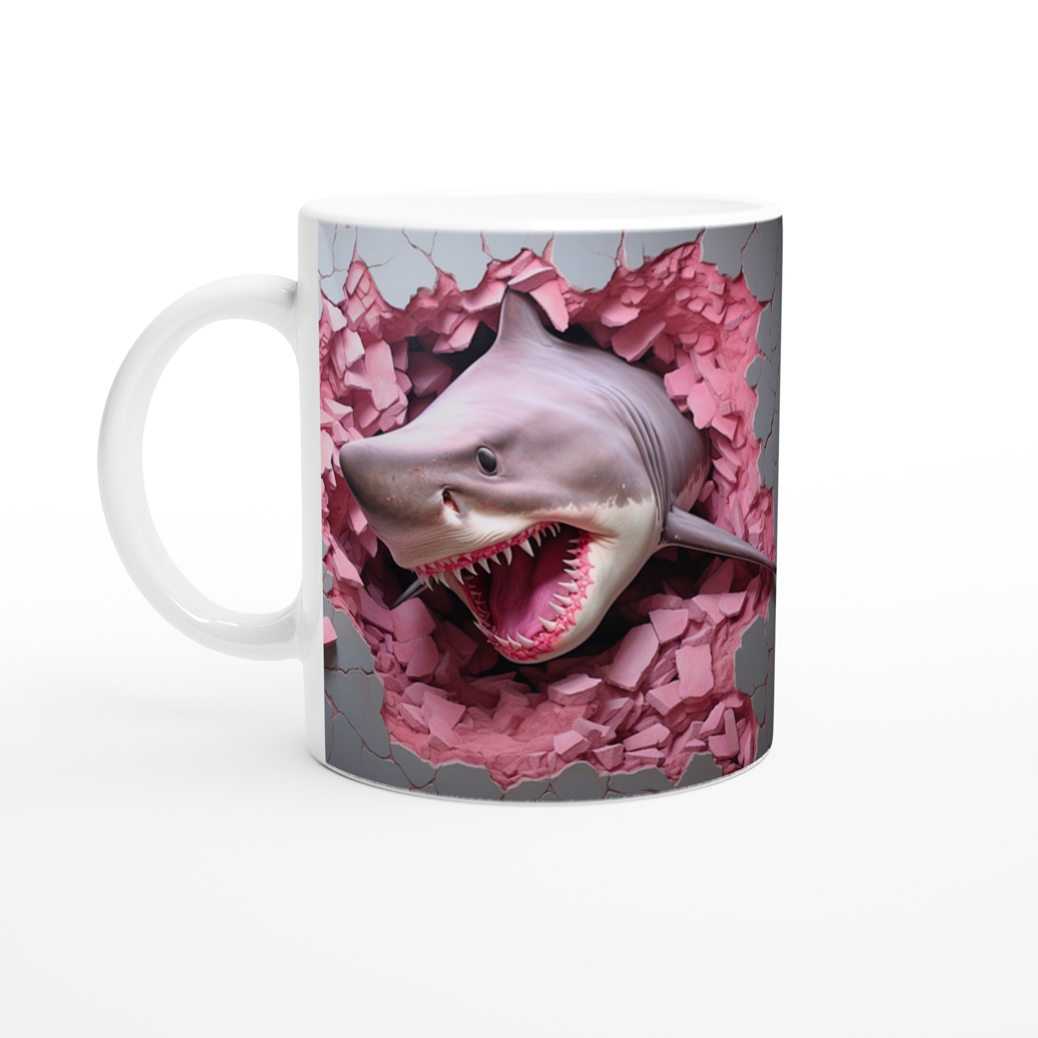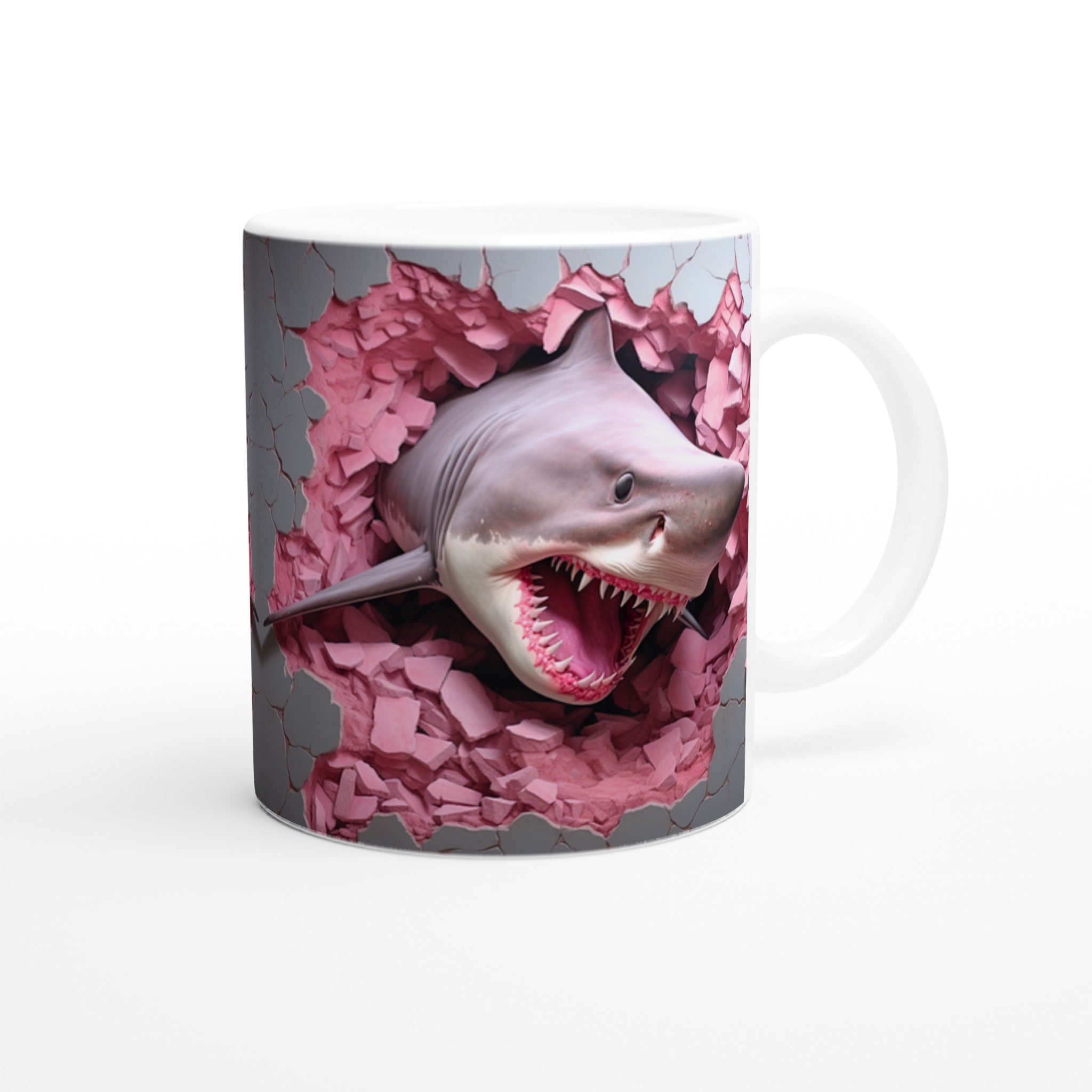 Våga vara annorlunda med denna unika keramiska mugg! Föreställ dig en haj som bryter sig igenom väggen, omgiven av spännande rosa sprickor. Denna mugg blir snabbt en favorit för den som älskar äventyr och oväntade detaljer. Perfekt för morgonkaffet, kvällens varma choklad eller när du bara vill njuta av en kopp te med en twist. Den blanka vita ytan gör att trycken framhävs med klara och levande färger, som håller sig fina även efter många turer i mikron och diskmaskinen.