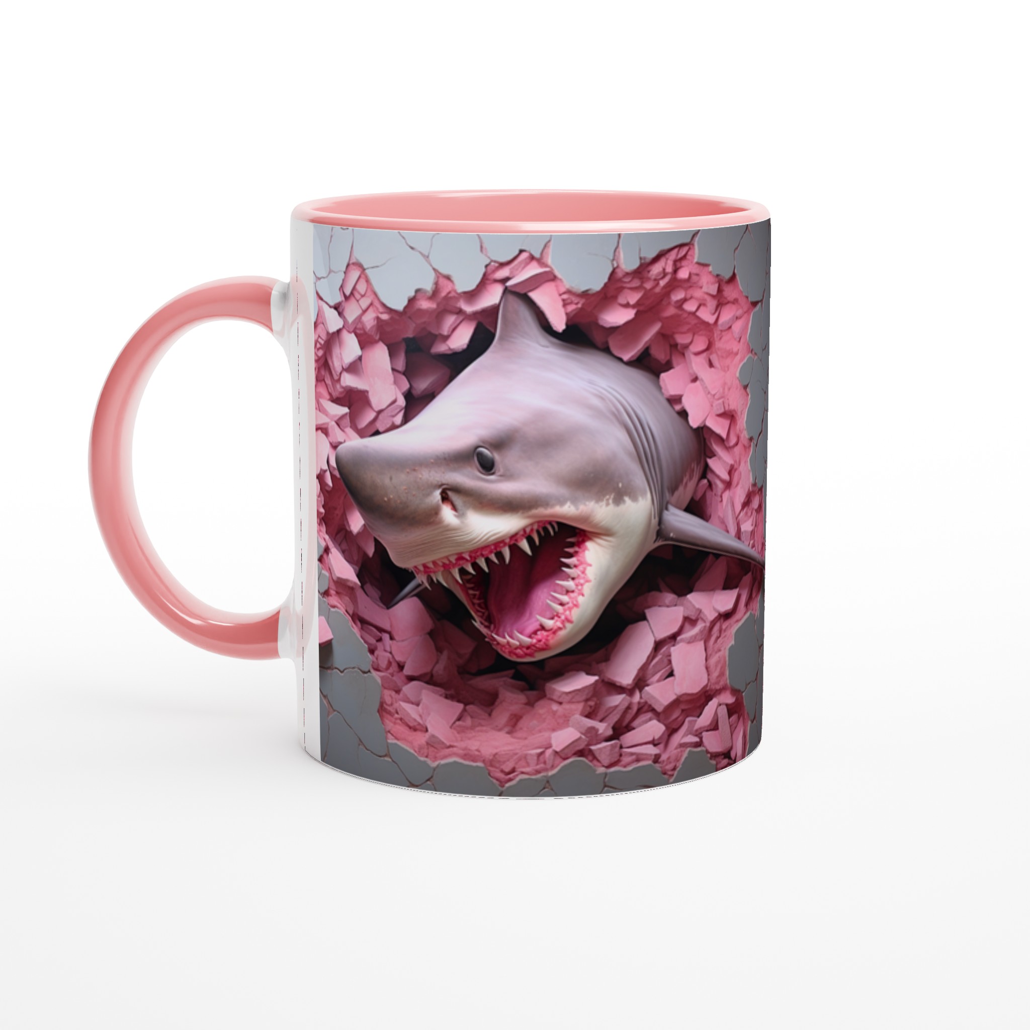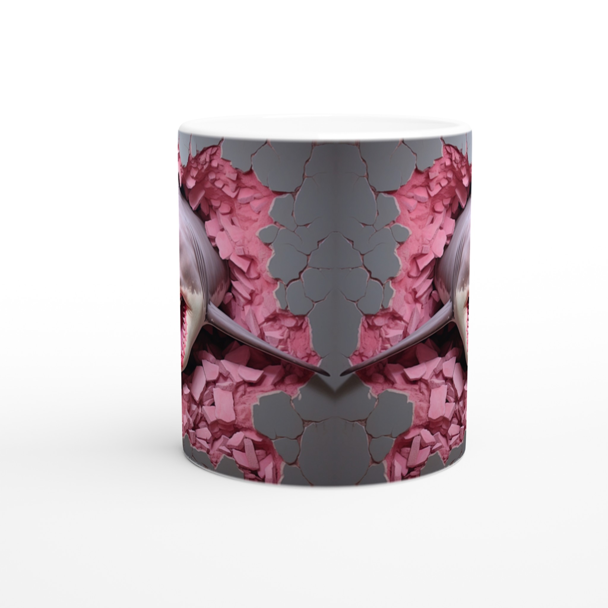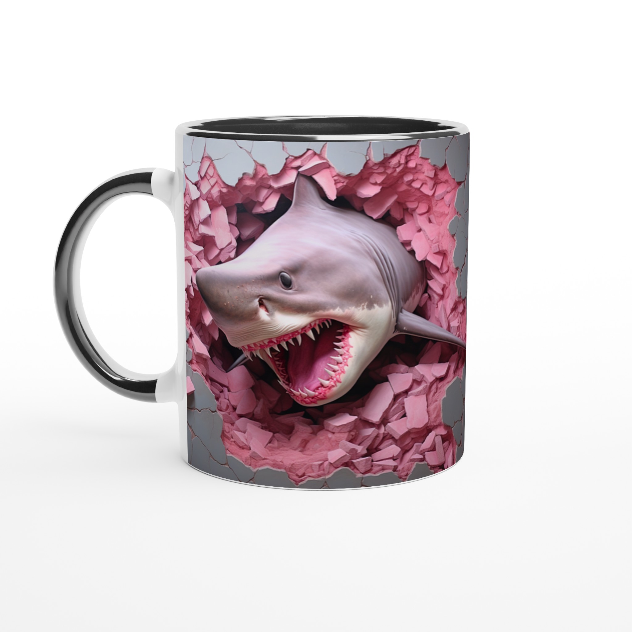Våga vara annorlunda med denna unika keramiska mugg! Föreställ dig en haj som bryter sig igenom väggen, omgiven av spännande rosa sprickor. Denna mugg blir snabbt en favorit för den som älskar äventyr och oväntade detaljer. Perfekt för morgonkaffet, kvällens varma choklad eller när du bara vill njuta av en kopp te med en twist. Den blanka vita ytan gör att trycken framhävs med klara och levande färger, som håller sig fina även efter många turer i mikron och diskmaskinen.