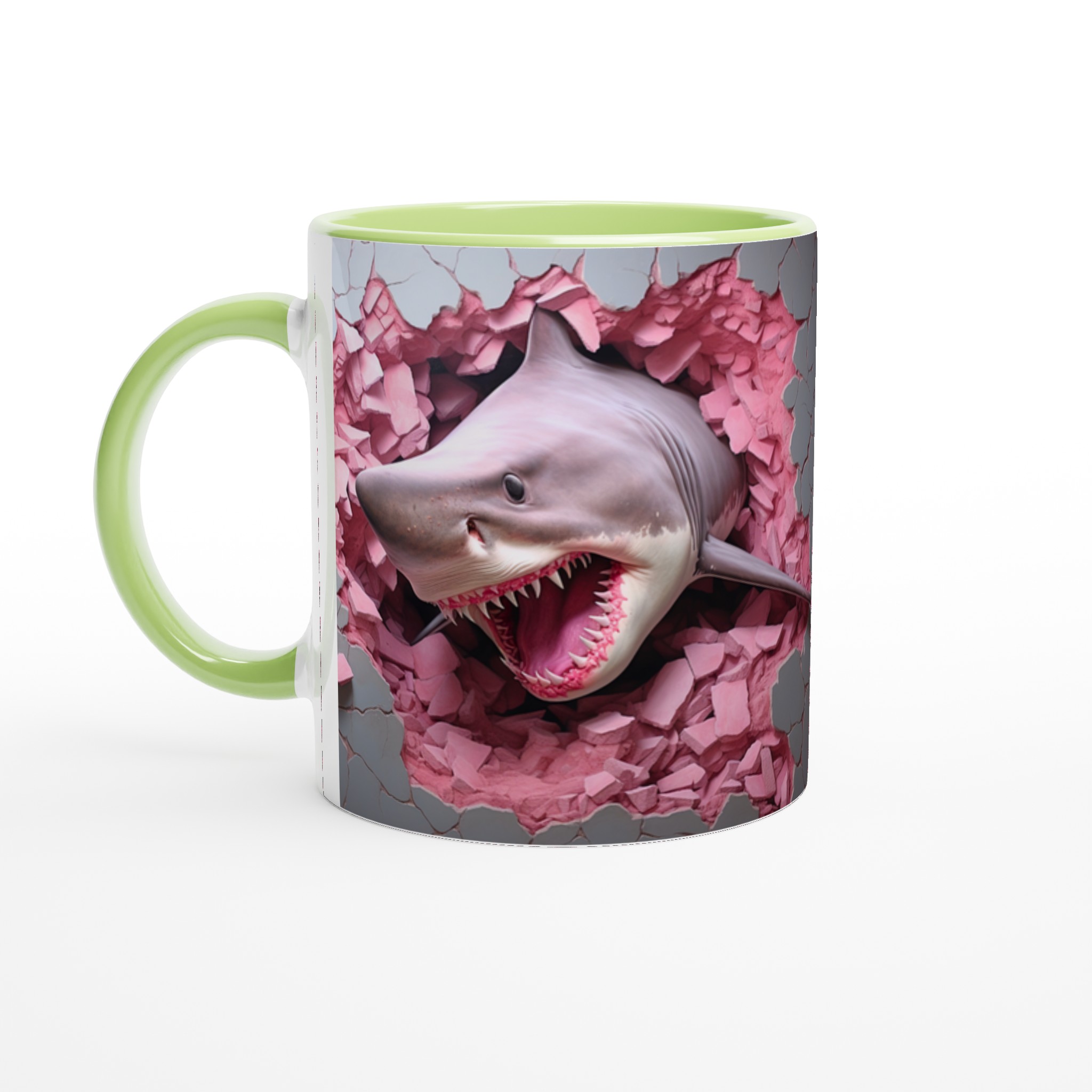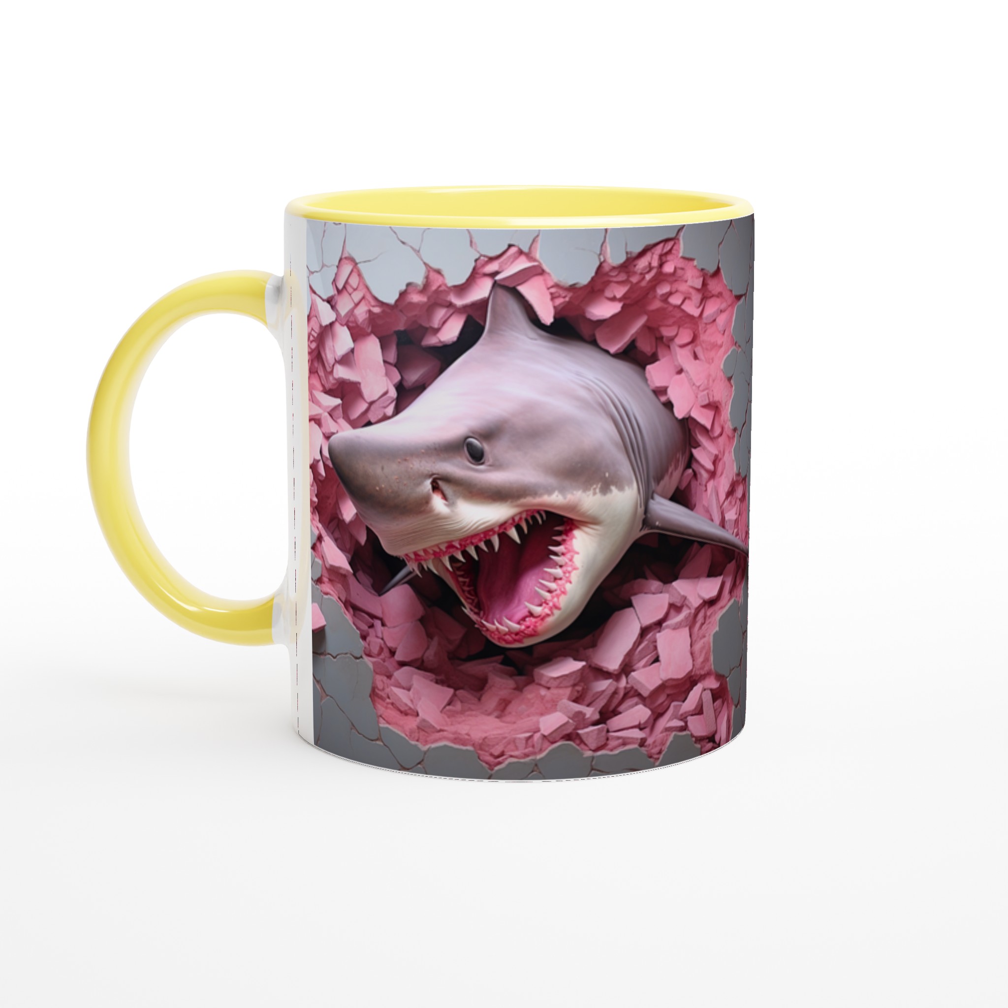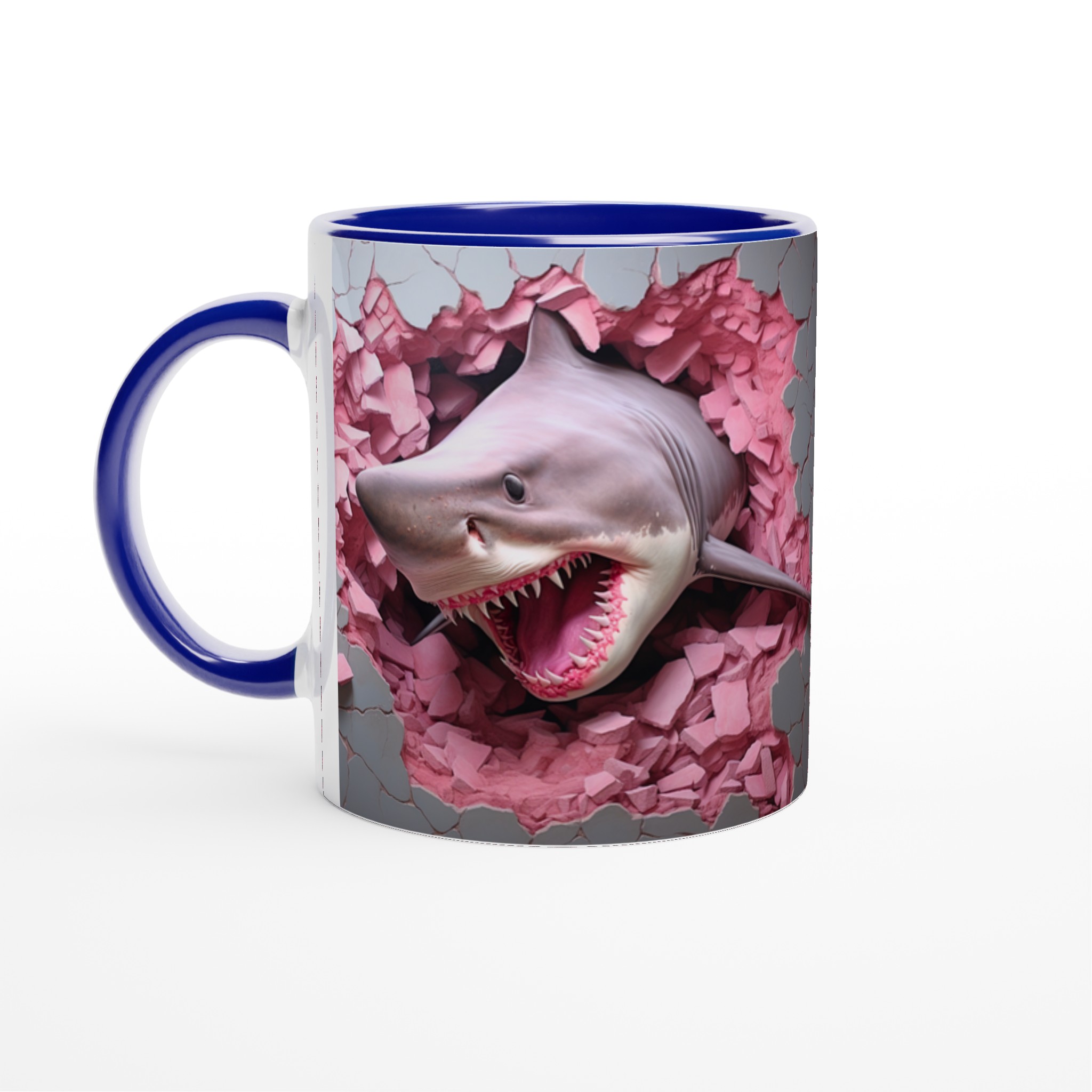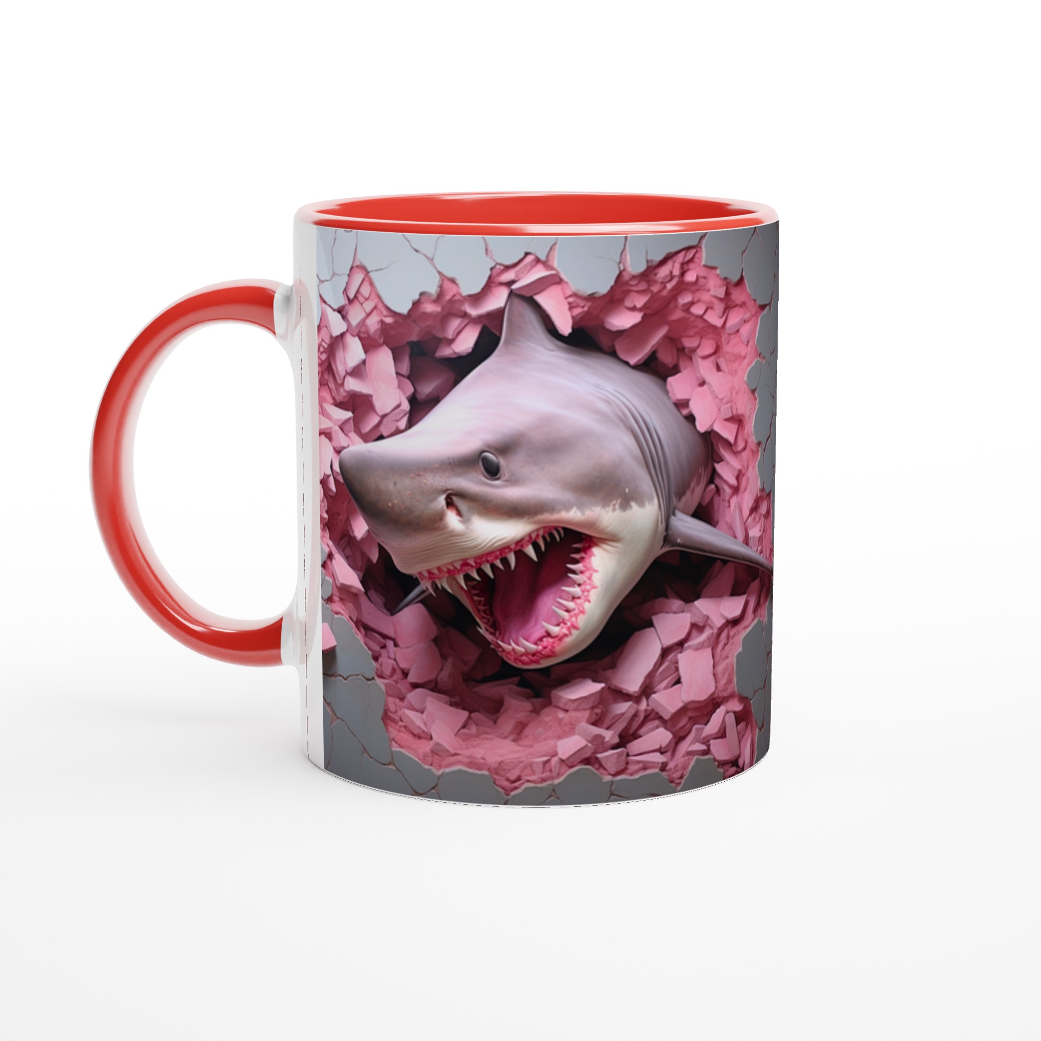 Våga vara annorlunda med denna unika keramiska mugg! Föreställ dig en haj som bryter sig igenom väggen, omgiven av spännande rosa sprickor. Denna mugg blir snabbt en favorit för den som älskar äventyr och oväntade detaljer. Perfekt för morgonkaffet, kvällens varma choklad eller när du bara vill njuta av en kopp te med en twist. Den blanka vita ytan gör att trycken framhävs med klara och levande färger, som håller sig fina även efter många turer i mikron och diskmaskinen.