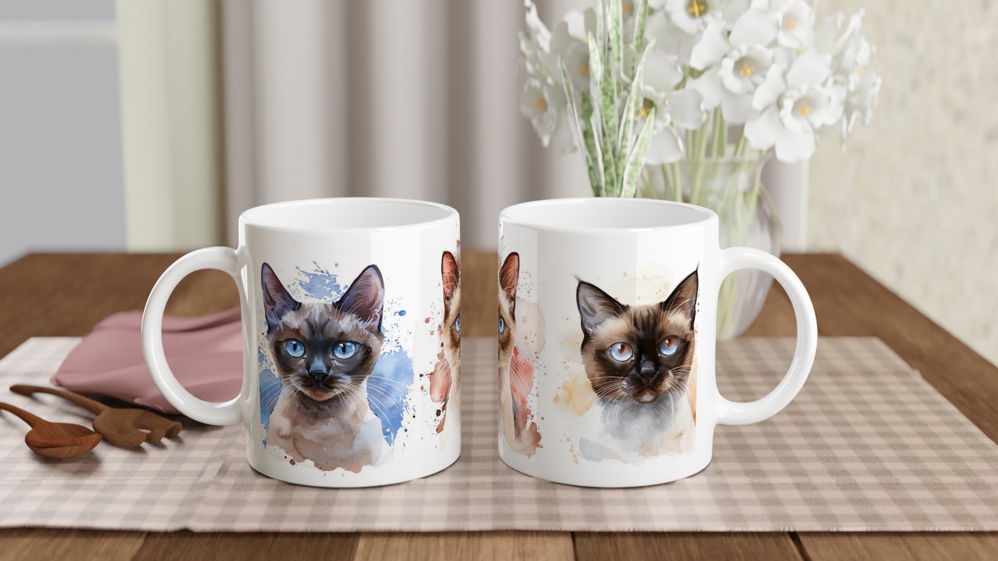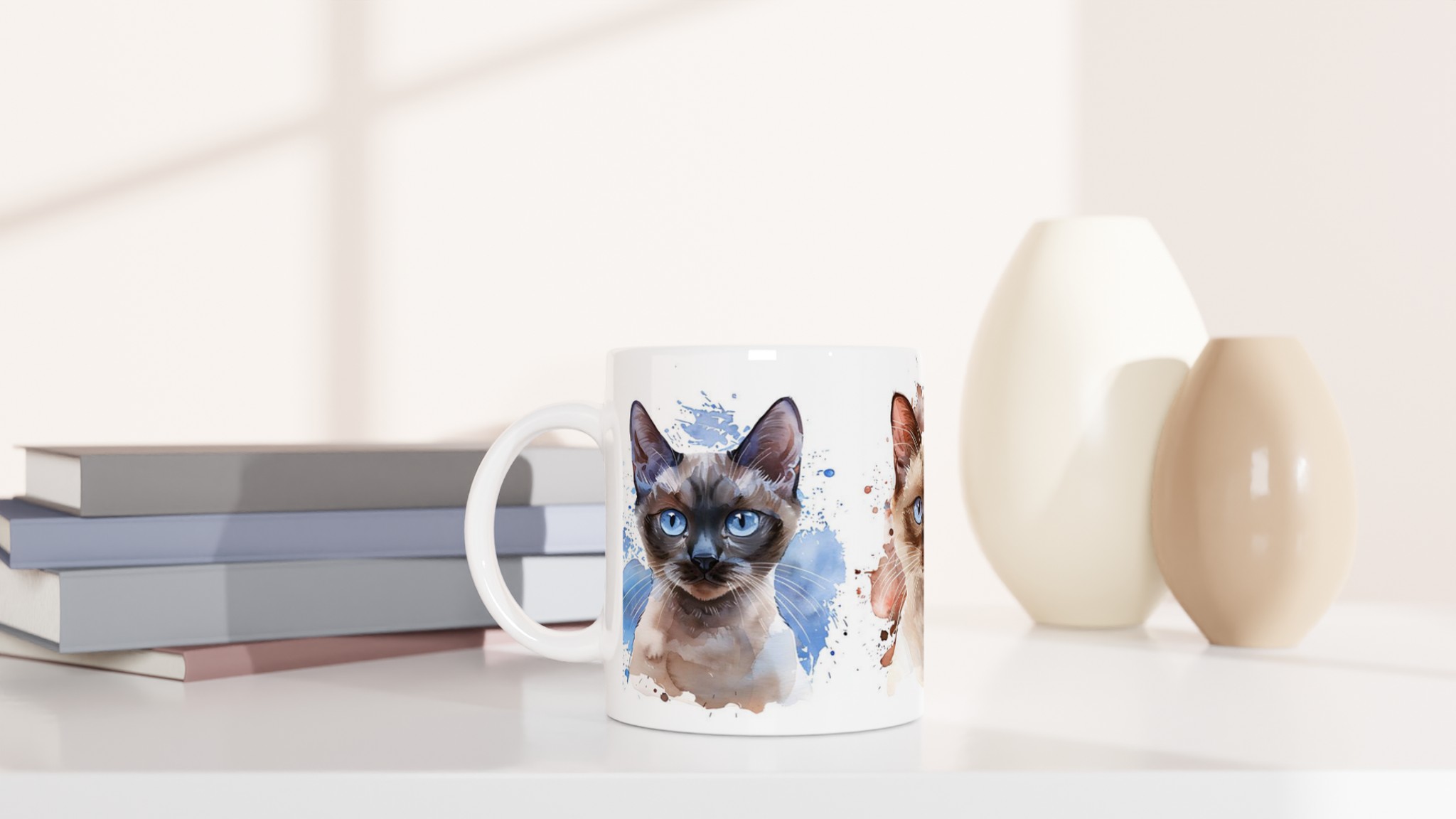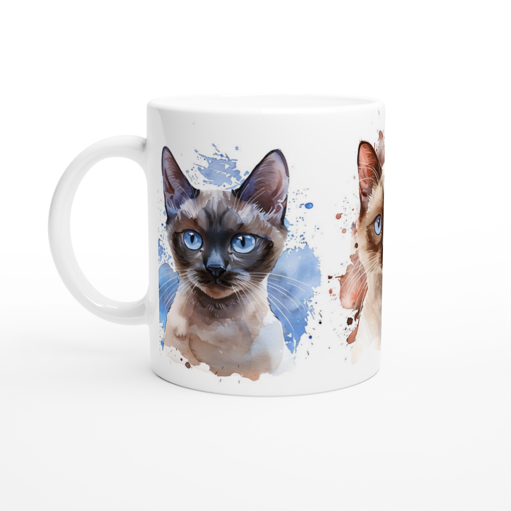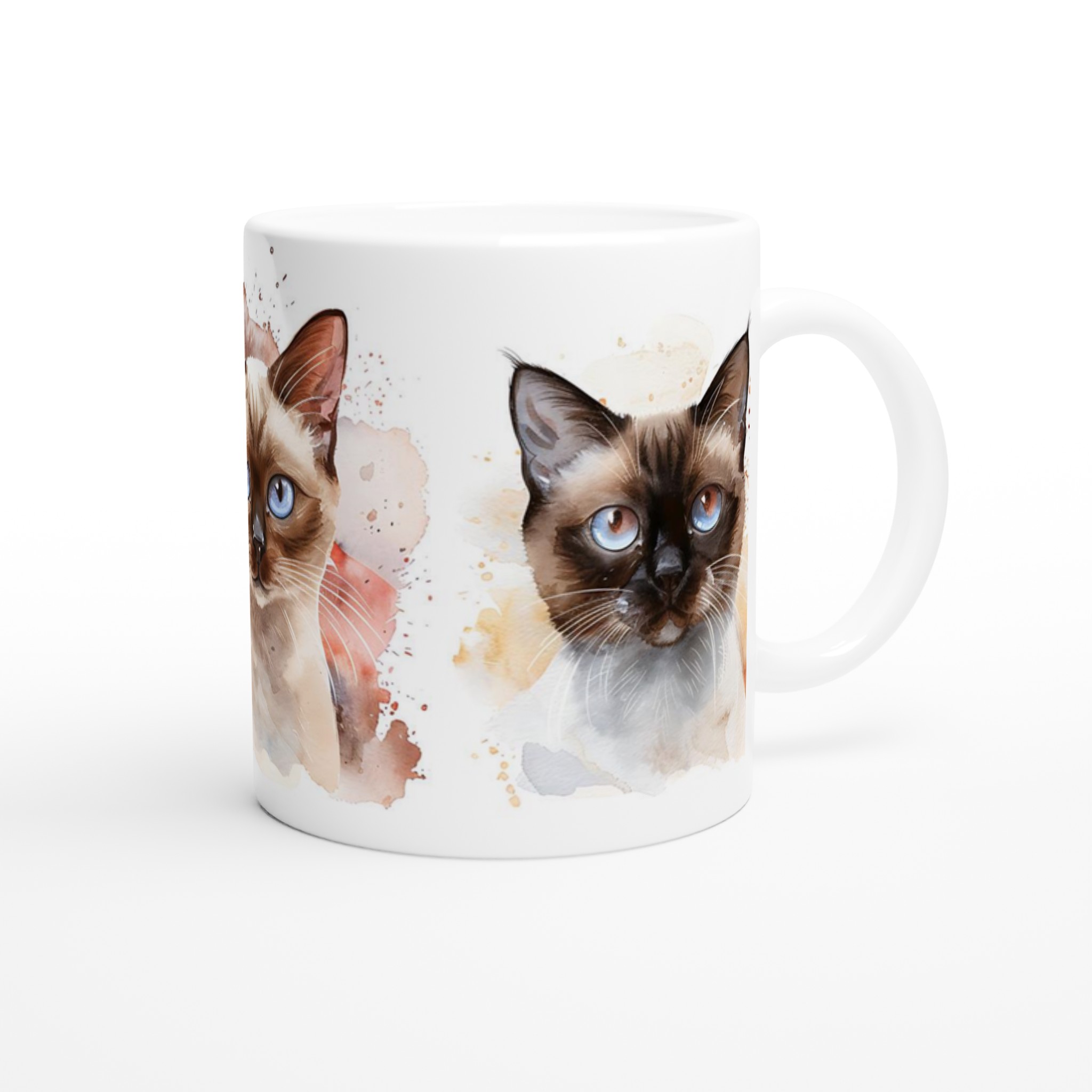 För kattälskaren som uppskattar både stil och en god kopp! Den här unika keramiska muggen, prydd med en förtrollande akvarellillustration av en siamesk katt, blir snabbt en favorit. De levande färgstänkarna bakom den detaljrika kattbilden ger varje mugg en konstnärlig touch, perfekt för morgonkaffet, kvällens varma choklad, eller när du bara vill njuta av en kopp te med en gnutta personlighet.