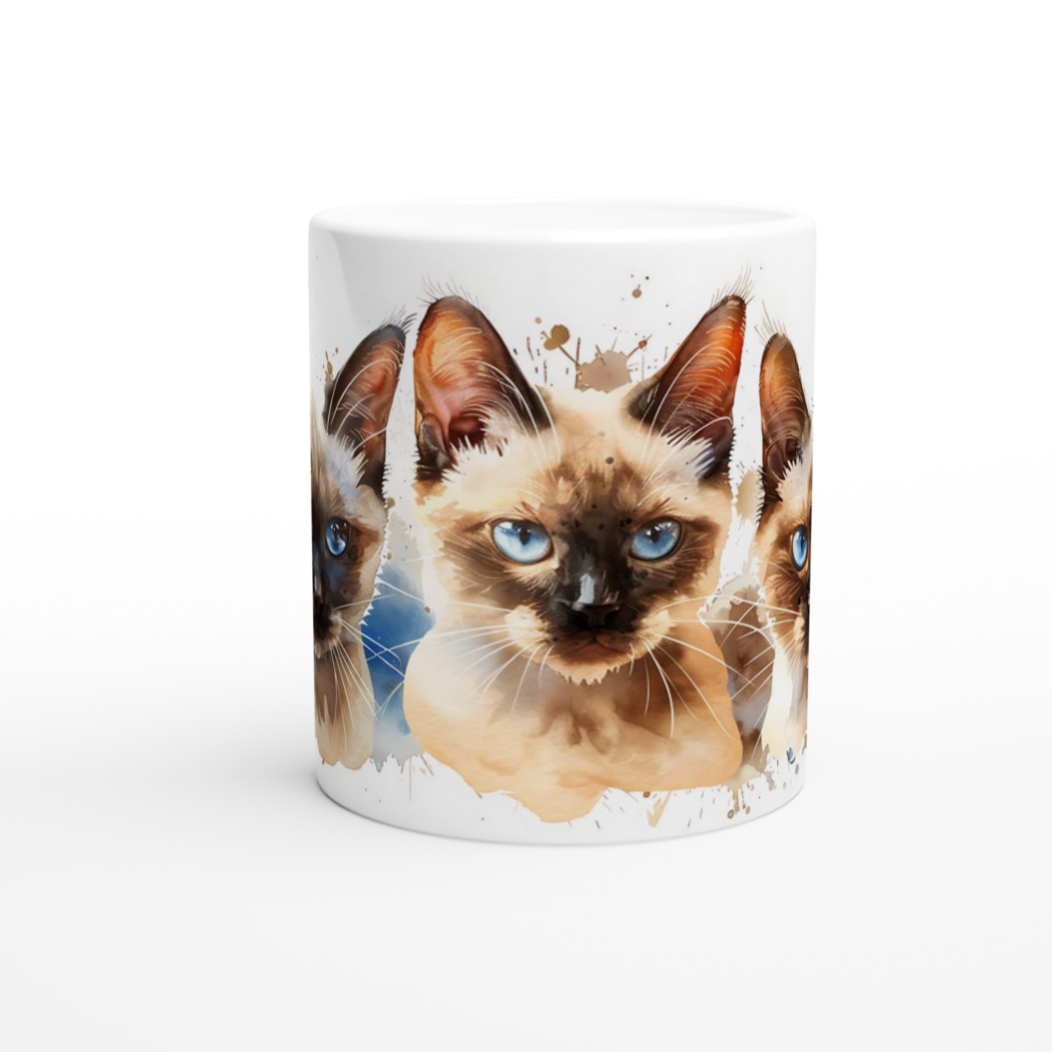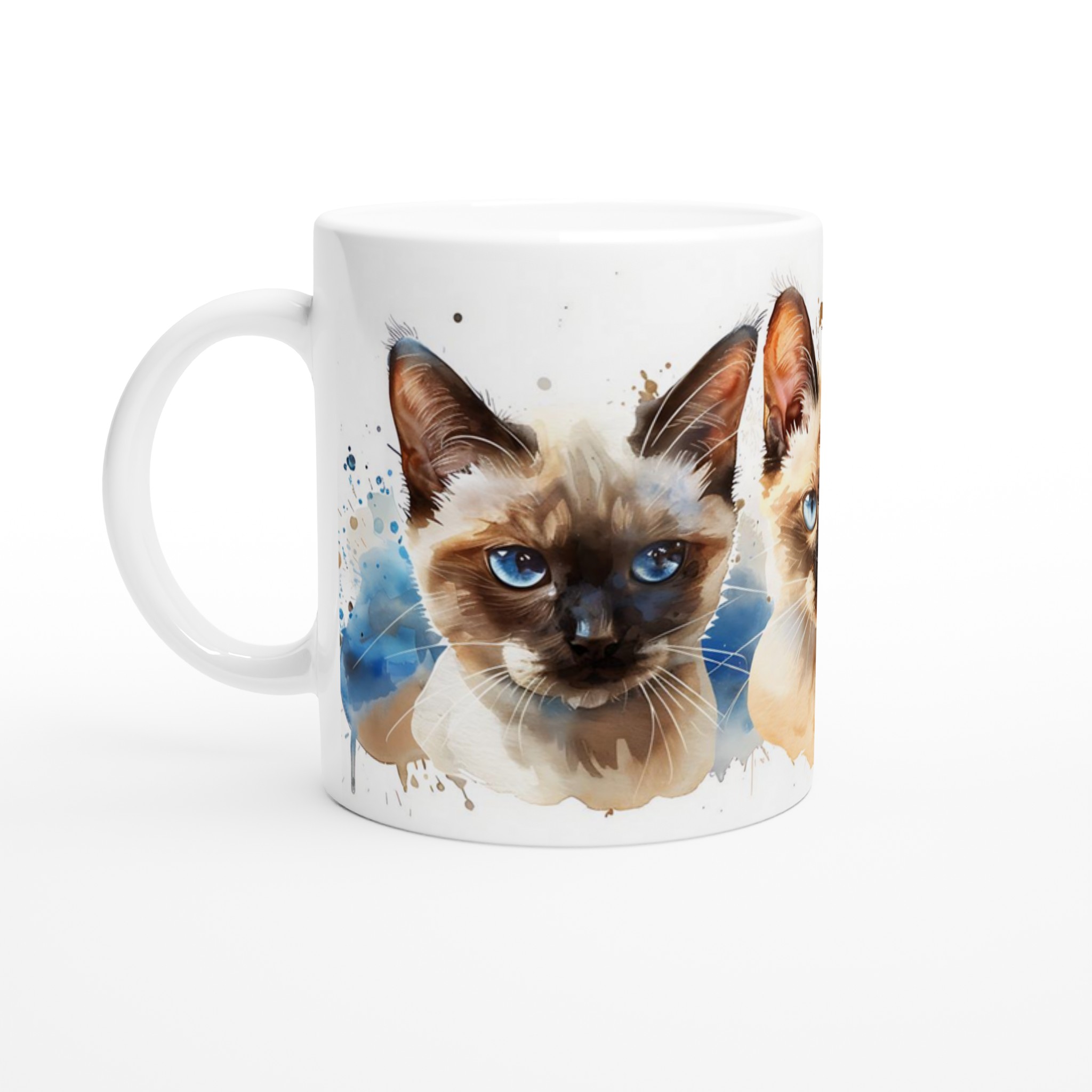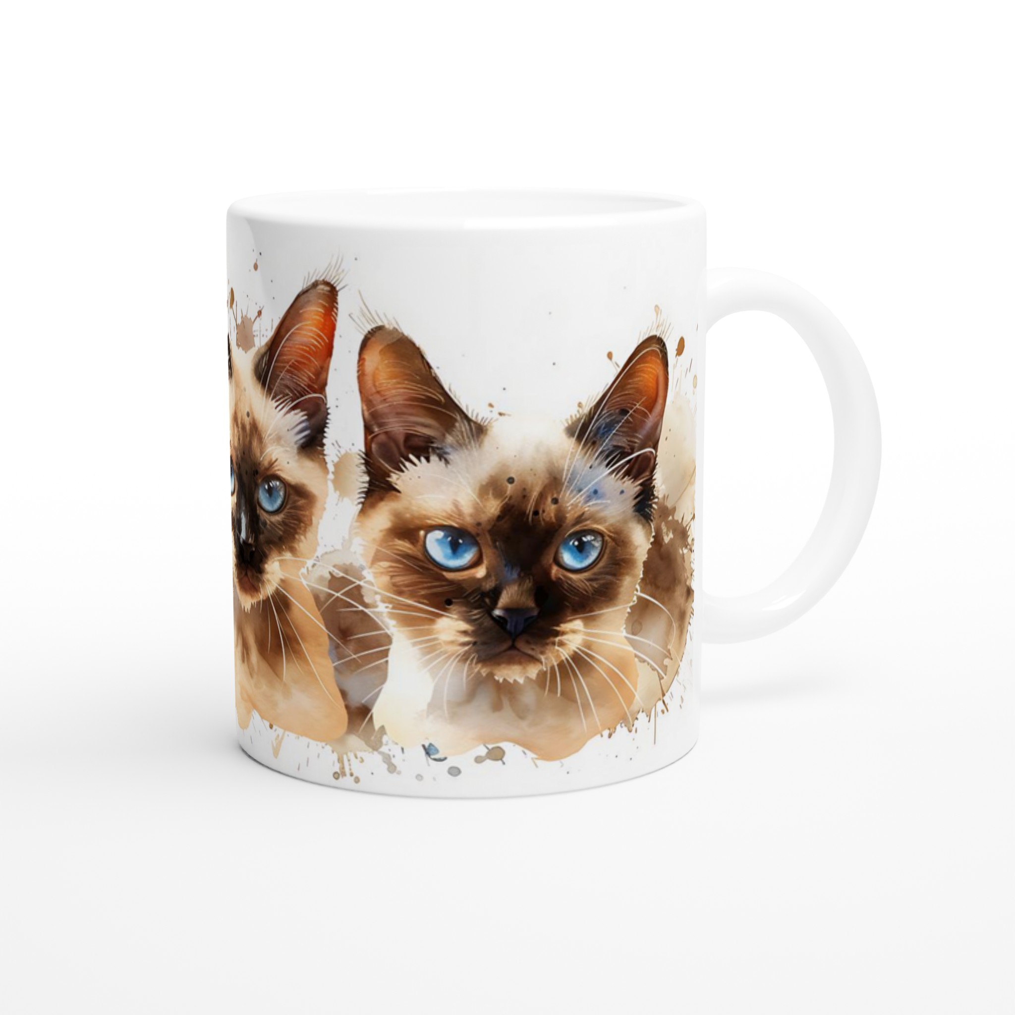 Fånga charmen hos dessa förtrollande siameskatter med blå ögon, framställda i en livfull akvarellstil. Denna stilrena keramiska mugg blir snabbt en vardagsfavorit för alla kattälskare. Perfekt för morgonkaffet, kvällens varma choklad eller när du bara vill njuta av en kopp te medan du drömmer dig bort till de lekfulla siamesernas värld. Den blanka vita ytan gör att de detaljerade katttrycken framhävs med klara och levande färger, som håller sig fina även efter många turer i mikron och diskmaskinen.