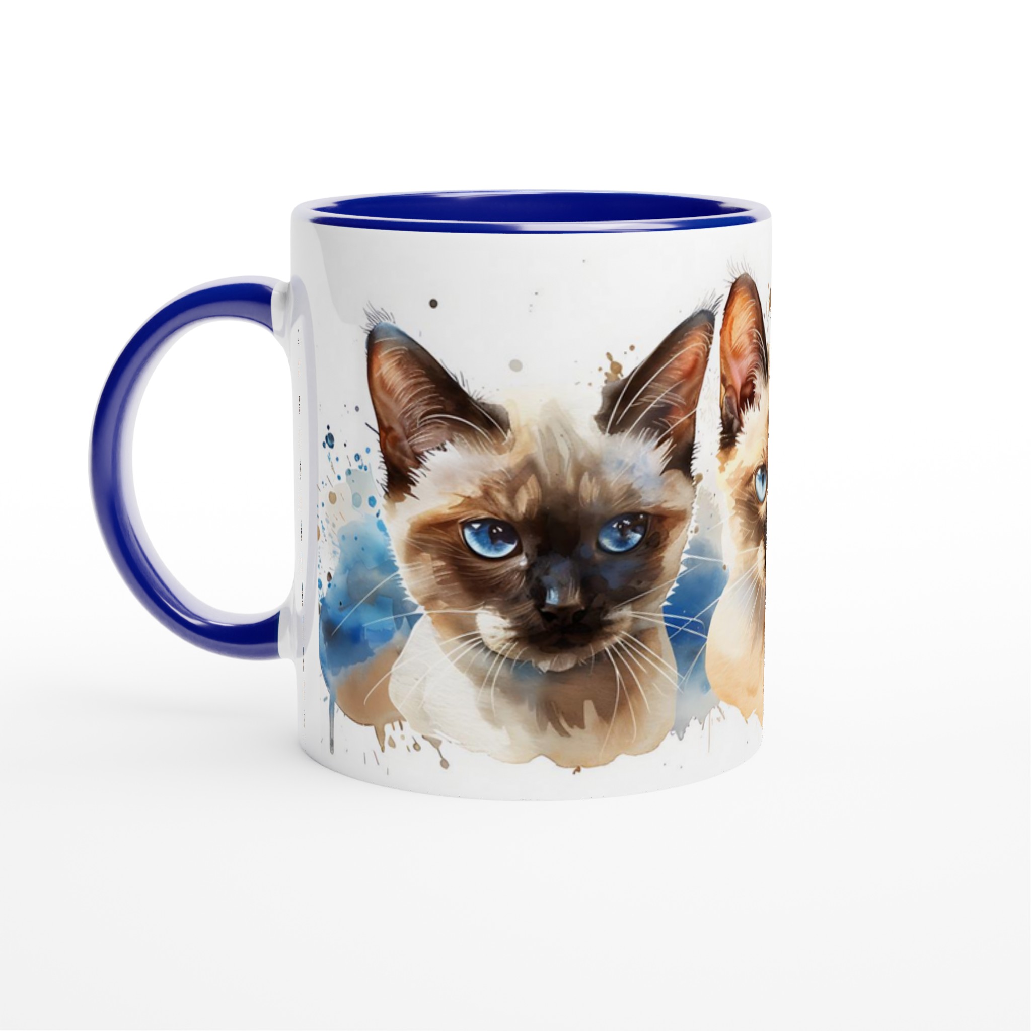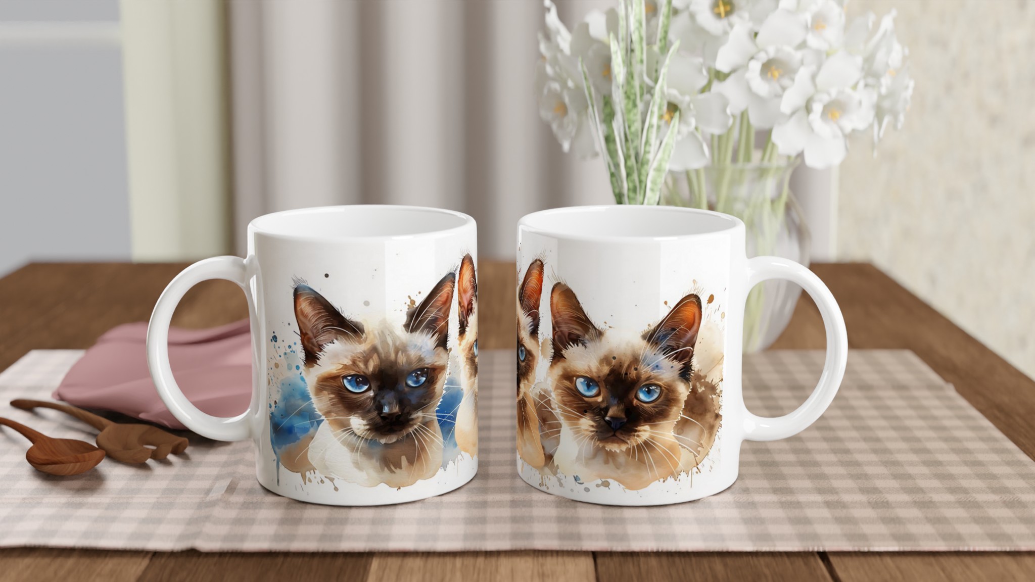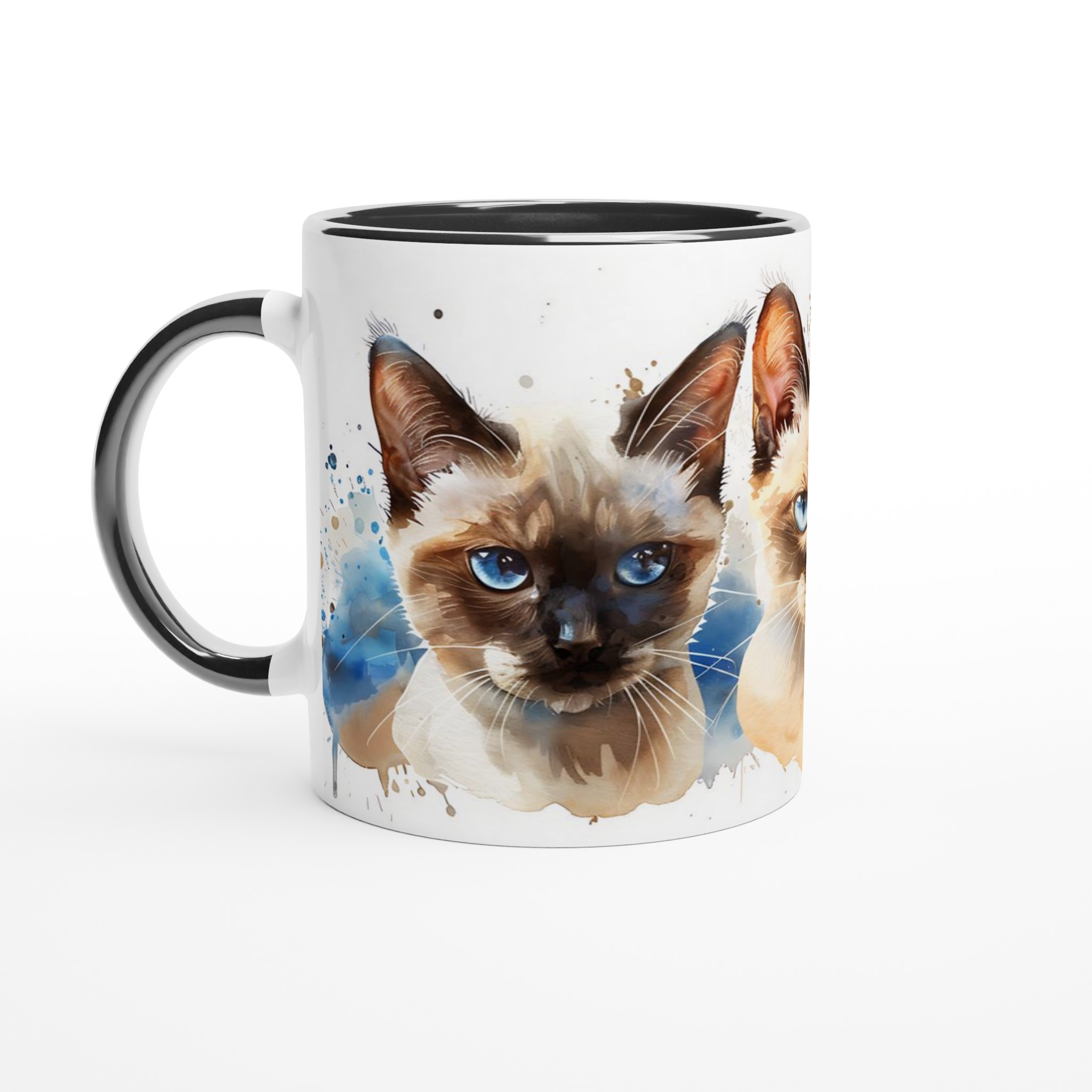 Fånga charmen hos dessa förtrollande siameskatter med blå ögon, framställda i en livfull akvarellstil. Denna stilrena keramiska mugg blir snabbt en vardagsfavorit för alla kattälskare. Perfekt för morgonkaffet, kvällens varma choklad eller när du bara vill njuta av en kopp te medan du drömmer dig bort till de lekfulla siamesernas värld. Den blanka vita ytan gör att de detaljerade katttrycken framhävs med klara och levande färger, som håller sig fina även efter många turer i mikron och diskmaskinen.