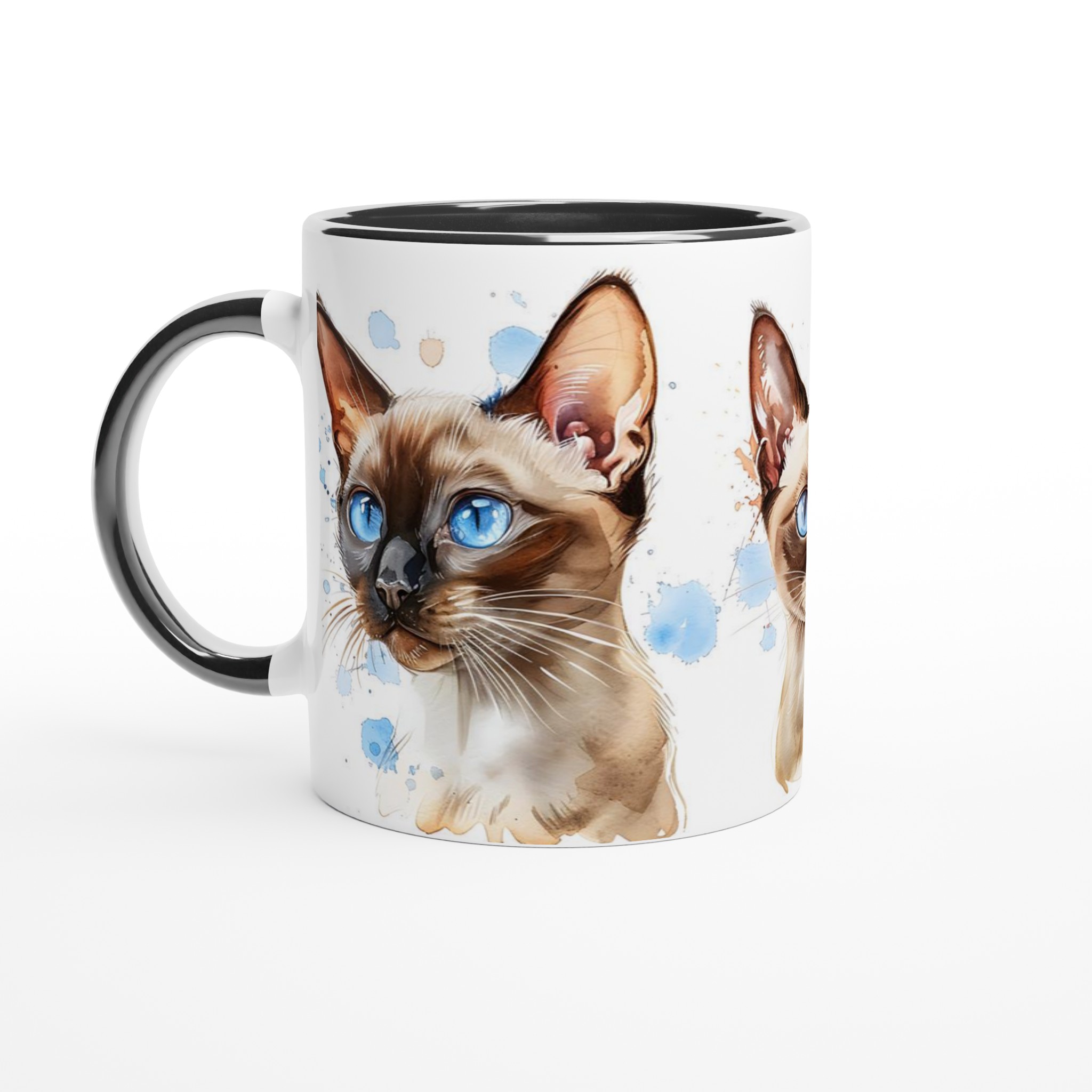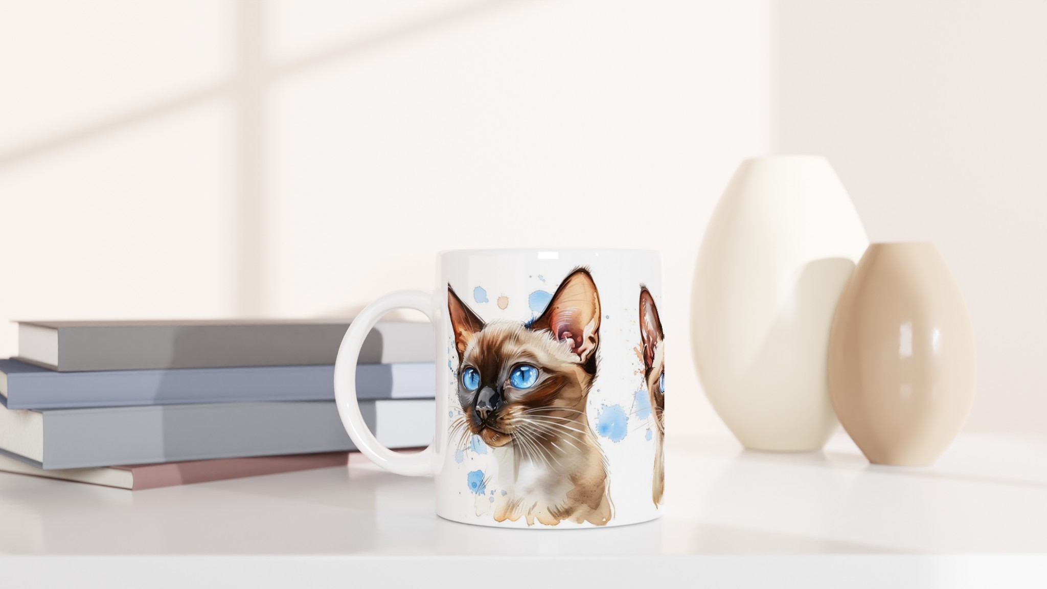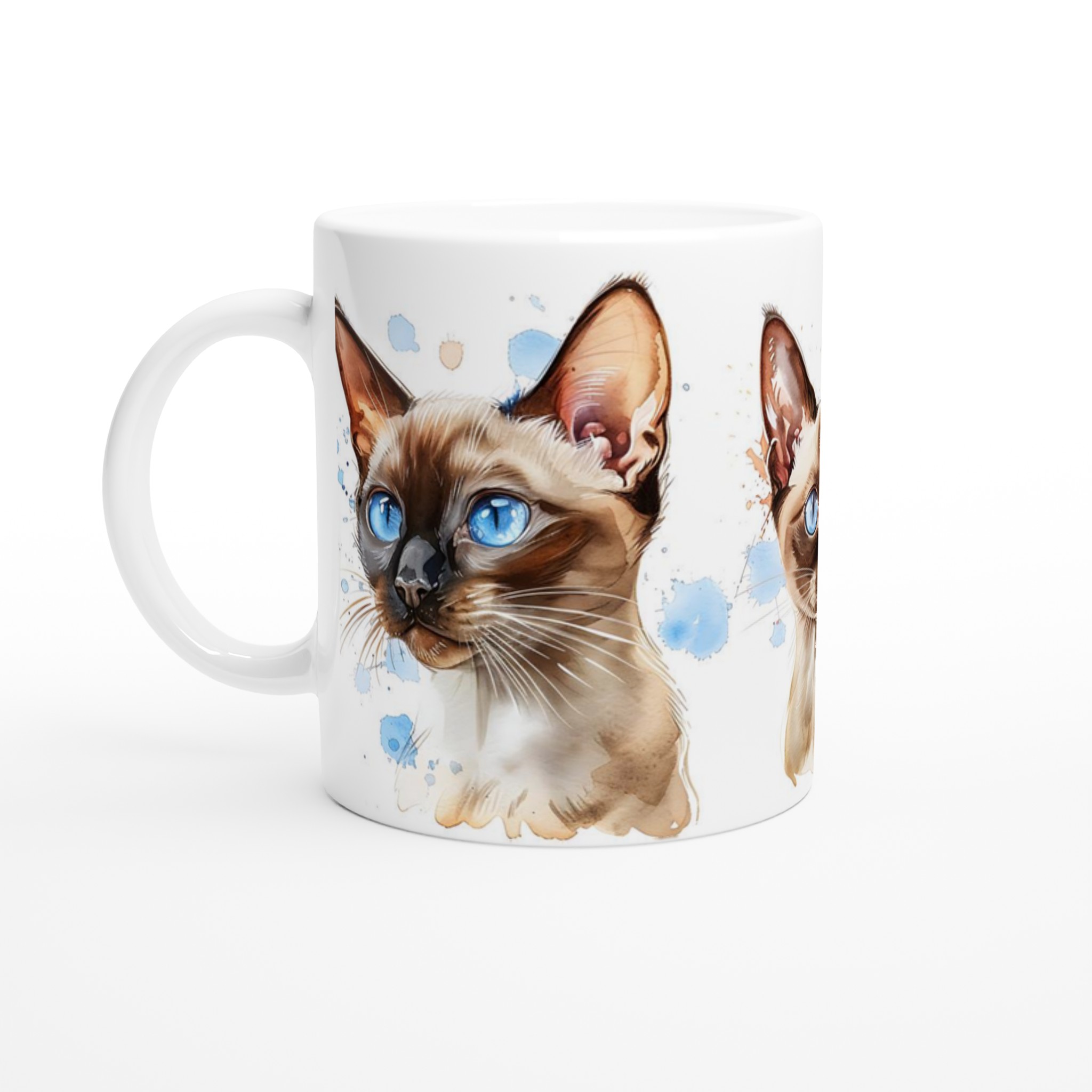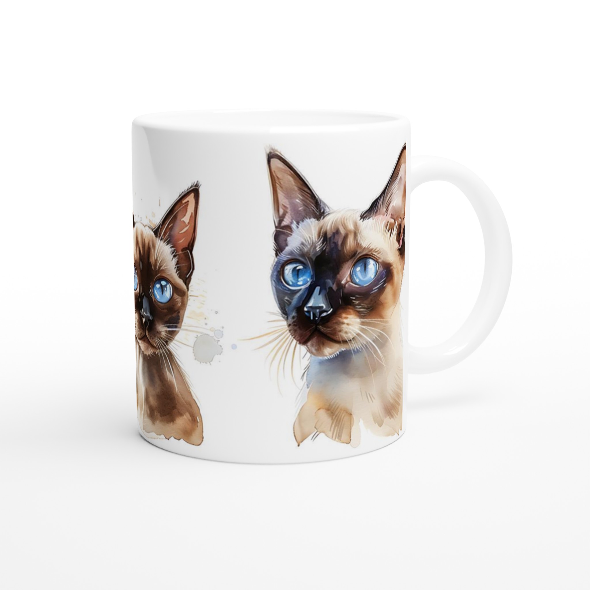 Låt dig förtrollas av de bedårande siameskatterna på denna charmiga keramiska mugg, fångade i en livfull akvarellstil med sina distinkta blå ögon och eleganta teckning. Denna stilrena keramiska mugg blir snabbt en vardagsfavorit. Perfekt för morgonkaffet, kvällens varma choklad eller när du bara vill njuta av en kopp te. Den blanka vita ytan gör att trycken framhävs med klara och levande färger, som håller sig fina även efter många turer i mikron och diskmaskinen.