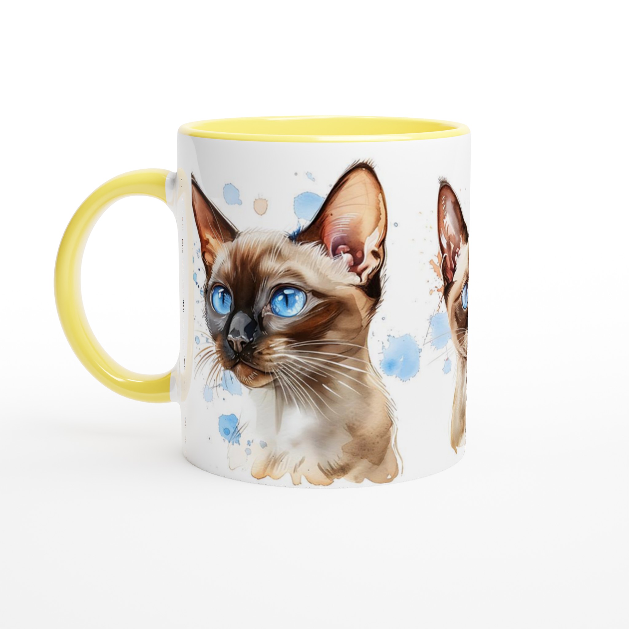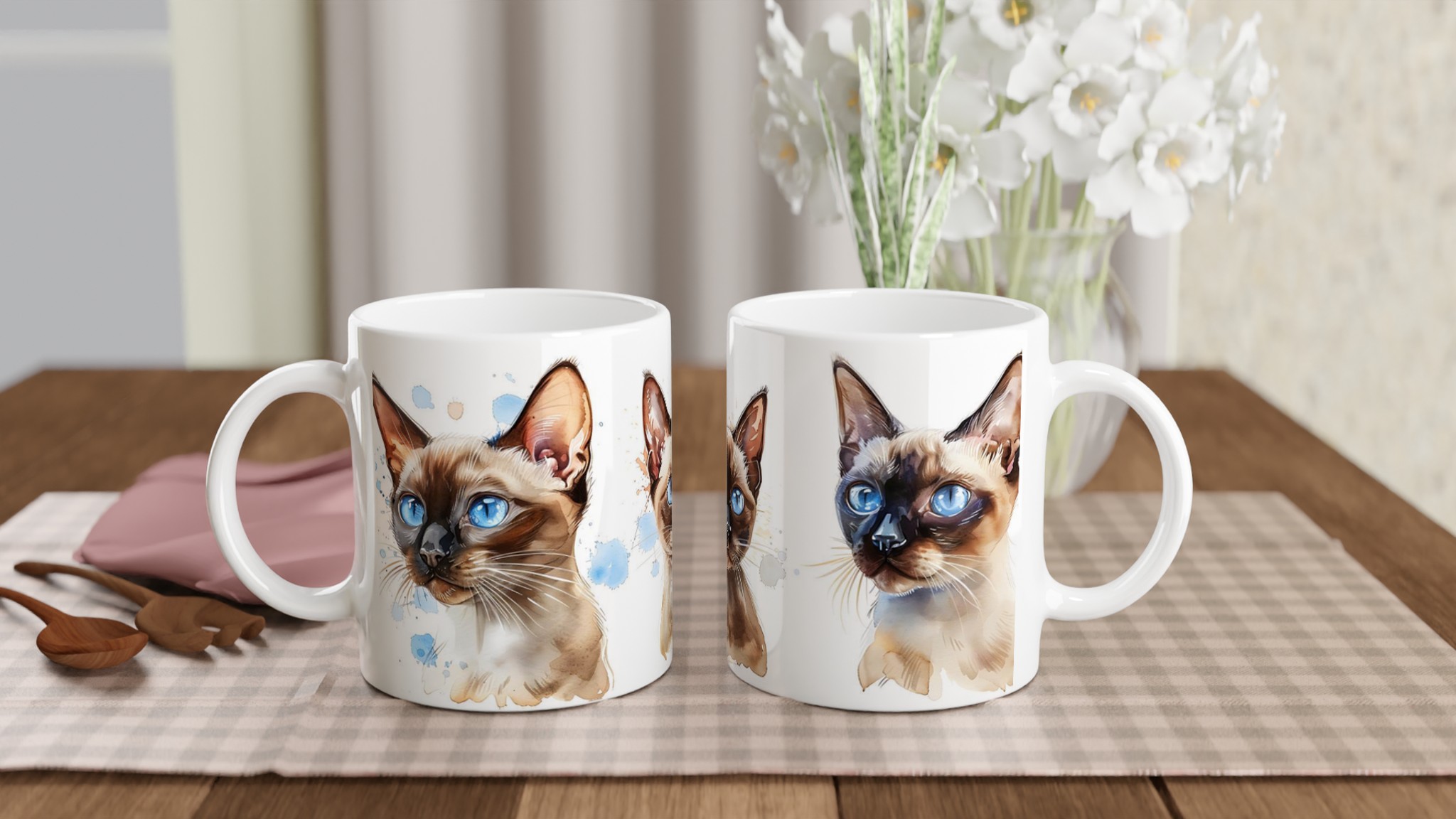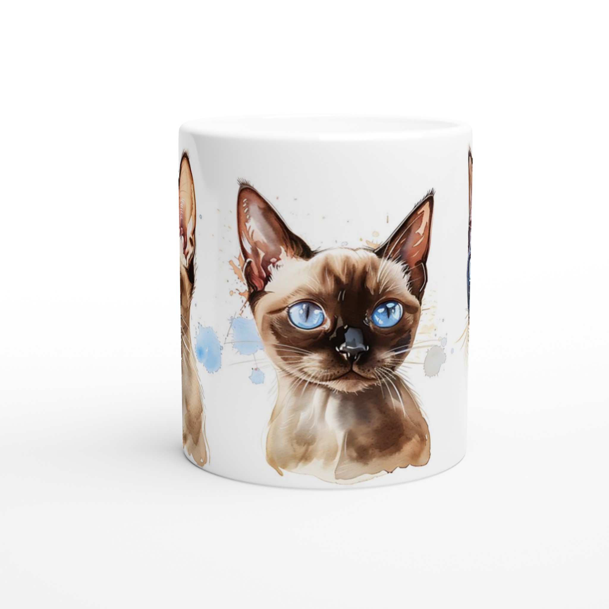 Låt dig förtrollas av de bedårande siameskatterna på denna charmiga keramiska mugg, fångade i en livfull akvarellstil med sina distinkta blå ögon och eleganta teckning. Denna stilrena keramiska mugg blir snabbt en vardagsfavorit. Perfekt för morgonkaffet, kvällens varma choklad eller när du bara vill njuta av en kopp te. Den blanka vita ytan gör att trycken framhävs med klara och levande färger, som håller sig fina även efter många turer i mikron och diskmaskinen.