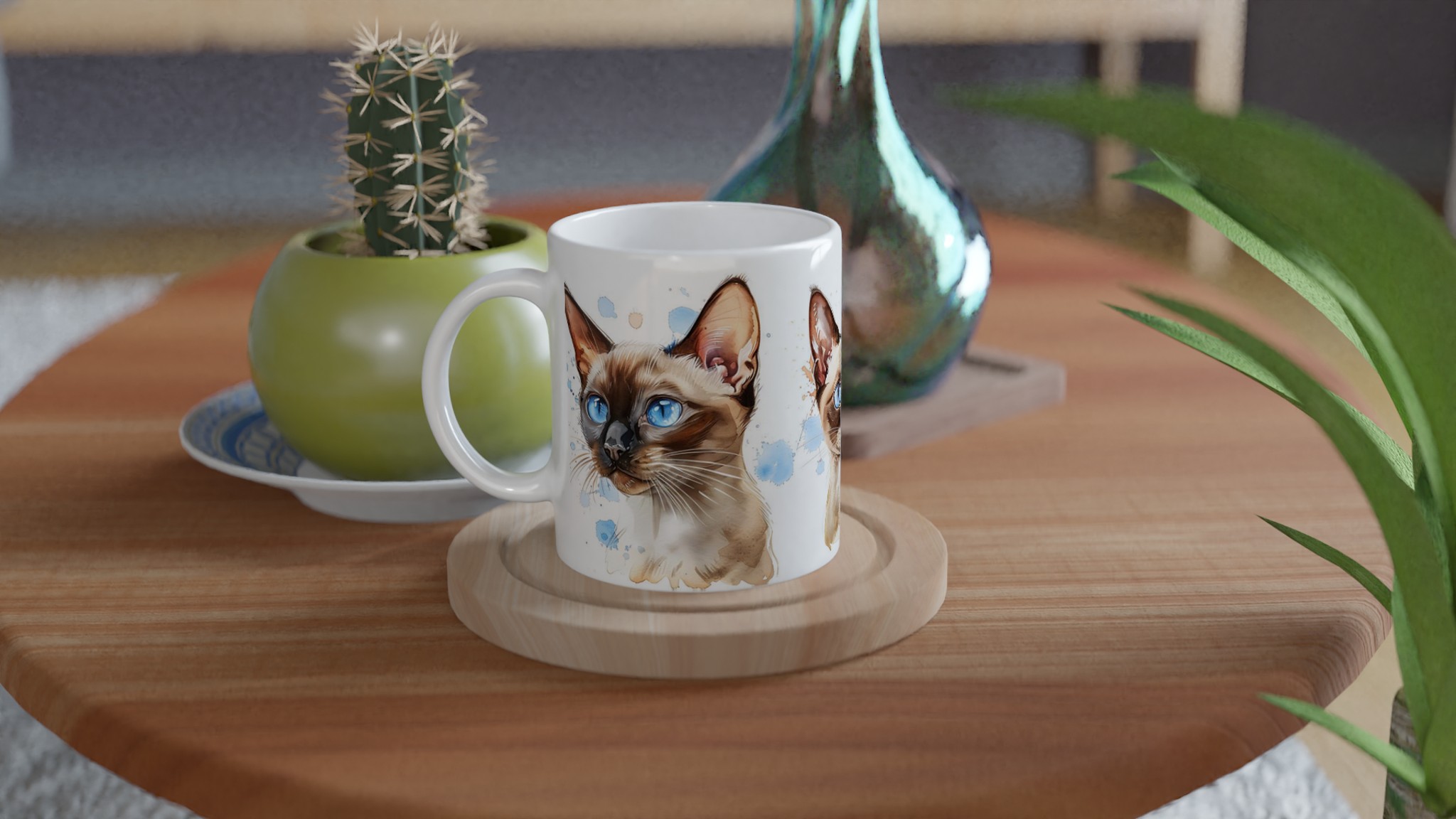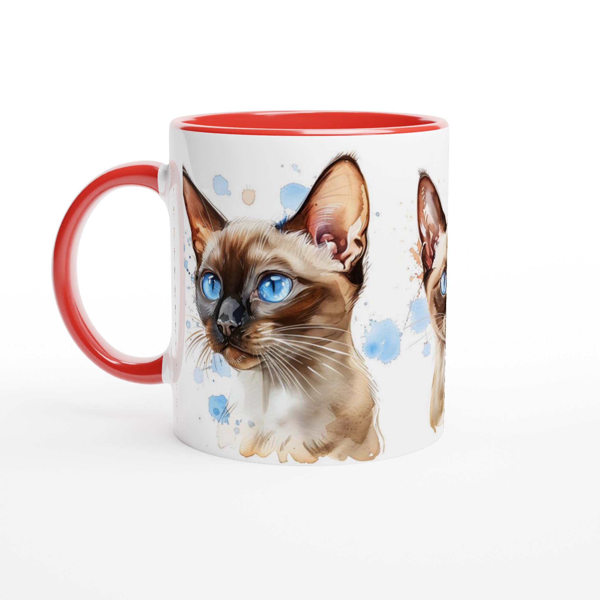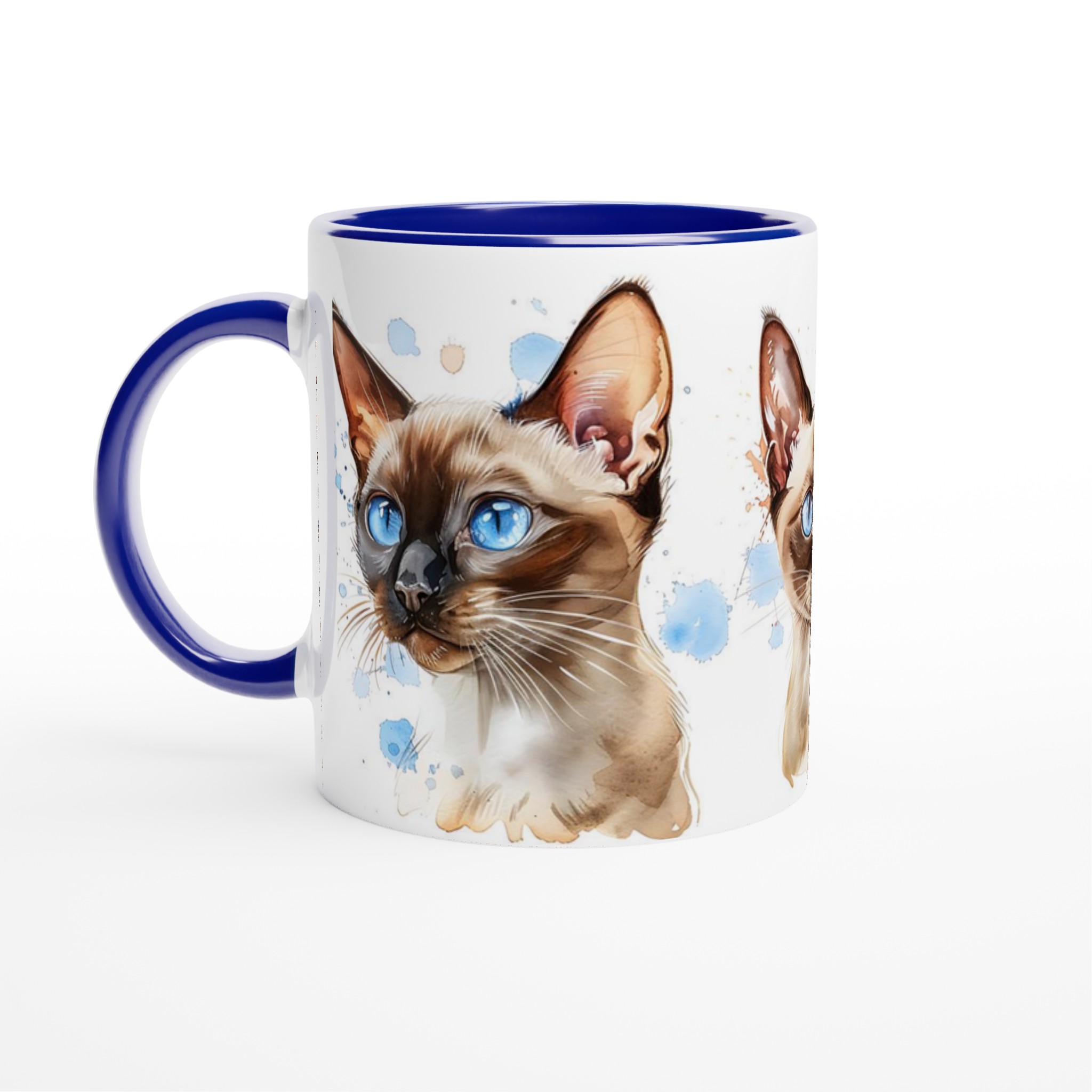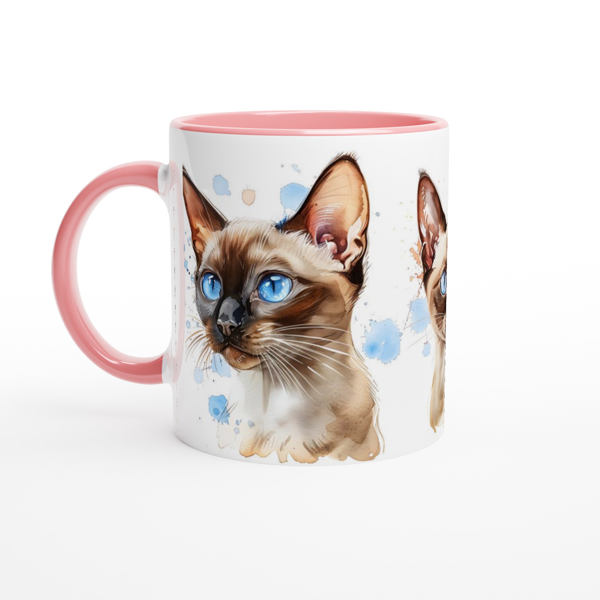 Låt dig förtrollas av de bedårande siameskatterna på denna charmiga keramiska mugg, fångade i en livfull akvarellstil med sina distinkta blå ögon och eleganta teckning. Denna stilrena keramiska mugg blir snabbt en vardagsfavorit. Perfekt för morgonkaffet, kvällens varma choklad eller när du bara vill njuta av en kopp te. Den blanka vita ytan gör att trycken framhävs med klara och levande färger, som håller sig fina även efter många turer i mikron och diskmaskinen.
