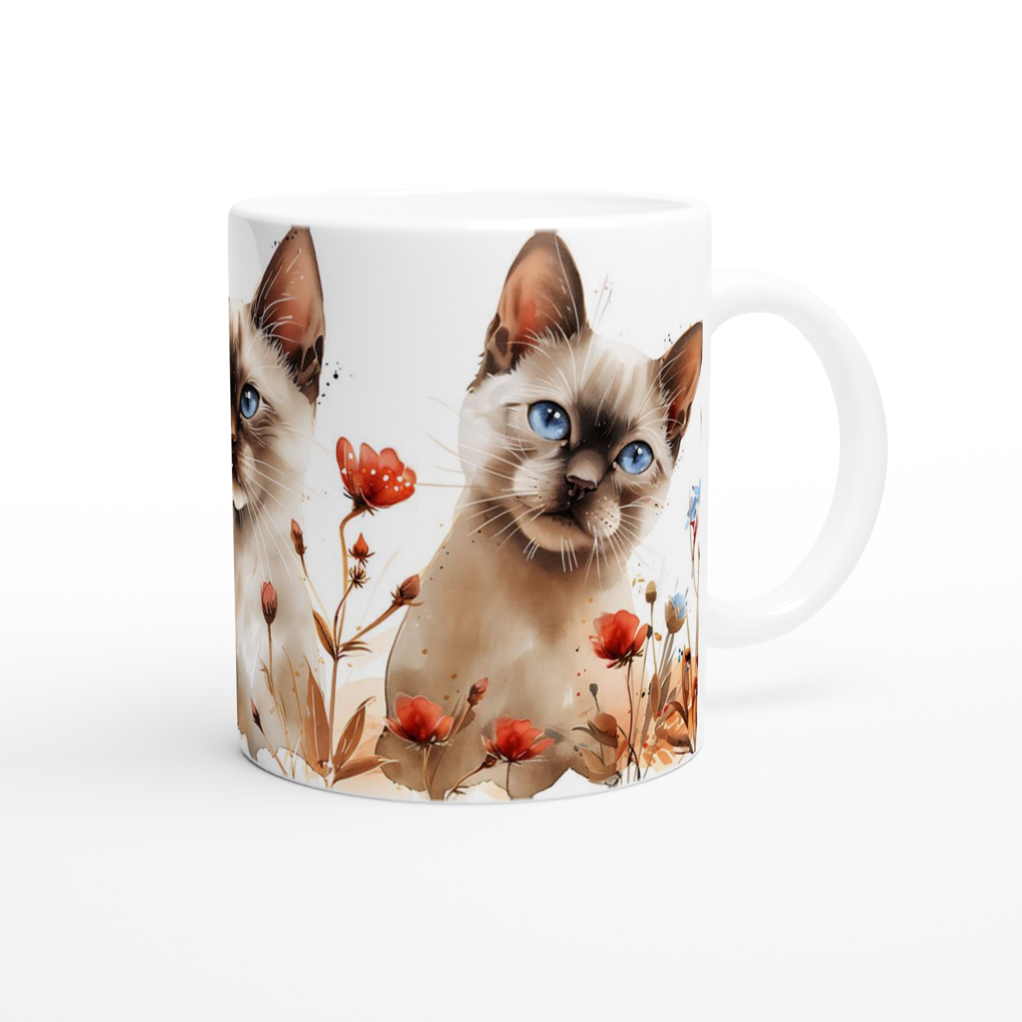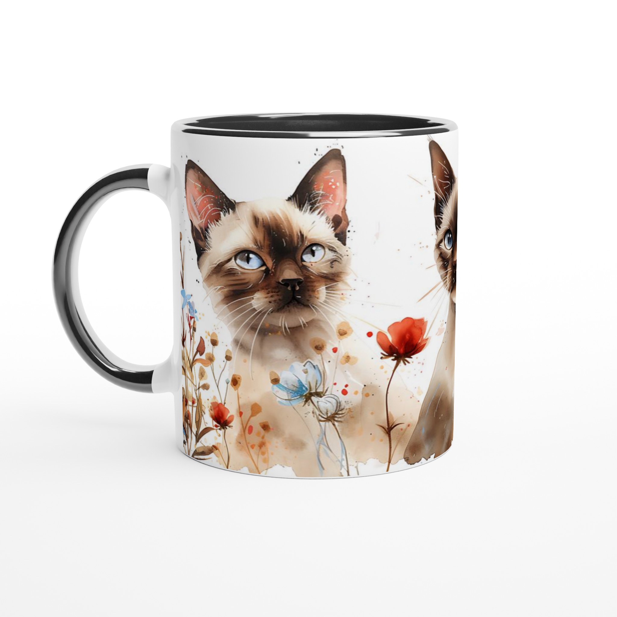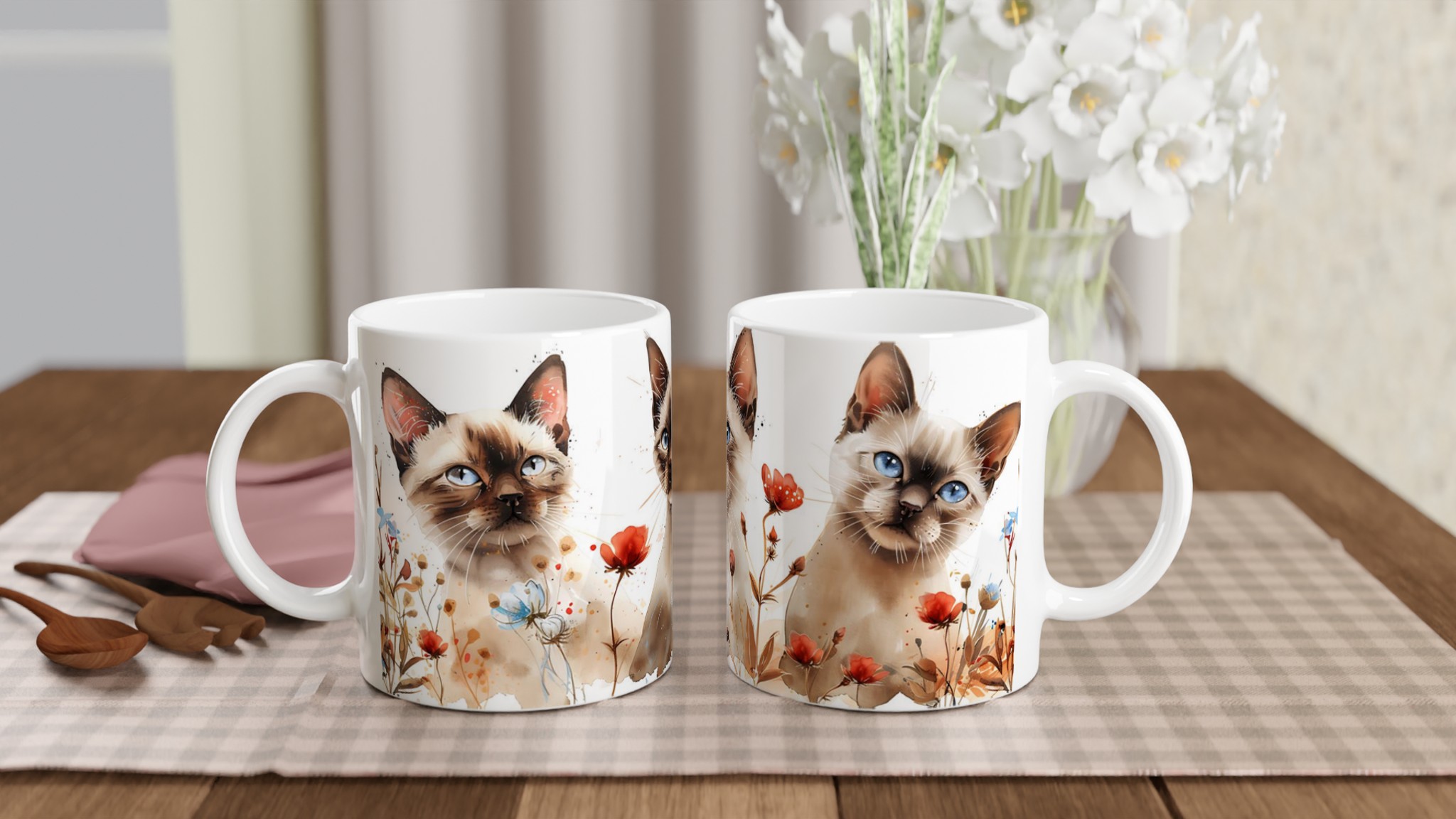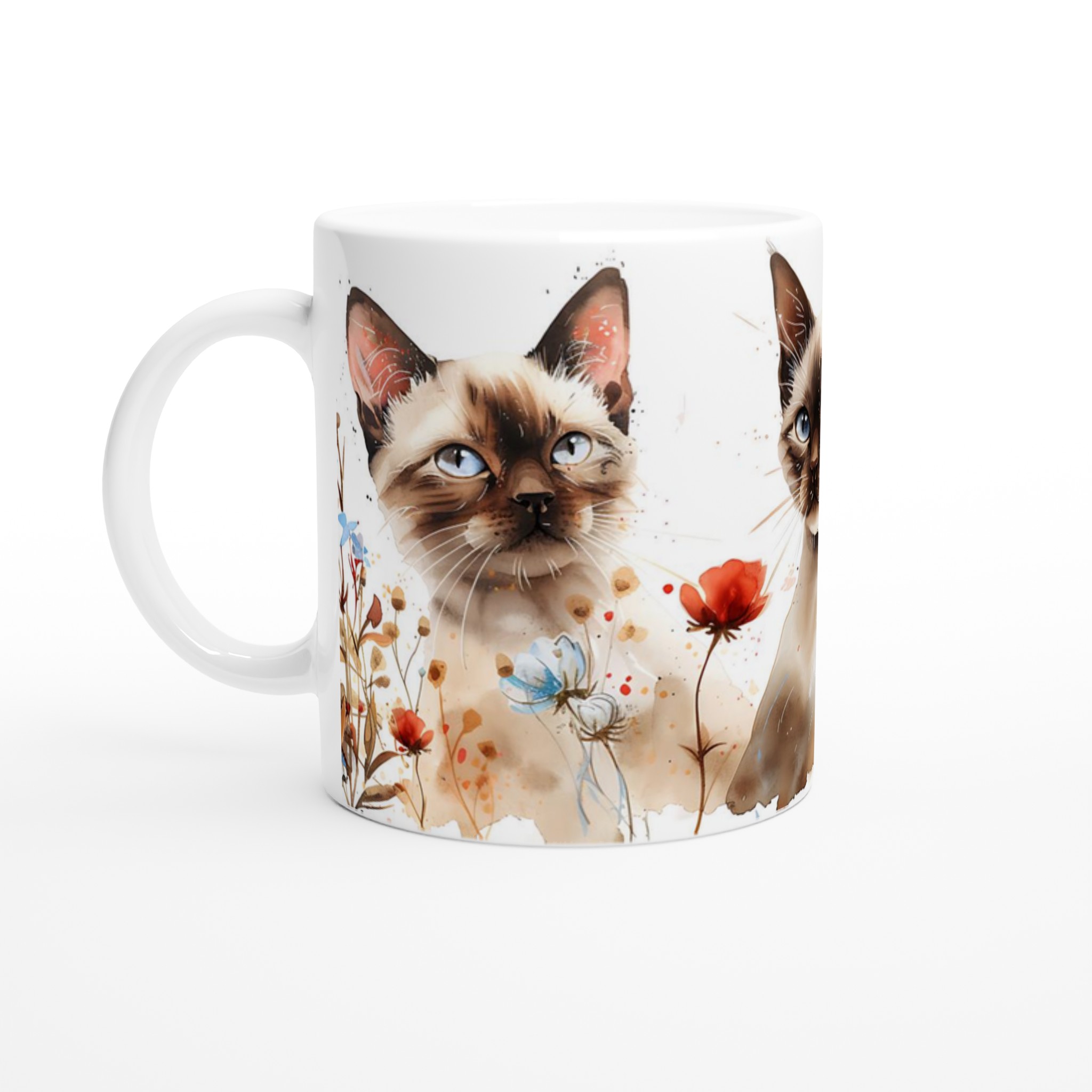 Siamkattsdrömmar: Keramisk Mugg – Konstnärlig Akvarell med Charmiga Katter & Blommor
