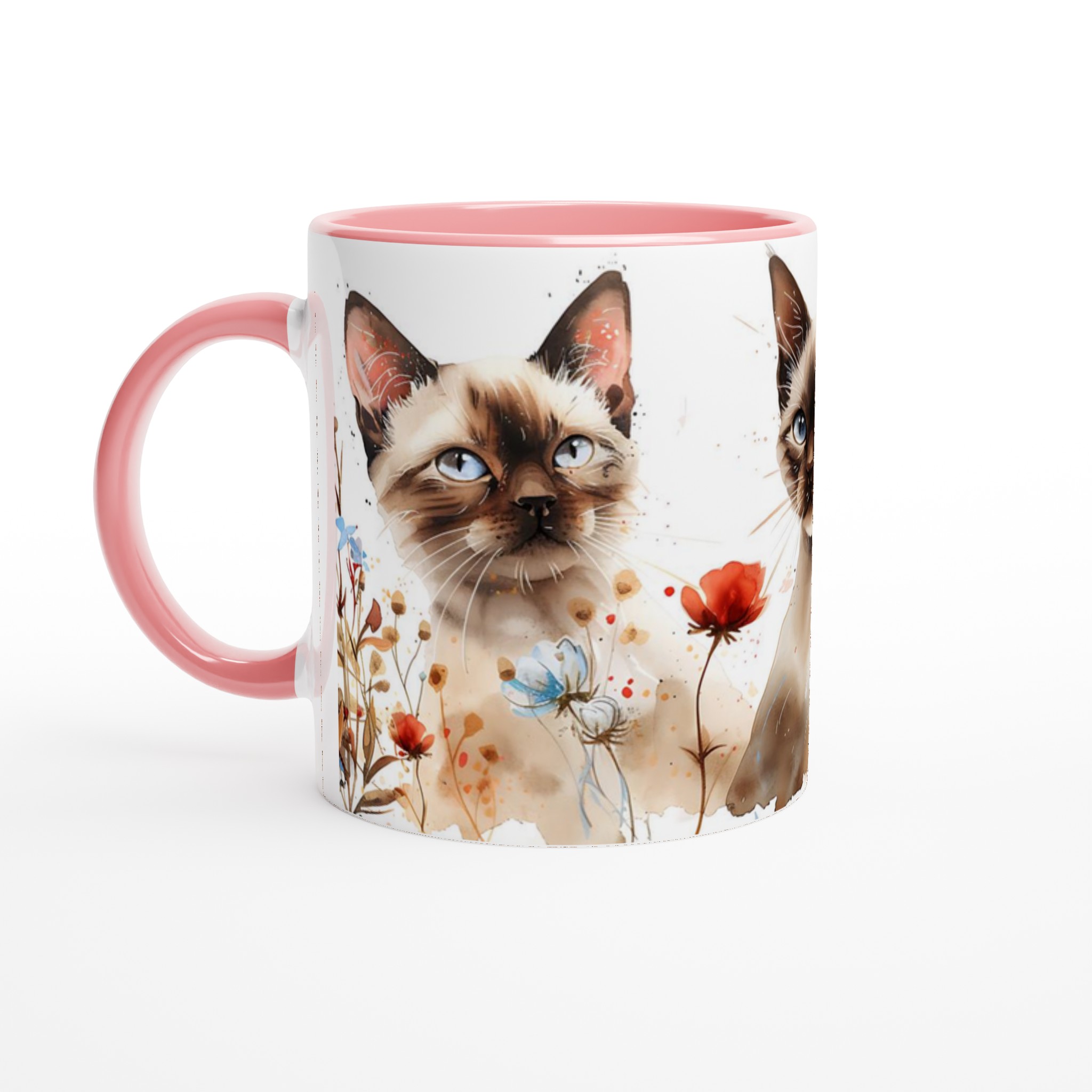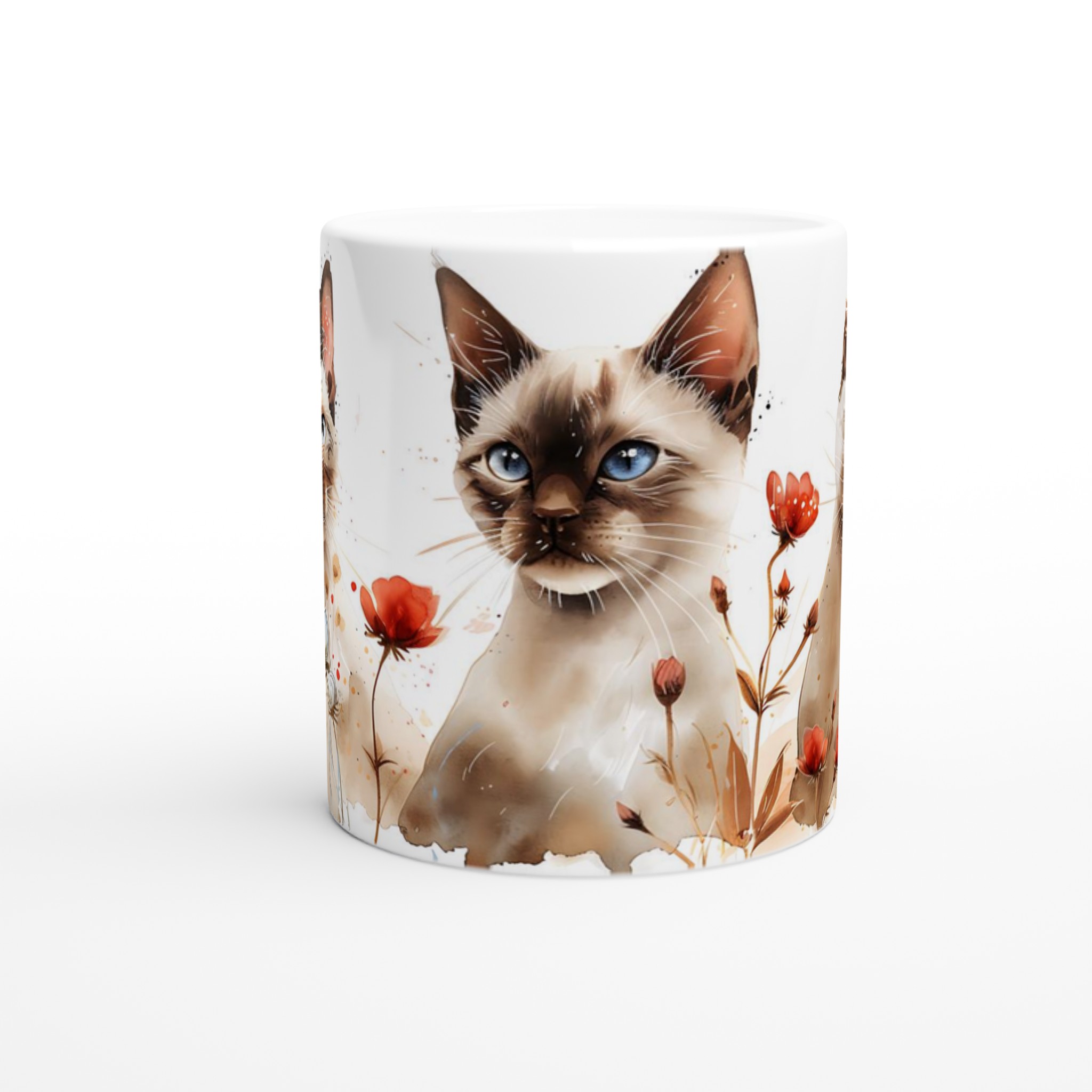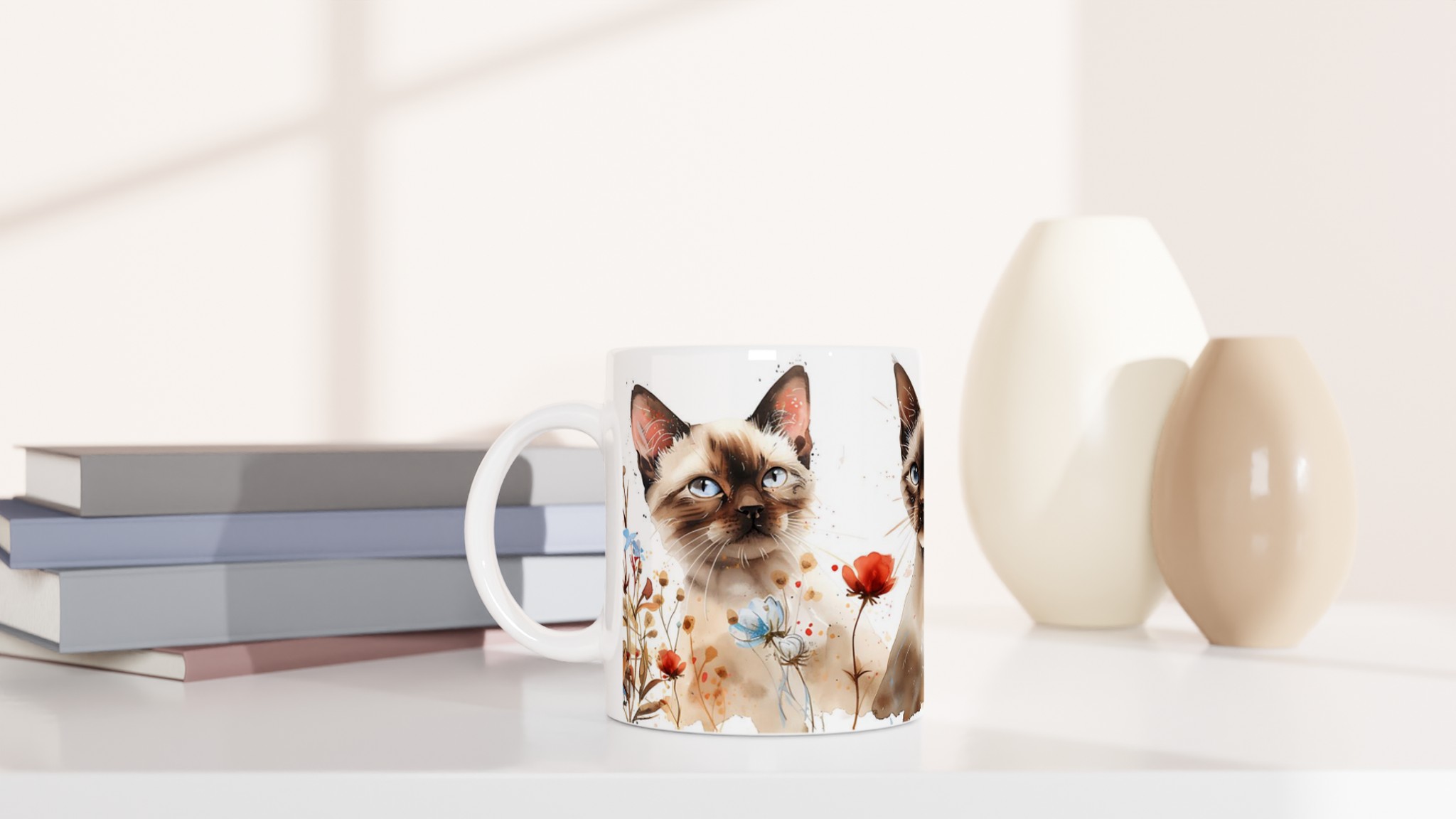 Siamkattsdrömmar: Keramisk Mugg – Konstnärlig Akvarell med Charmiga Katter & Blommor
