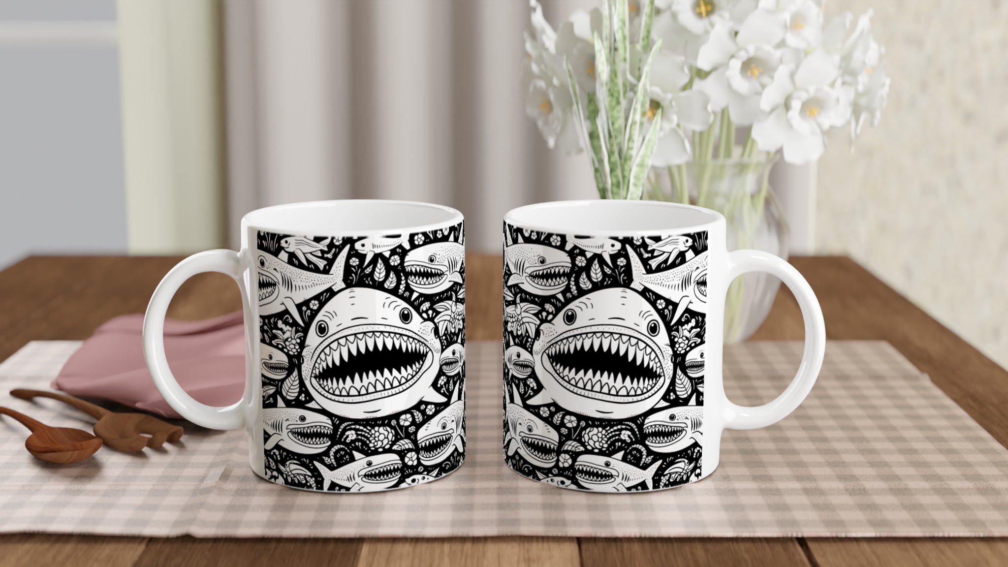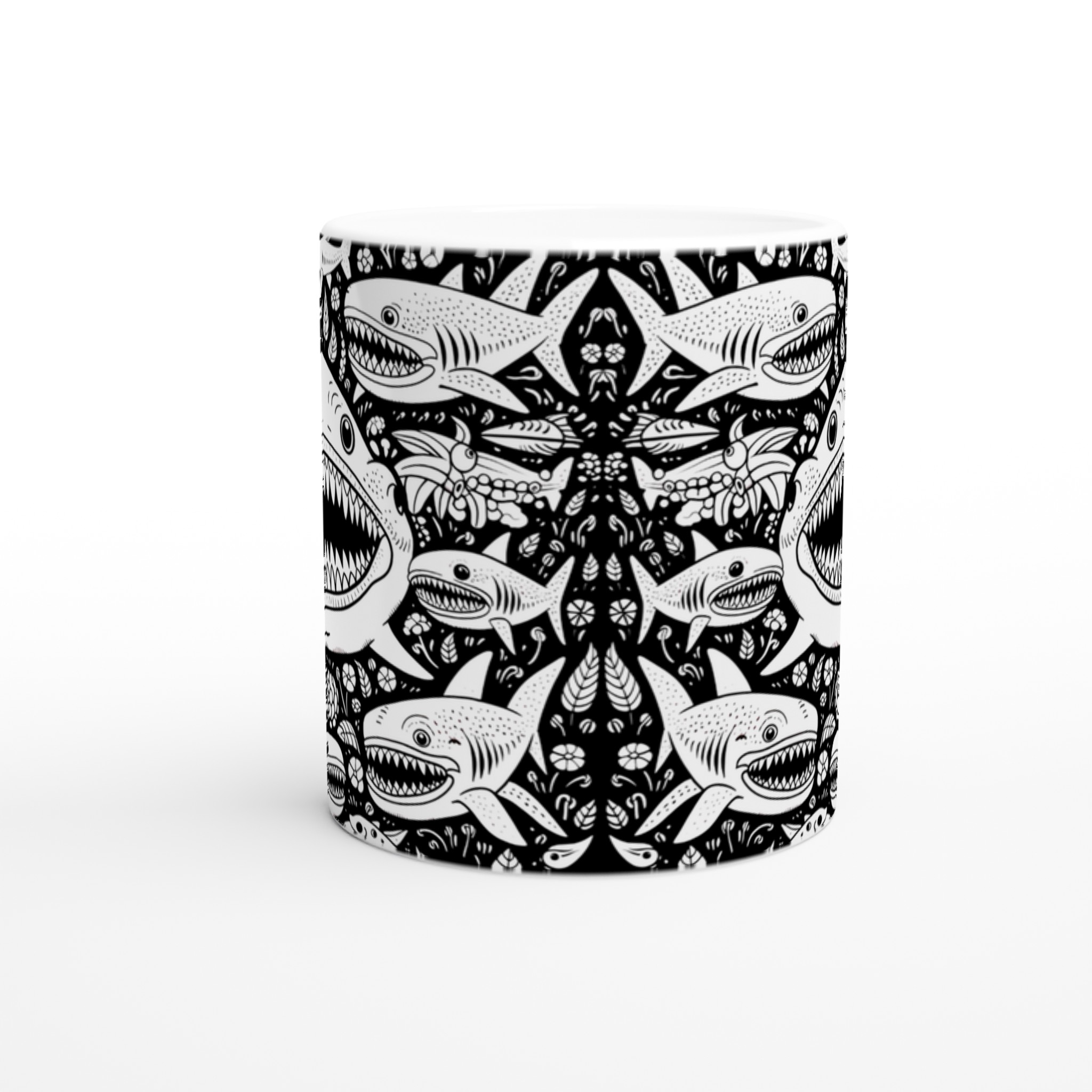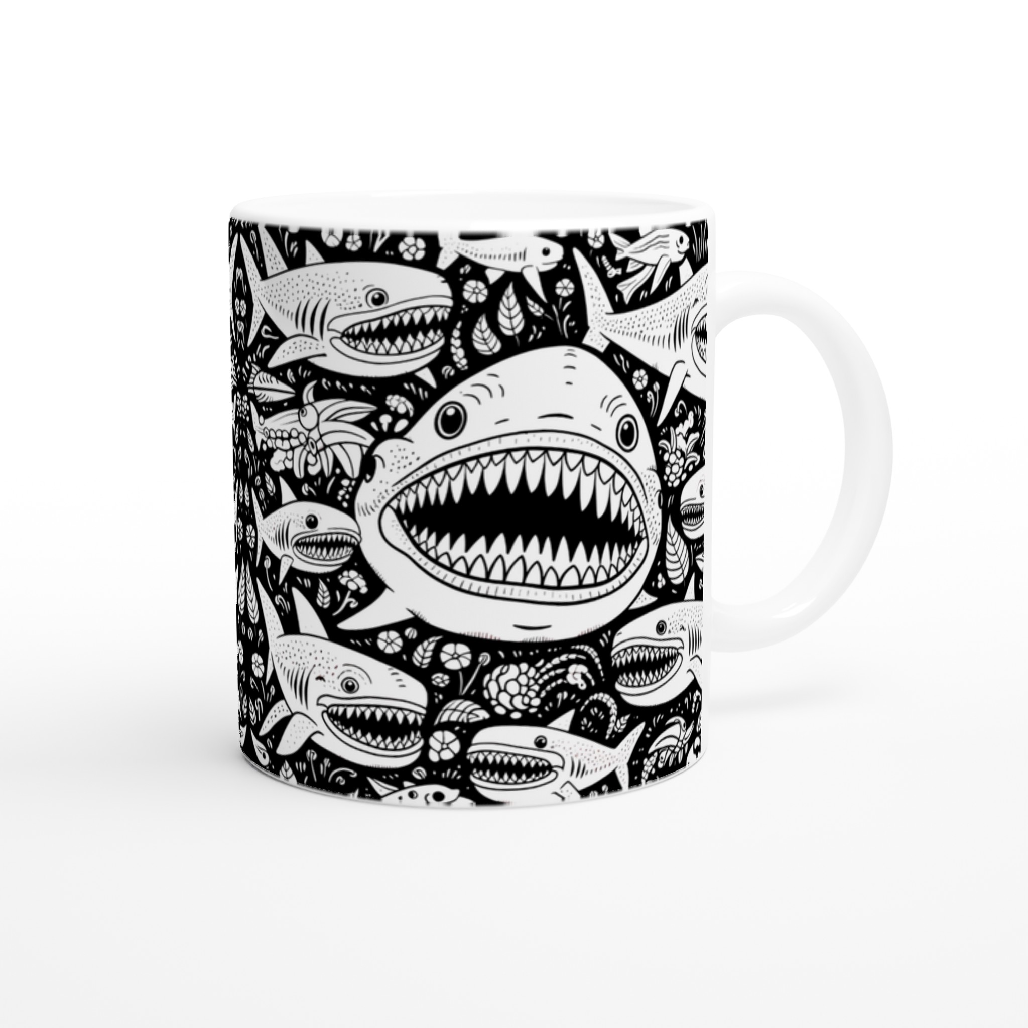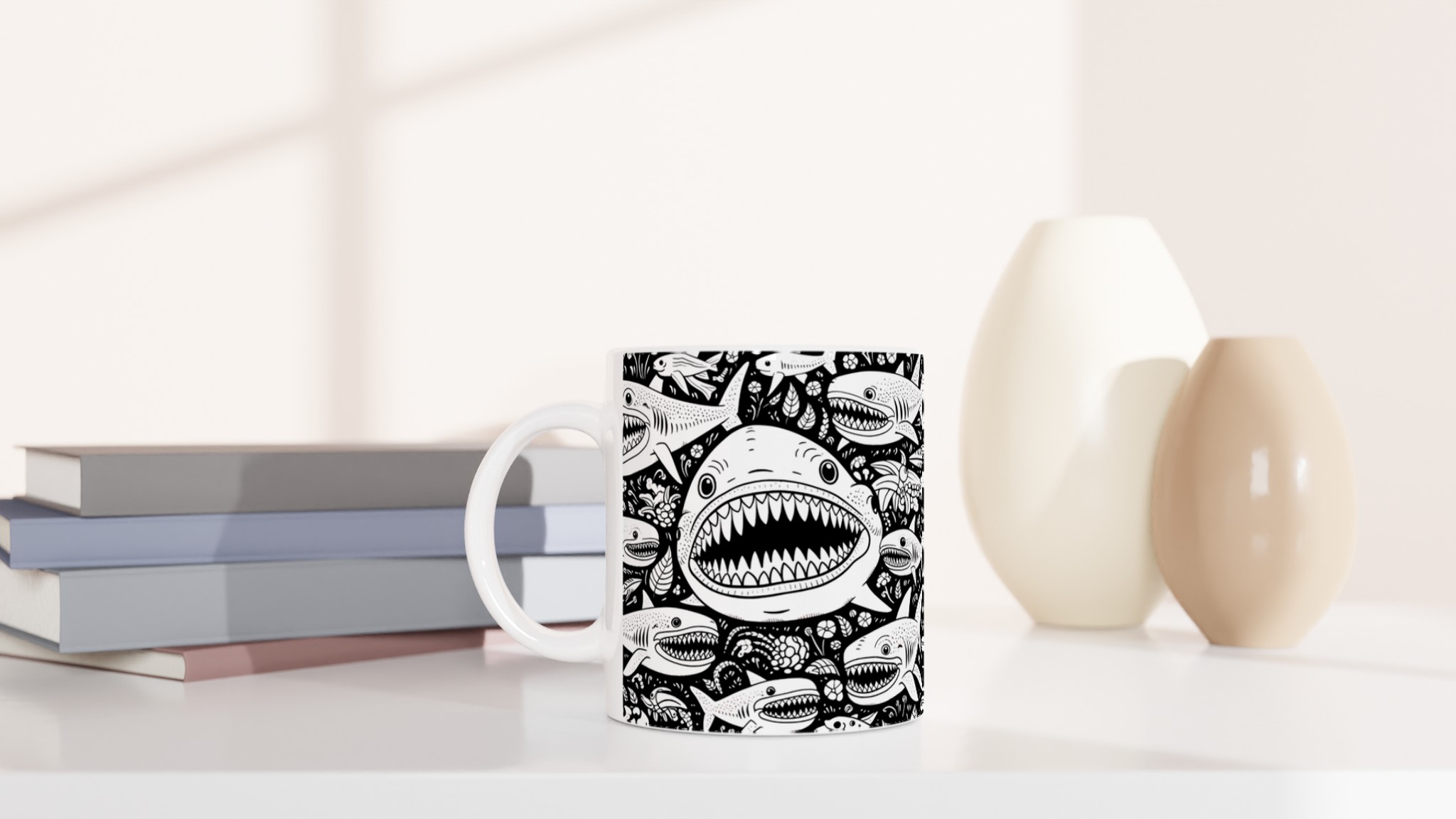 Vågar du ta en klunk? Denna unika keramiska mugg med sitt djärva svartvita mönster av skräckhajar och lekfulla havsväxter är allt annat än alldaglig. Perfekt för morgonkaffet när du vill väcka sinnena, kvällens varma choklad som en isbrytare, eller när du bara vill njuta av en kopp te med en dos personlighet. Den högkvalitativa tryckytan framhäver de detaljerade illustrationerna med klara och levande färger, som håller sig fina även efter många turer i mikron och diskmaskinen – precis som du förväntar dig.