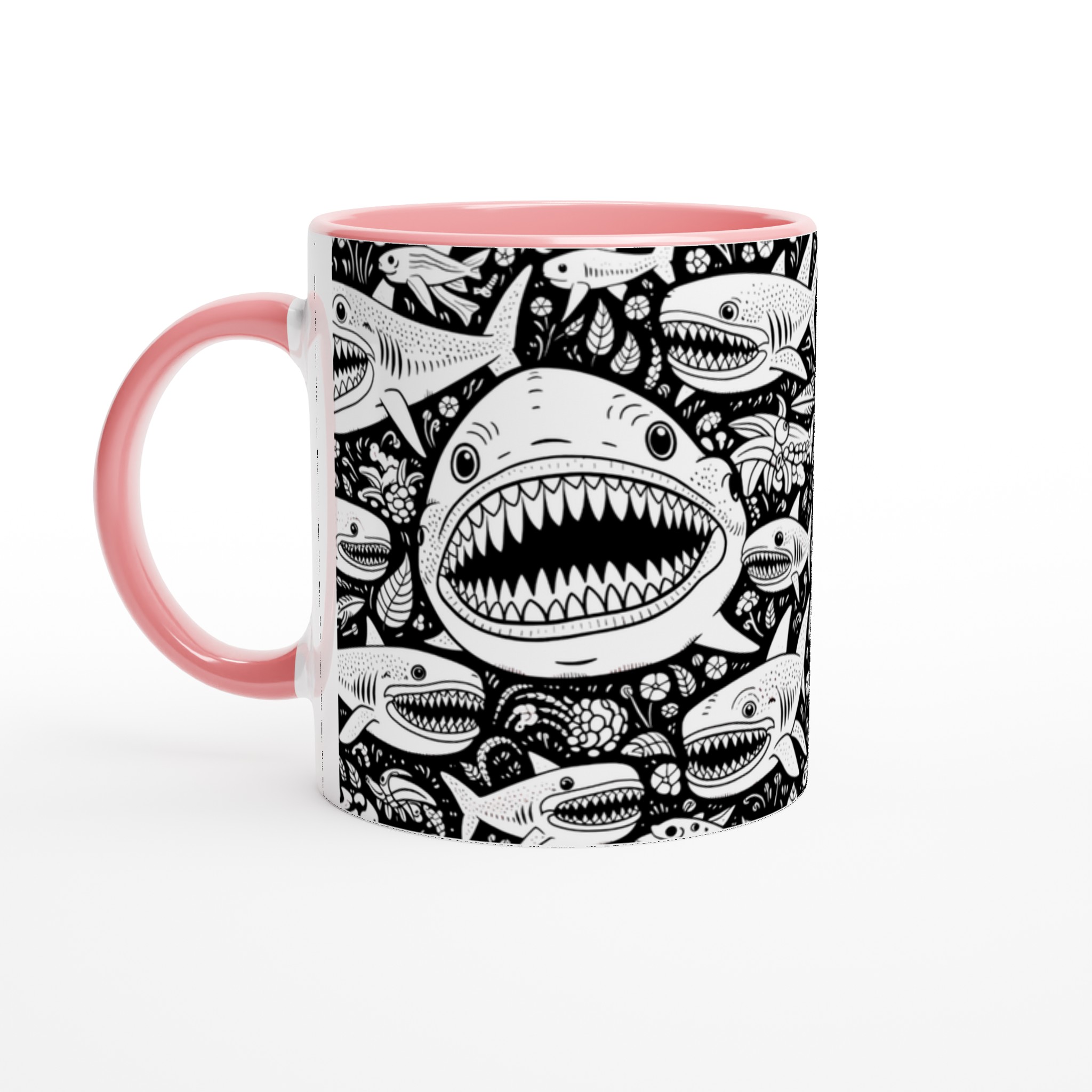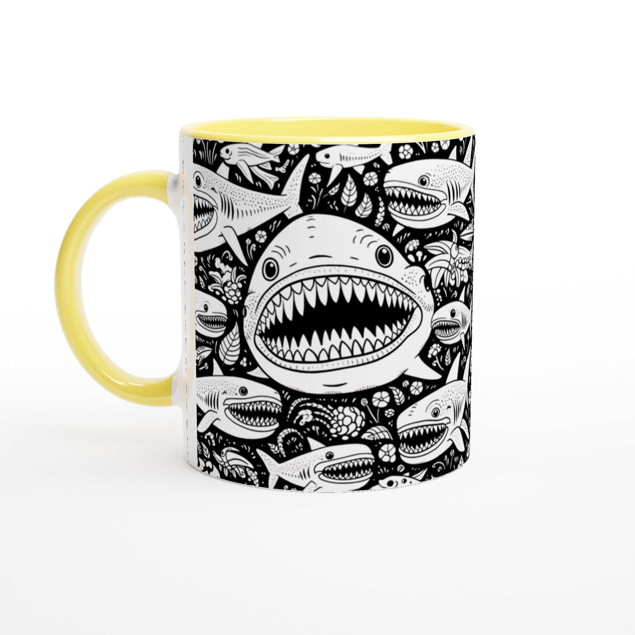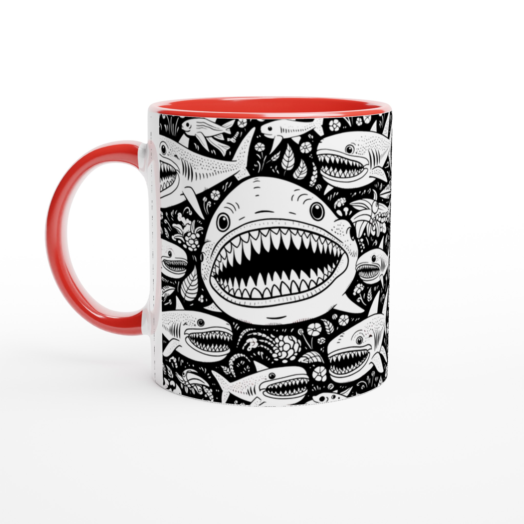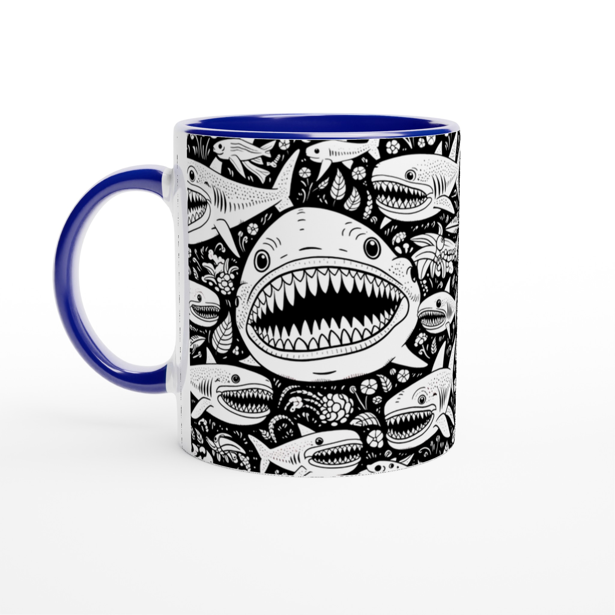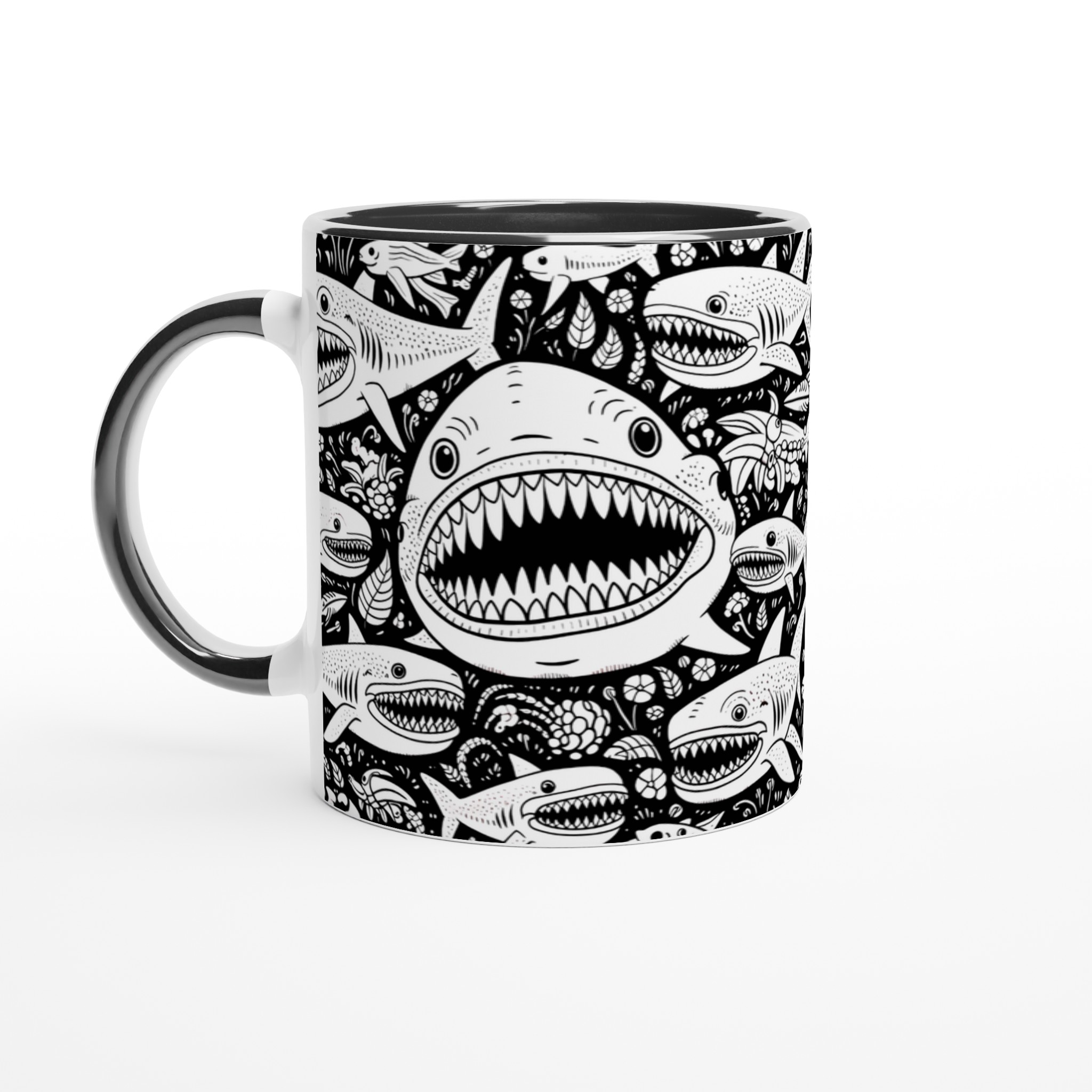Vågar du ta en klunk? Denna unika keramiska mugg med sitt djärva svartvita mönster av skräckhajar och lekfulla havsväxter är allt annat än alldaglig. Perfekt för morgonkaffet när du vill väcka sinnena, kvällens varma choklad som en isbrytare, eller när du bara vill njuta av en kopp te med en dos personlighet. Den högkvalitativa tryckytan framhäver de detaljerade illustrationerna med klara och levande färger, som håller sig fina även efter många turer i mikron och diskmaskinen – precis som du förväntar dig.