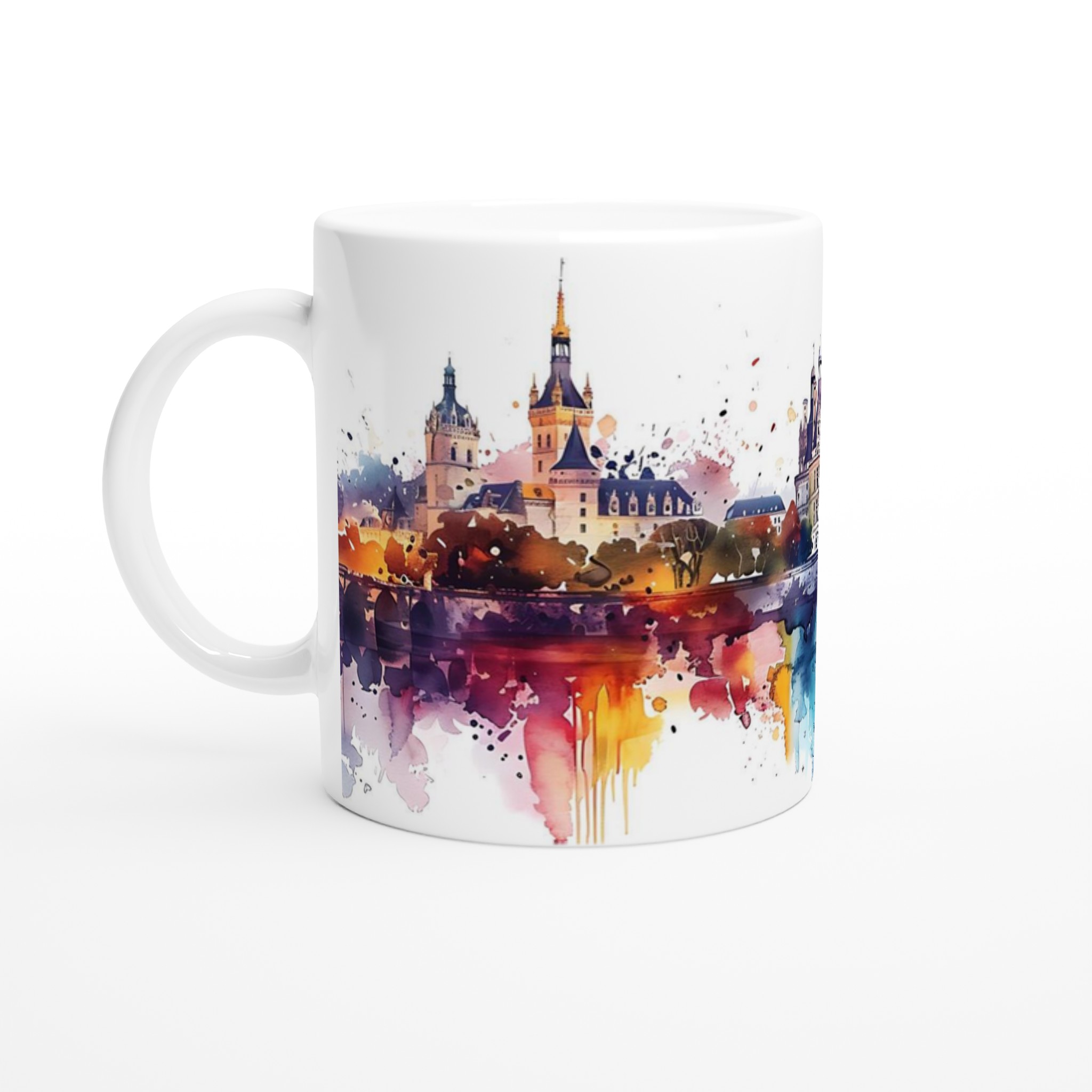 Inspirerad av den drömlika skönheten hos historiska slott, fångar denna mugg en majestätisk silhuett återskapad i en levande akvarellstil. De färgstarka stänken och de mjuka övergångarna ger en konstnärlig touch som förvandlar varje sip till en stunds avkoppling och inspiration.