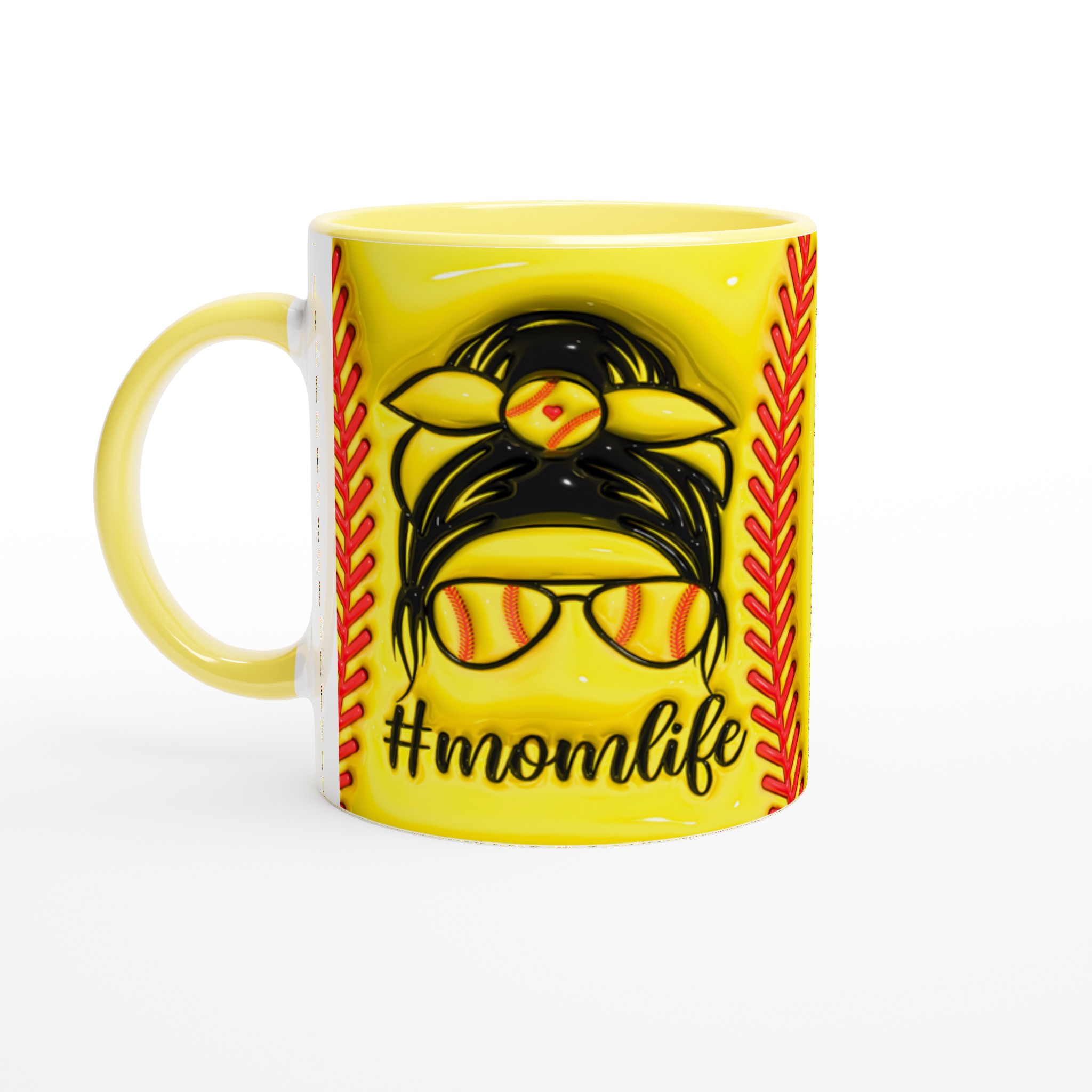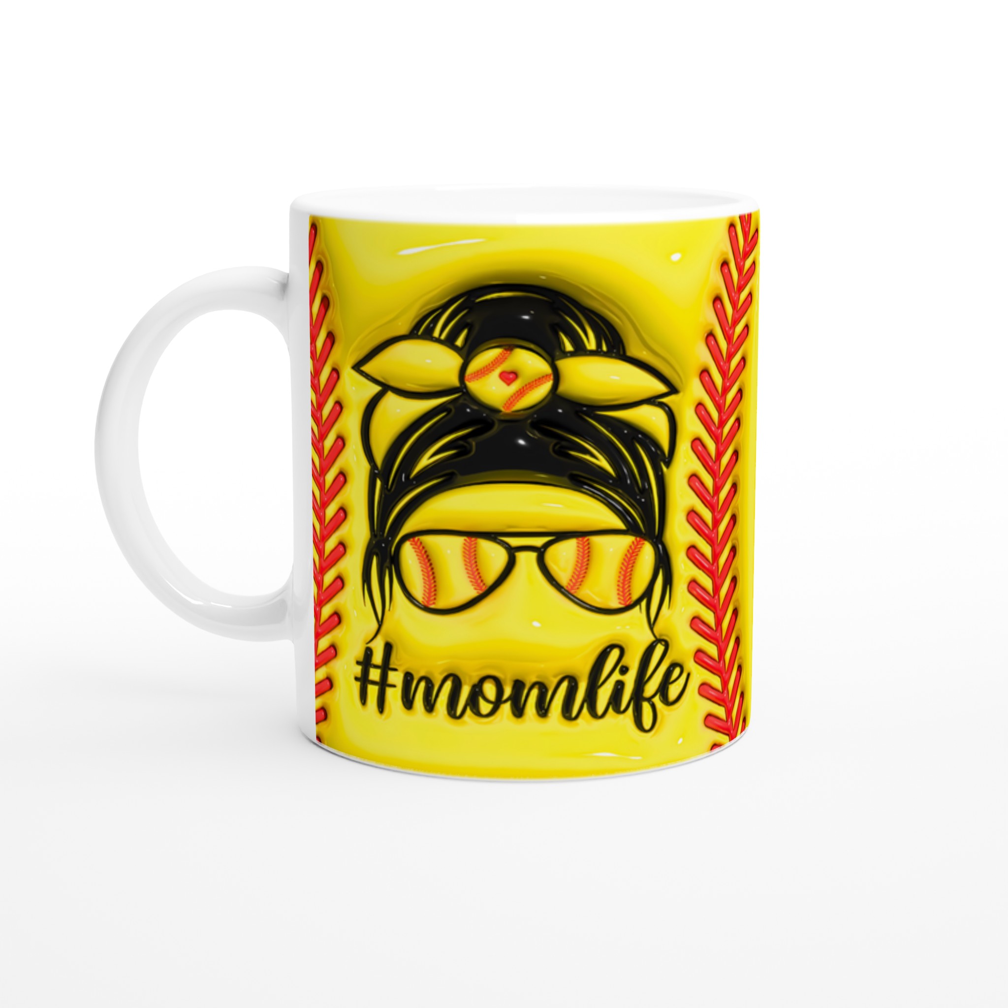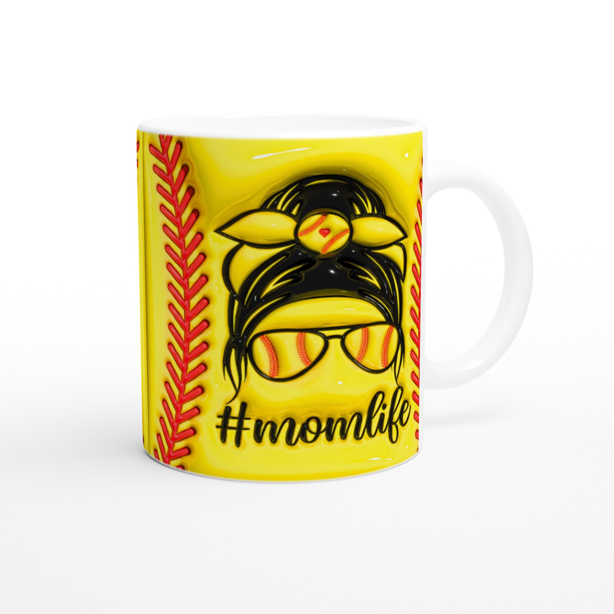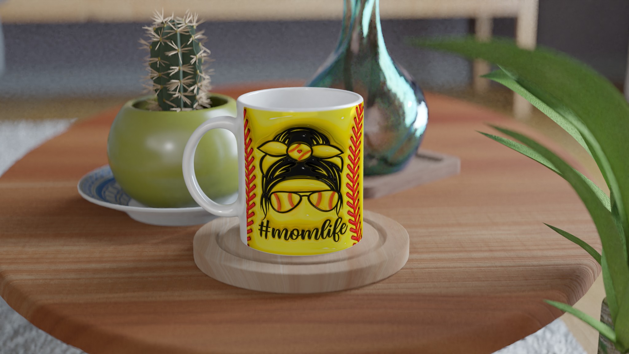 Fira din #Momlife med stolthet och stil! Den här keramikmuggen är en hyllning till alla softball-mammor, med en rolig bulle-frisyr, solglasögon med baseboll-detaljer och en sportig sömdesign. Den levande gula färgen med röda accenter kommer att förgylla varje morgon eller sena kväll på läktaren.