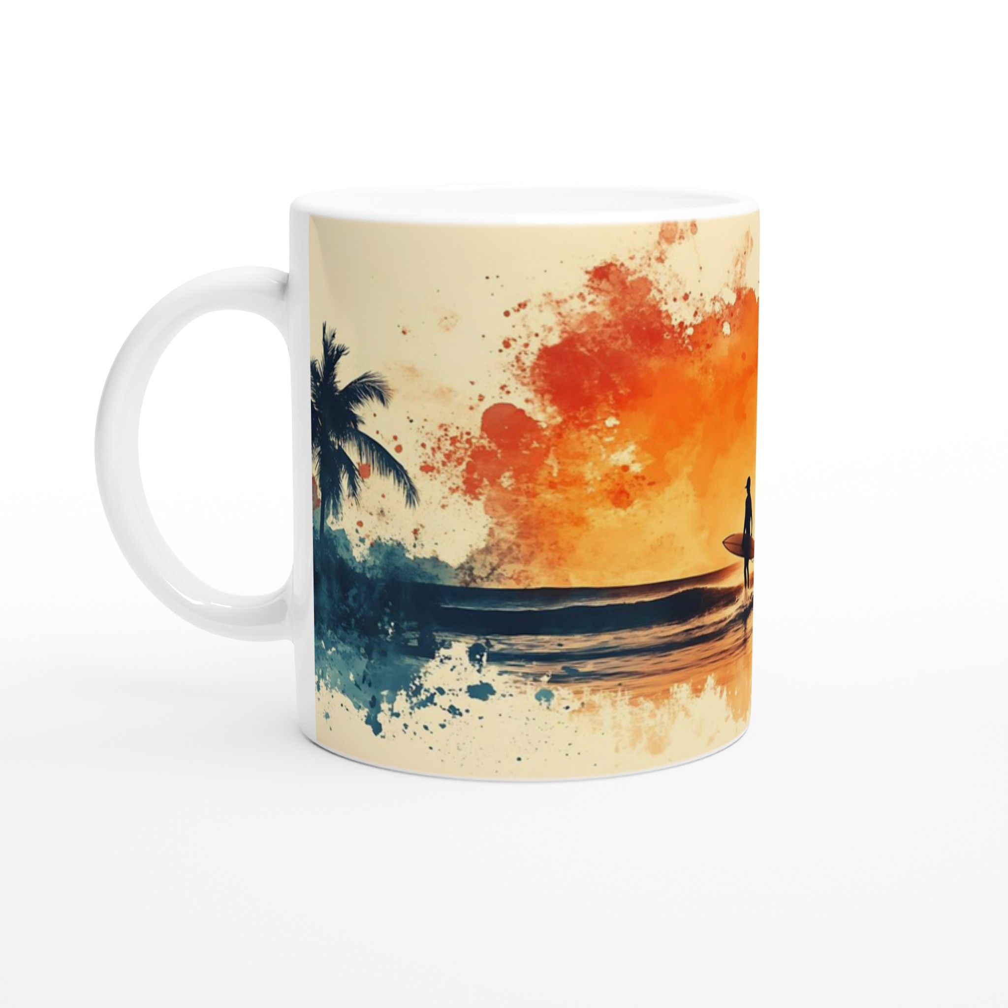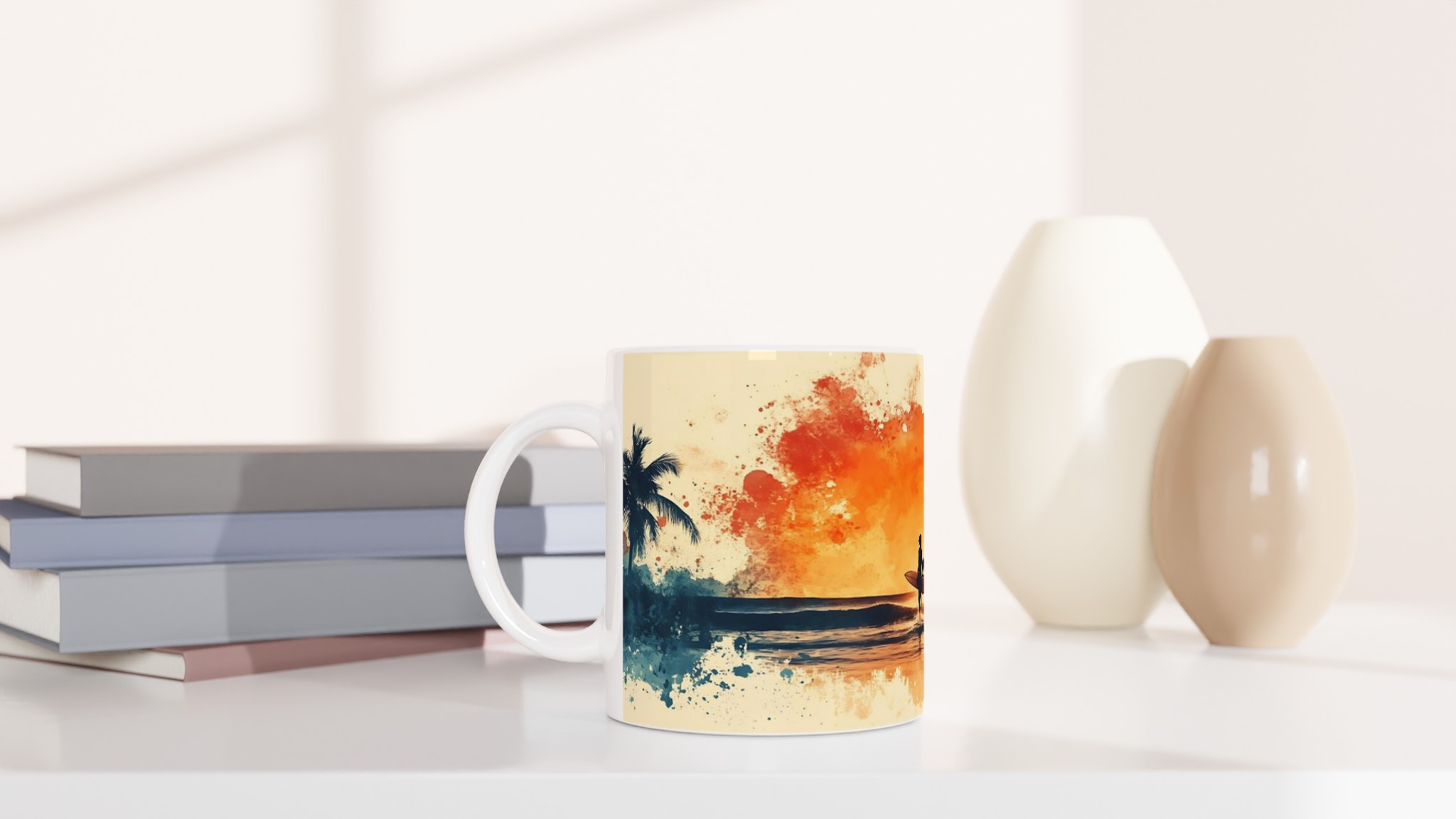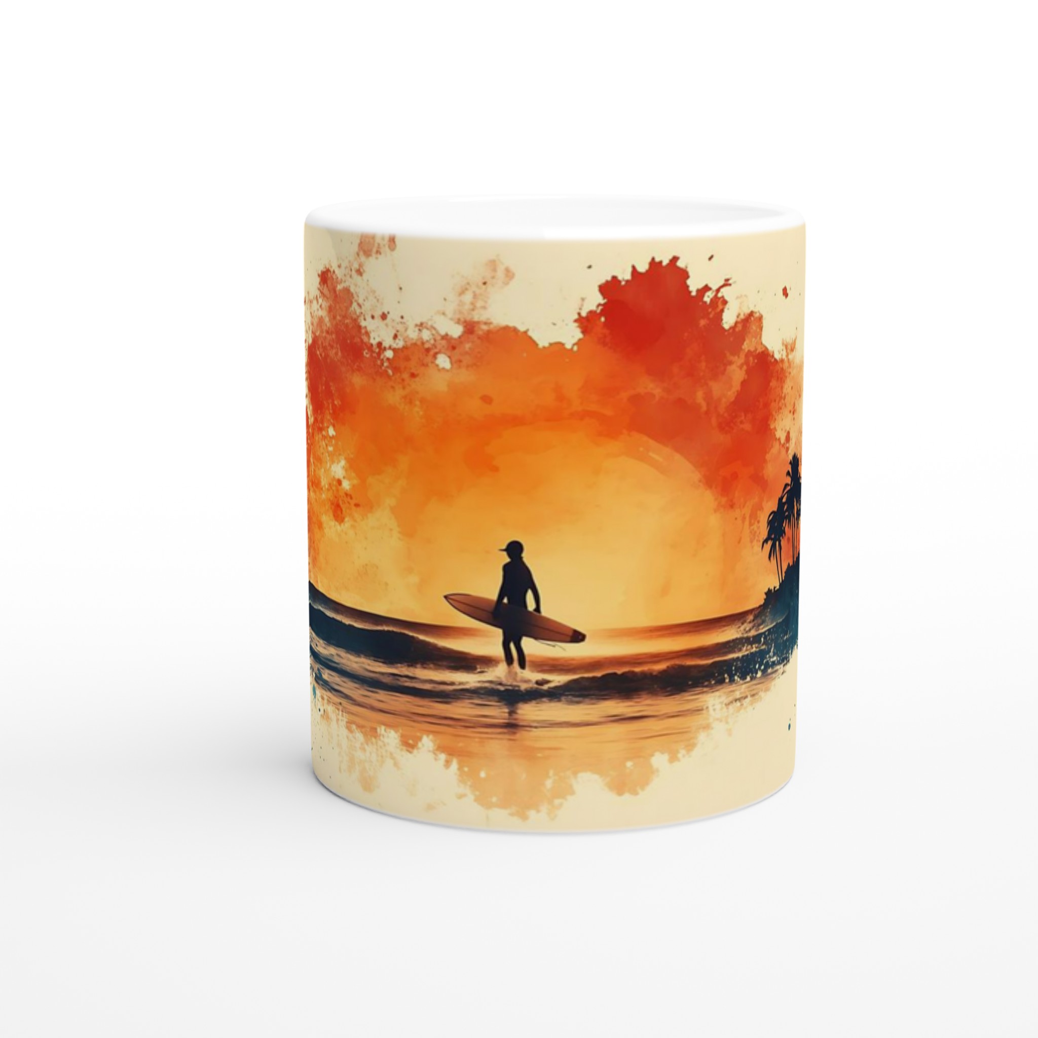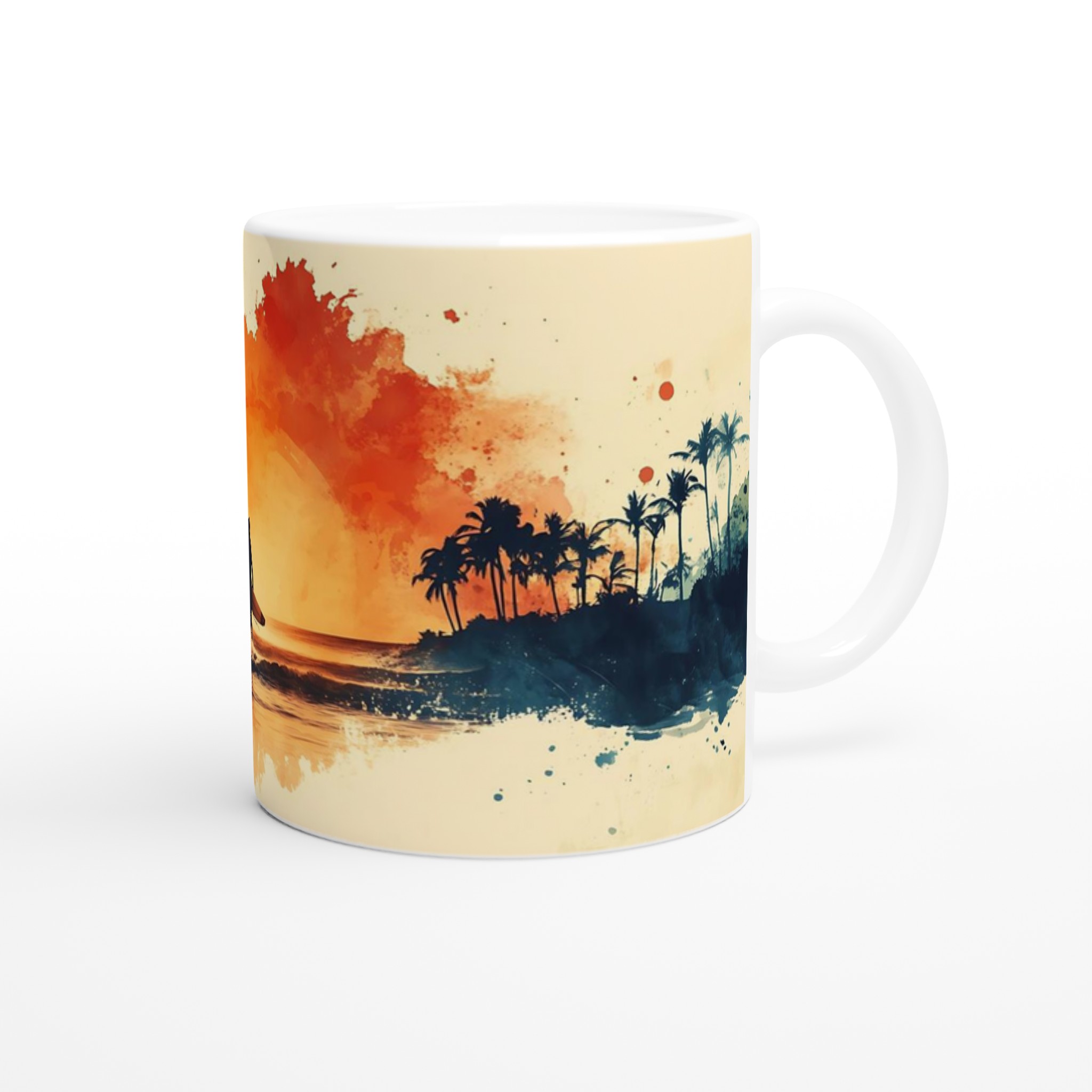 Inspirerad av lugnet från en tropisk solnedgång och spänningen hos en ensam surfare, kommer denna mugg att transportera dig till din favoritstrand med varje klunk. Den blanka vita ytan ger ett skarpt och levande tryck som verkligen sticker ut, oavsett om det är en personlig design, ett roligt citat eller en present till någon du tycker om.