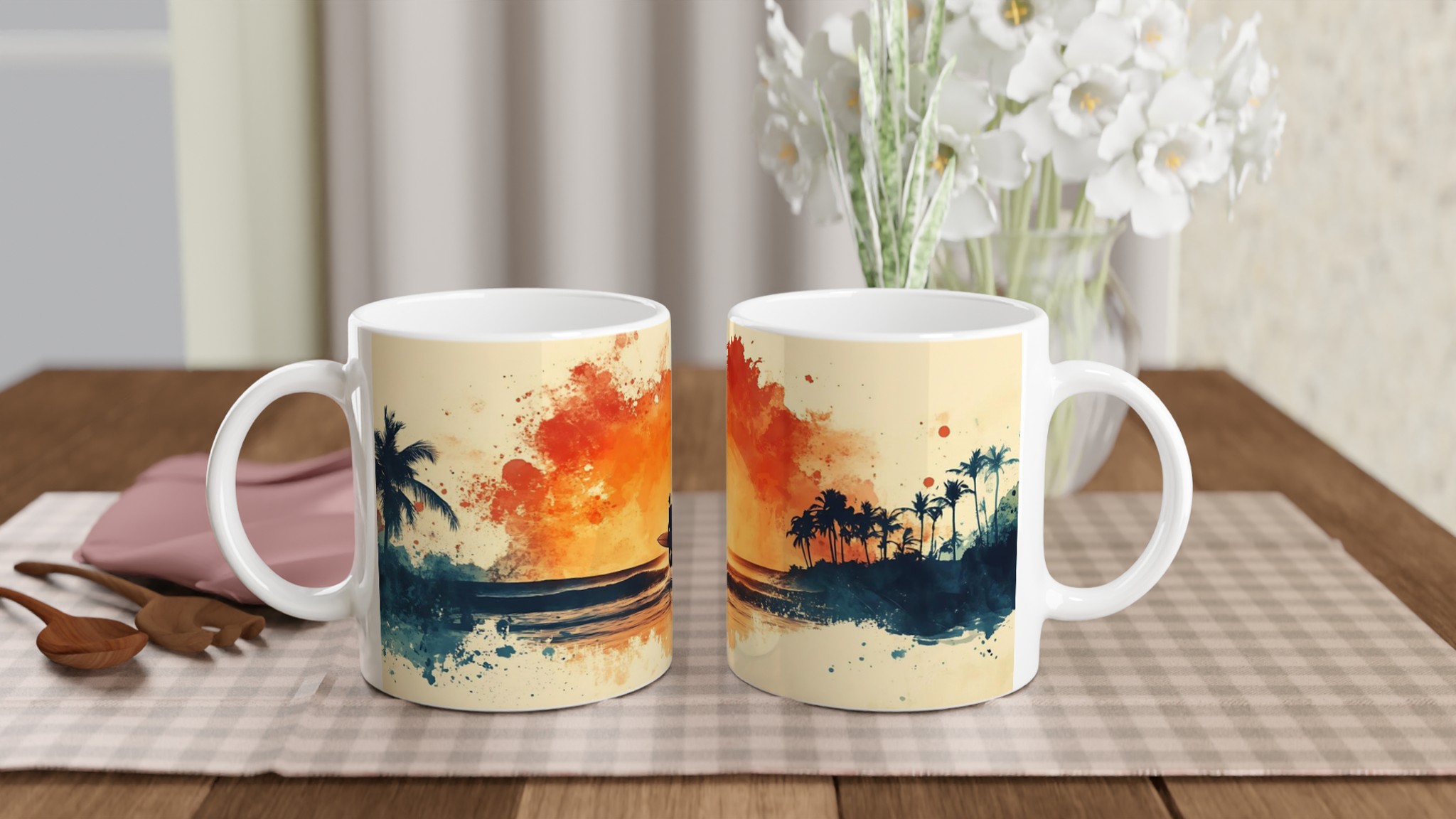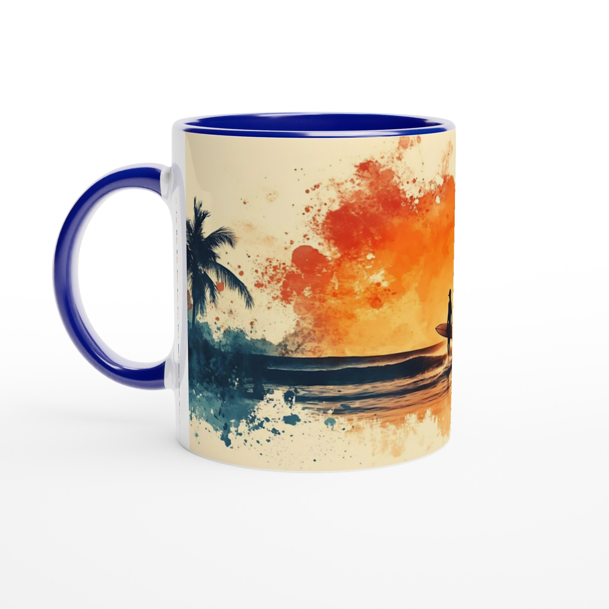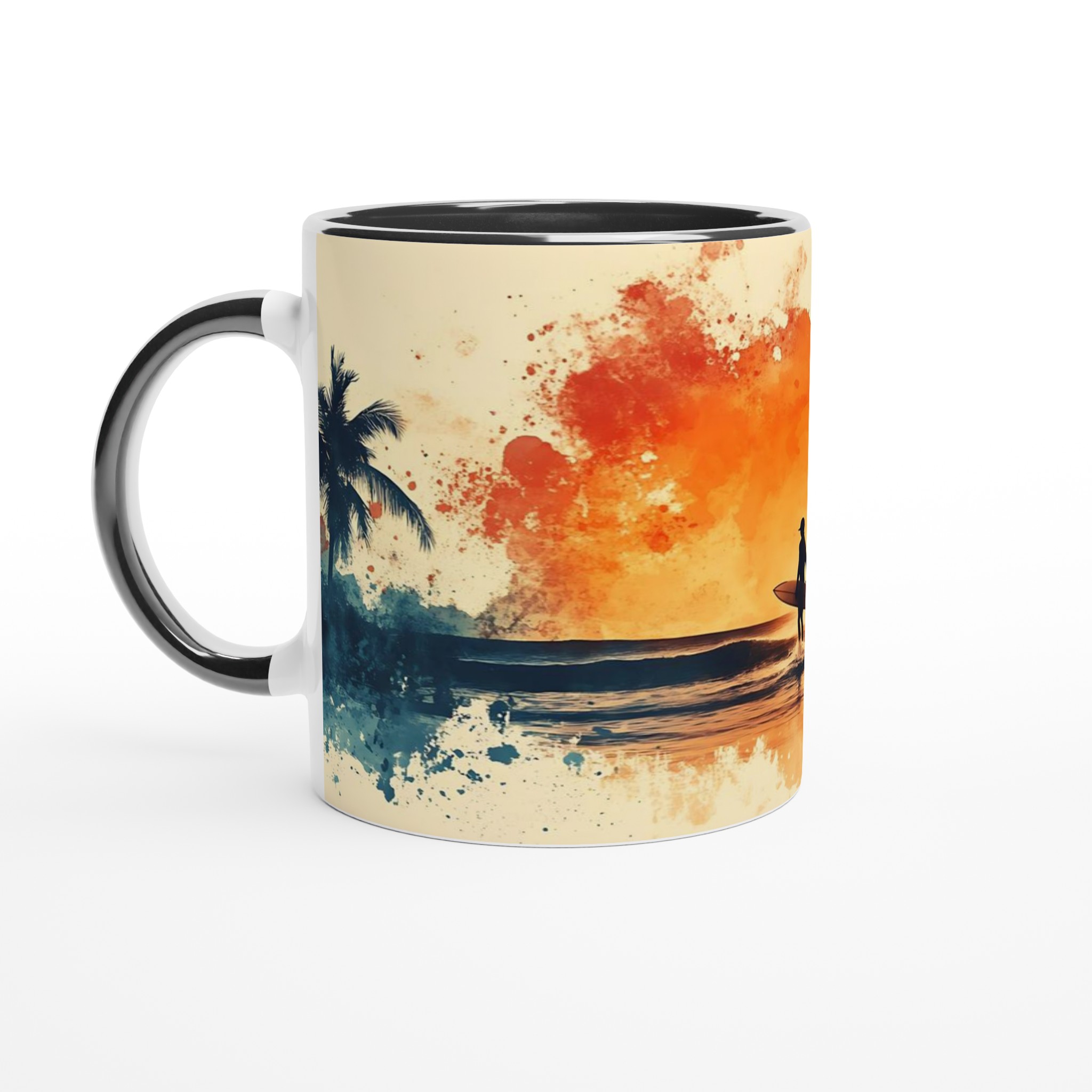 Inspirerad av lugnet från en tropisk solnedgång och spänningen hos en ensam surfare, kommer denna mugg att transportera dig till din favoritstrand med varje klunk. Den blanka vita ytan ger ett skarpt och levande tryck som verkligen sticker ut, oavsett om det är en personlig design, ett roligt citat eller en present till någon du tycker om.