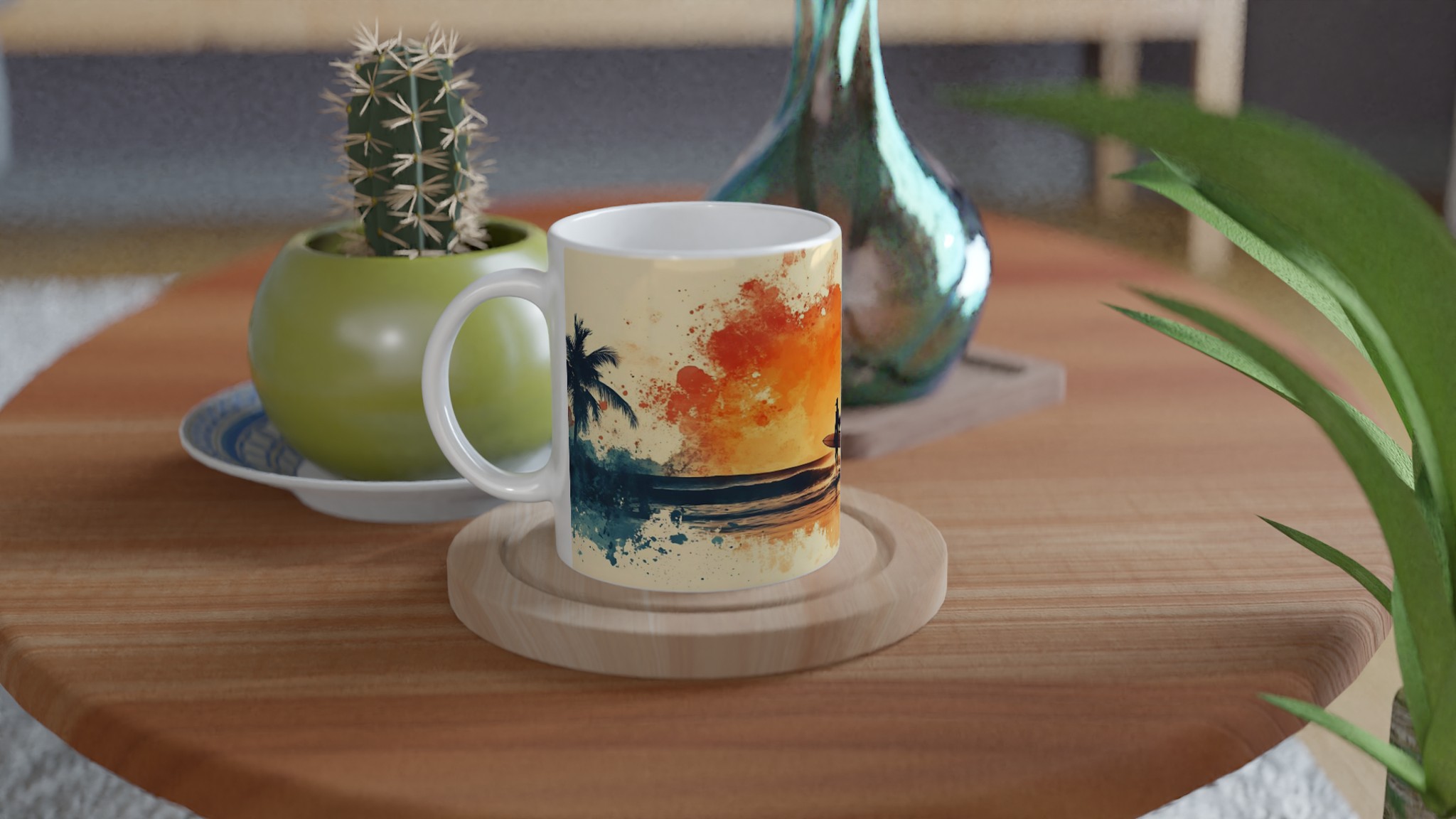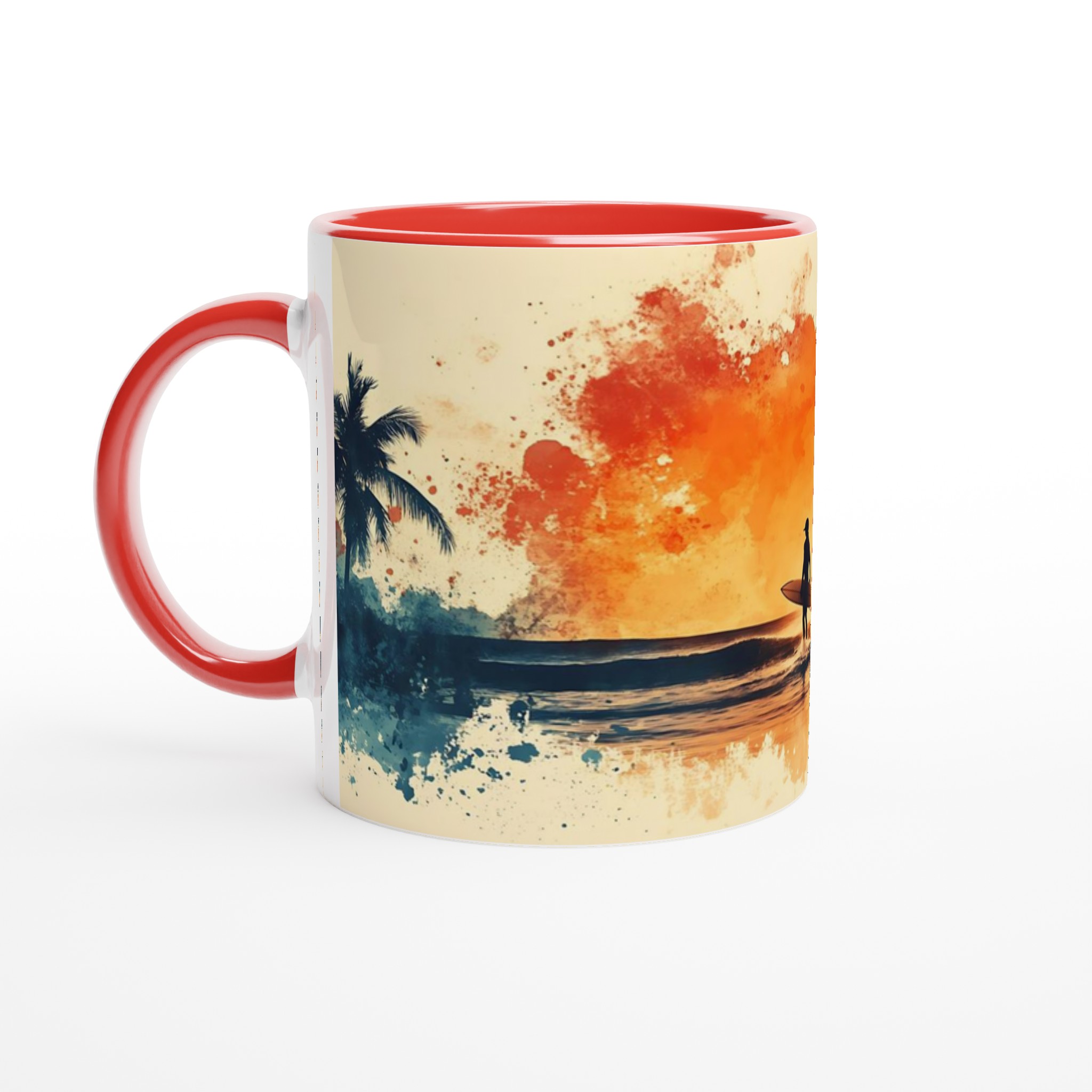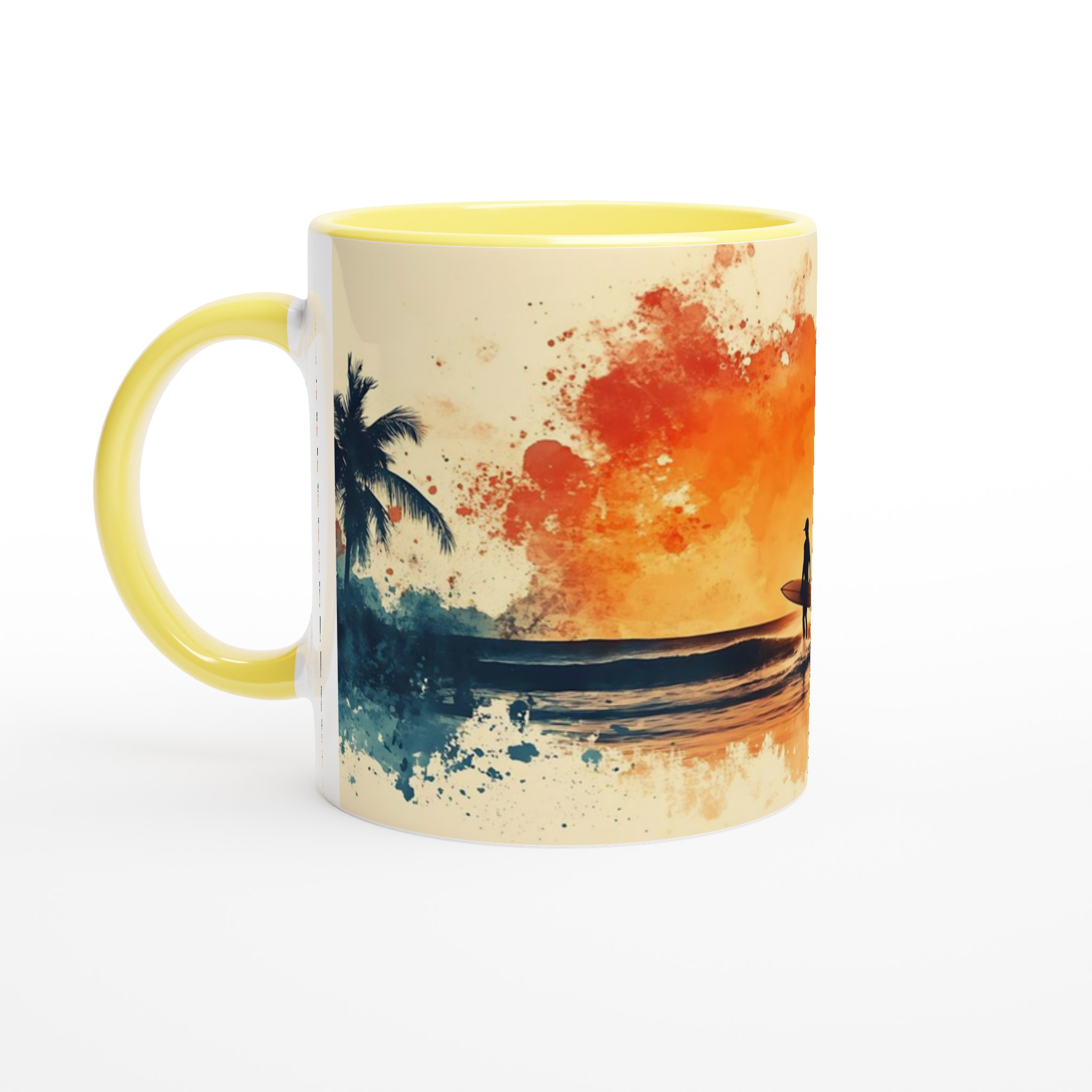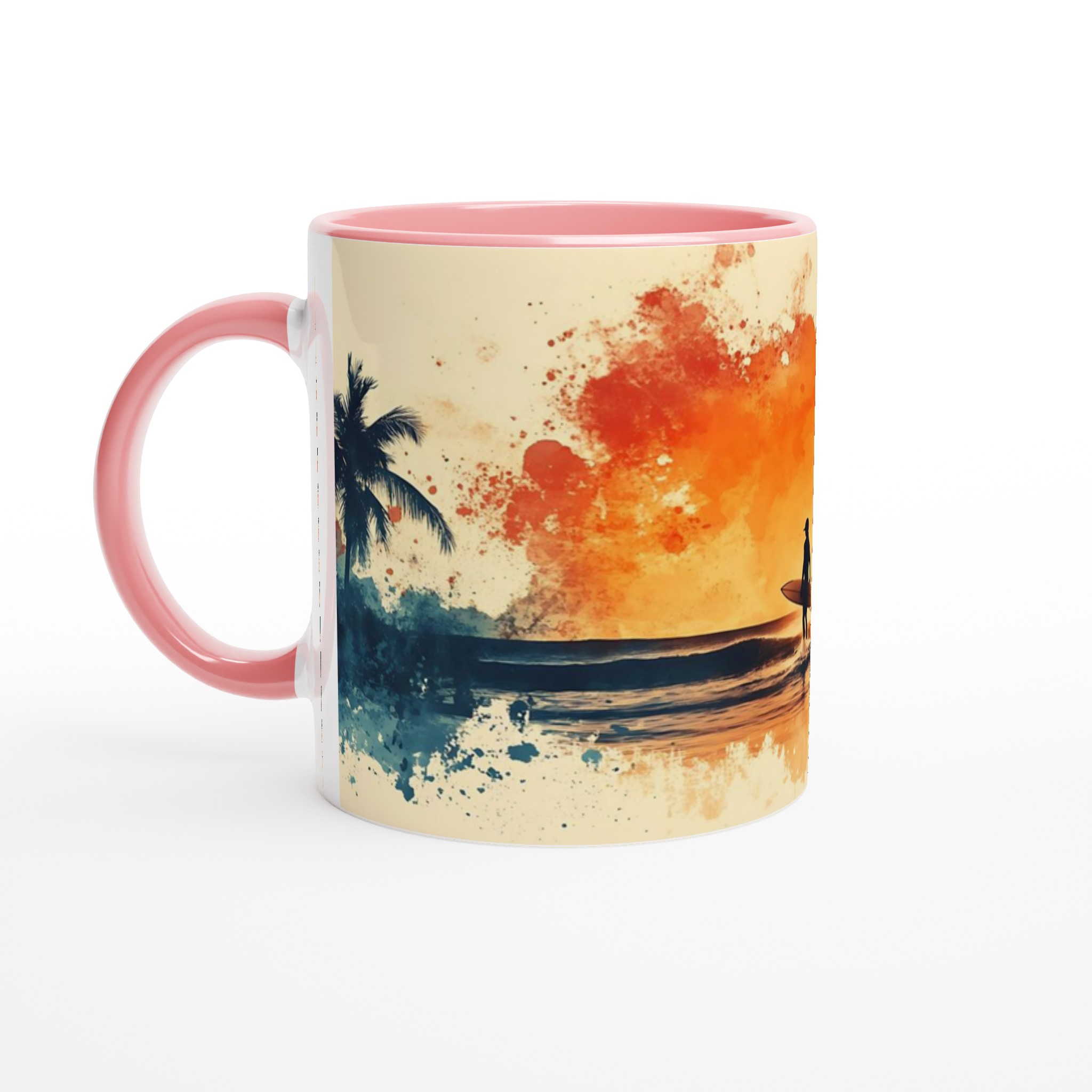 Inspirerad av lugnet från en tropisk solnedgång och spänningen hos en ensam surfare, kommer denna mugg att transportera dig till din favoritstrand med varje klunk. Den blanka vita ytan ger ett skarpt och levande tryck som verkligen sticker ut, oavsett om det är en personlig design, ett roligt citat eller en present till någon du tycker om.