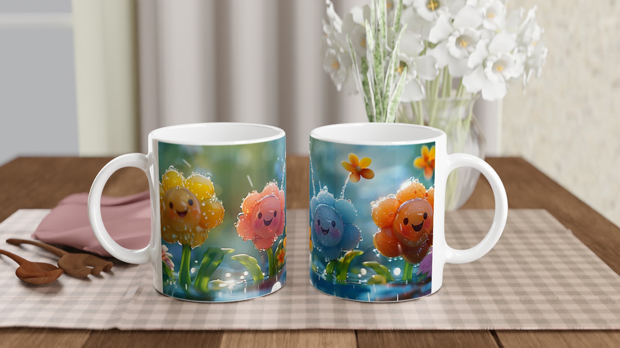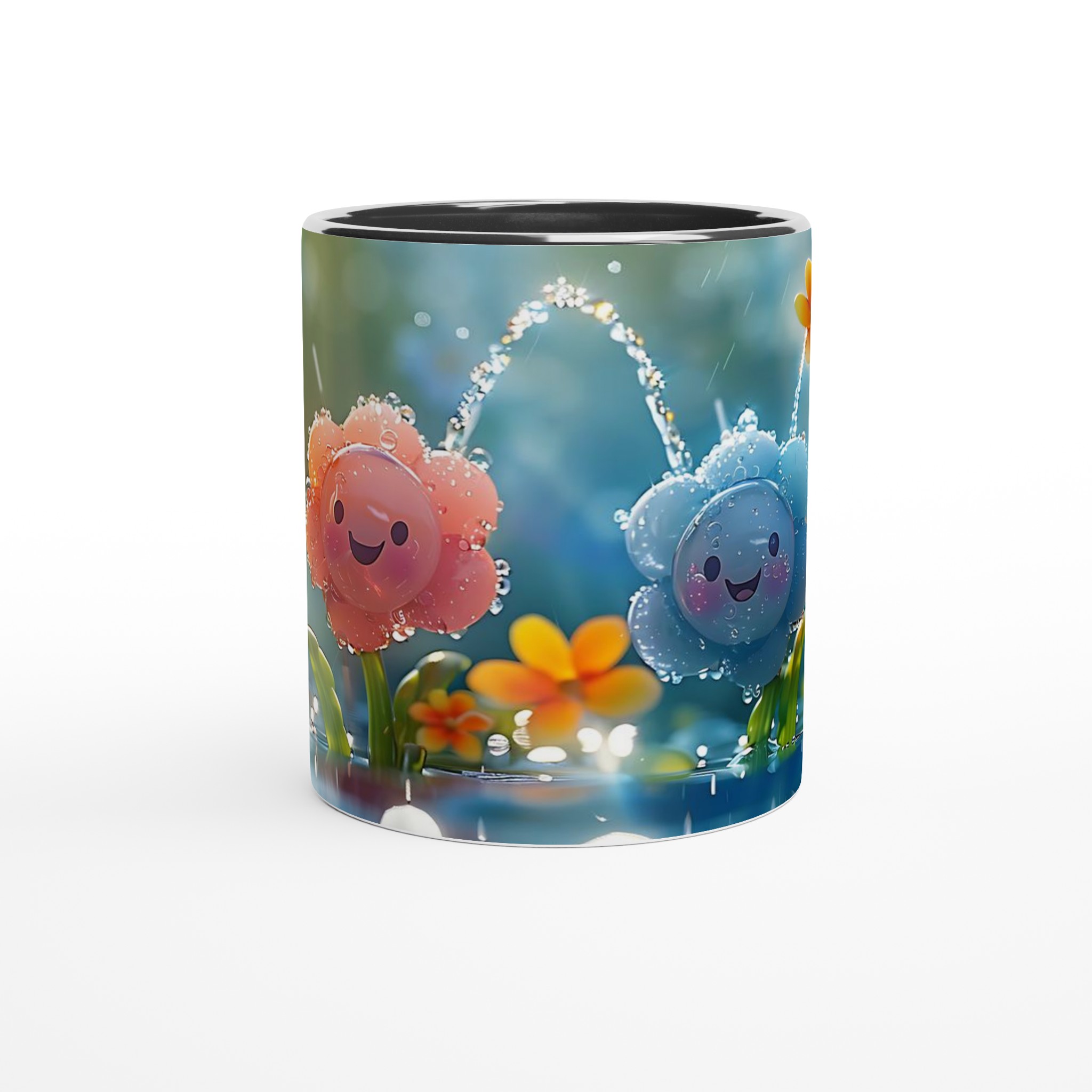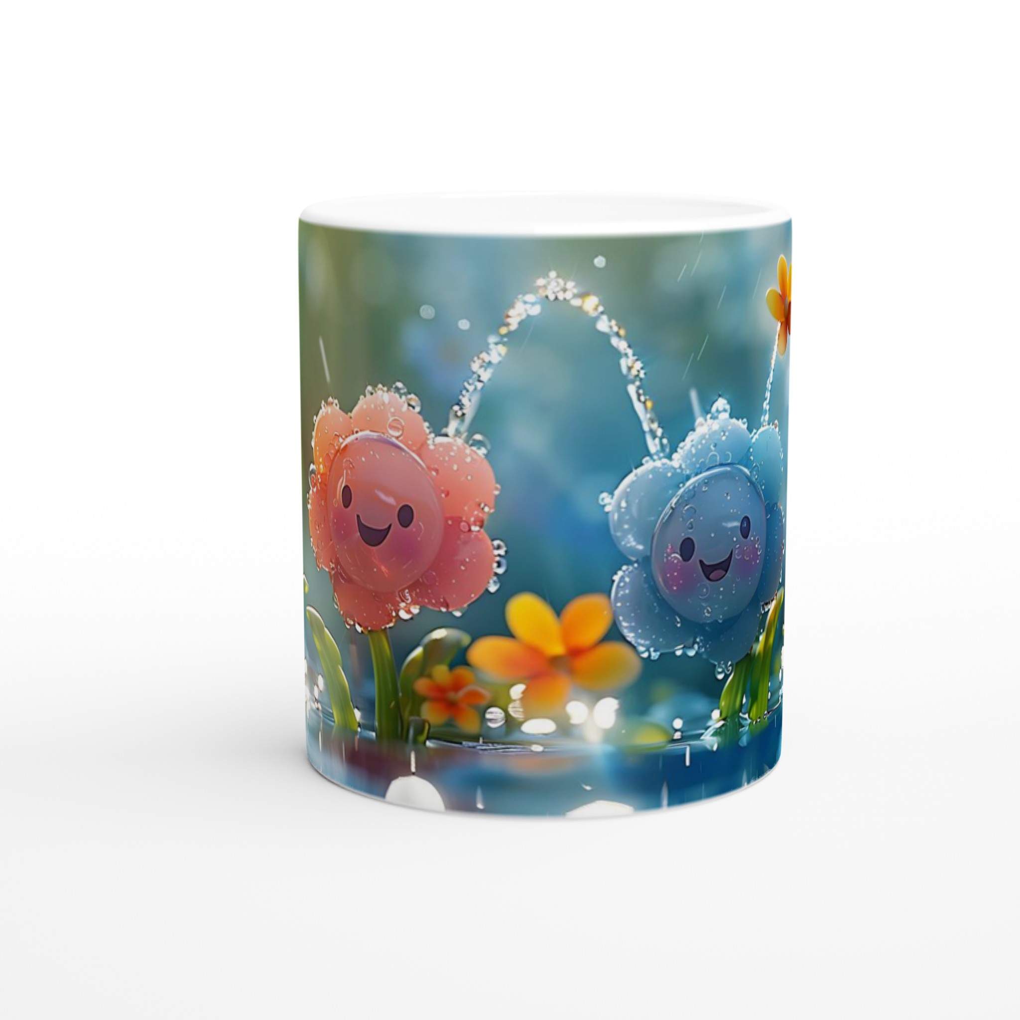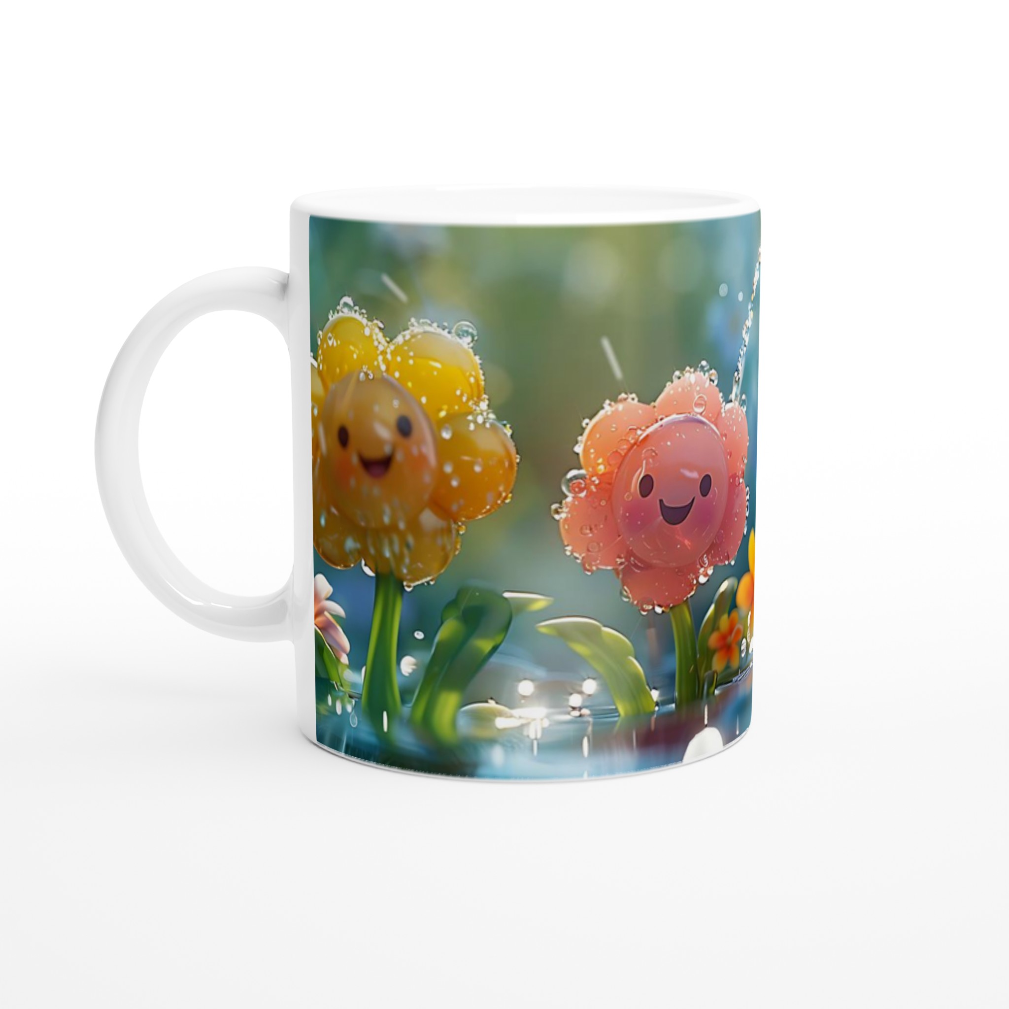 Lys upp din dag med vår charmiga 11oz keramikmugg, prydd med ljuvliga, leende blommor i en regnig trädgård. Denna mugg fångar en känsla av lekfull glädje och fräschör, perfekt för att starta morgonen med ett leende, njuta av en mysig te-stund på eftermiddagen, eller för att pigga upp fika-pausen med en härlig varm choklad.