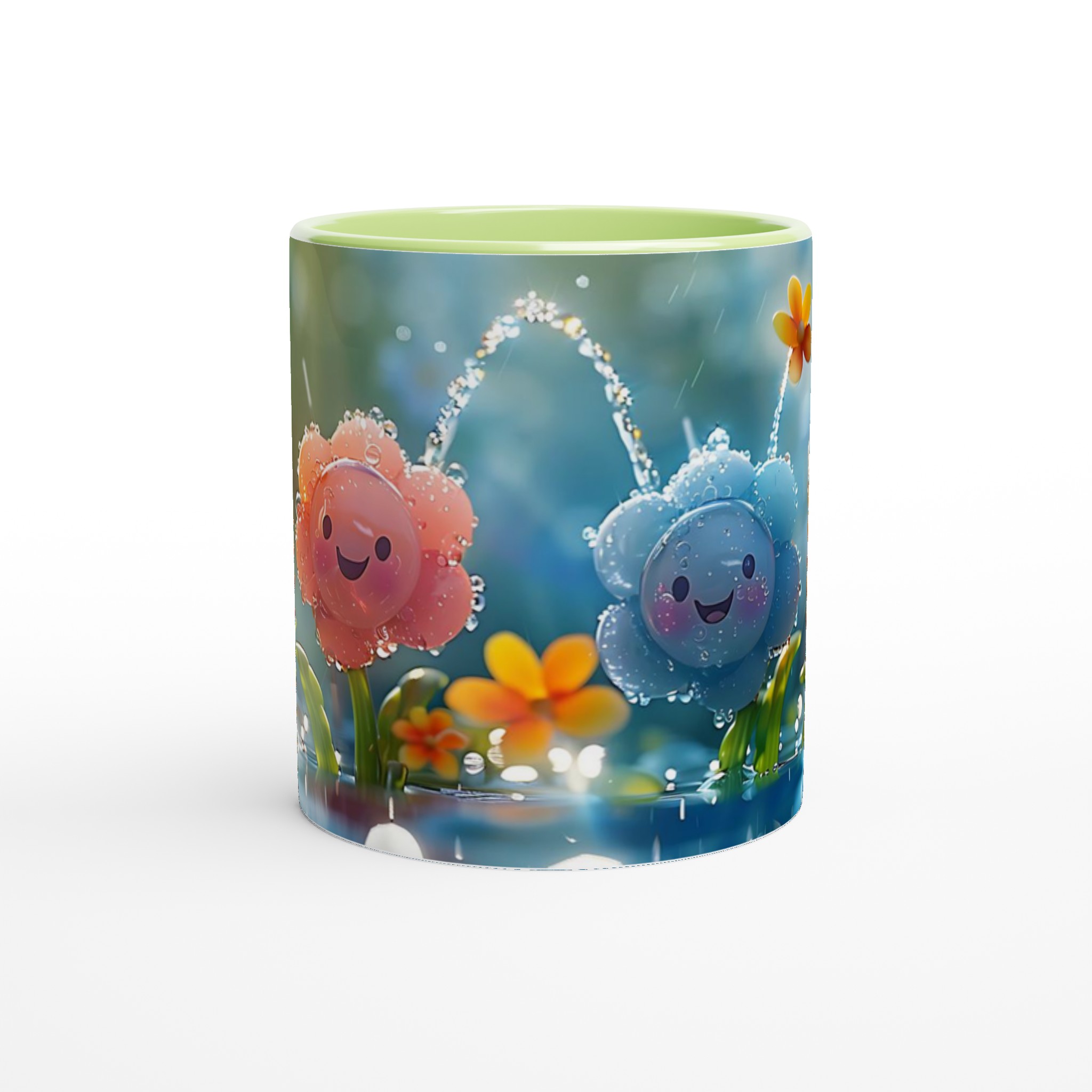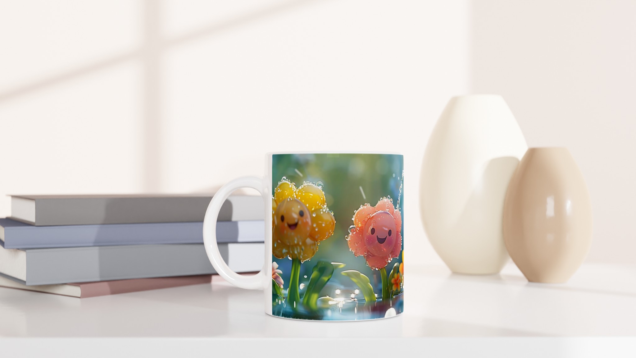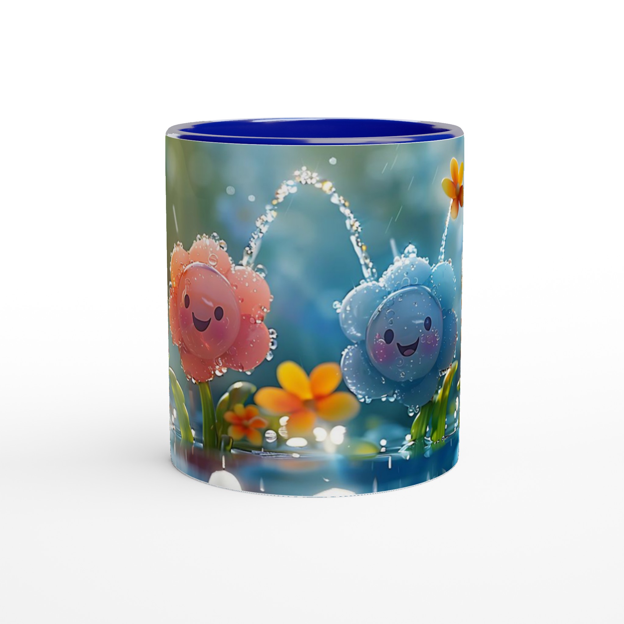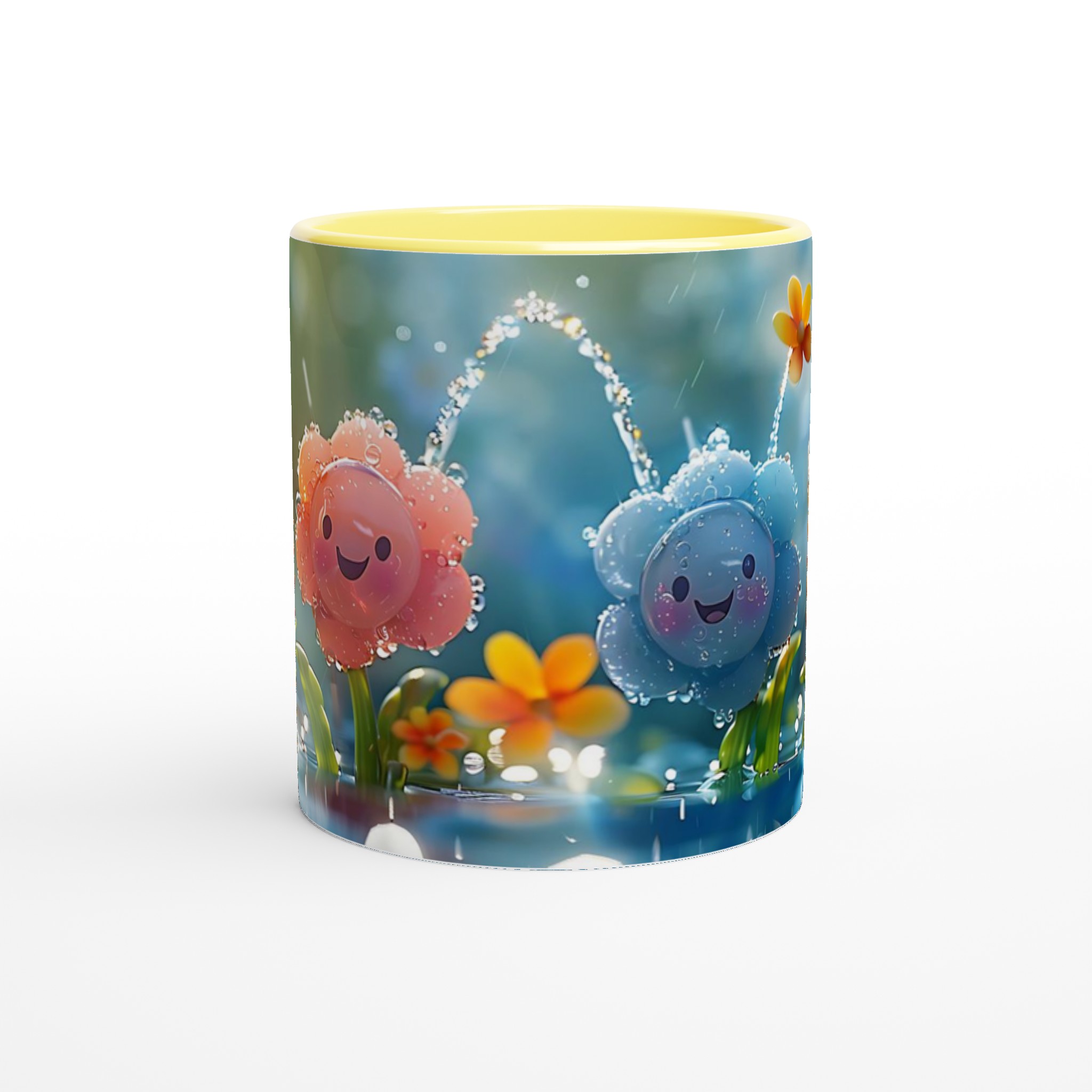 Lys upp din dag med vår charmiga 11oz keramikmugg, prydd med ljuvliga, leende blommor i en regnig trädgård. Denna mugg fångar en känsla av lekfull glädje och fräschör, perfekt för att starta morgonen med ett leende, njuta av en mysig te-stund på eftermiddagen, eller för att pigga upp fika-pausen med en härlig varm choklad.